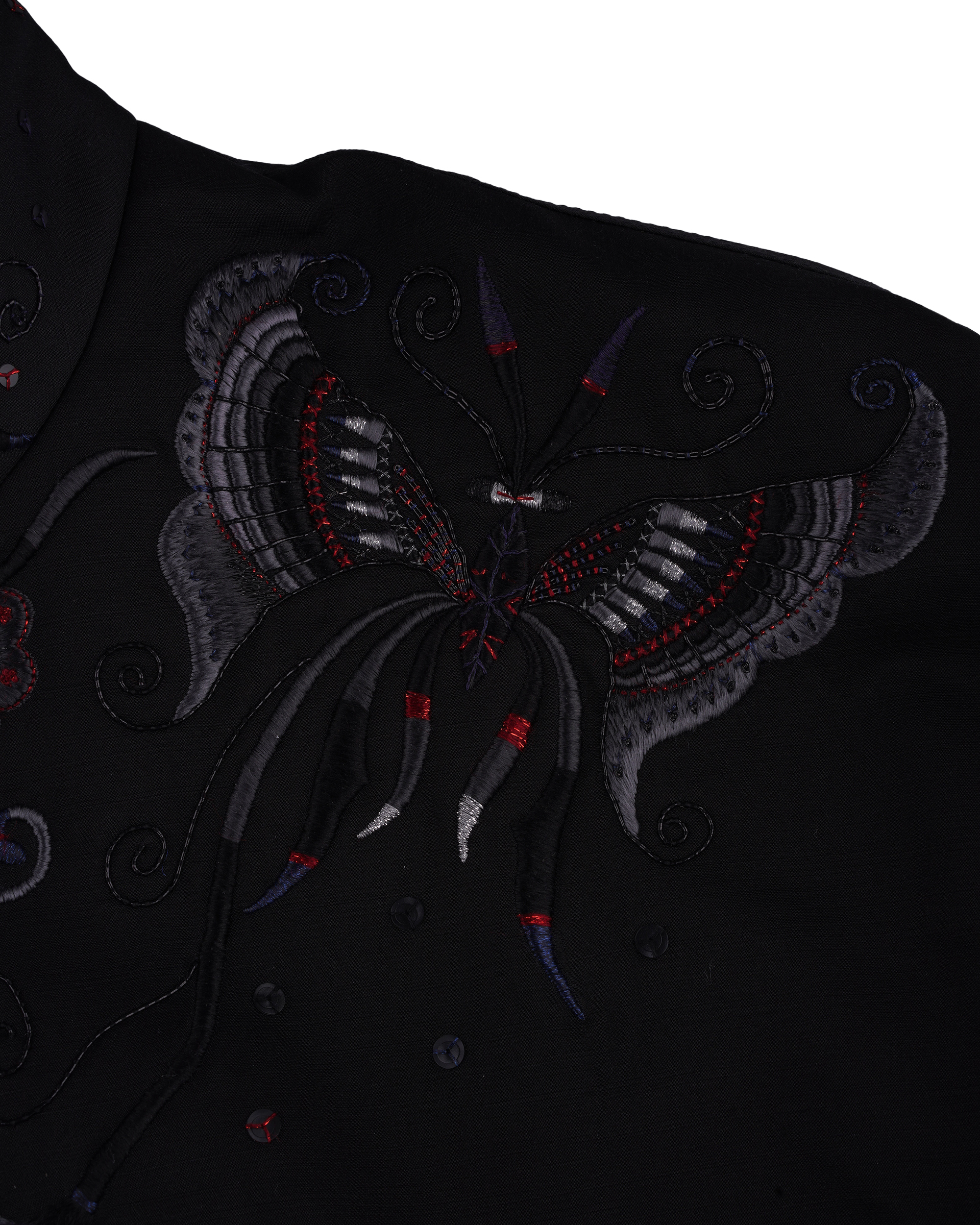 This piece is crafted from a silk-wool blend fabric, featuring embroidered Miao mythological totems. It combines a relaxed jacket silhouette for versatile styling across multiple occasions.