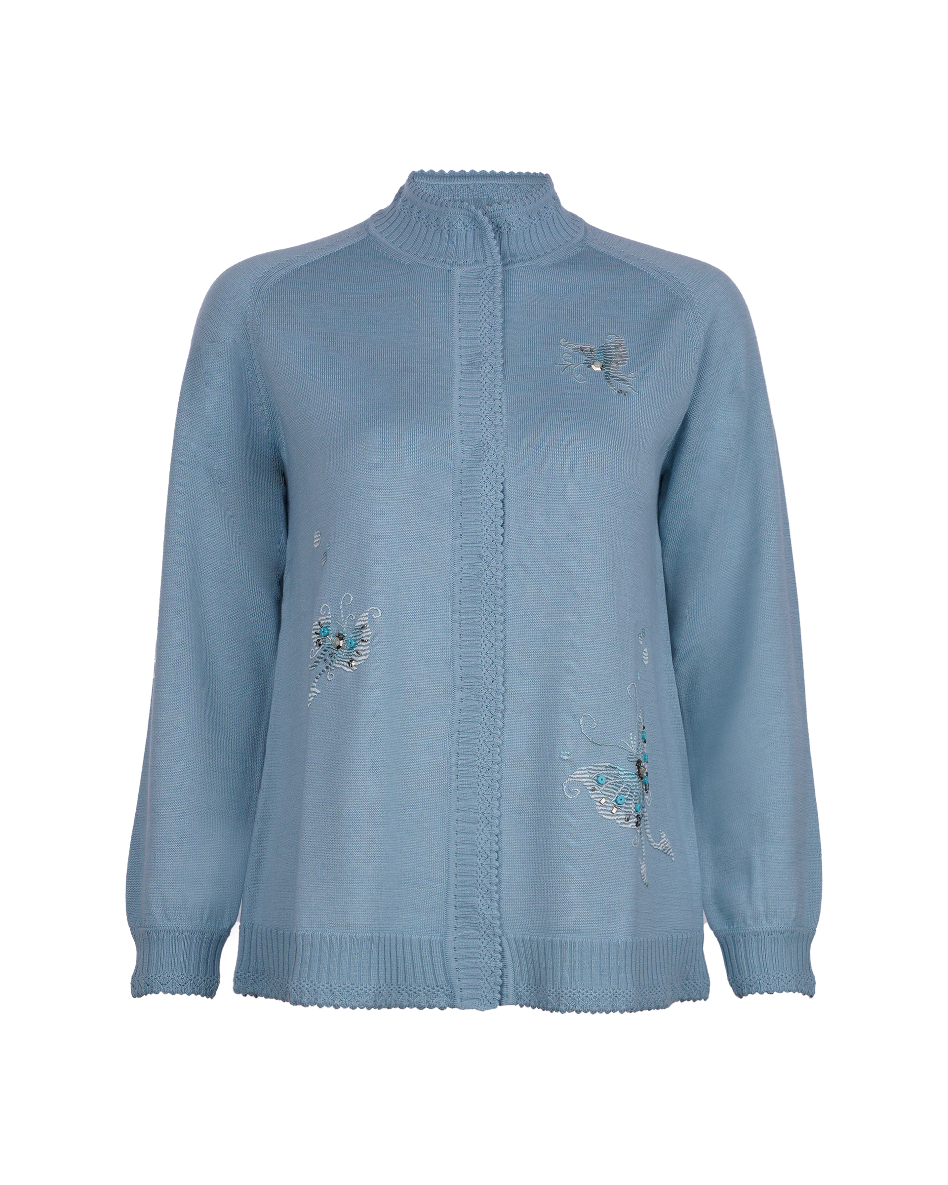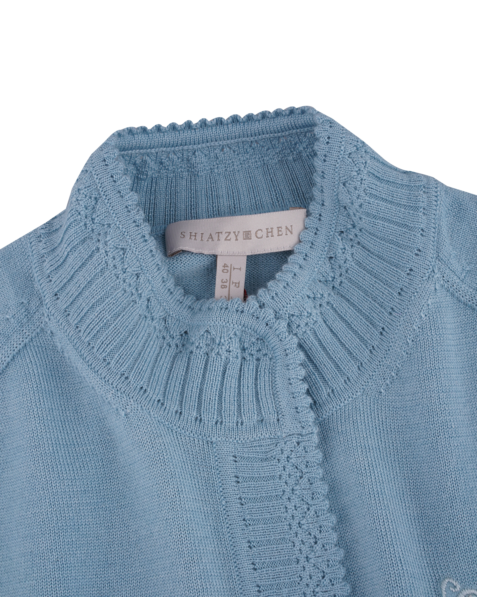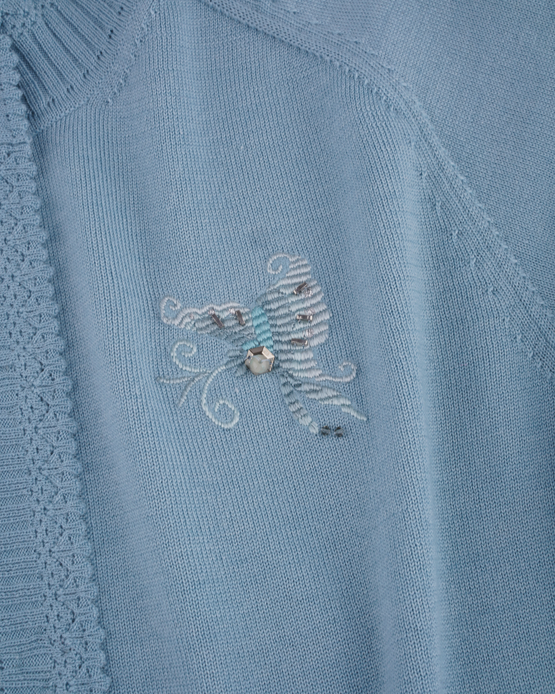 This piece is crafted from a silk-wool blend fabric, featuring delicate embroidery that outlines this season's butterfly motif; it is a simple yet classic knitwear item.