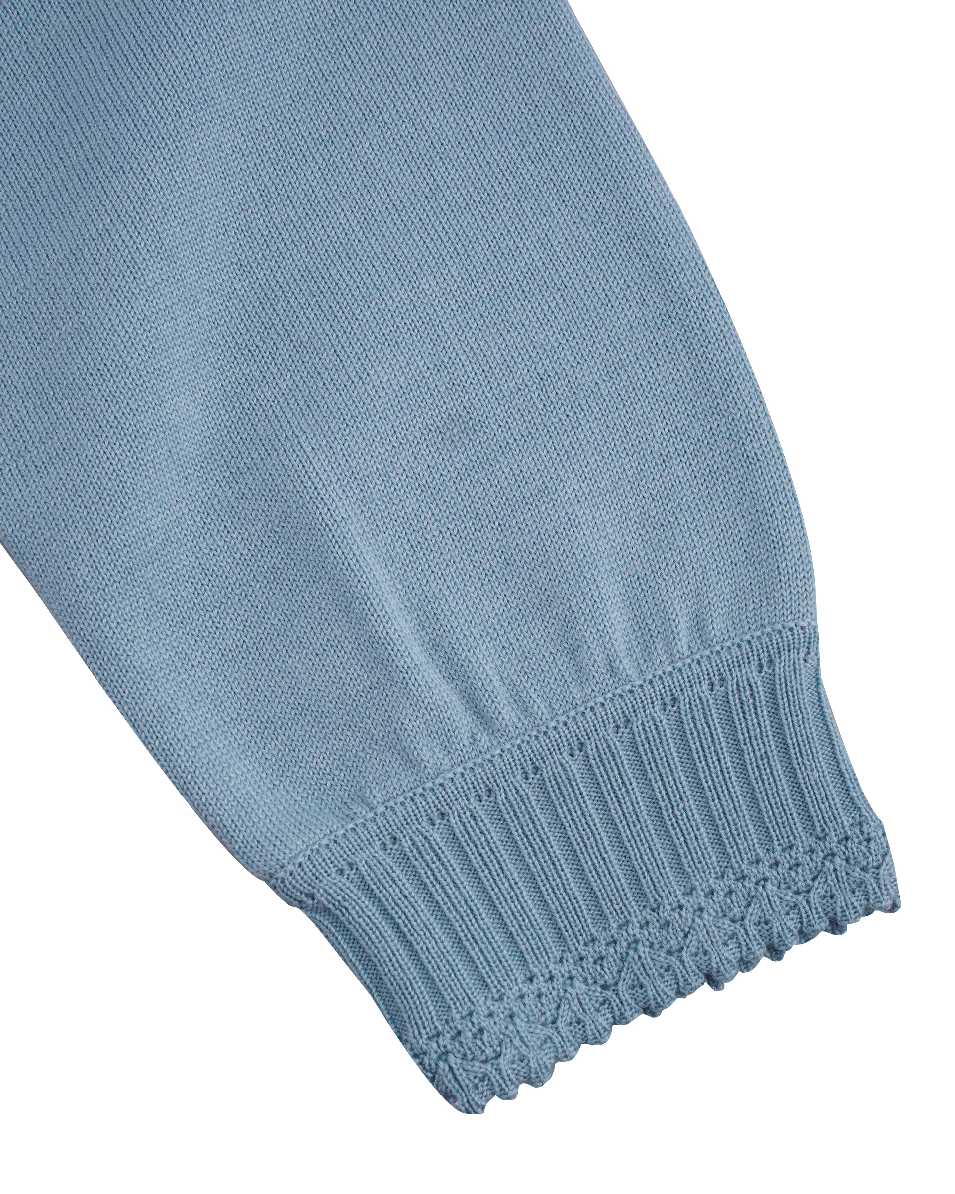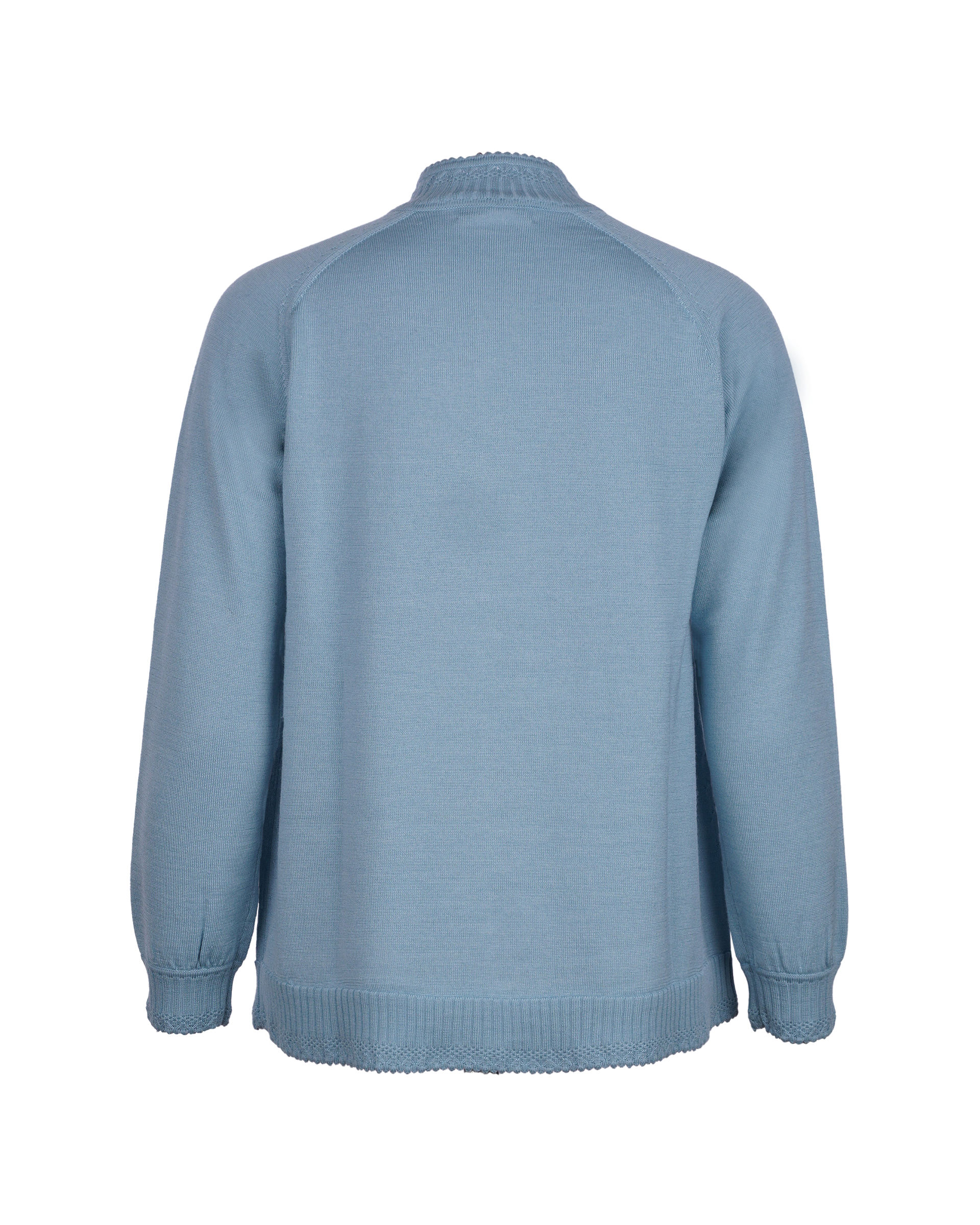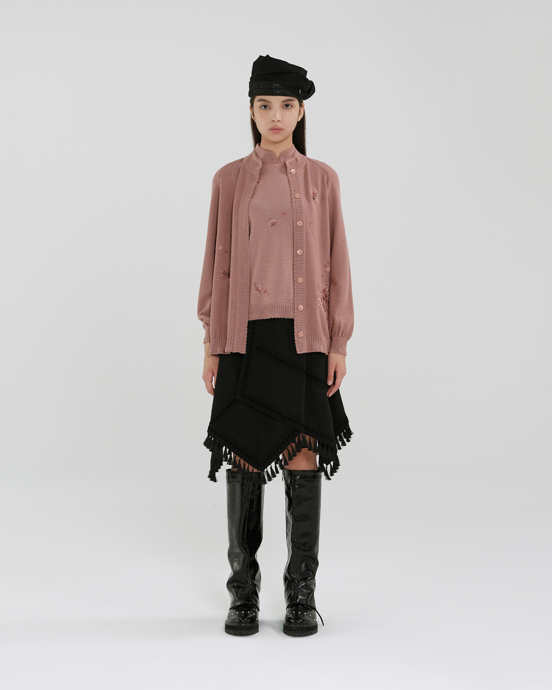 This piece is crafted from a silk-wool blend fabric, featuring delicate embroidery that outlines this season's butterfly motif; it is a simple yet classic knitwear item.