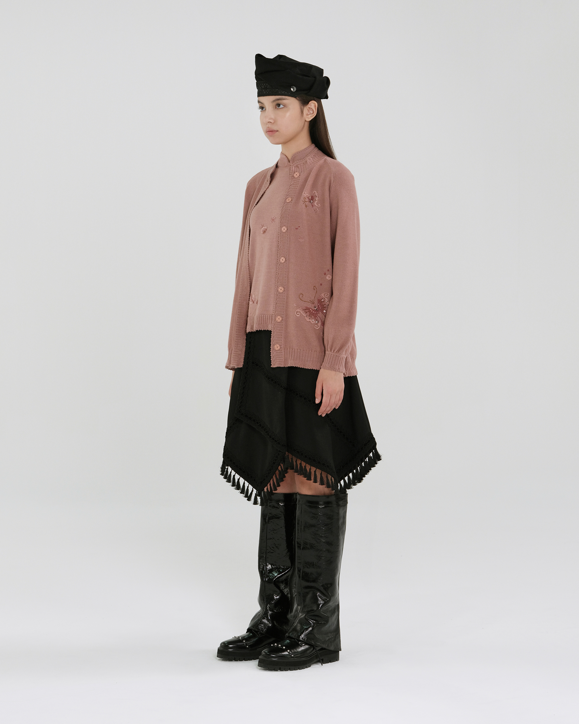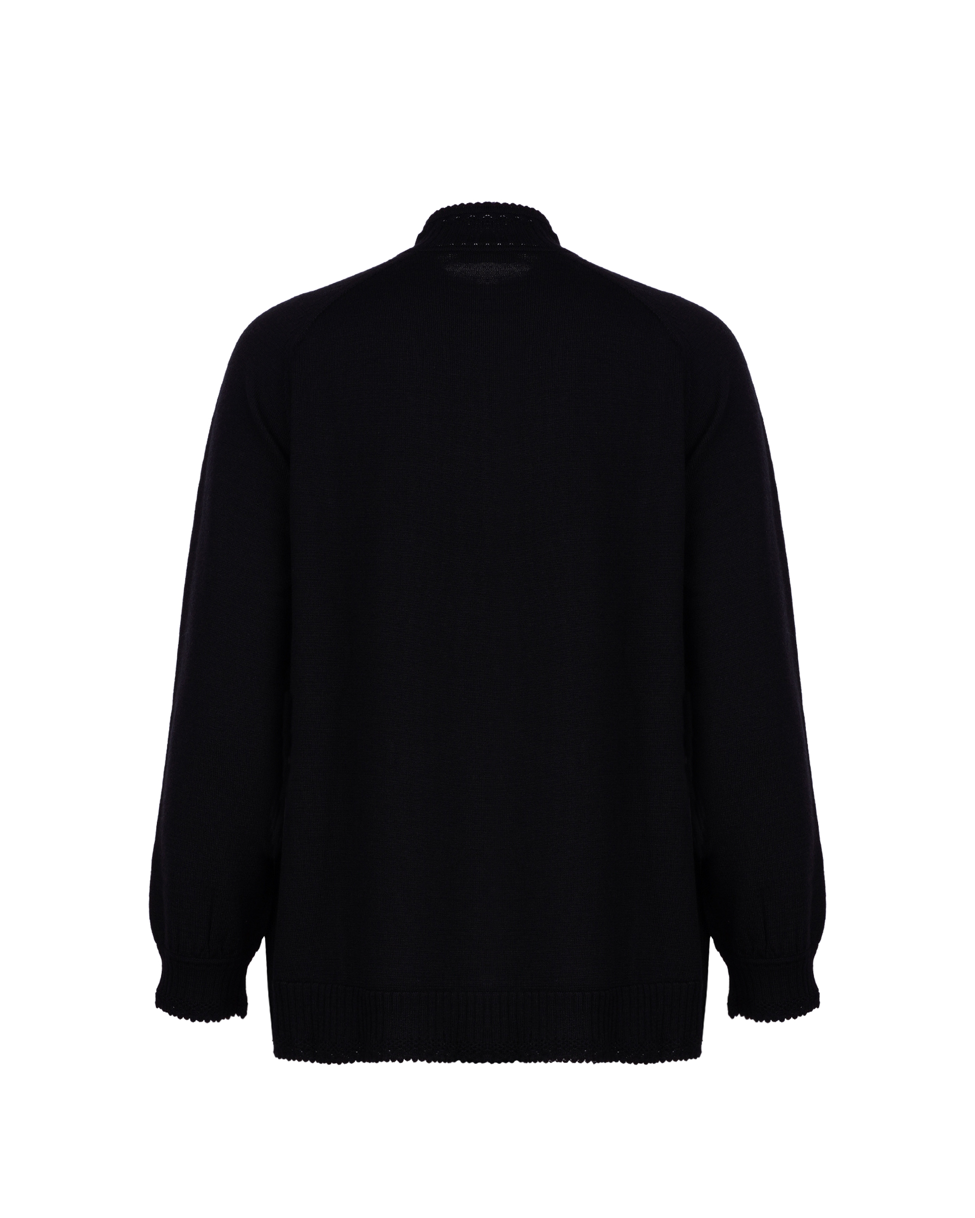 This piece is crafted from a silk-wool blend fabric, featuring delicate embroidery that outlines this season's butterfly motif; it is a simple yet classic knitwear item.