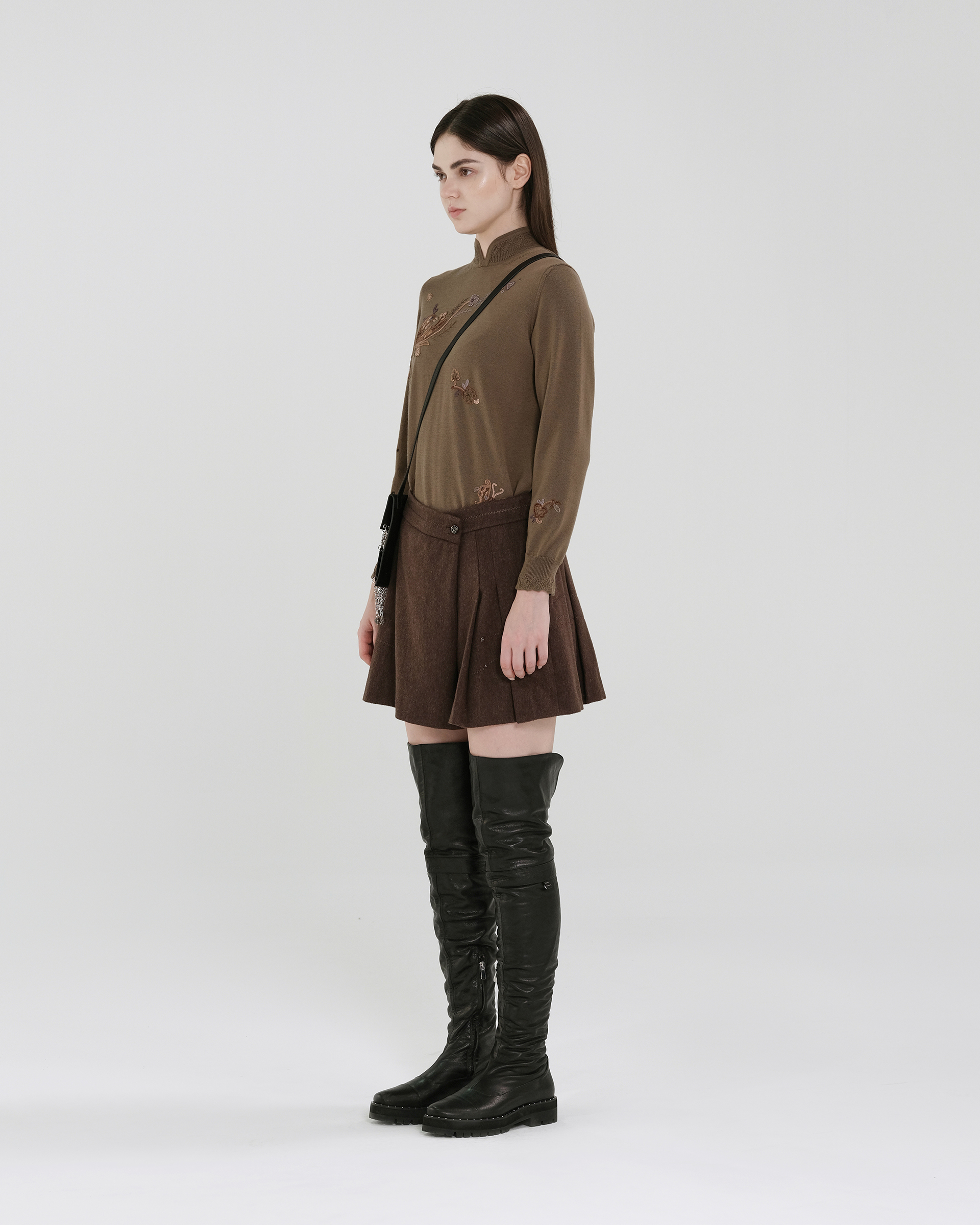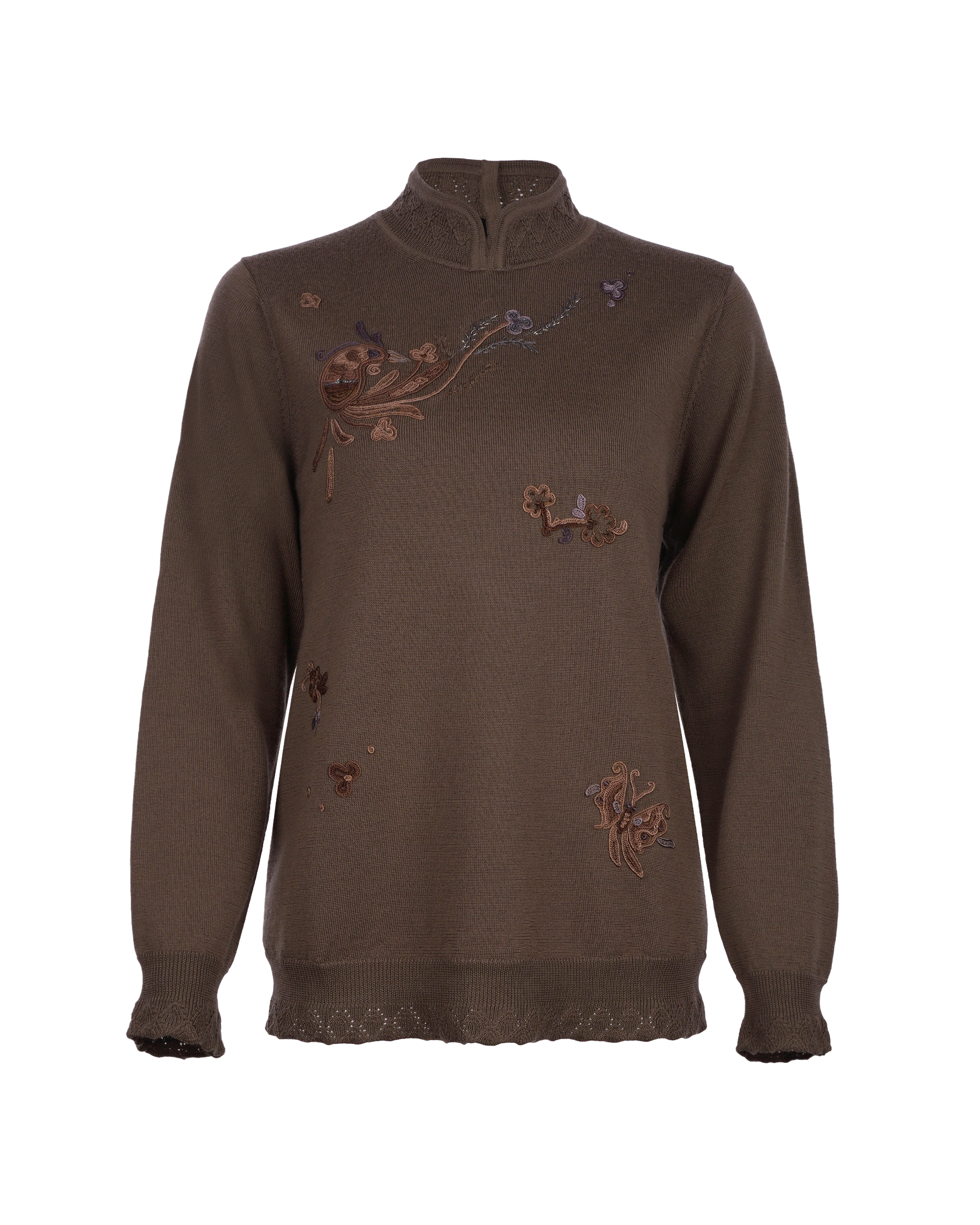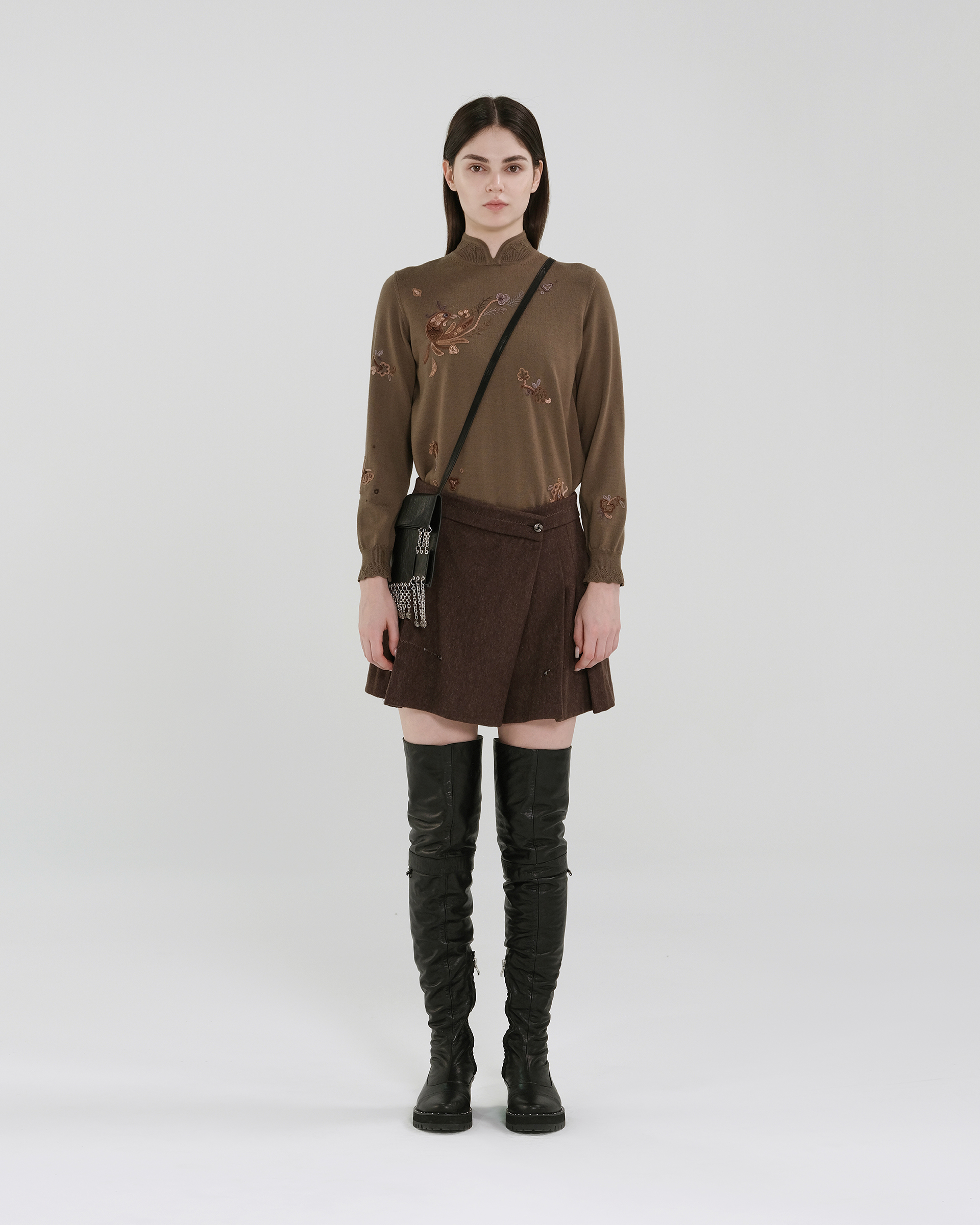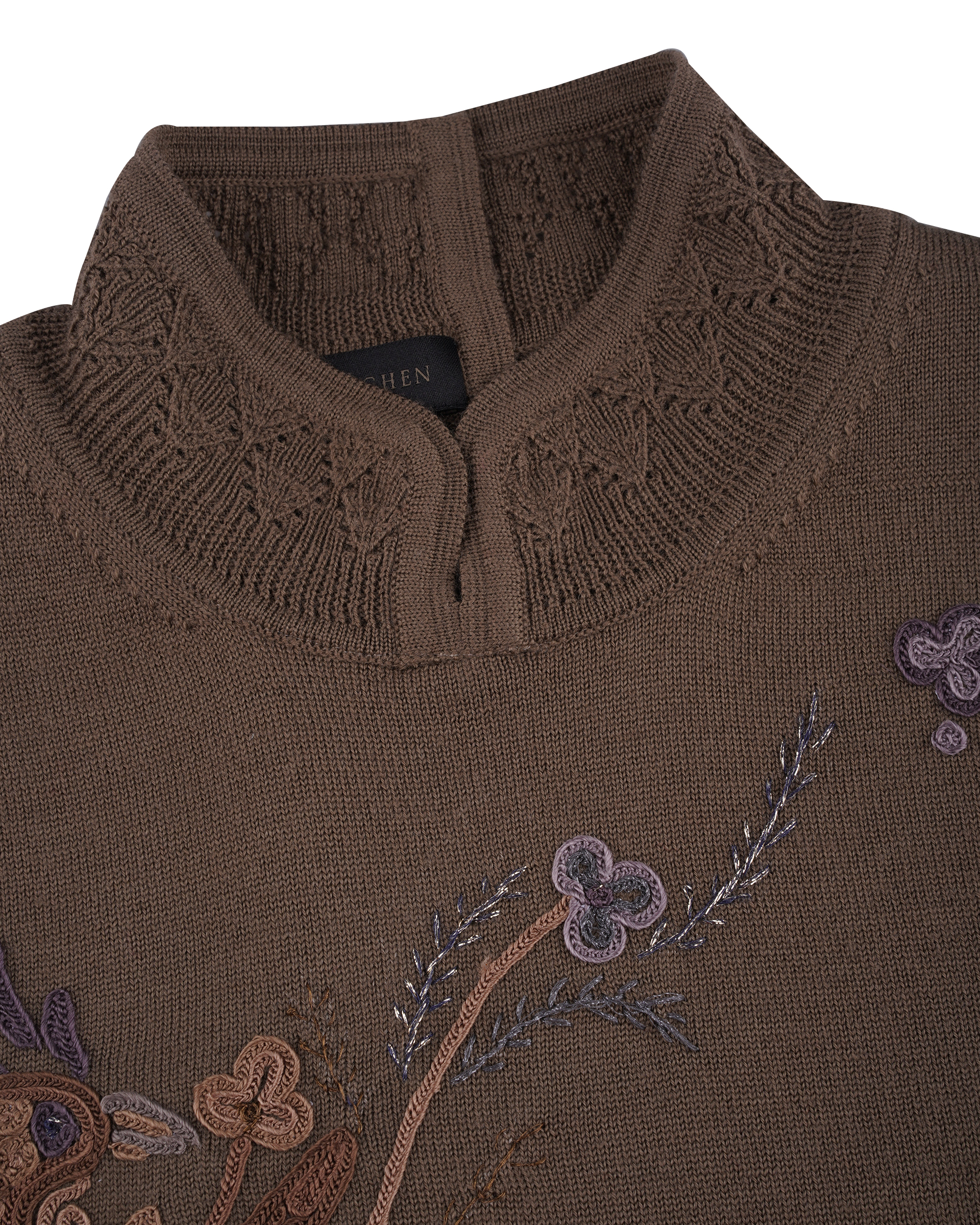 This piece is crafted from a silk-wool blend fabric, featuring intricate embroidery depicting Miao mythological totems to evoke an elegant feminine aesthetic.