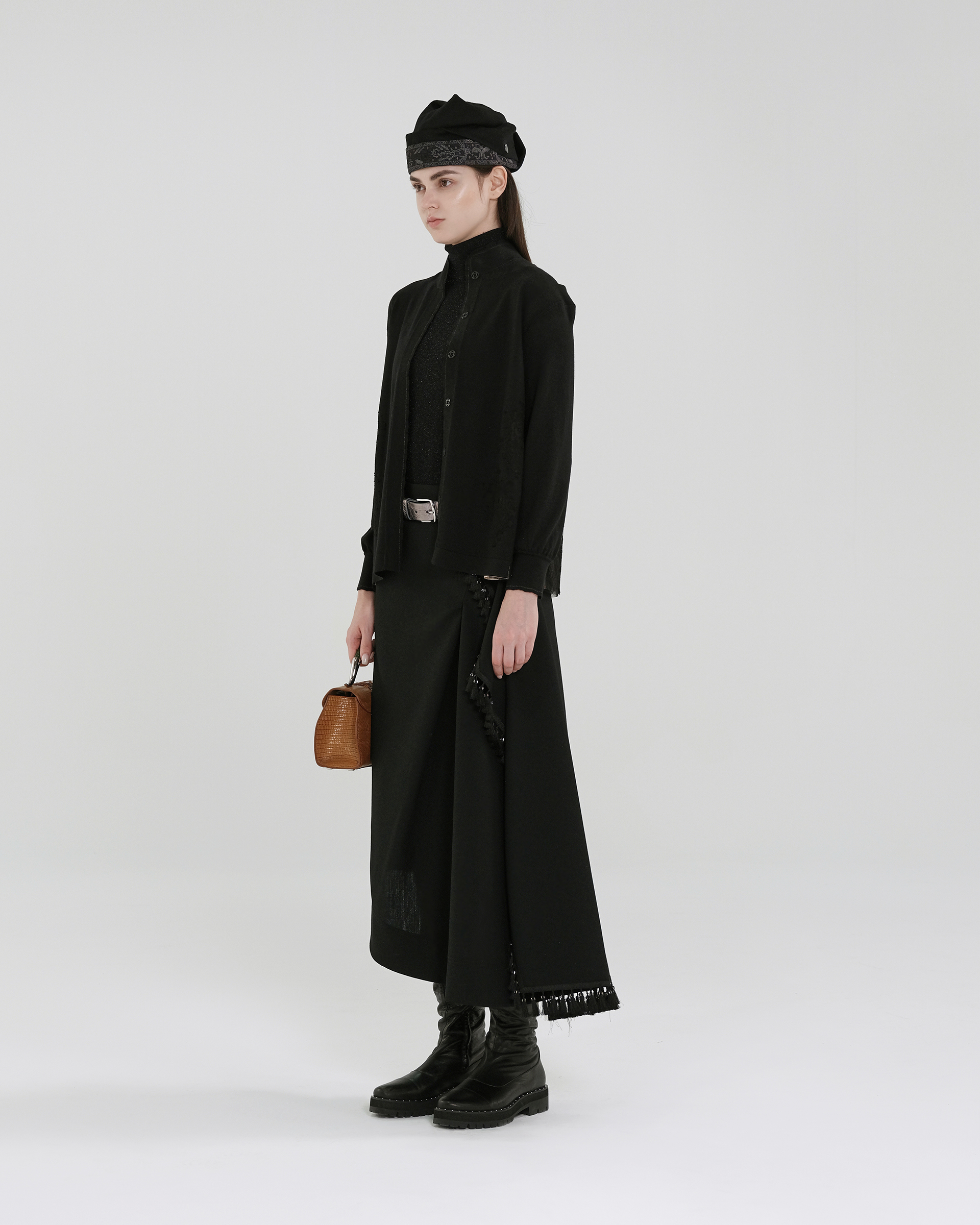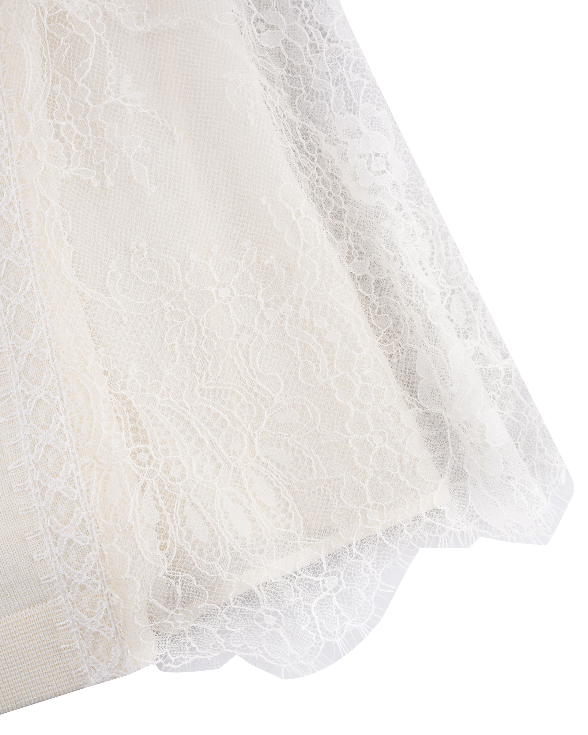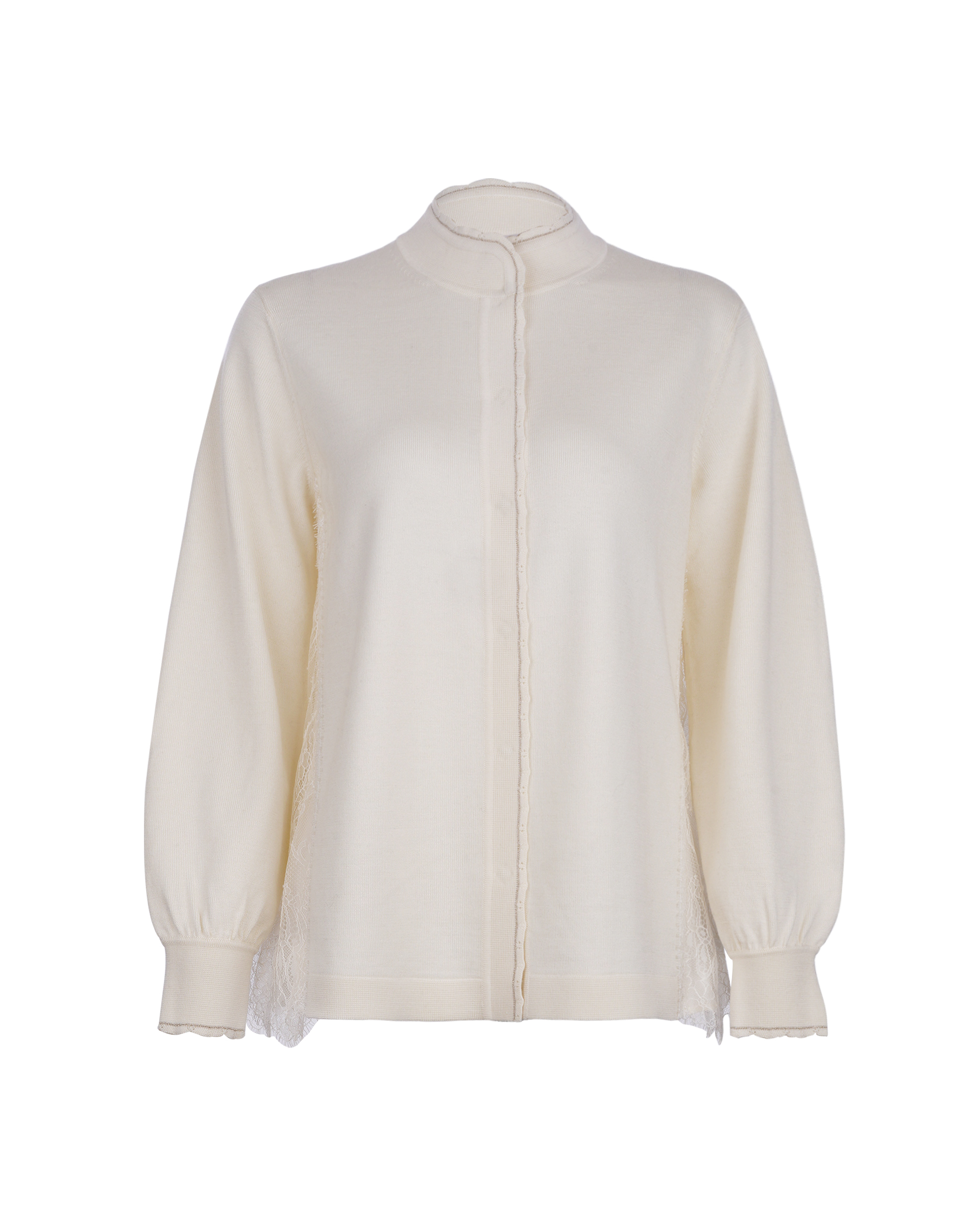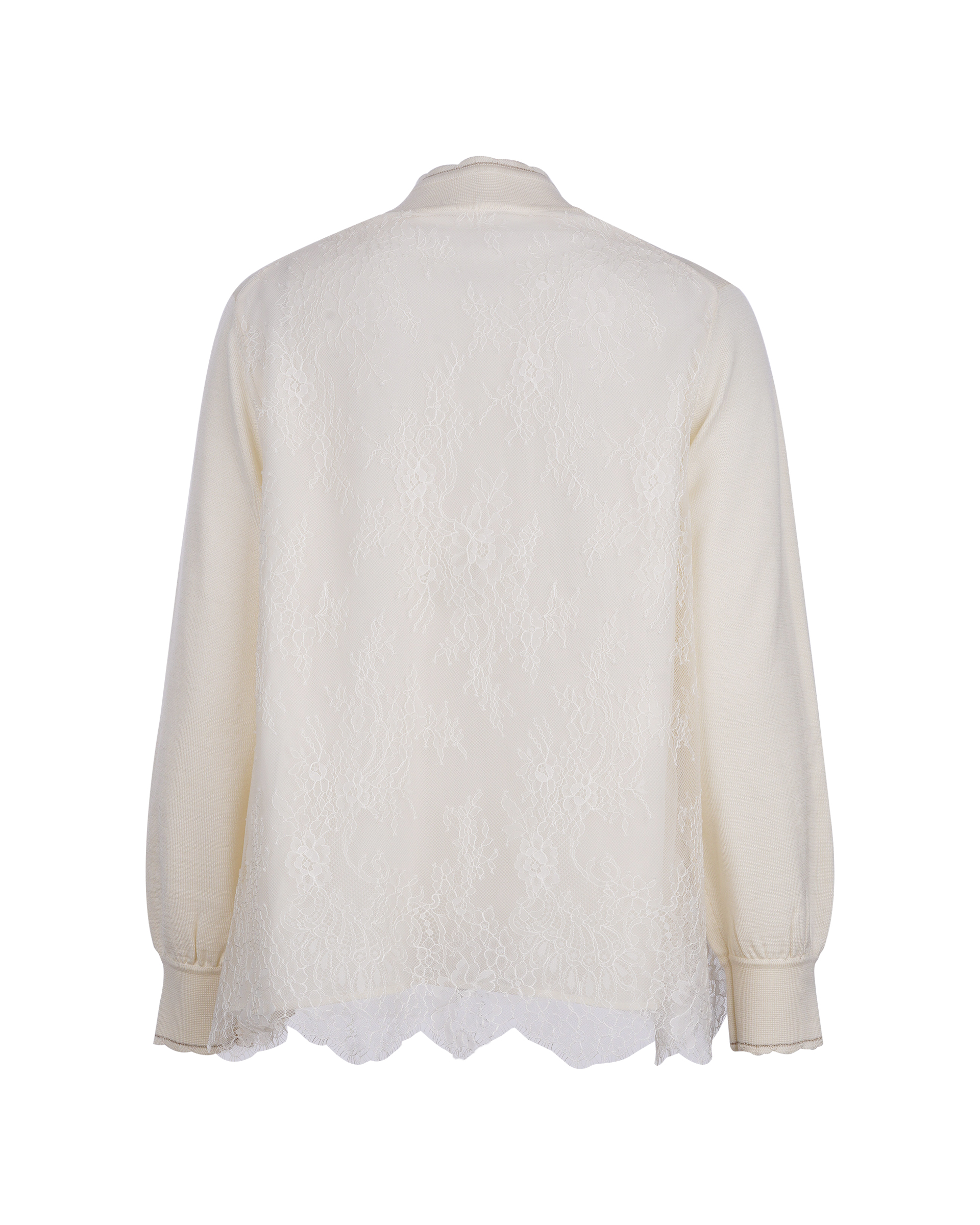 This piece is crafted from wool fabric with a soft lace panel in a matching shade at the back, allowing for versatile styling with various bottoms to create different looks.