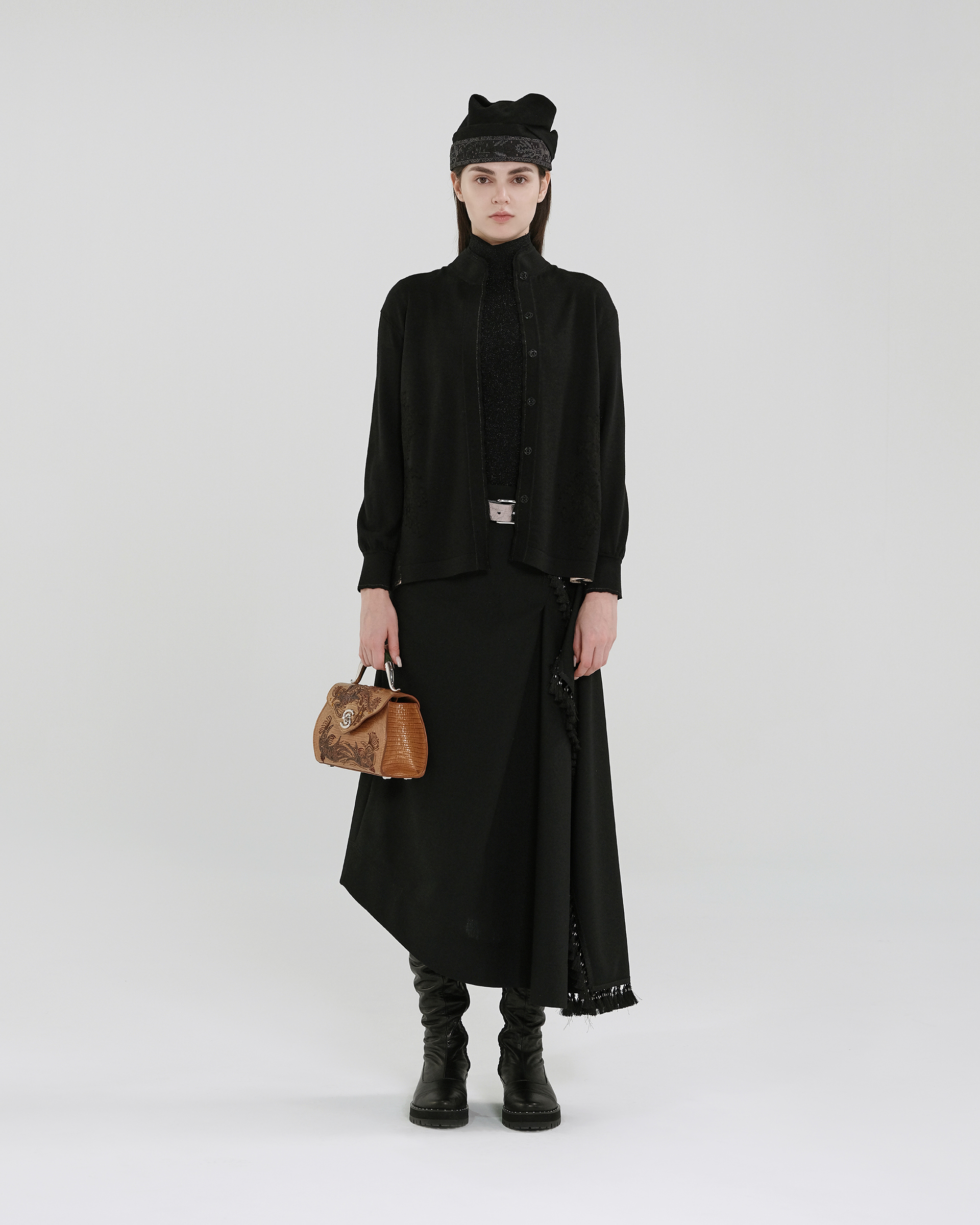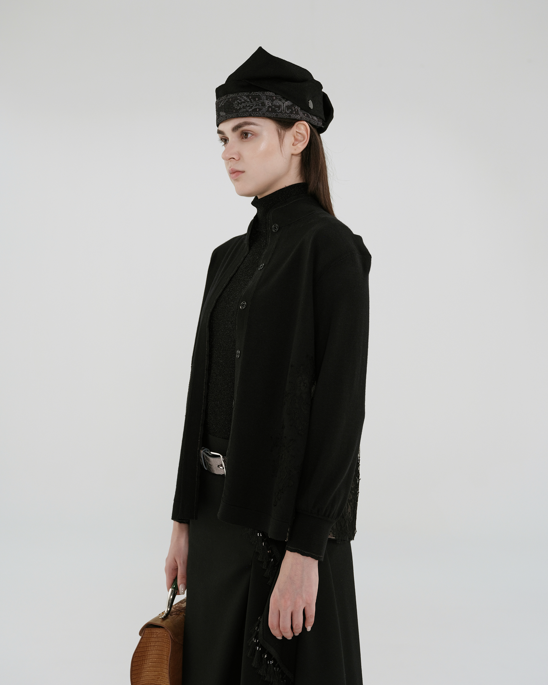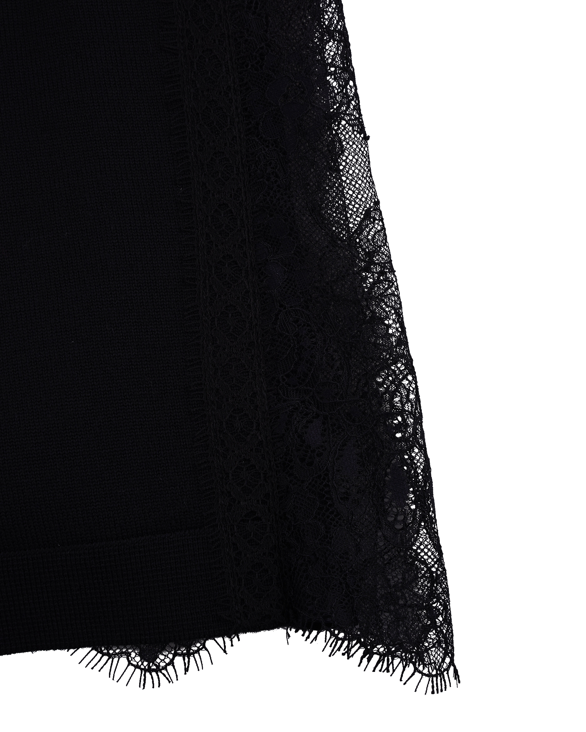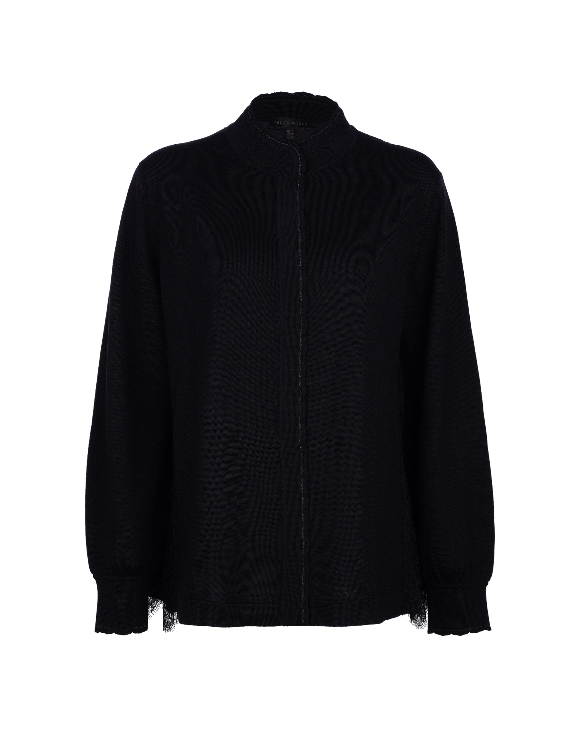 This piece is crafted from wool fabric with a soft lace panel in a matching shade at the back, allowing for versatile styling with various bottoms to create different looks.