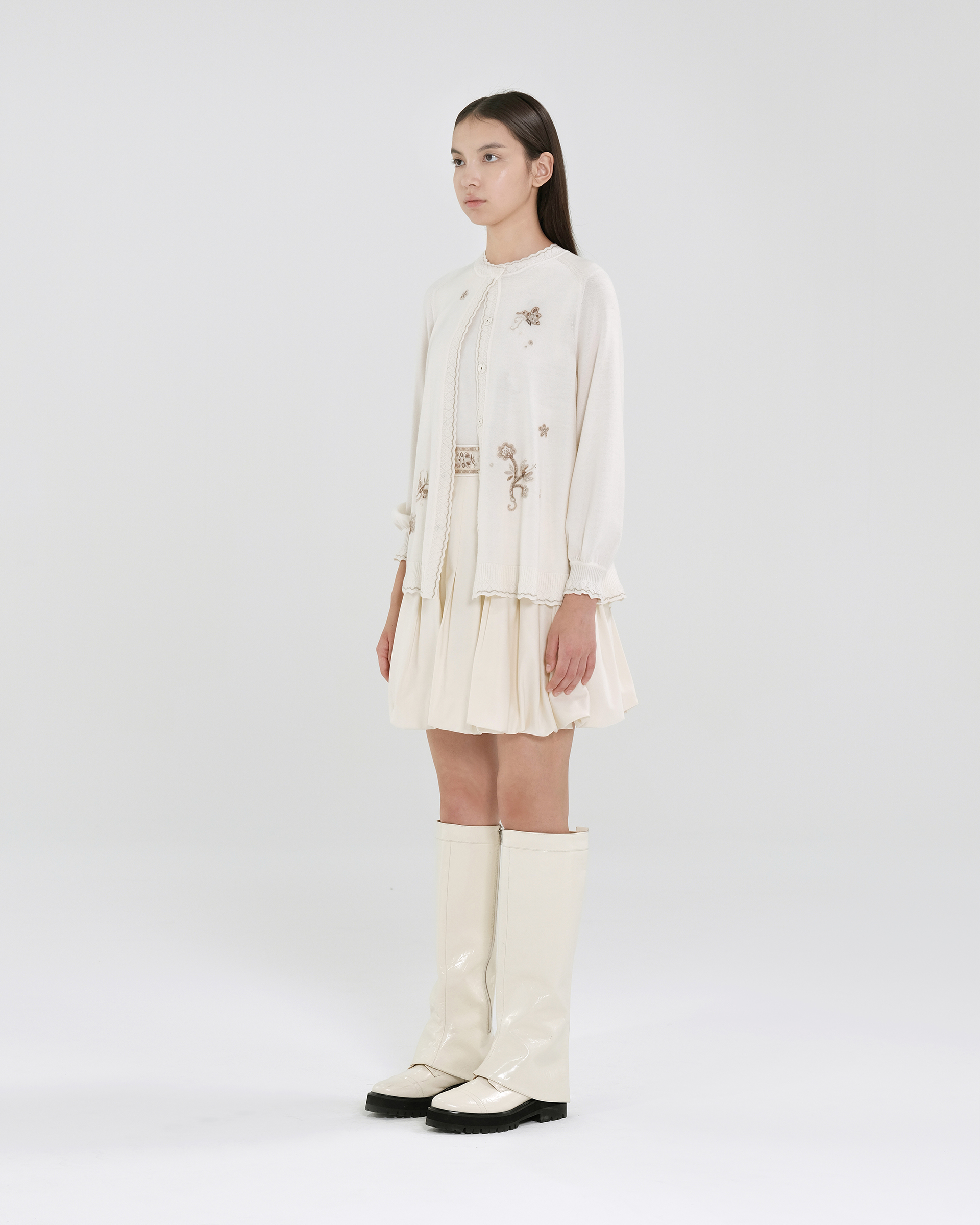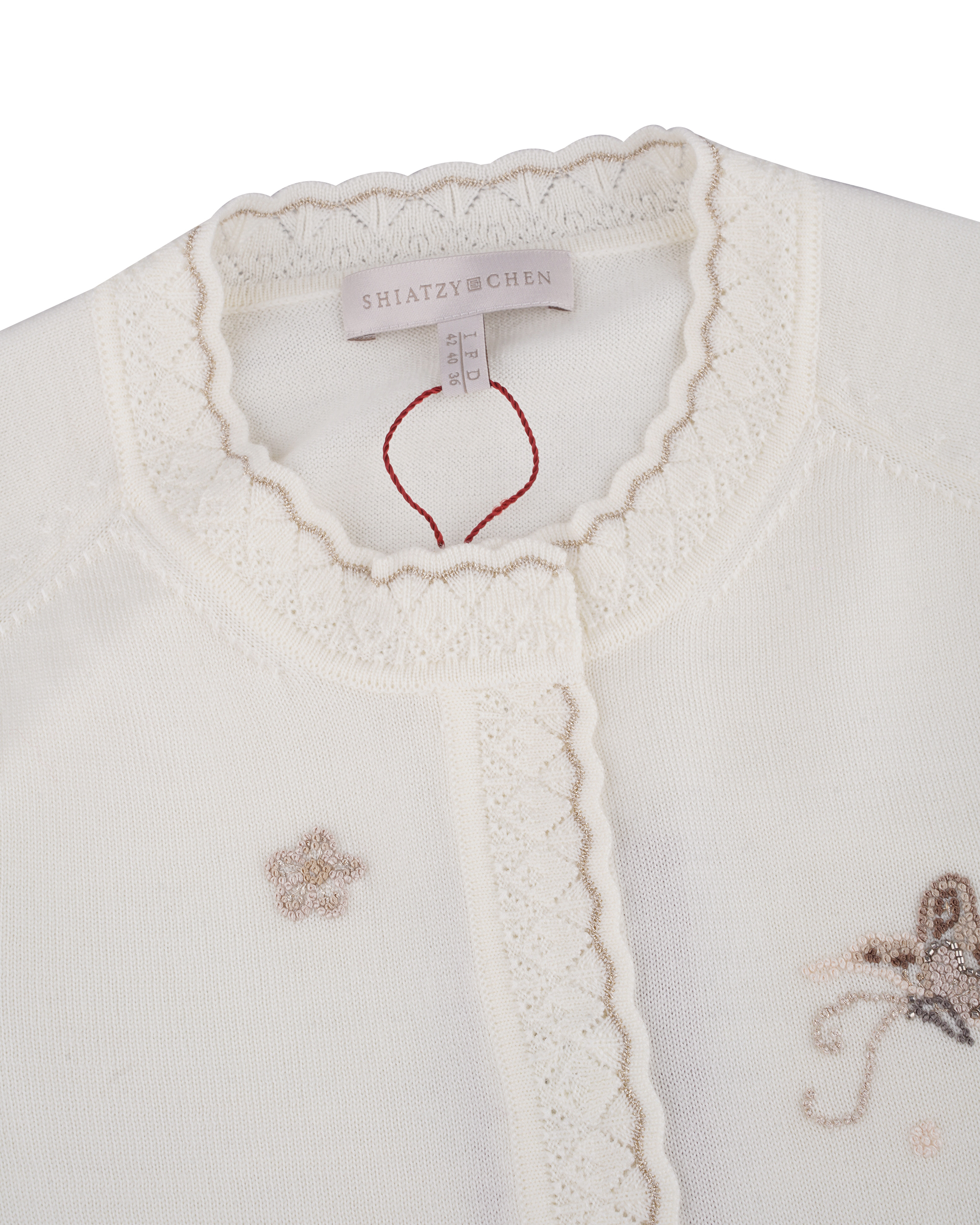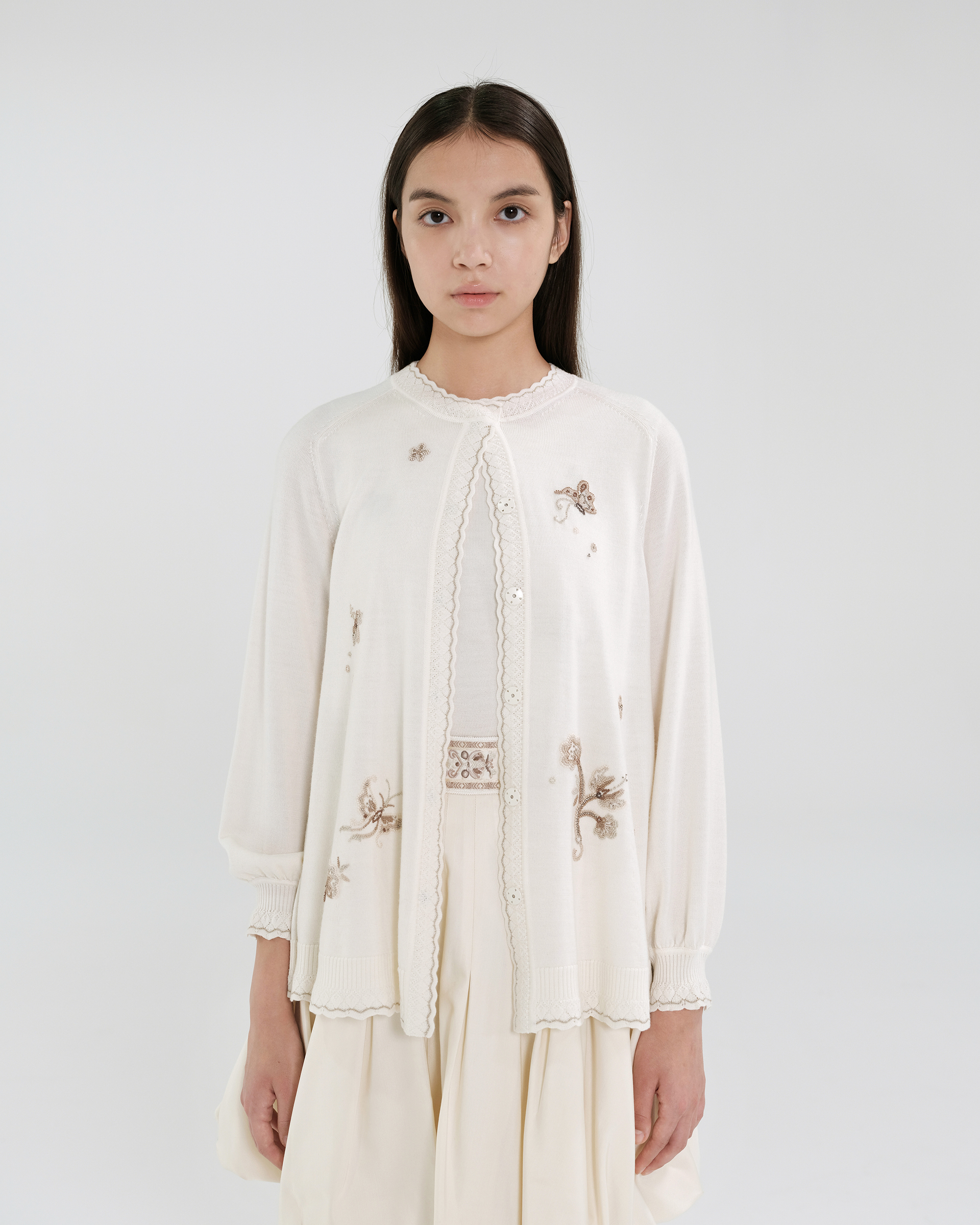 This piece is crafted from wool fabric, with delicate seed stitch embroidery outlining this season's butterfly motif. The tailored silhouette accentuates the beautiful weave.
