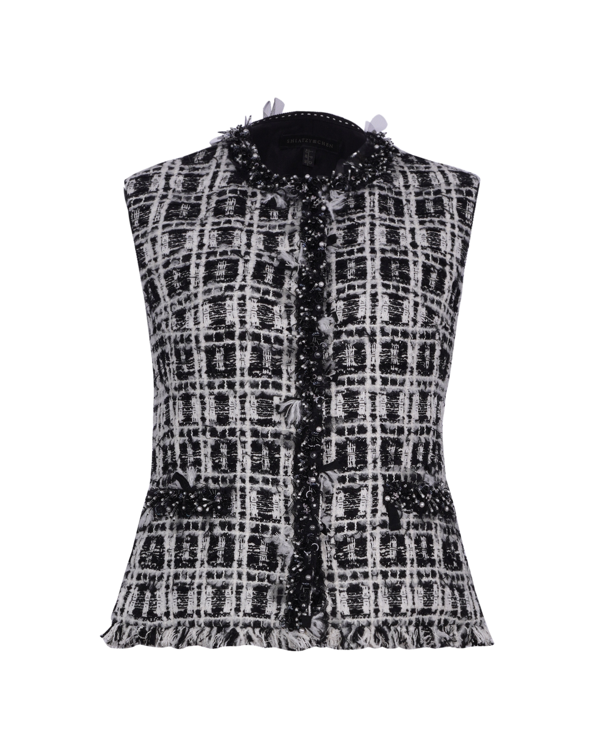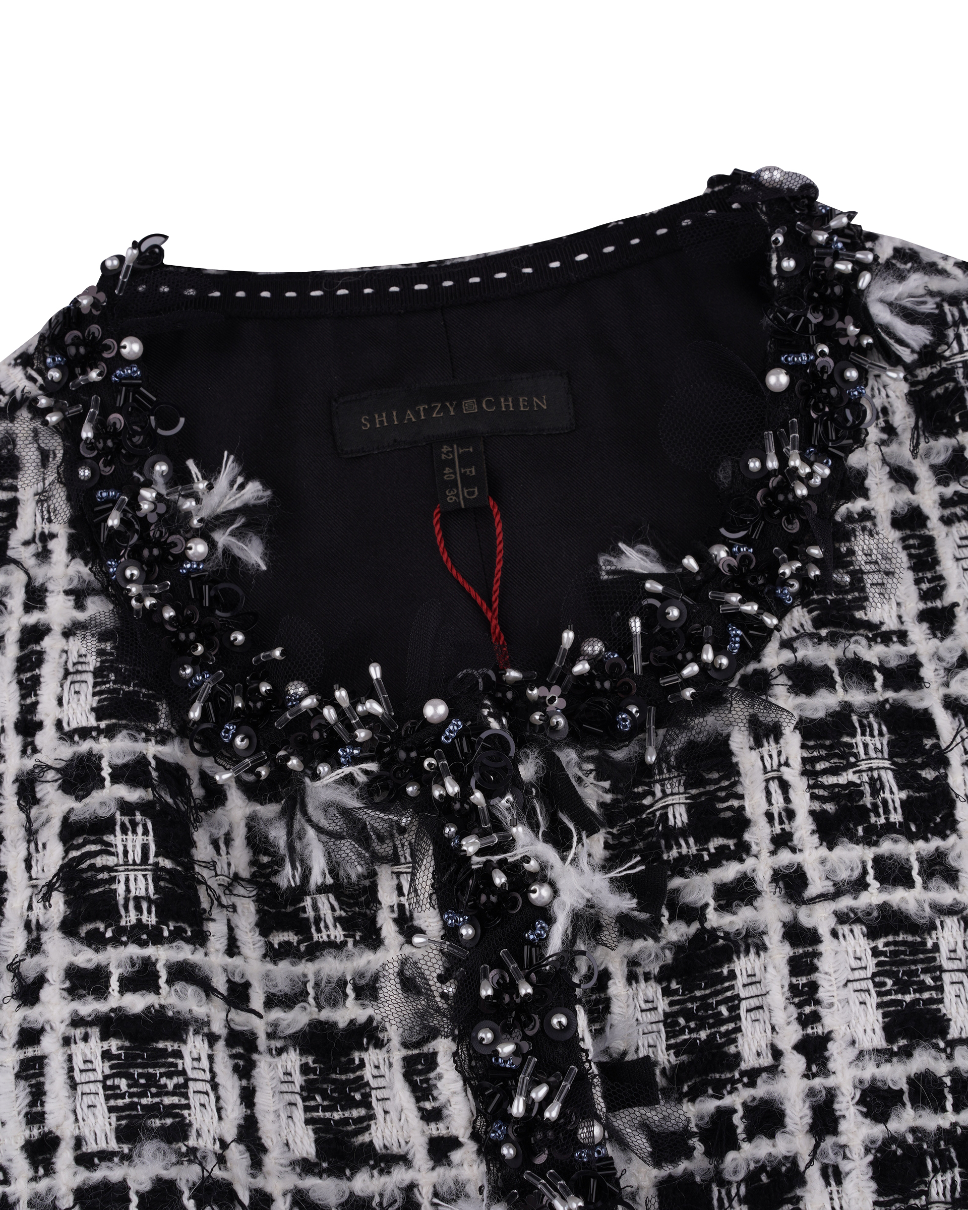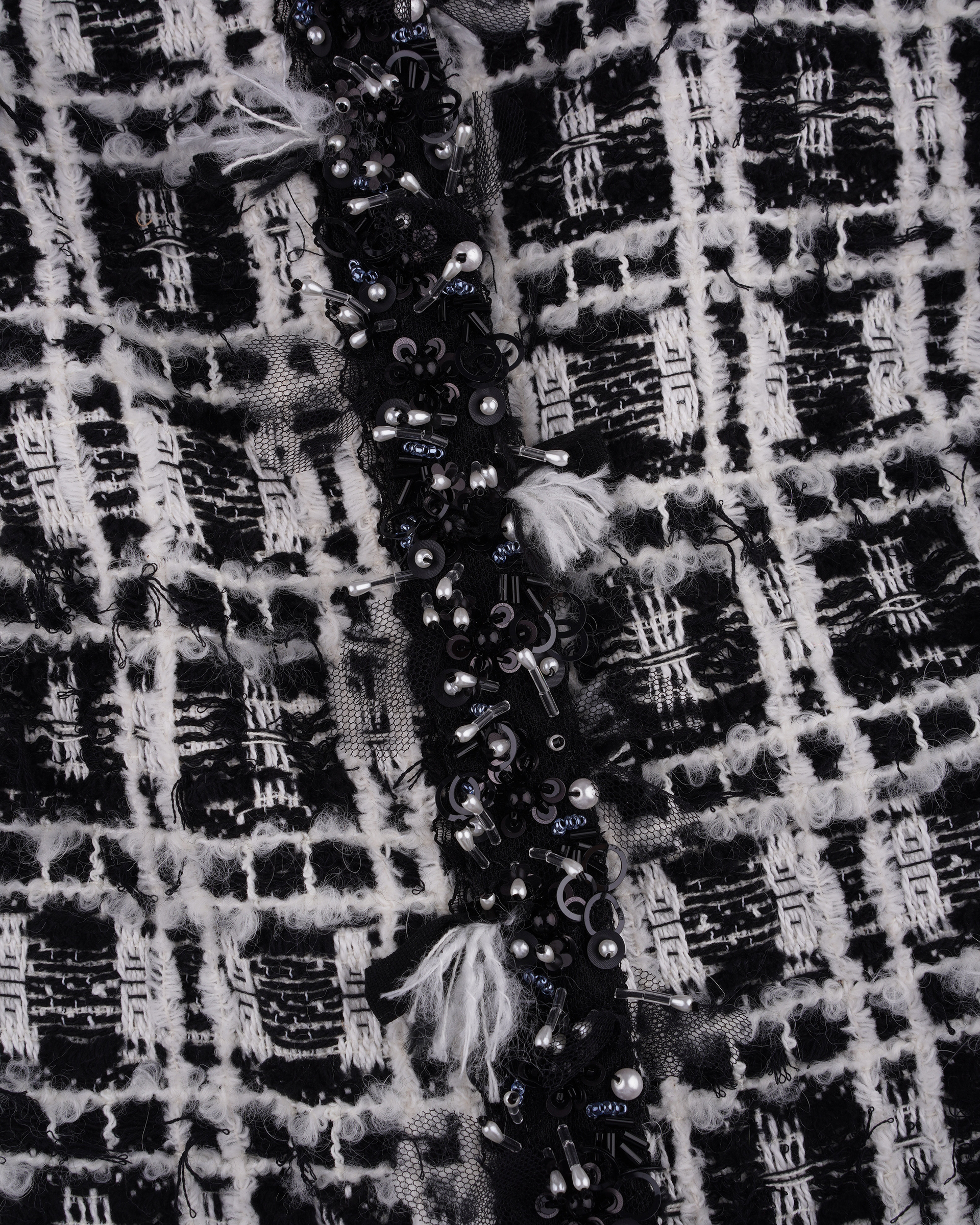 This piece is crafted from a black-and-white interwoven tweed fabric, featuring beaded edging that embodies the romantic and elegant spirit of the modern urban woman.