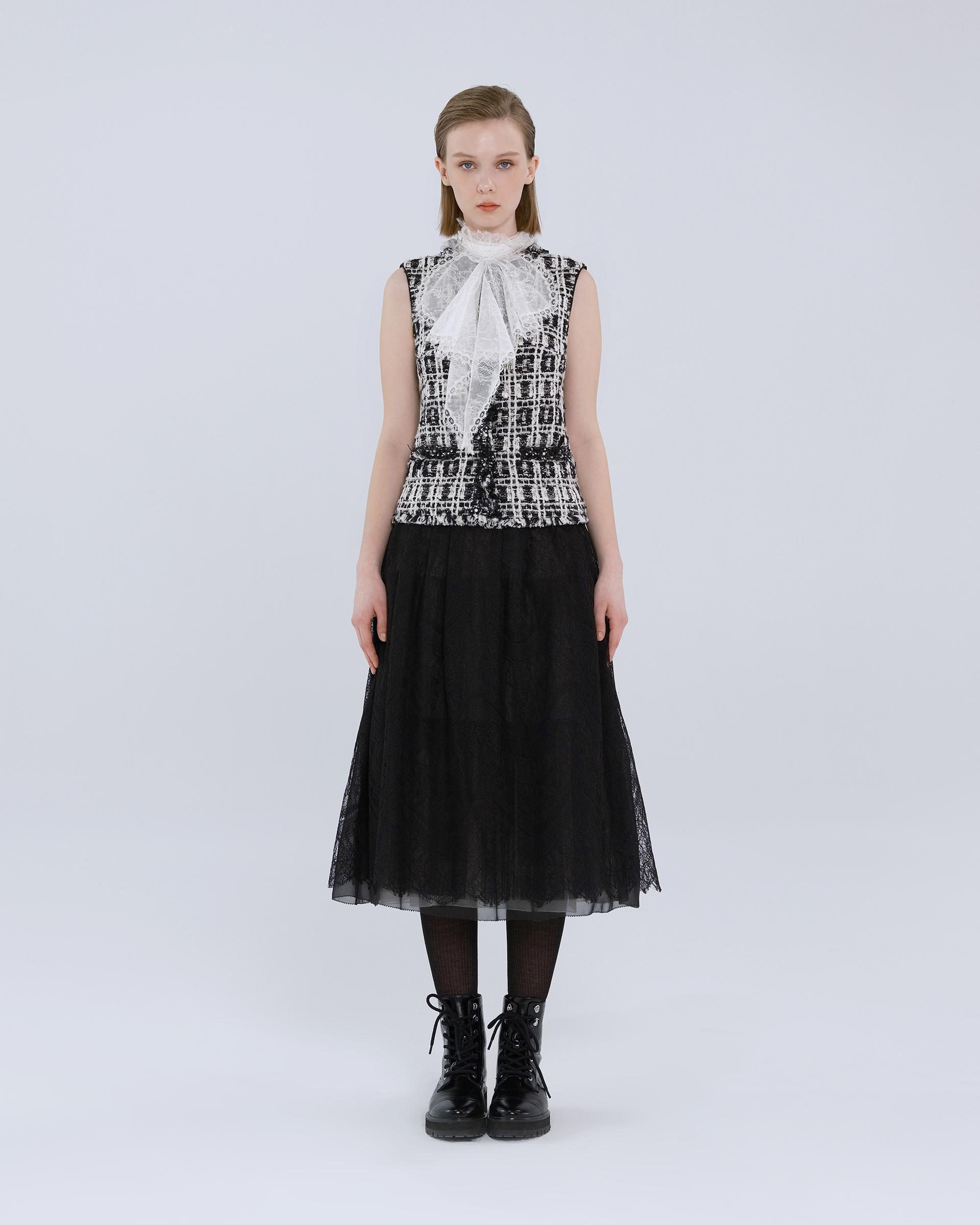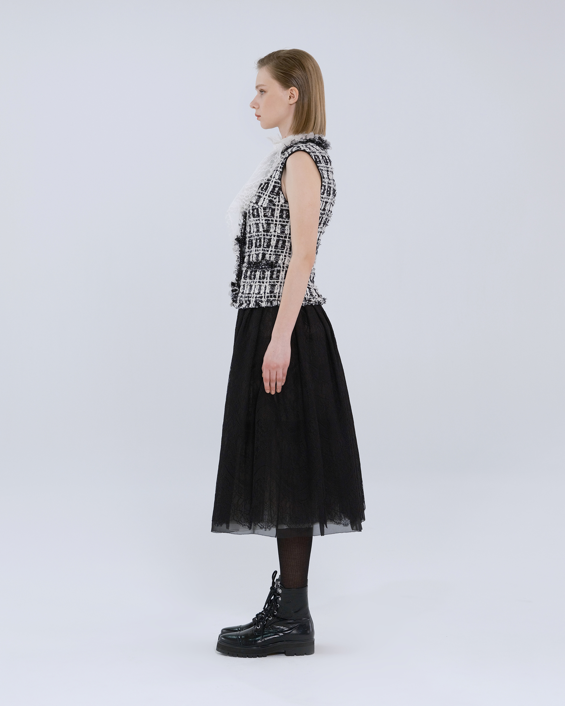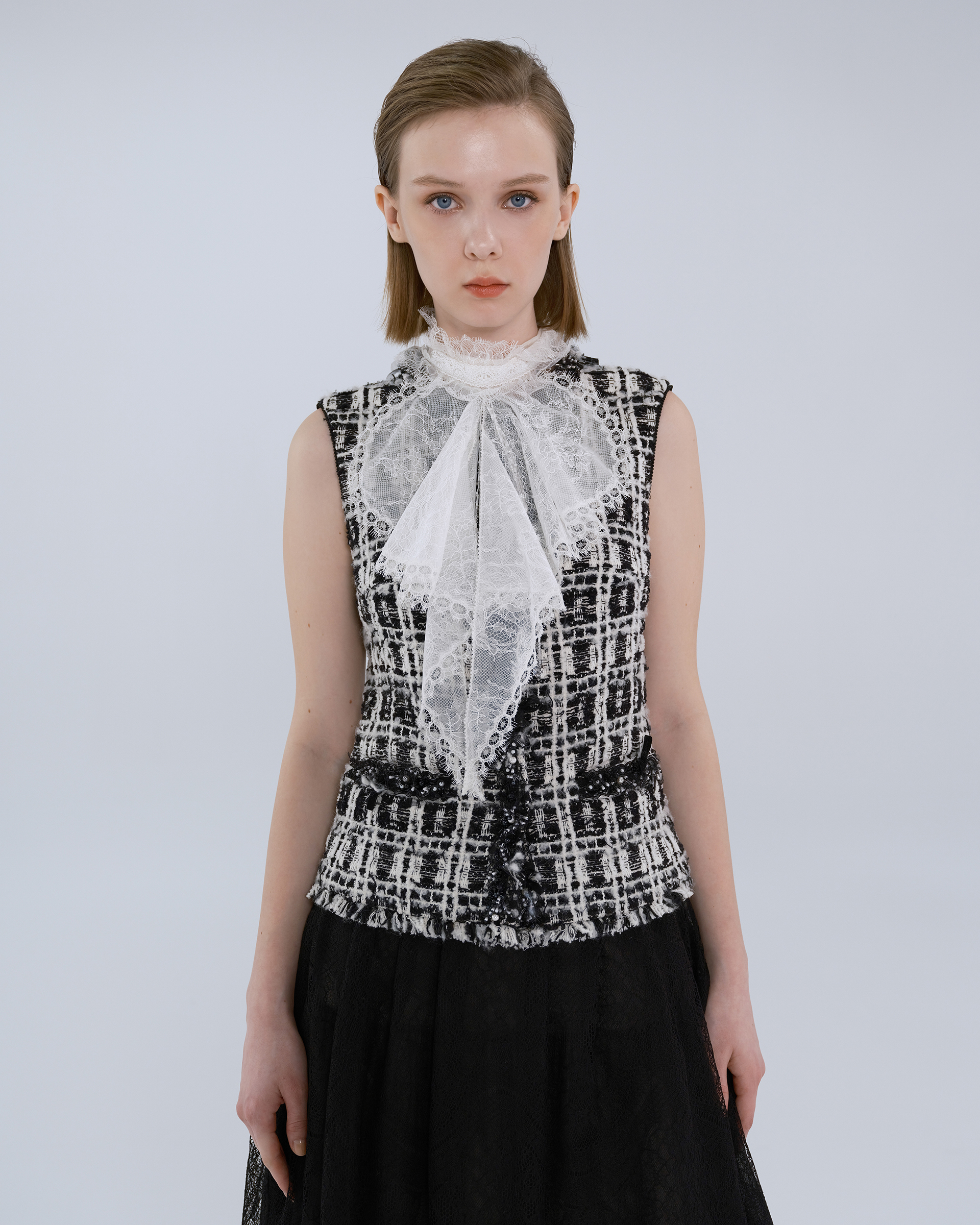 This piece is crafted from a black-and-white interwoven tweed fabric, featuring beaded edging that embodies the romantic and elegant spirit of the modern urban woman.