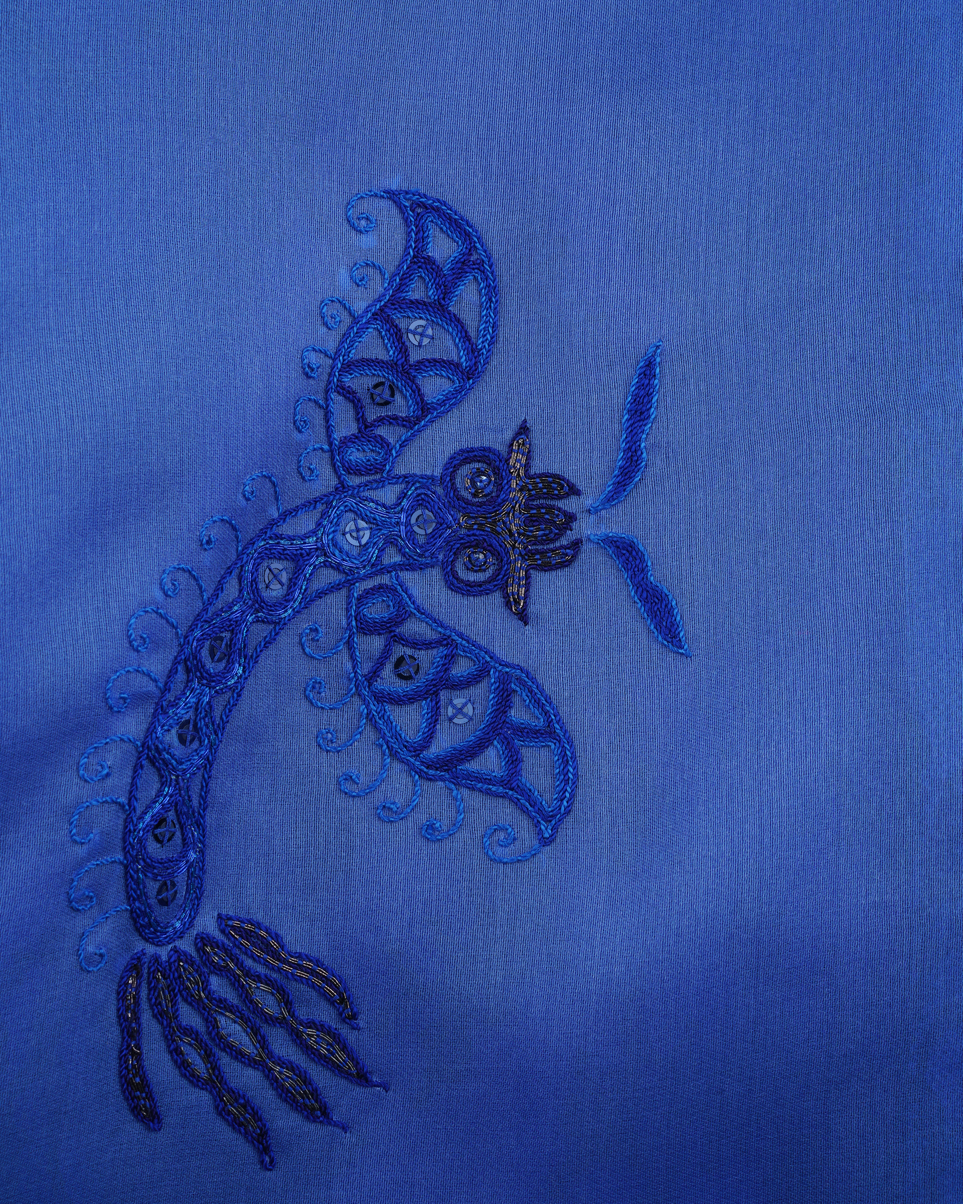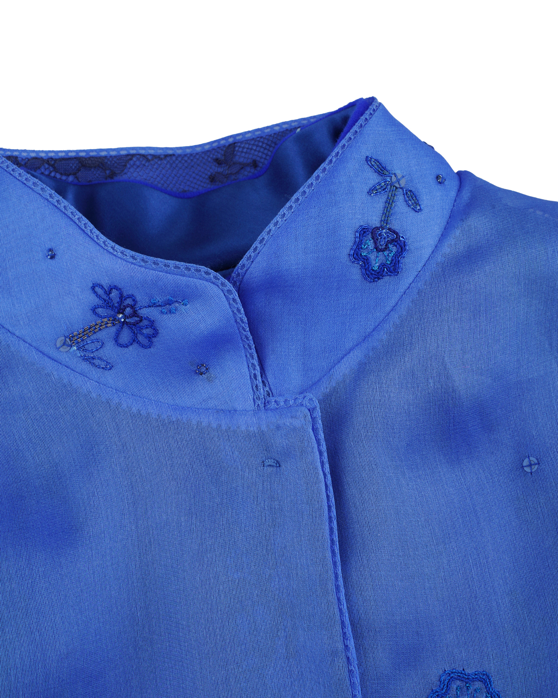 This piece is crafted from 100% mulberry silk fabric, featuring a richly layered lace lining and embroidered motifs that lend an elegant and dignified aura to the wear.
