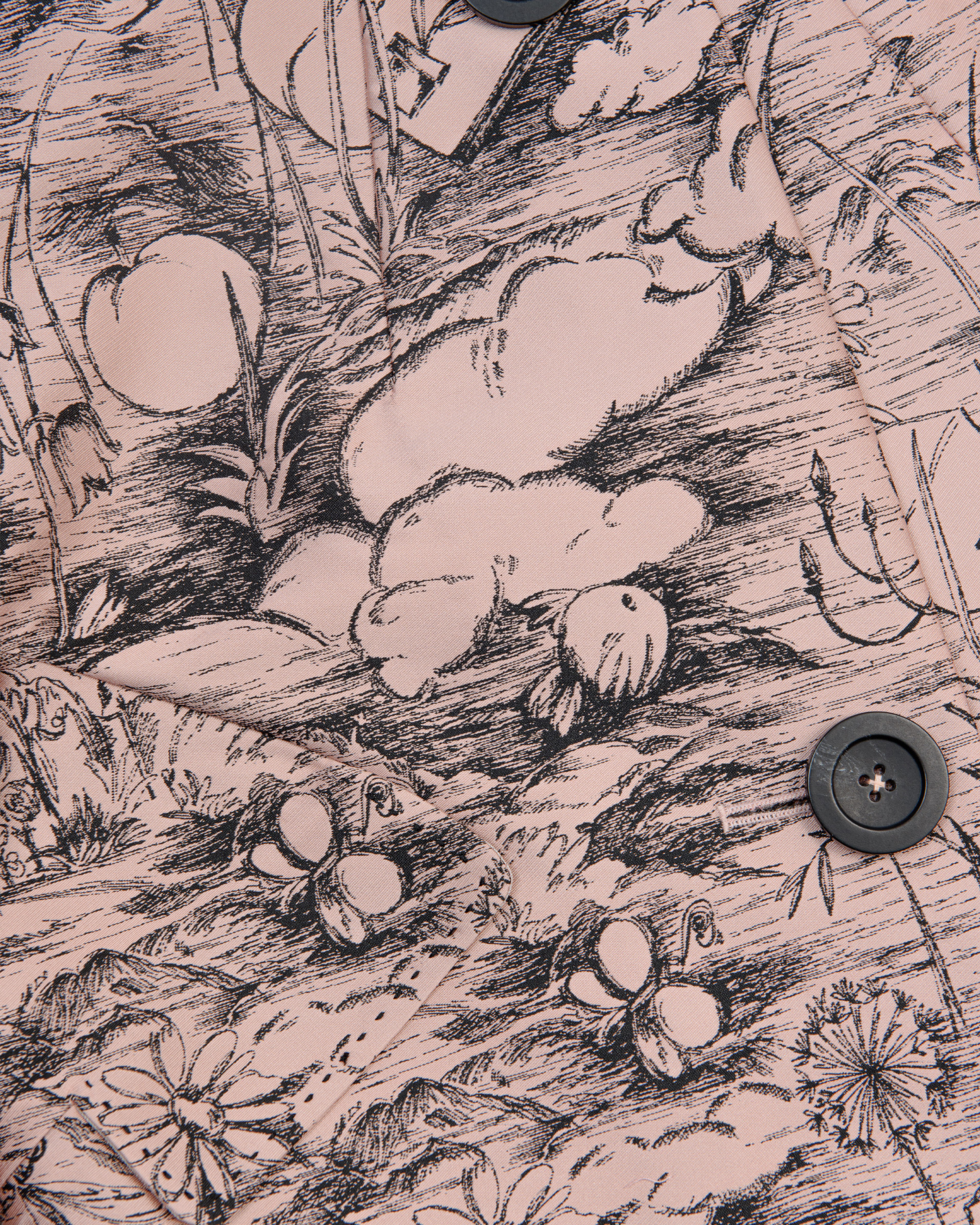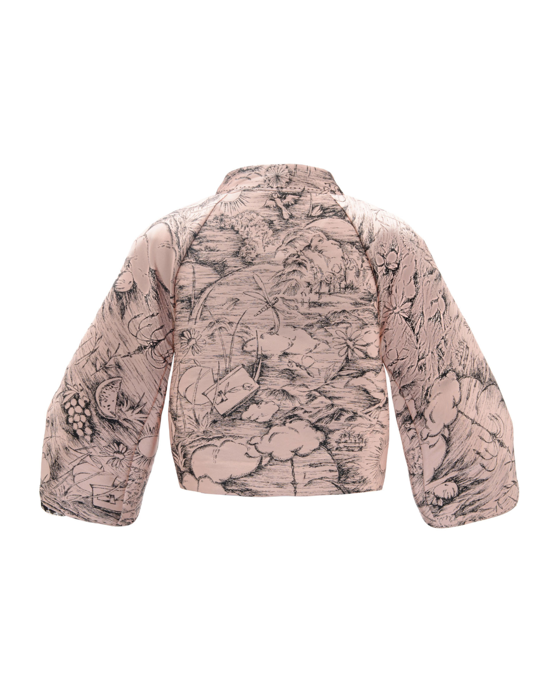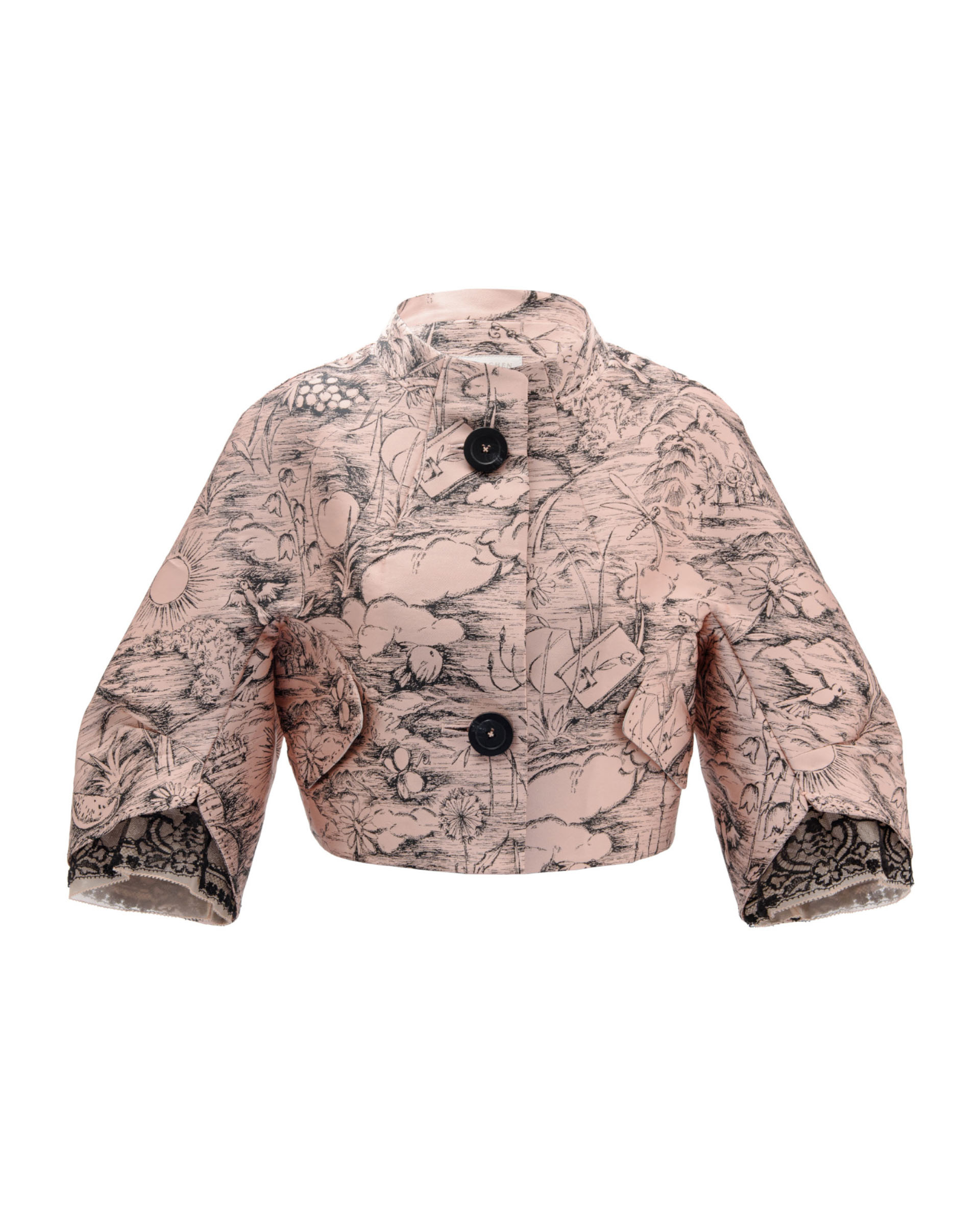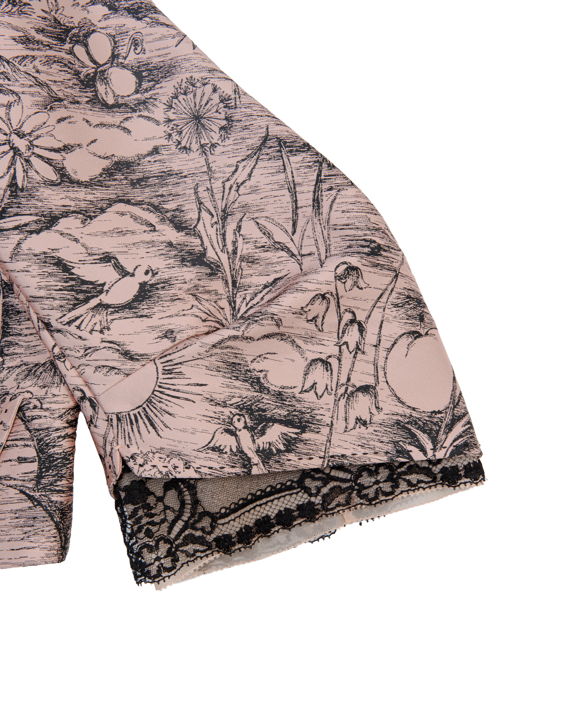 Weaving flowers, fruits, birds, and sunlight into a poetic tableau, paired with vintage line-drawn textures. Lace-trimmed cuffs preserve a light, sheer feel, presenting an elegant and understated quality.