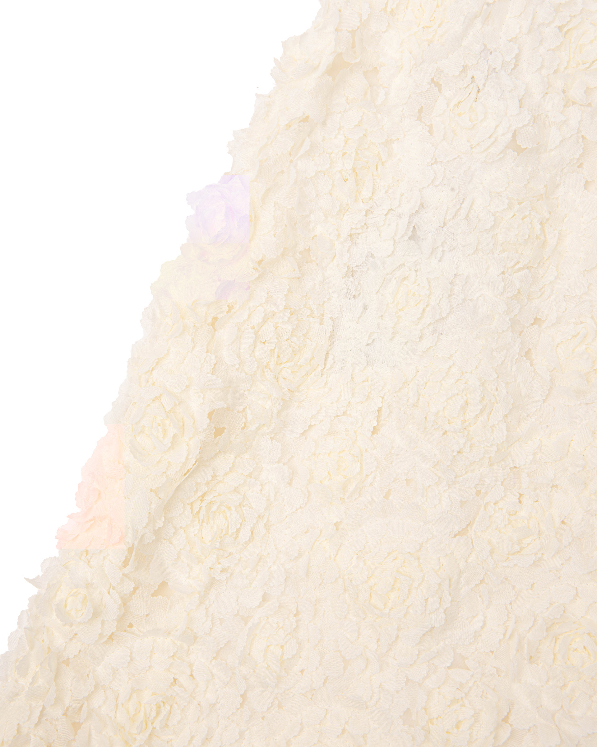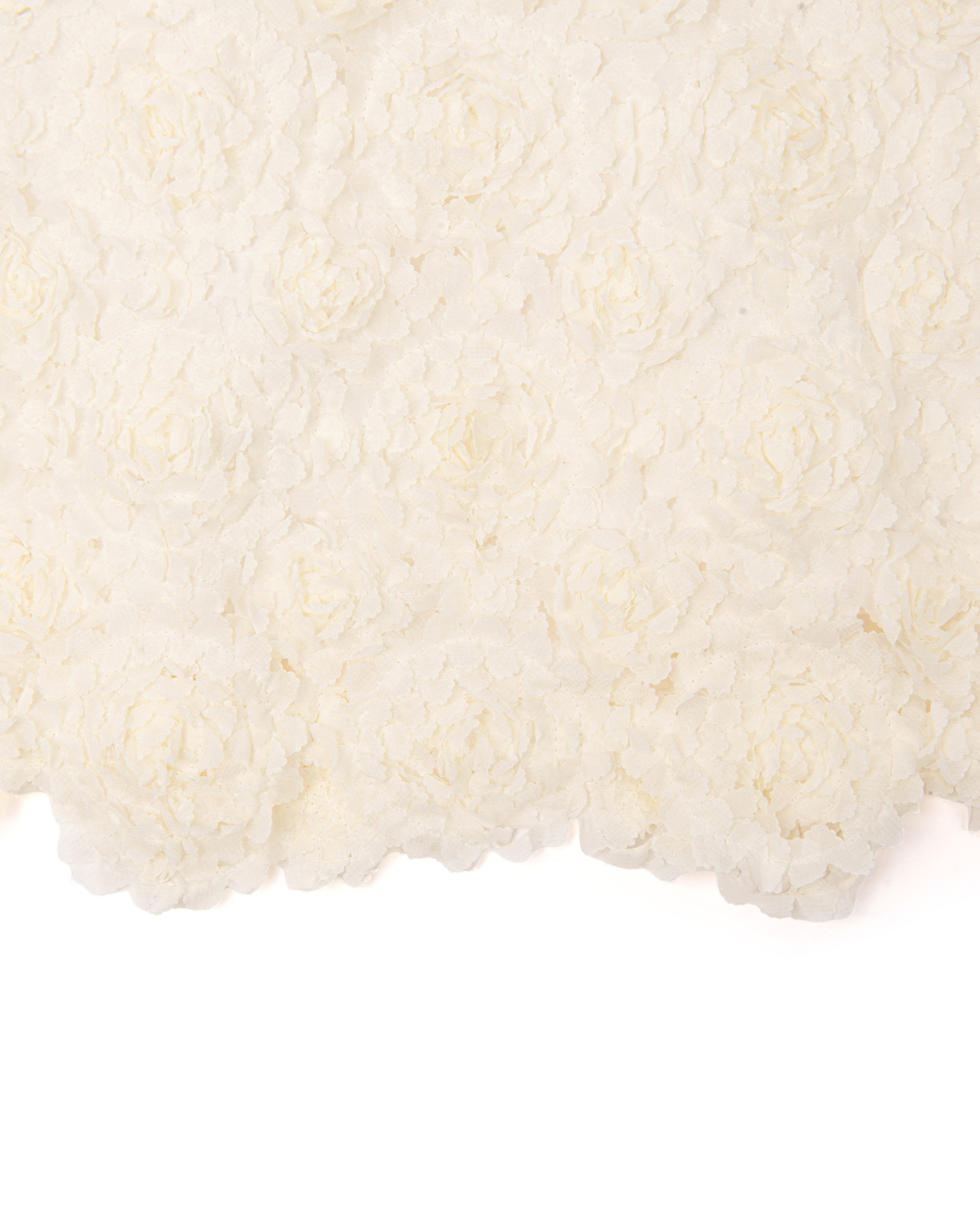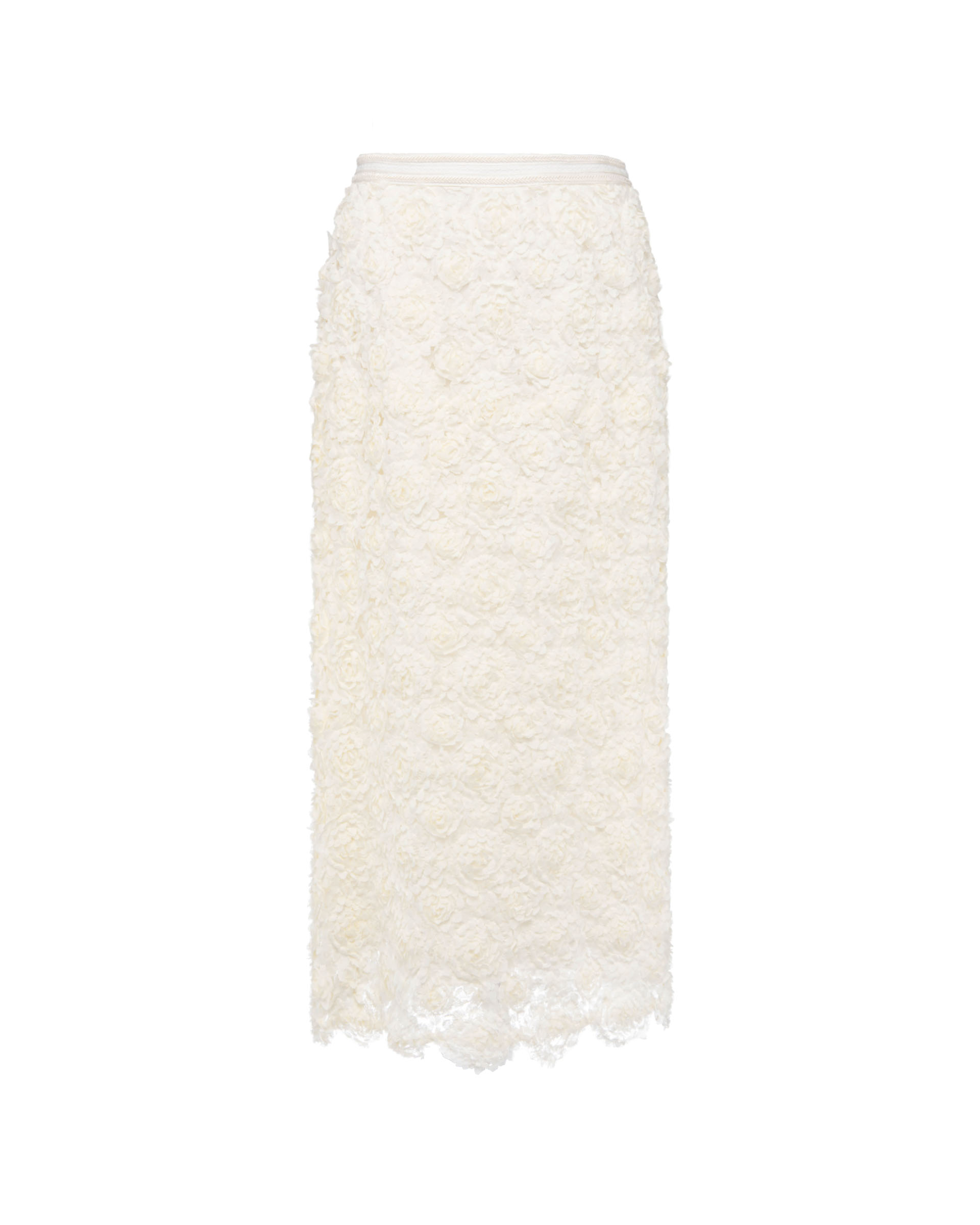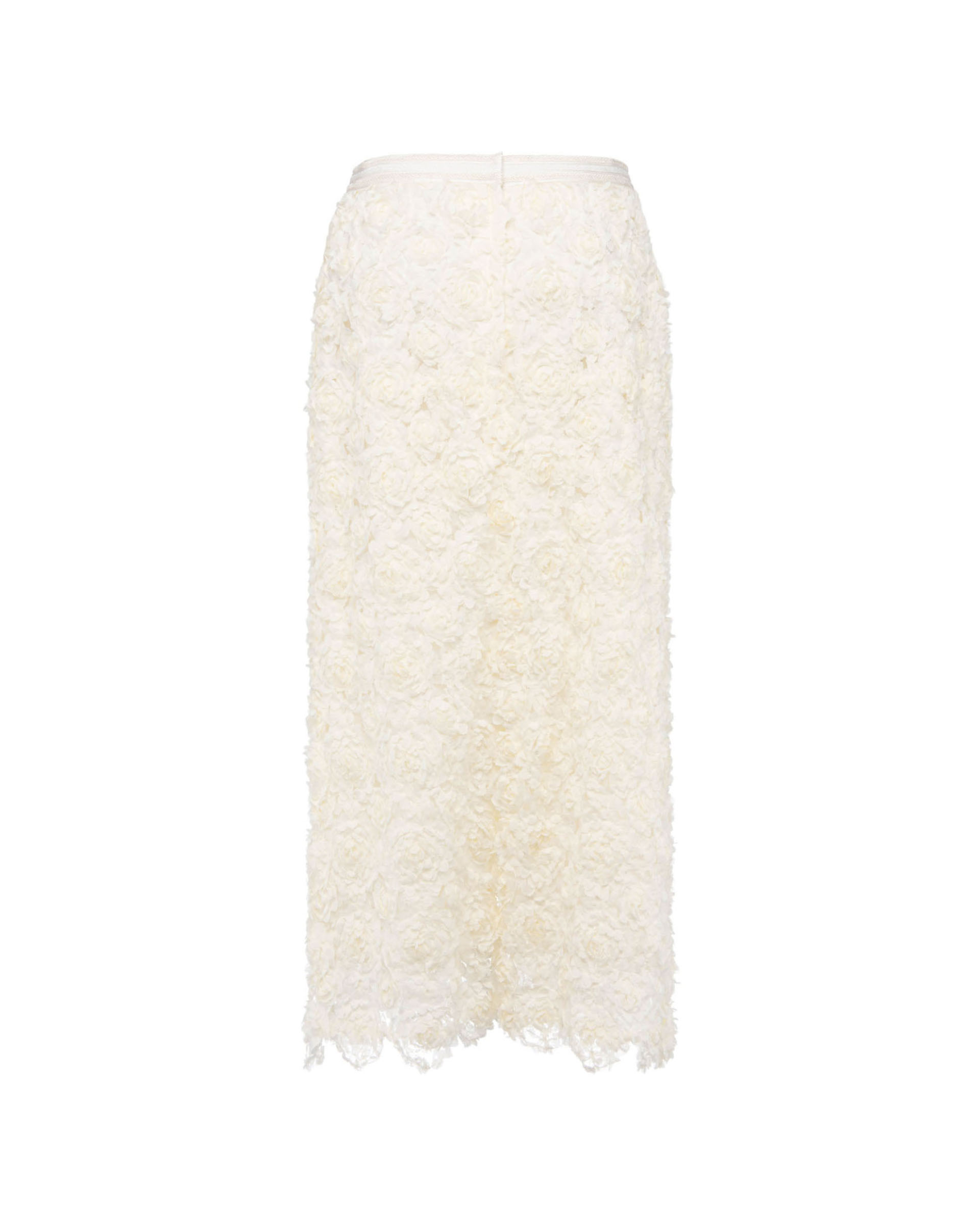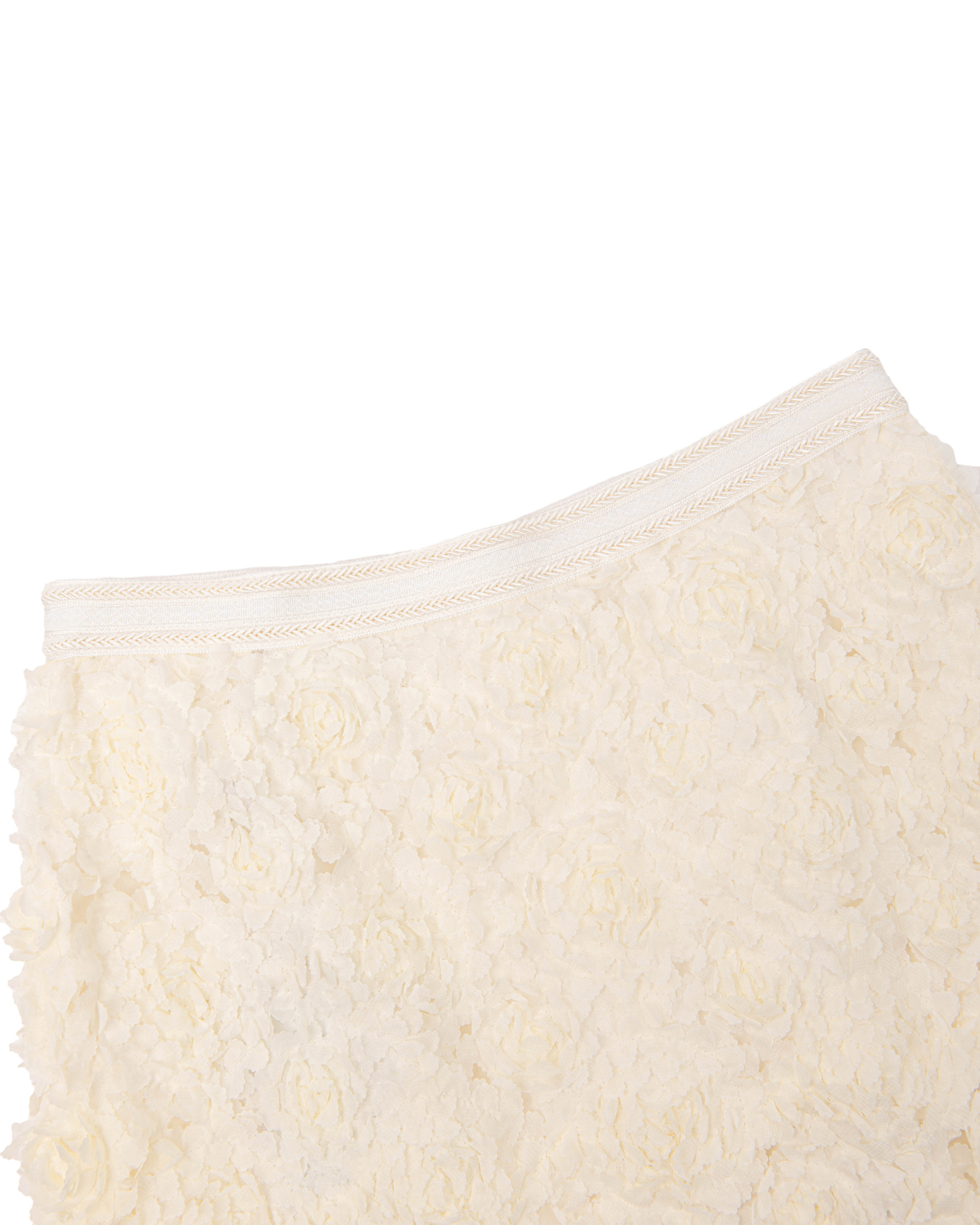 The skirt is adorned with layered, intricate three-dimensional floral appliqués, while the asymmetrical hemline creates a light and airy silhouette. The straight, slim-fit design accentuates an elegant feminine grace.
