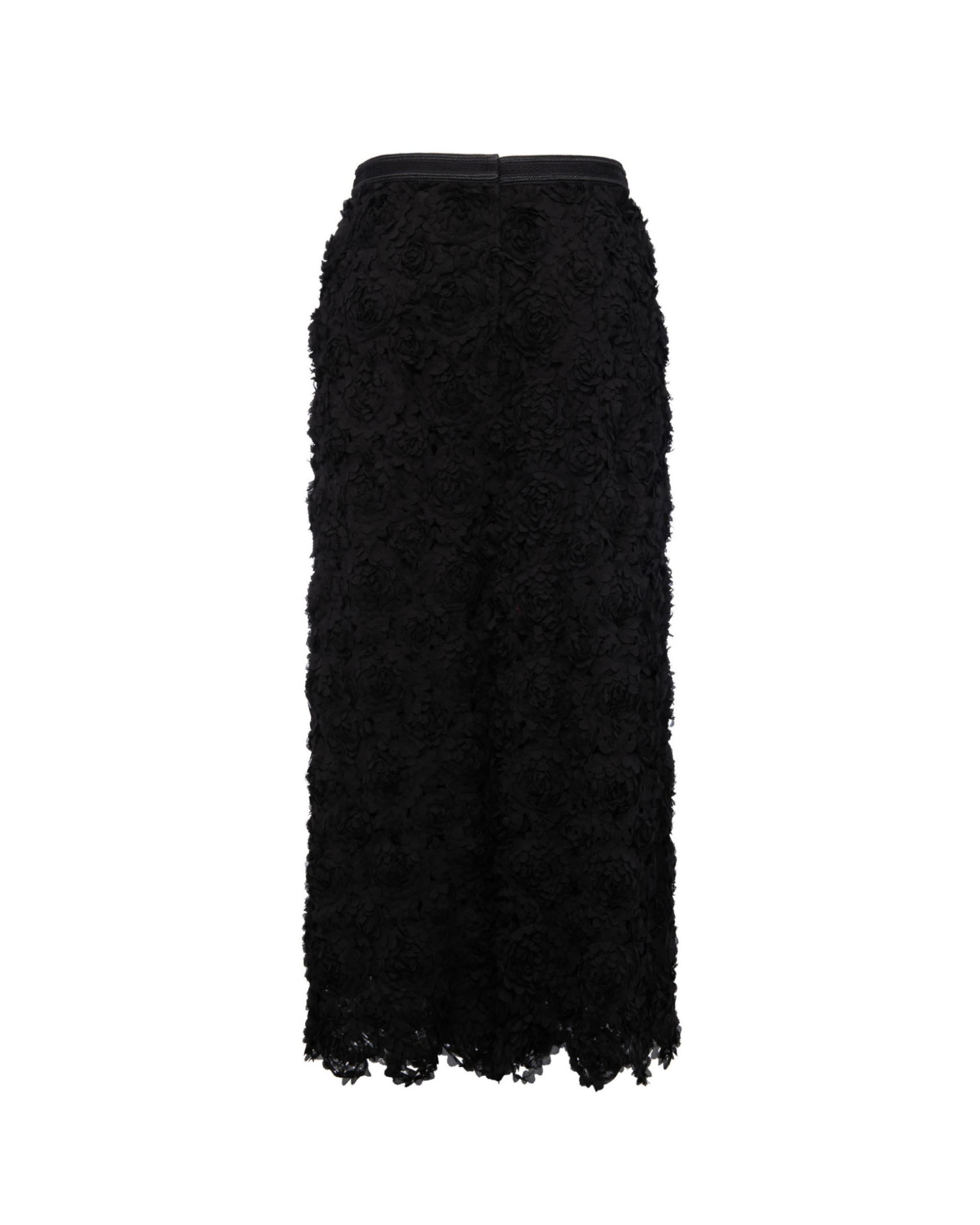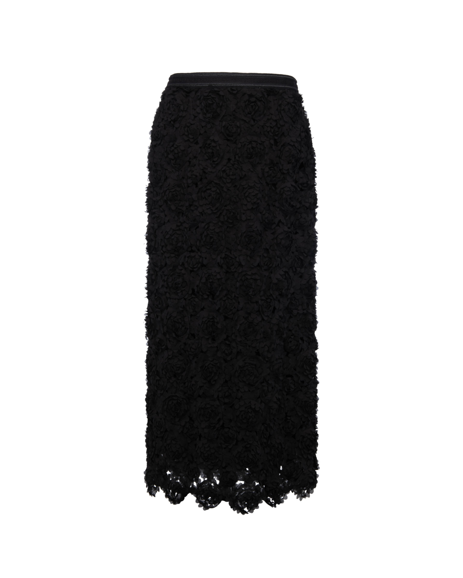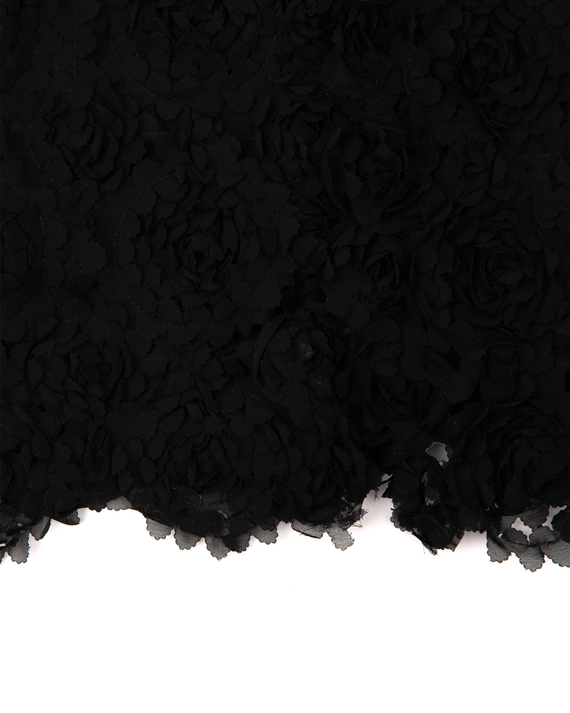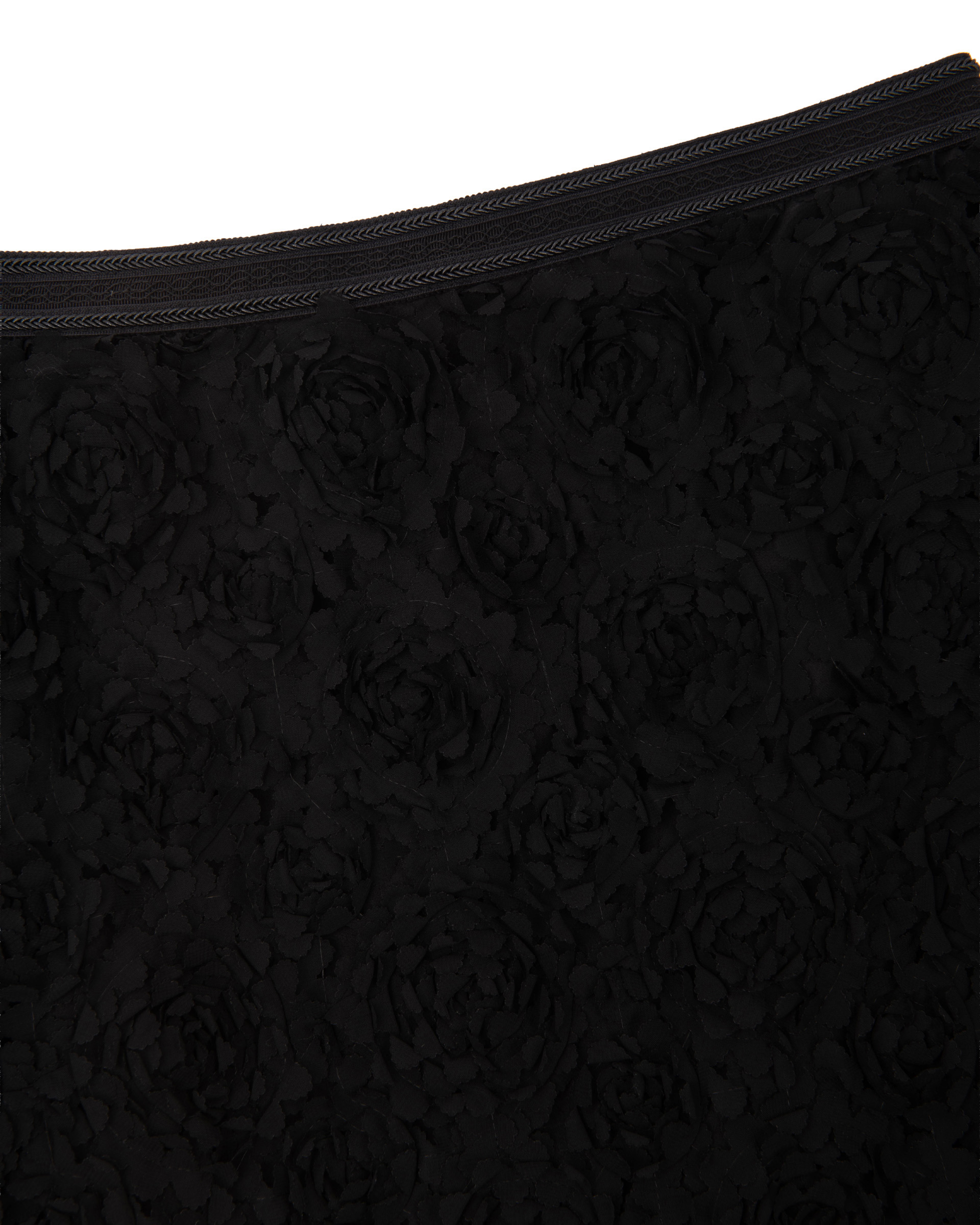 The skirt is adorned with layered, intricate three-dimensional floral appliqués, while the asymmetrical hemline creates a light and airy silhouette. The straight, slim-fit design accentuates an elegant feminine grace.
