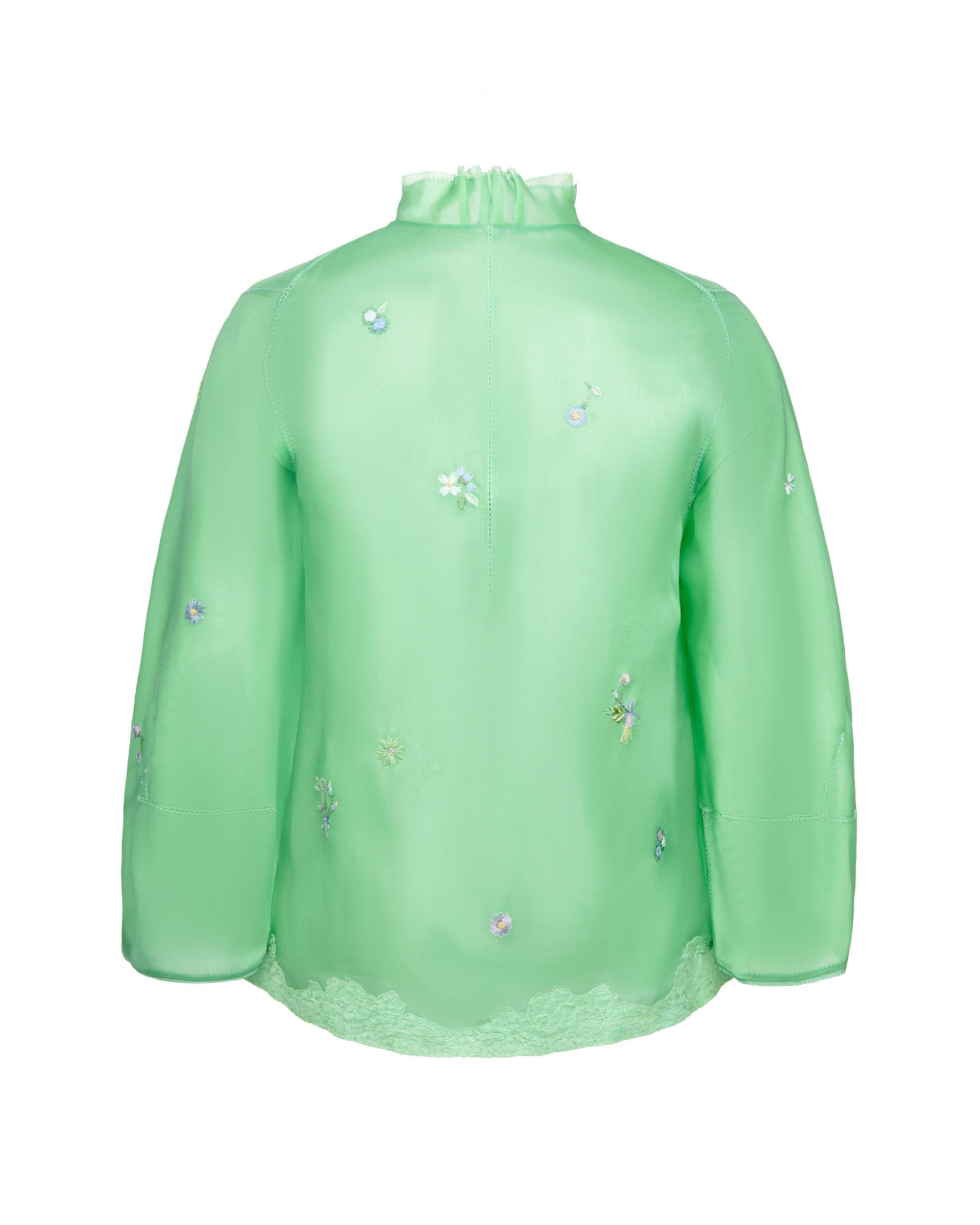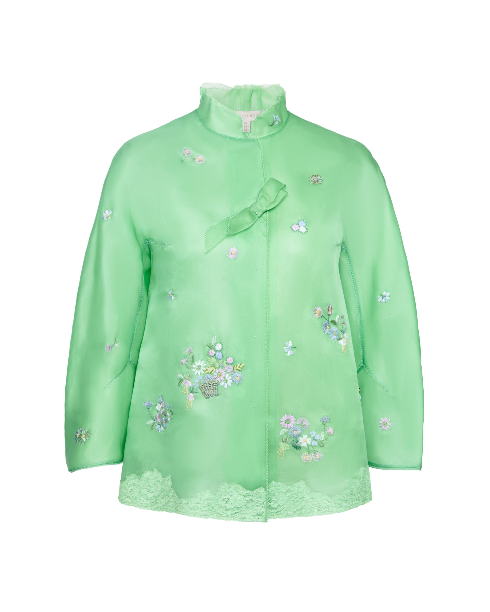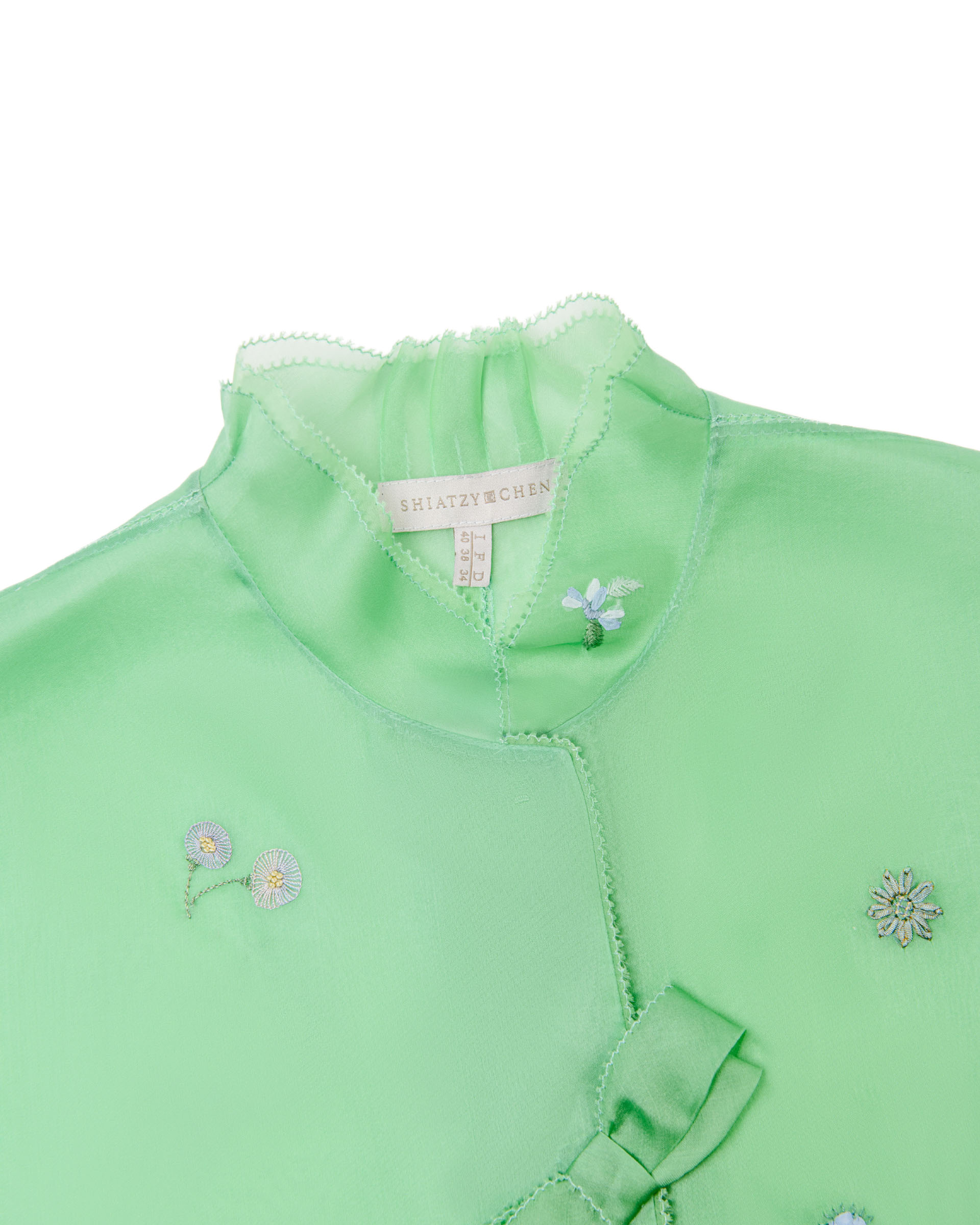 This piece is crafted from 100% mulberry silk fabric, featuring vibrant floral patterns. The soft green color palette, paired with intricate embroidery, evokes the exuberant spirit of springtime outings.