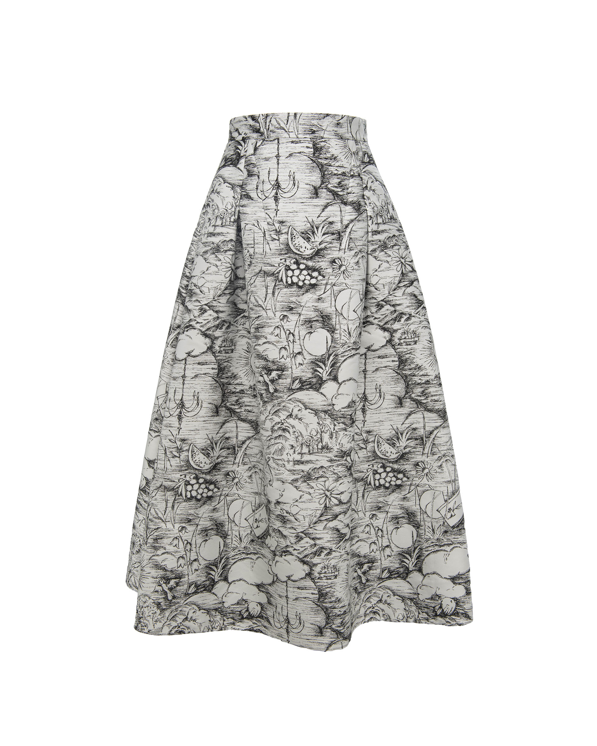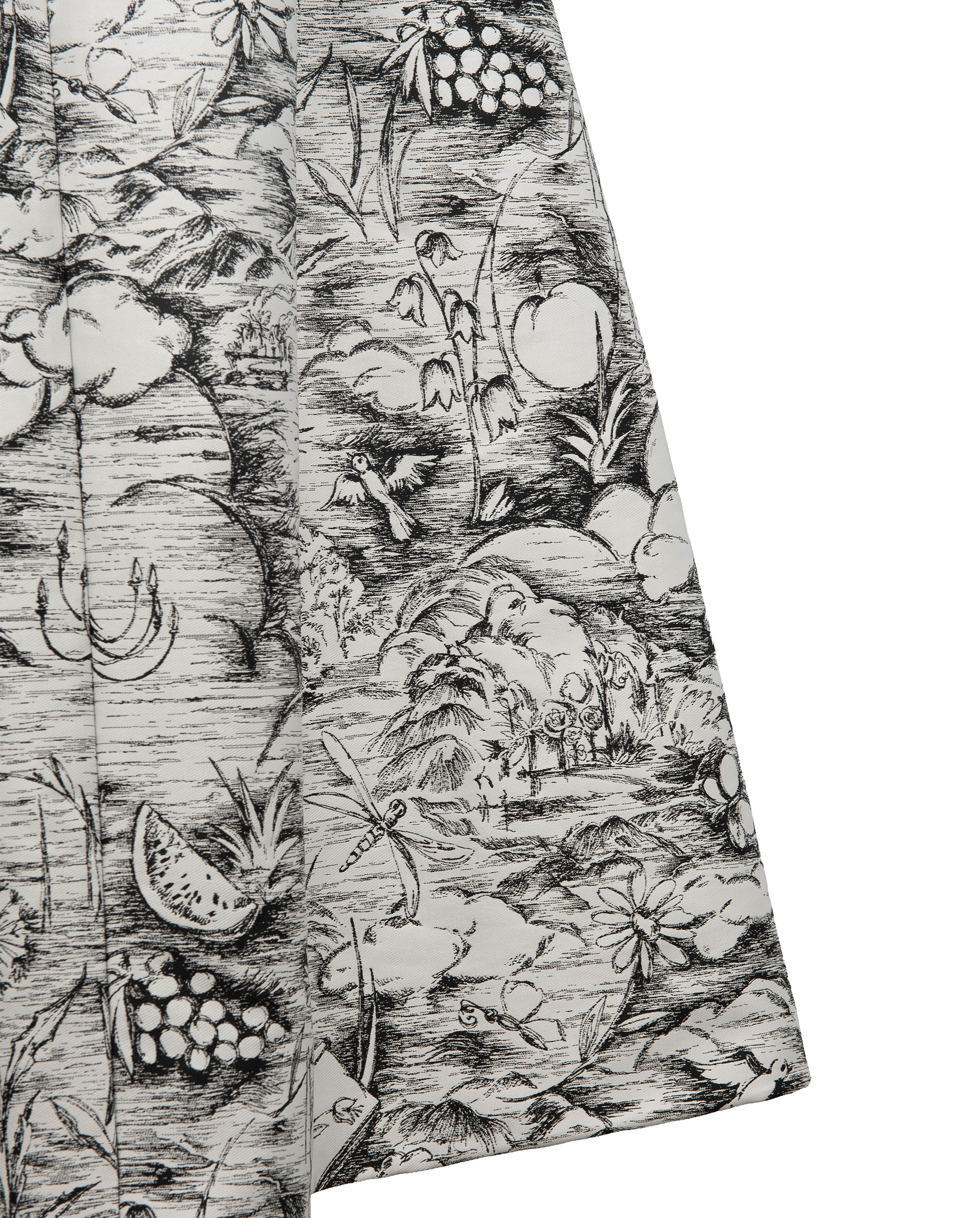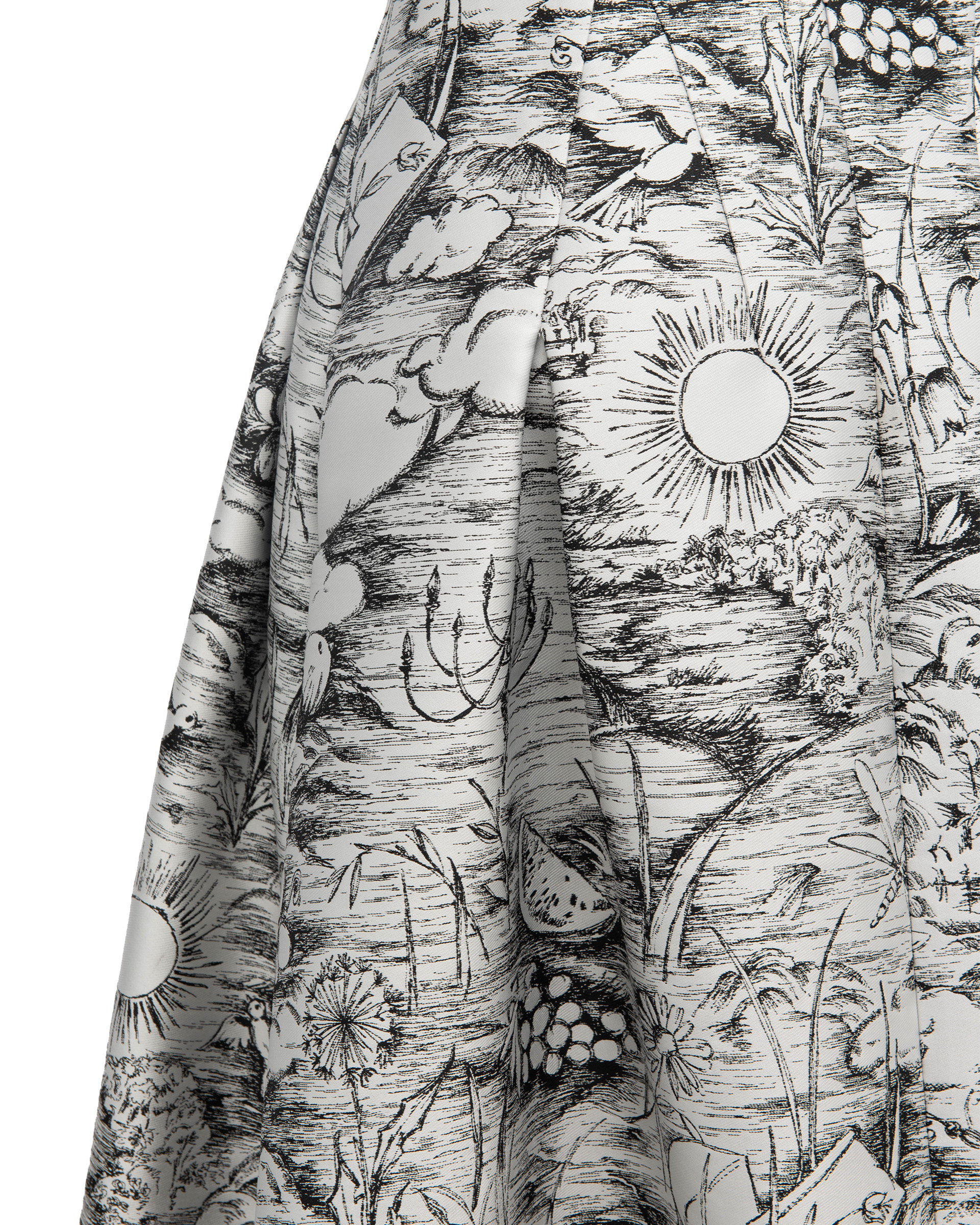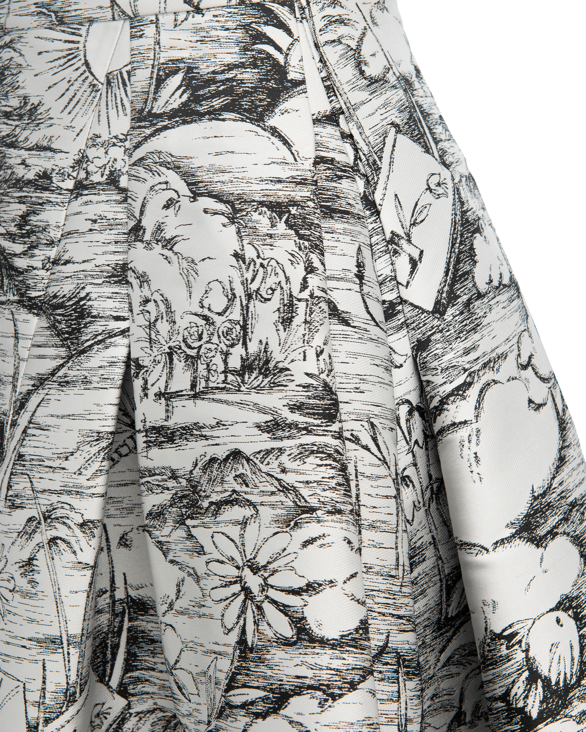 Floral motifs blend with vintage line drawings to evoke a textured aesthetic; puffed skirts paired with tailored tops create an elegant and understated look.