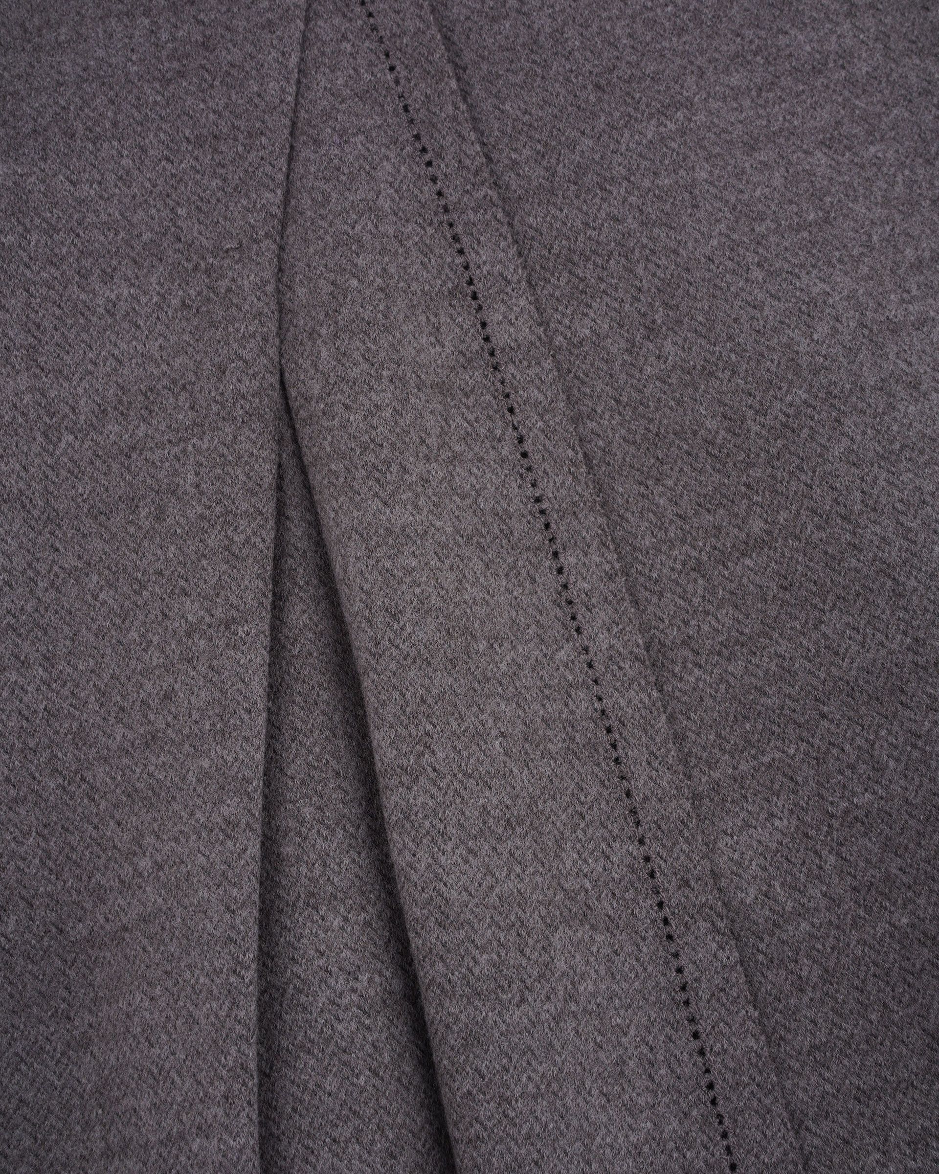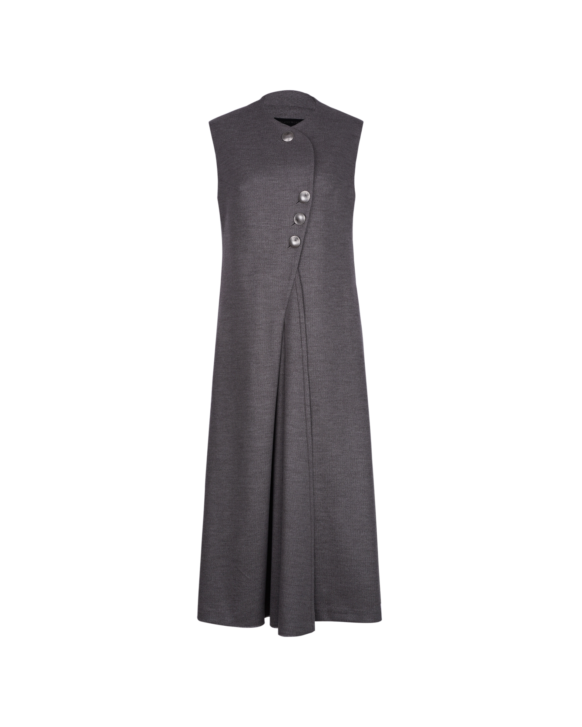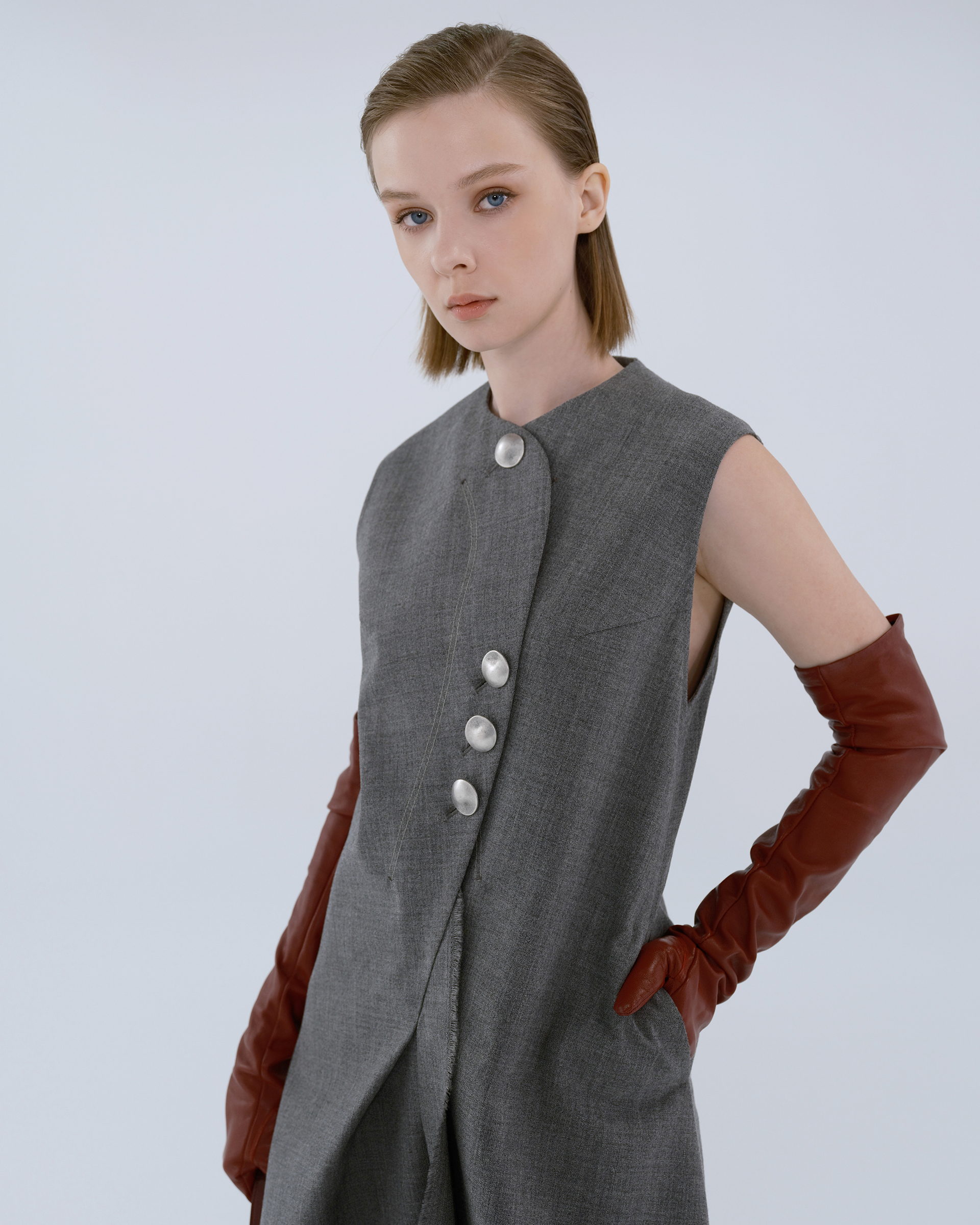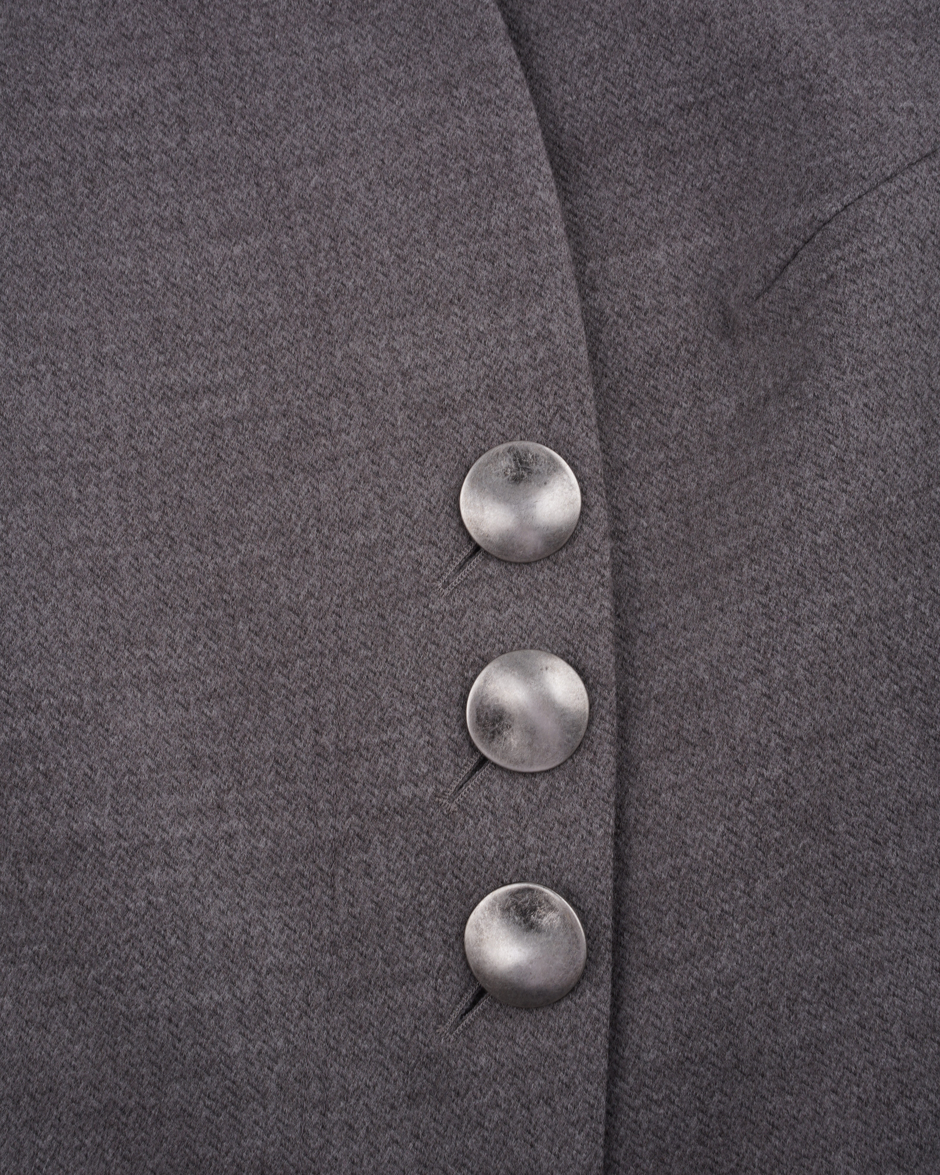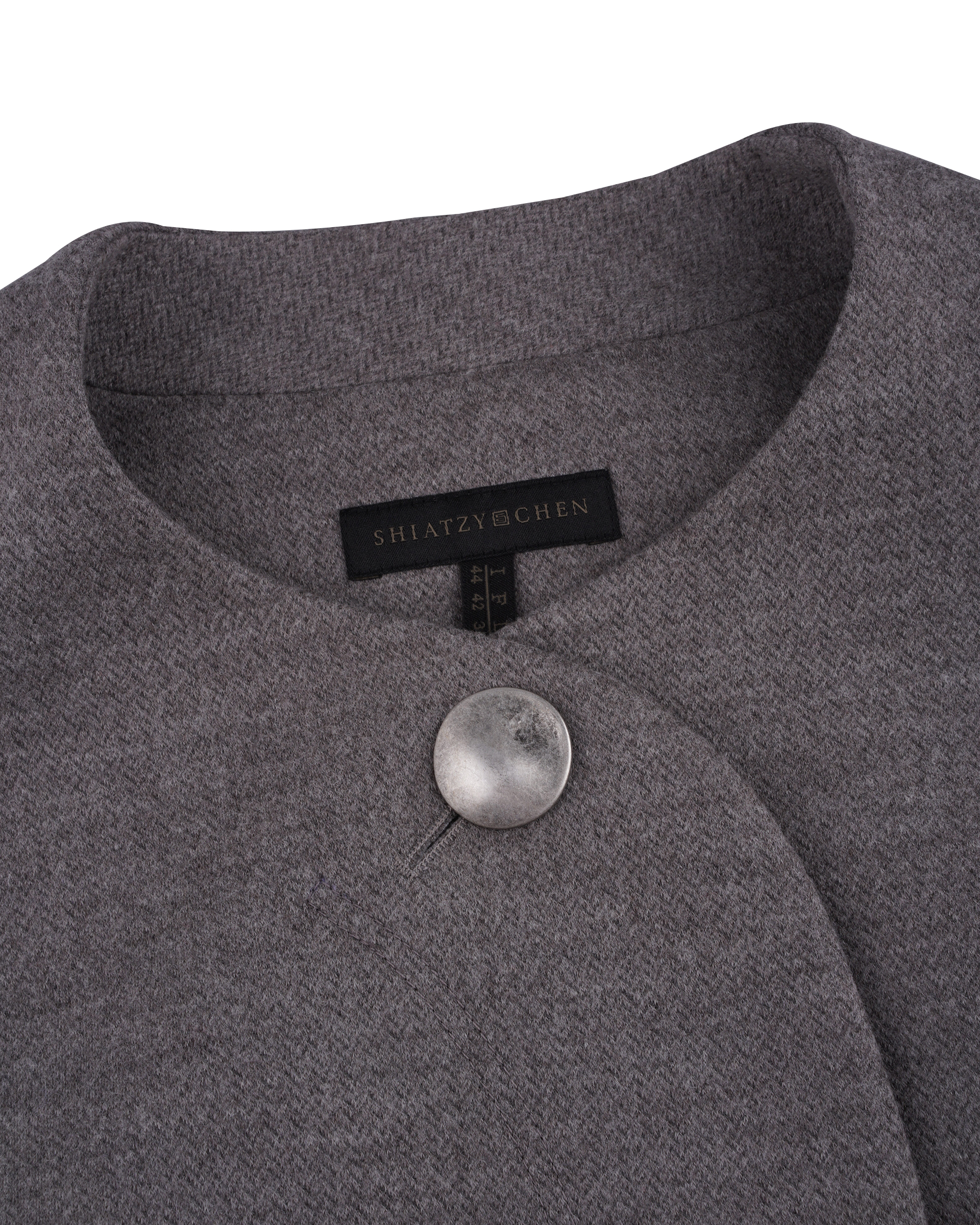 This piece is crafted from a wool blend fabric, featuring a round neckline with a diagonal placket and button closure, embodying a contemporary Chinese aesthetic through its rich texture.