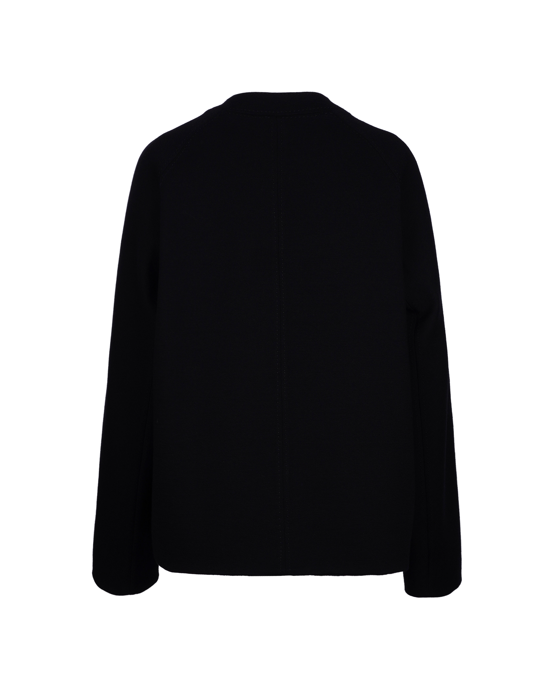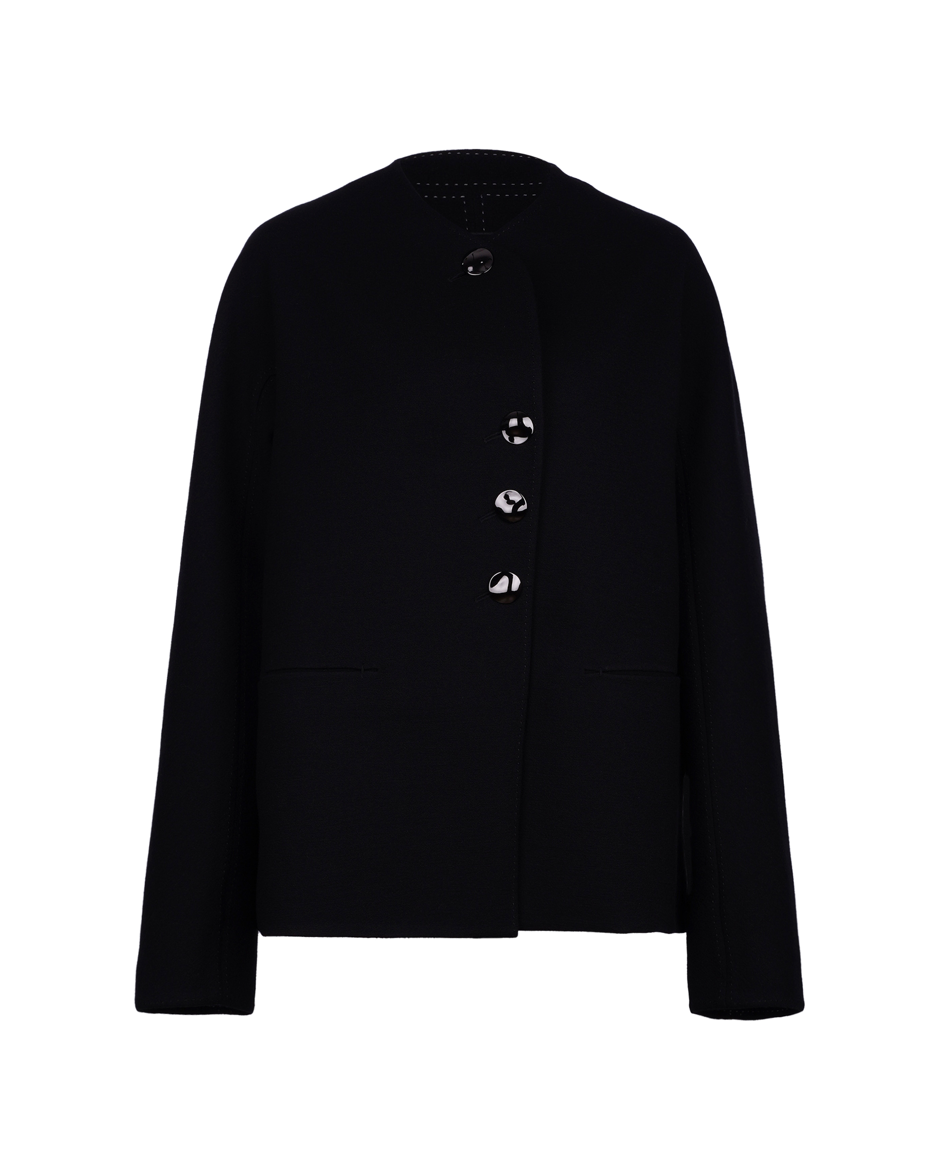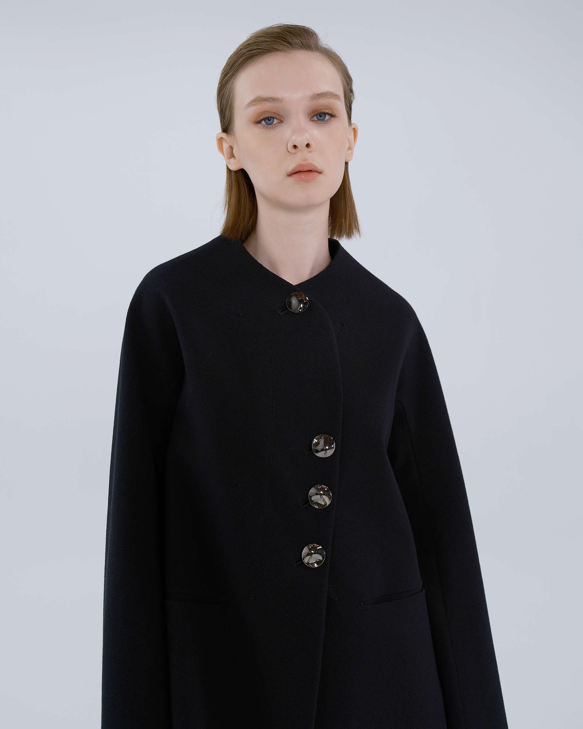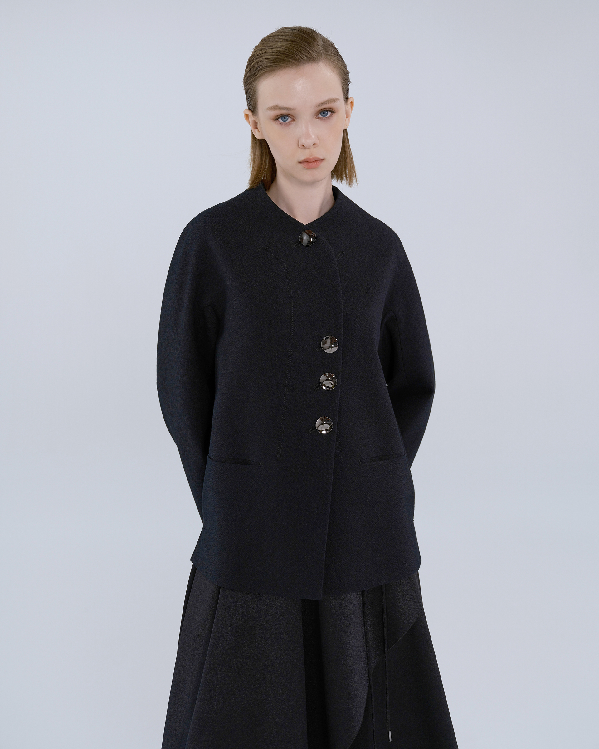 This piece is crafted from wool fabric, featuring a cropped silhouette with silver-tone round buttons. Its minimalist design exudes a sharp, tailored look.