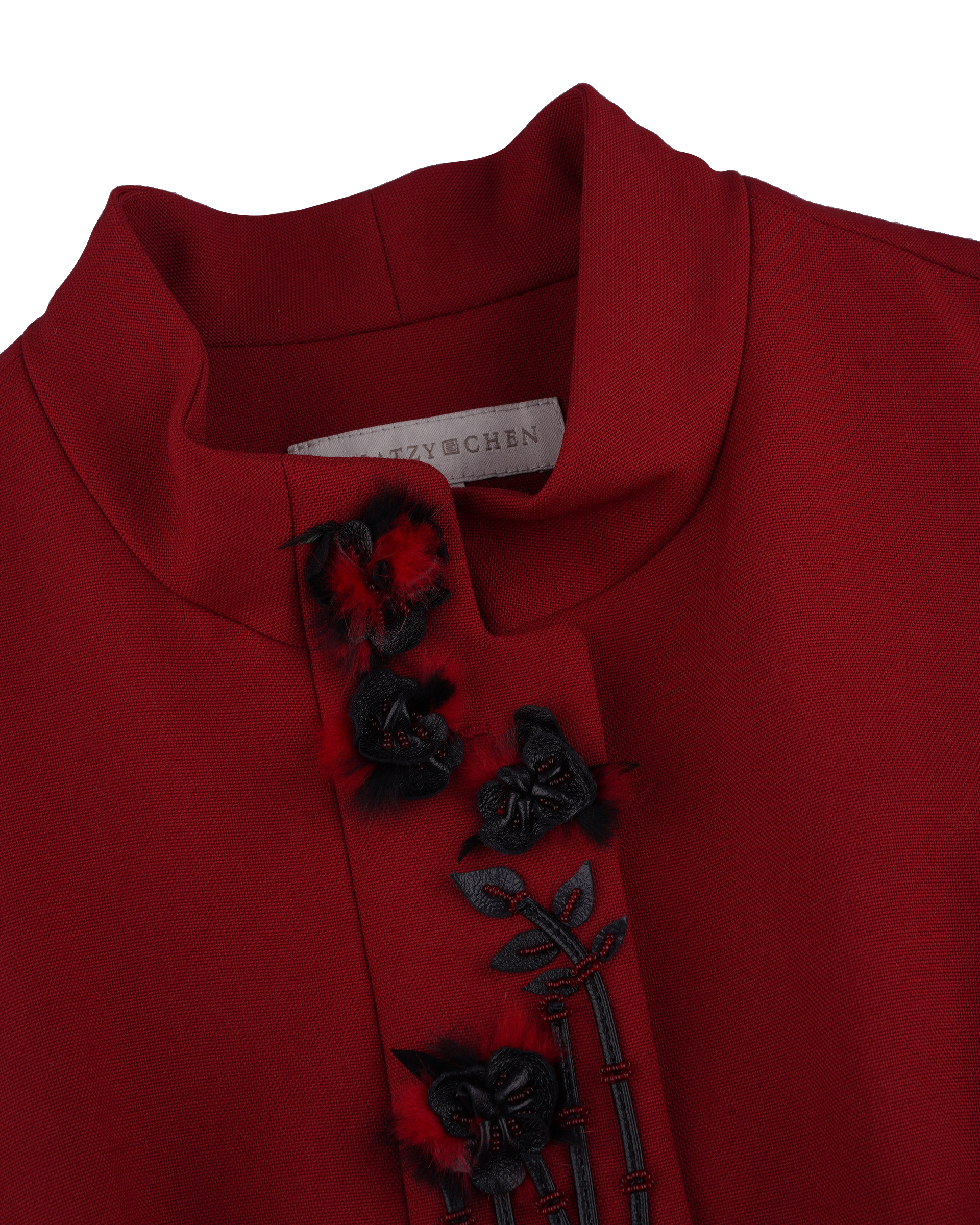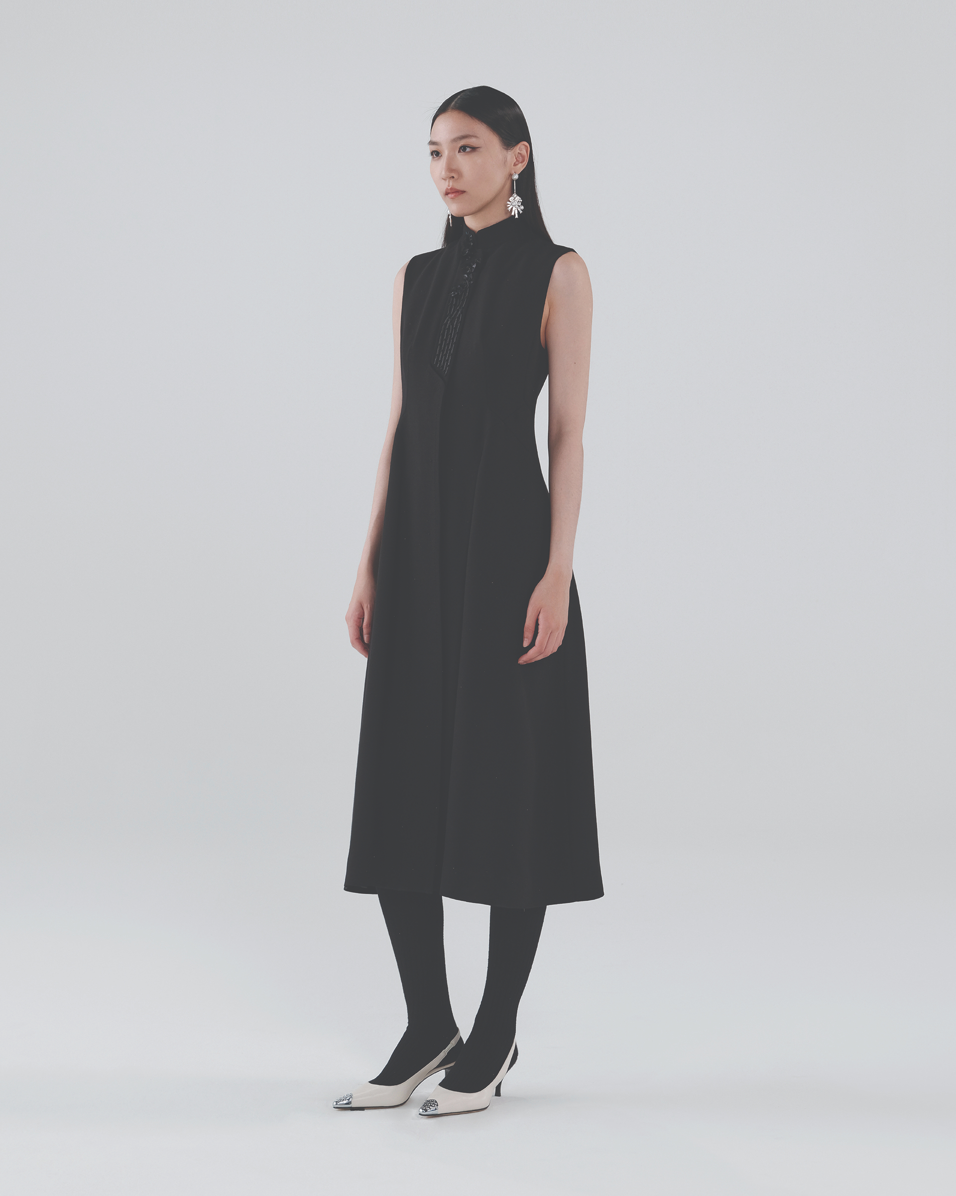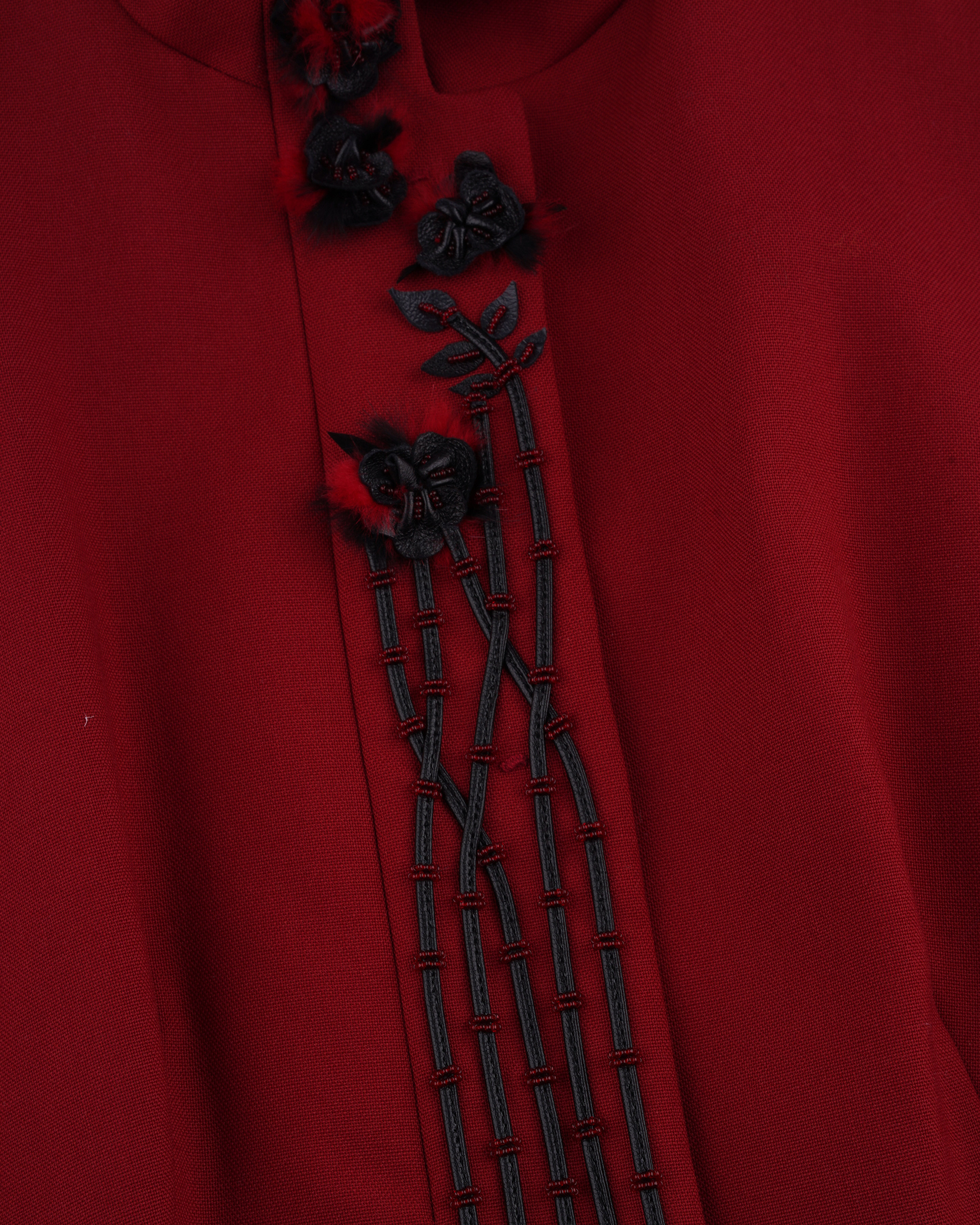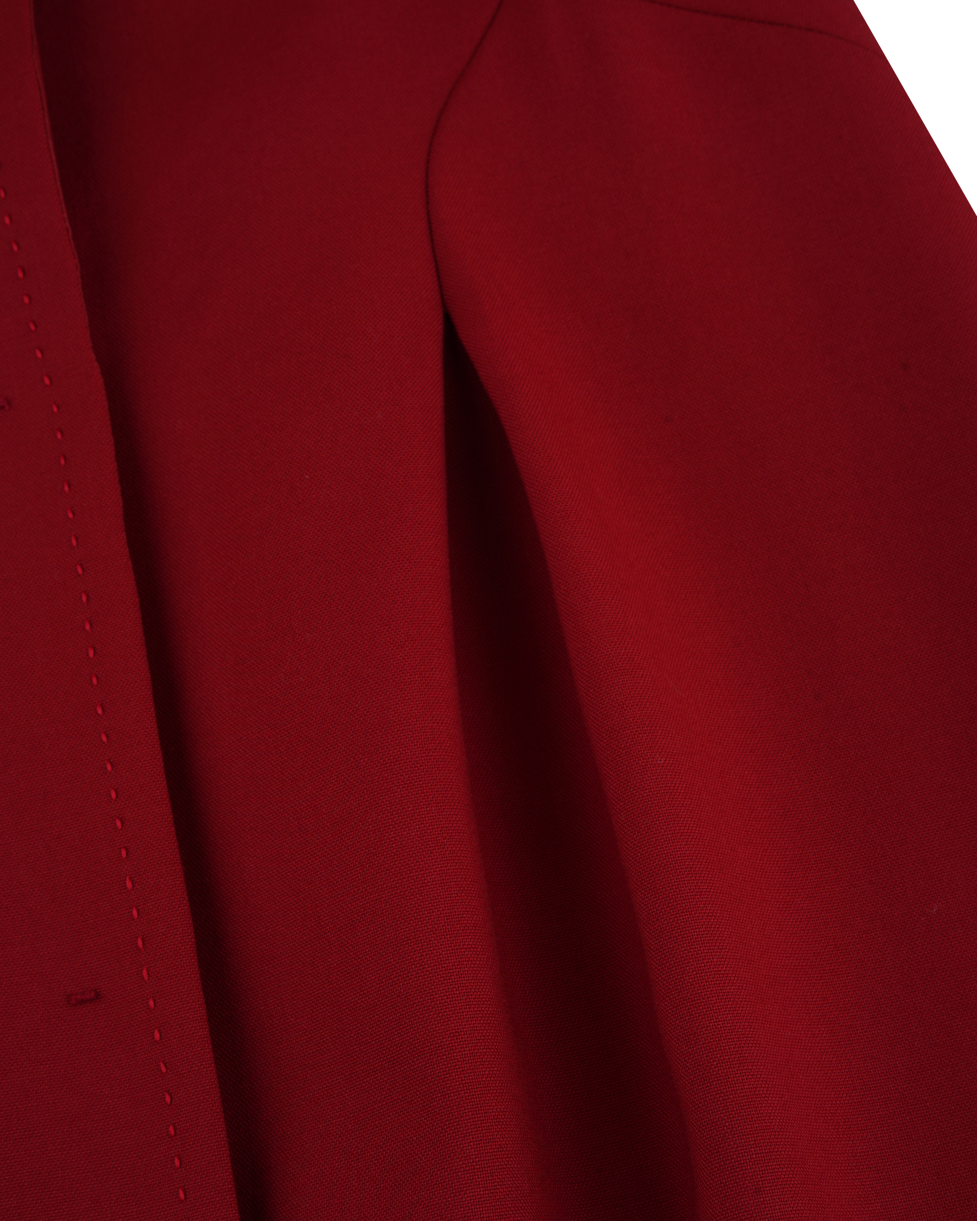 This piece is crafted from 100% wool fabric, offering a crisp, wrinkle-resistant finish. The tailored collar design, combined with pleated detailing at the hem, accentuates the silhouette.