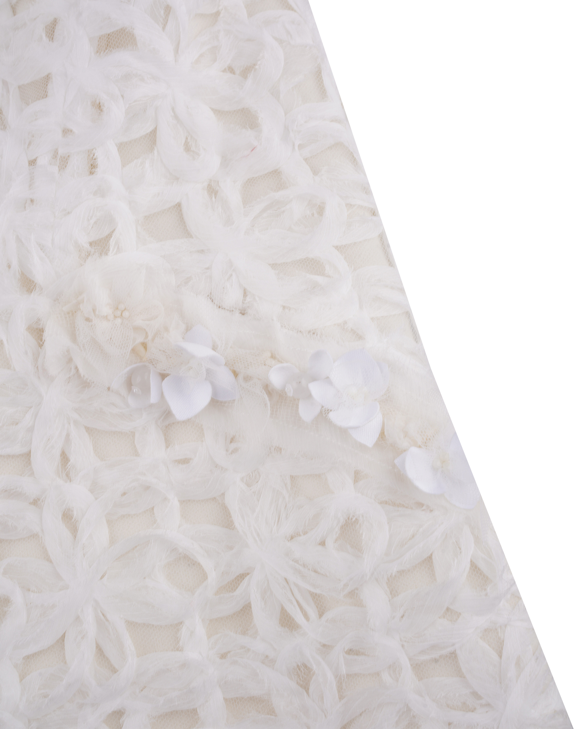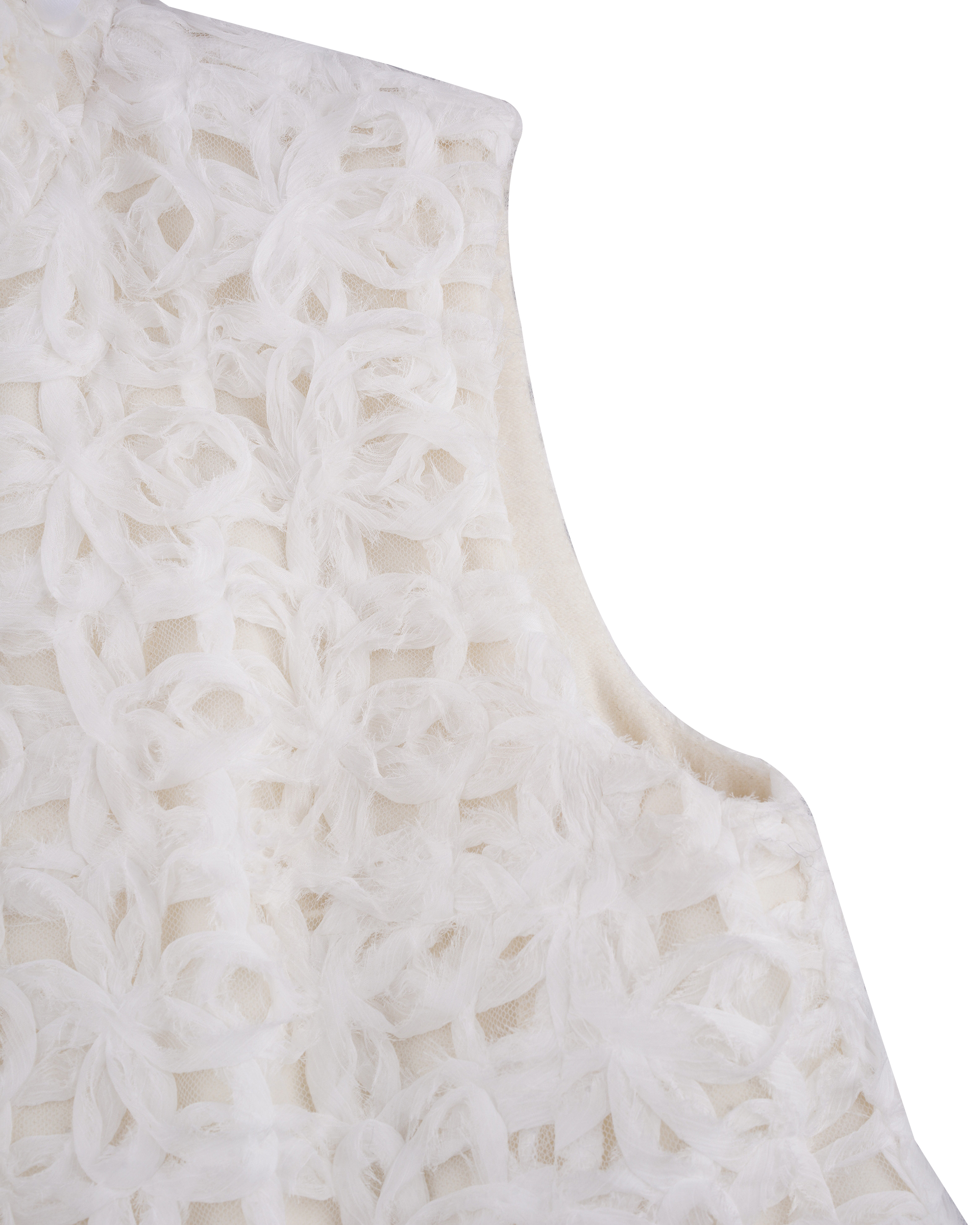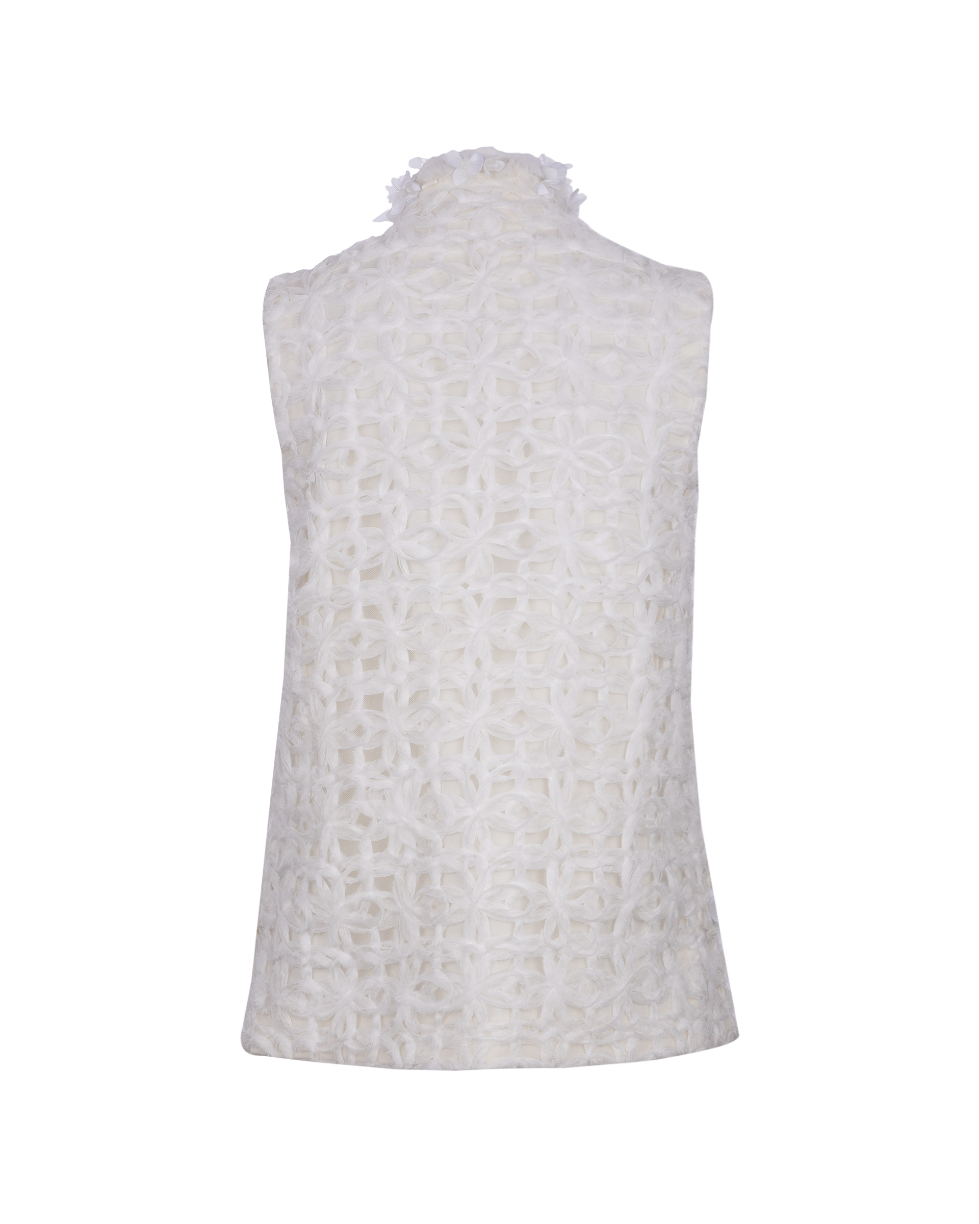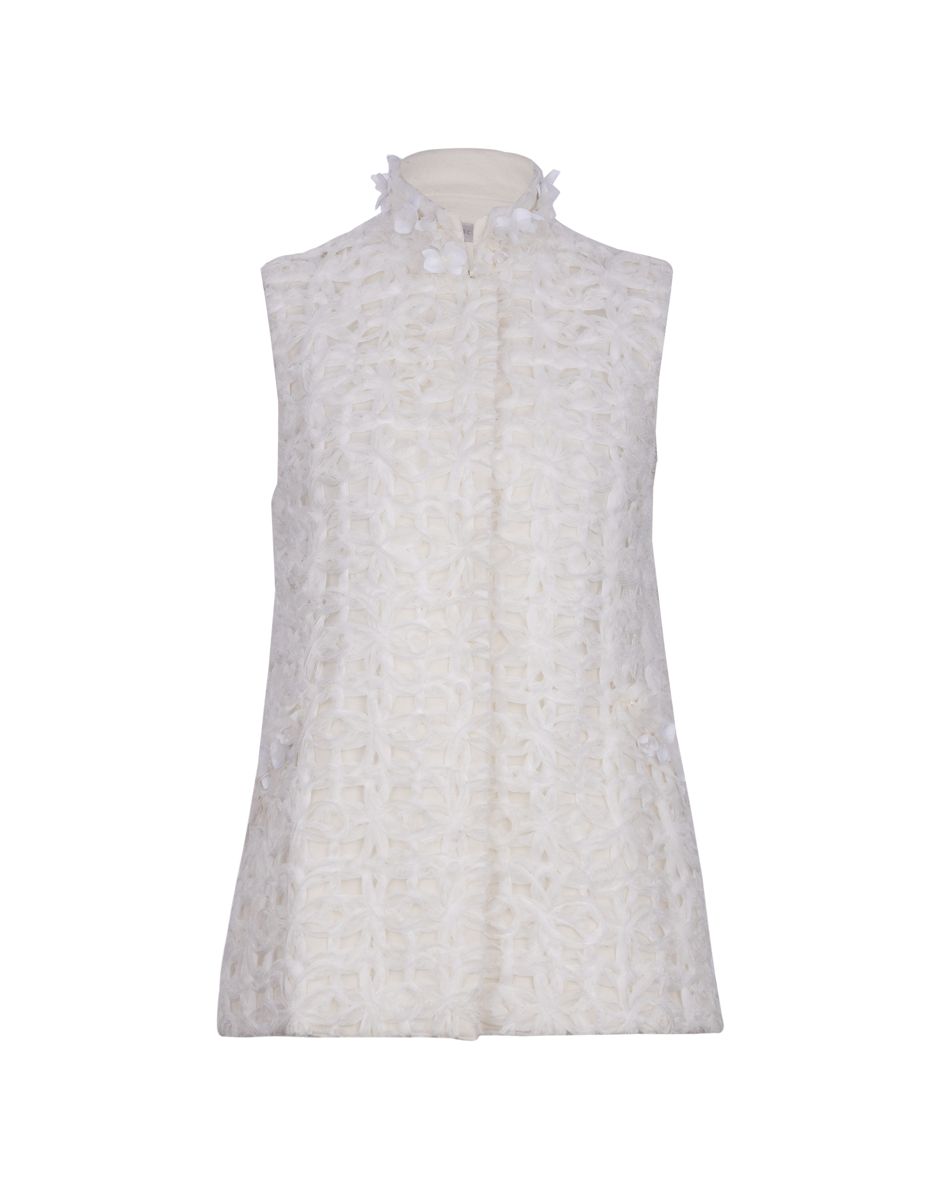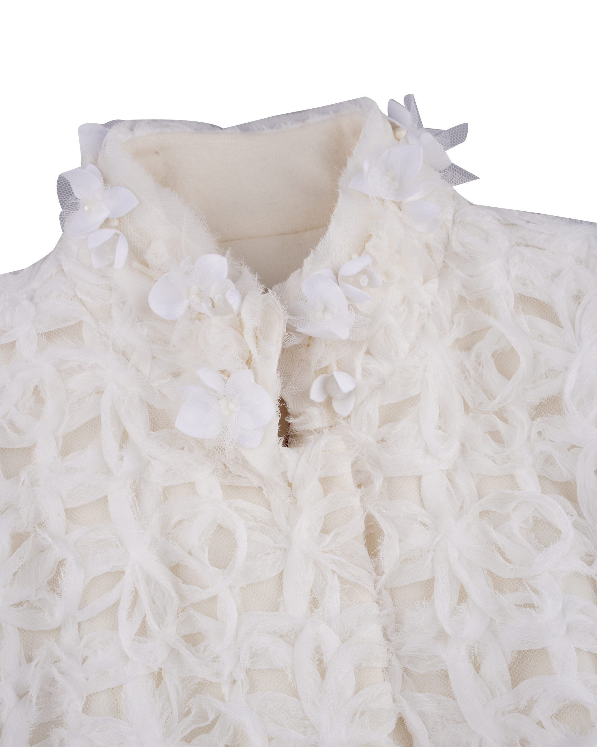 This piece is made of composite lace sewn into the surface fabric and lined with wool to lock in warmth. The bead-stitched collar and slightly cinched waist give it a tailored, sharp look.