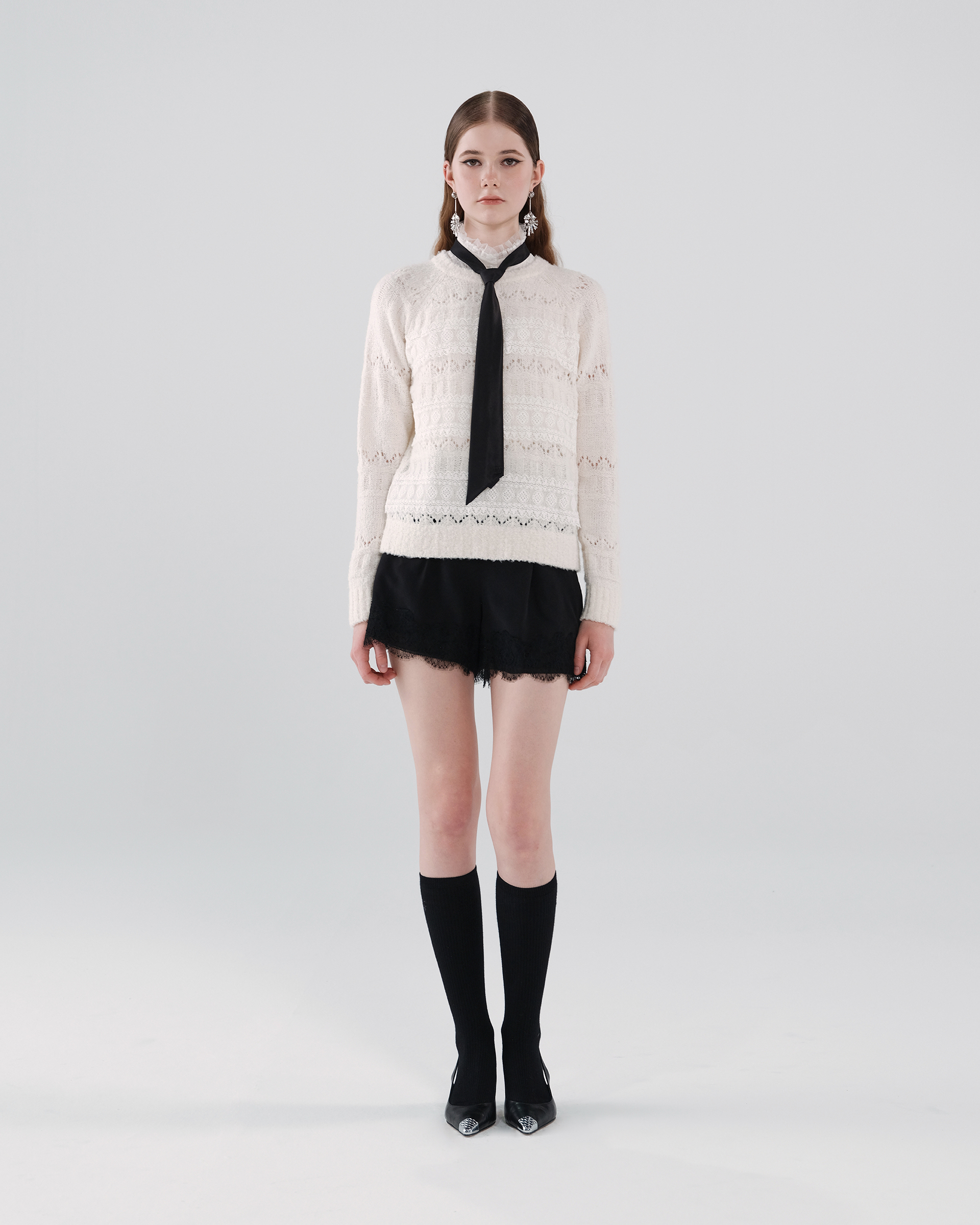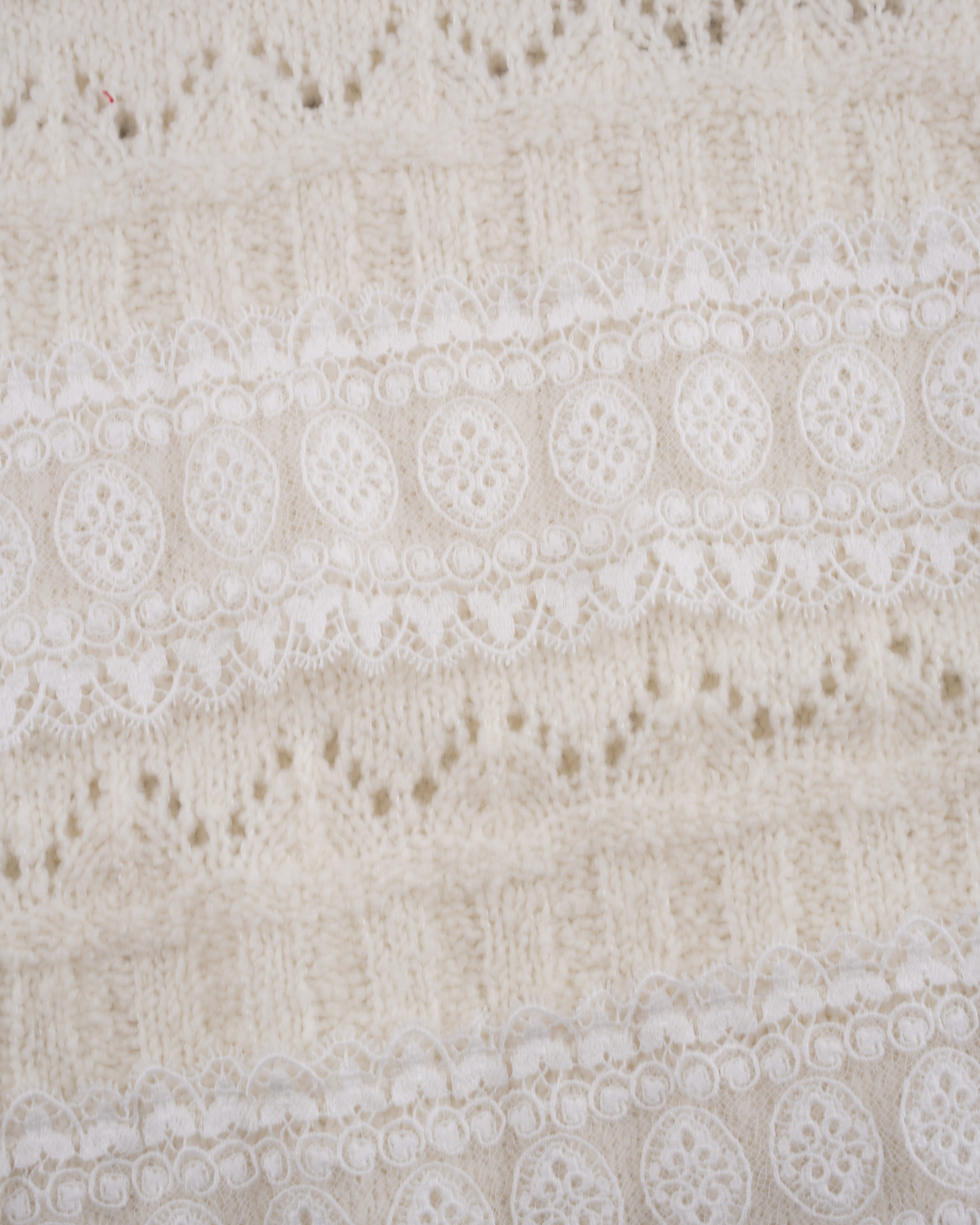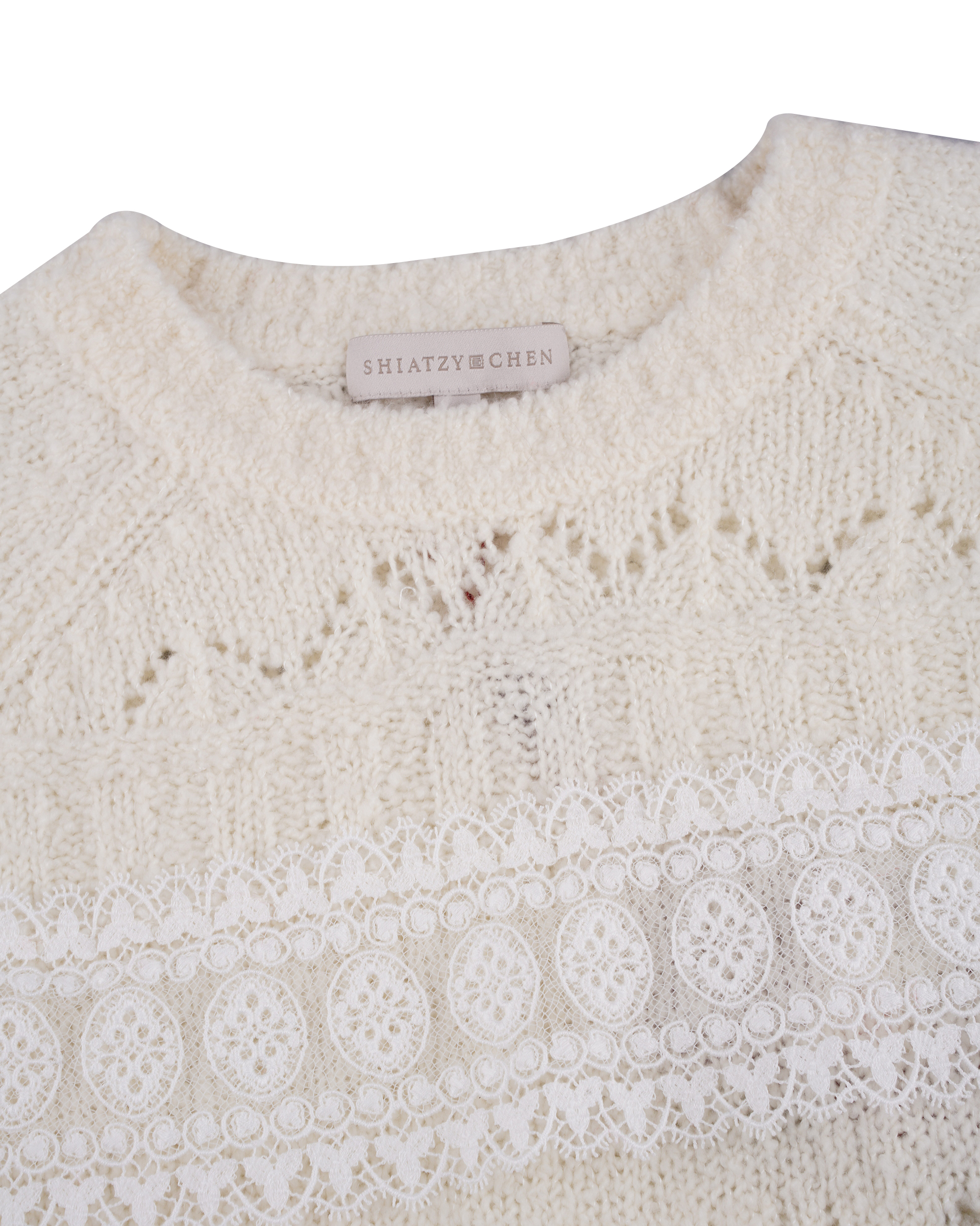 This piece is crafted from a silk-wool blend fabric, featuring eyelet detailing combined with lace trim. It presents an overall sweet and warm wearing style.