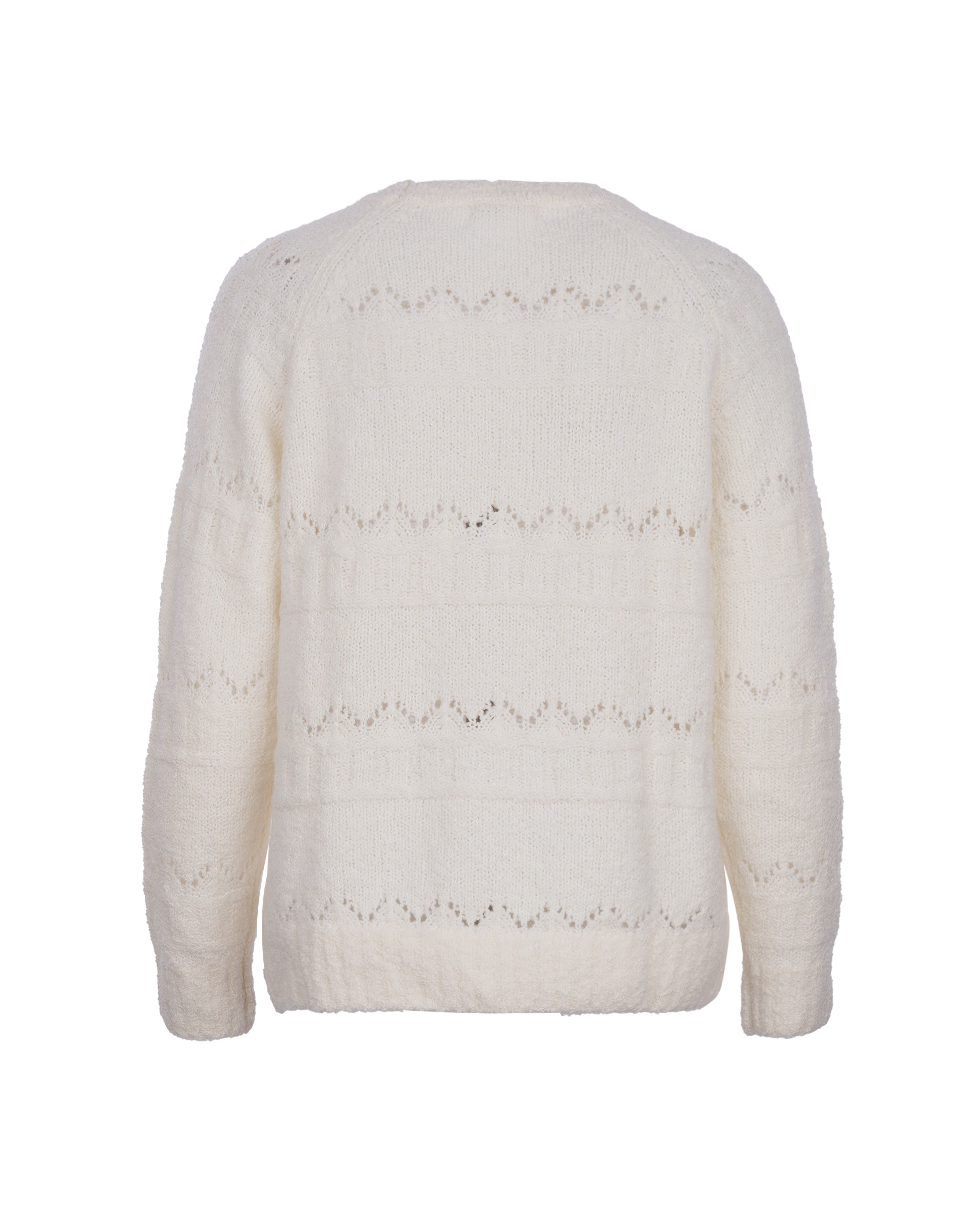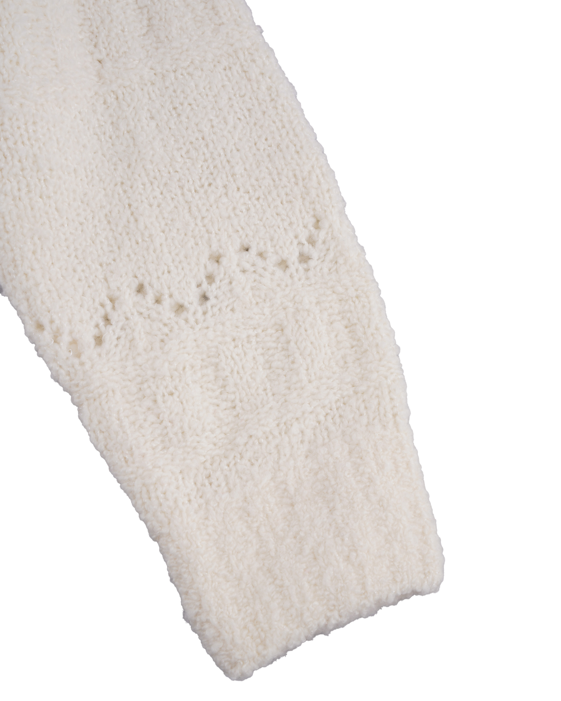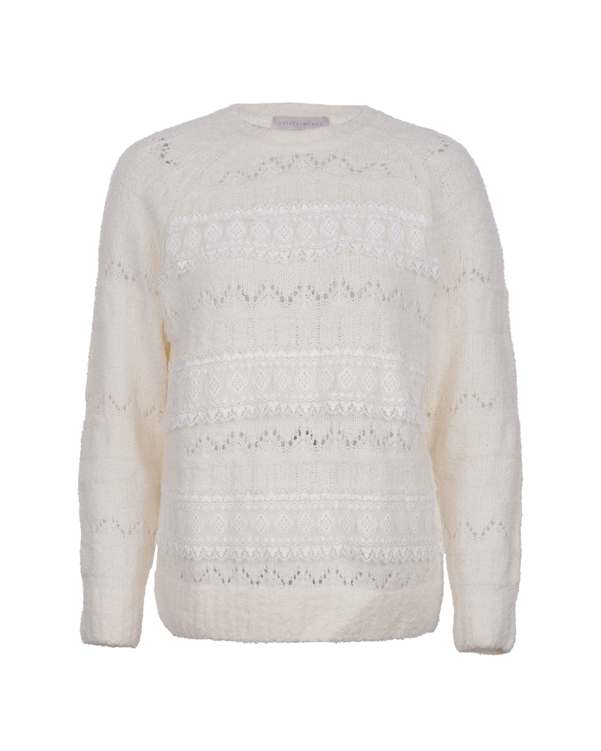 This piece is crafted from a silk-wool blend fabric, featuring eyelet detailing combined with lace trim. It presents an overall sweet and warm wearing style.