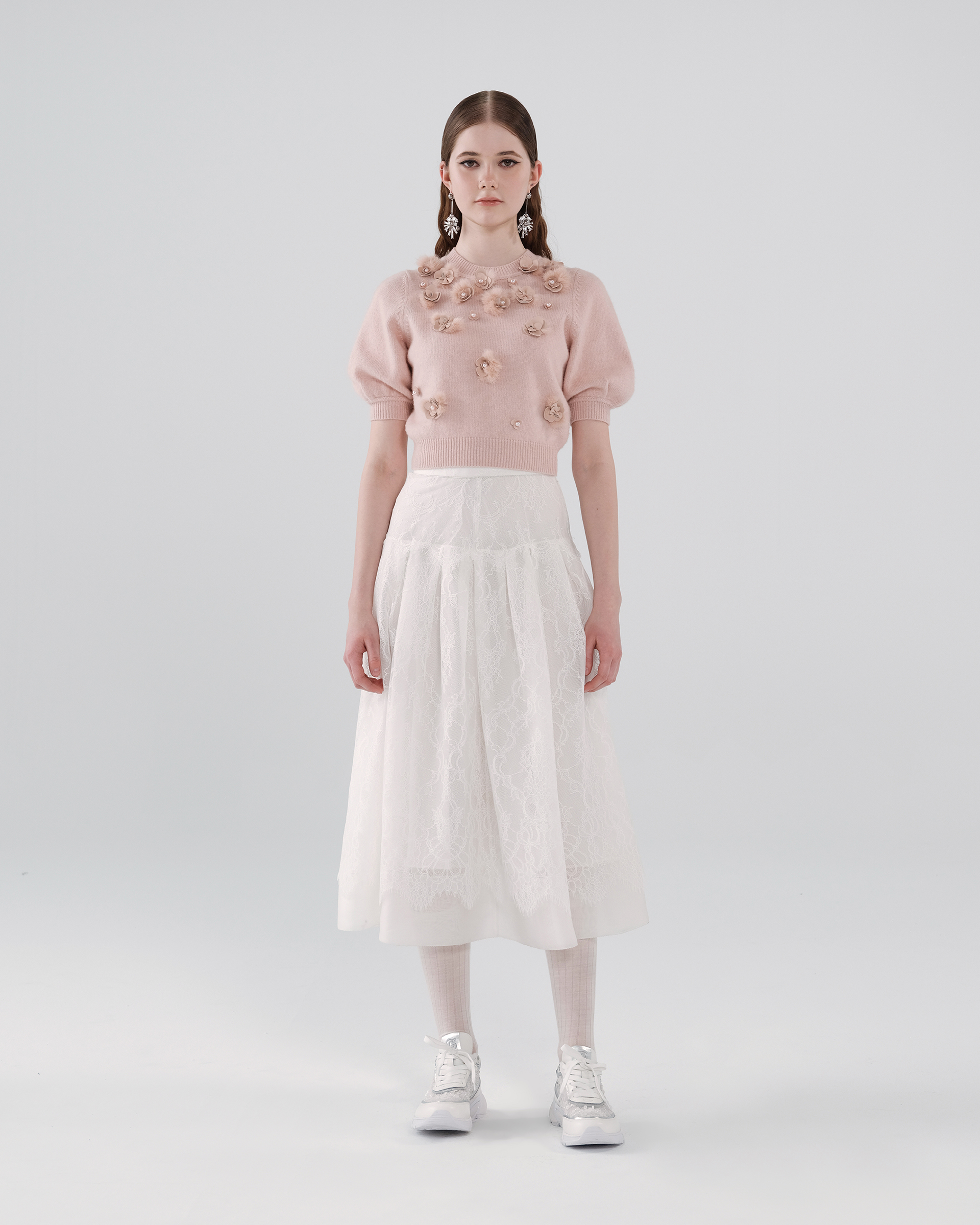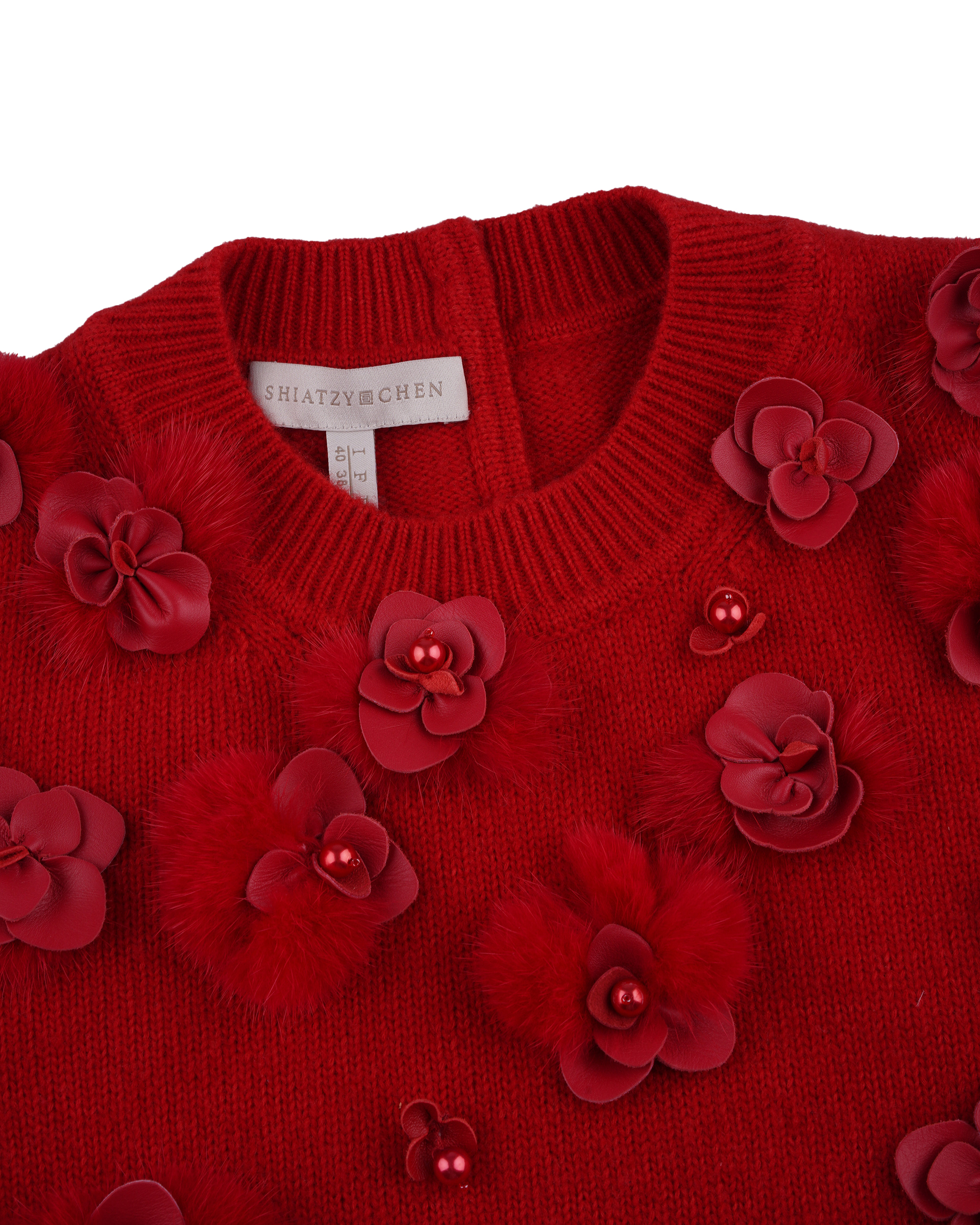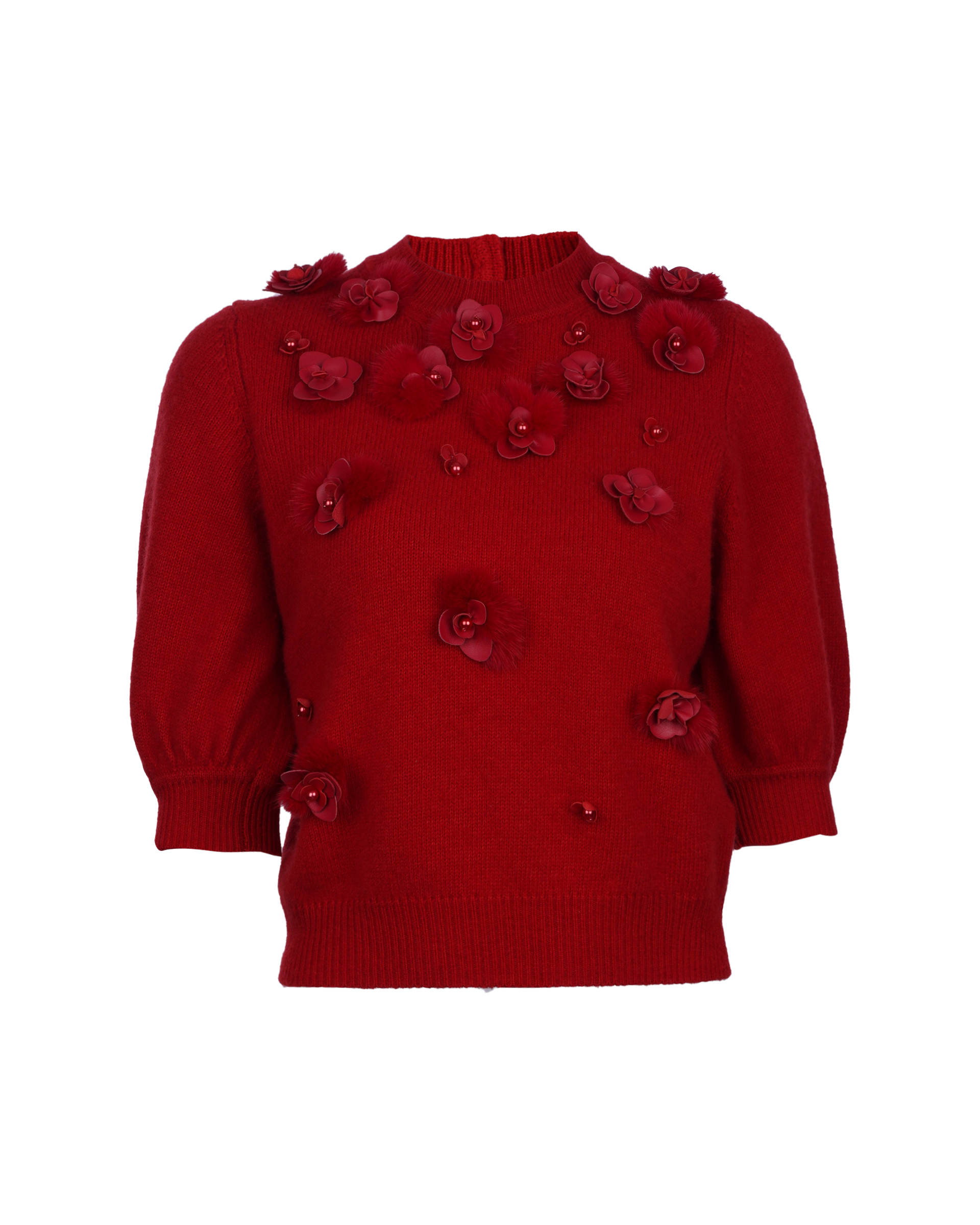 This piece features three-dimensional leather flowers adorned with pearls to capture the graceful form of blooms, while the short sleeves add an air of refined elegance.
