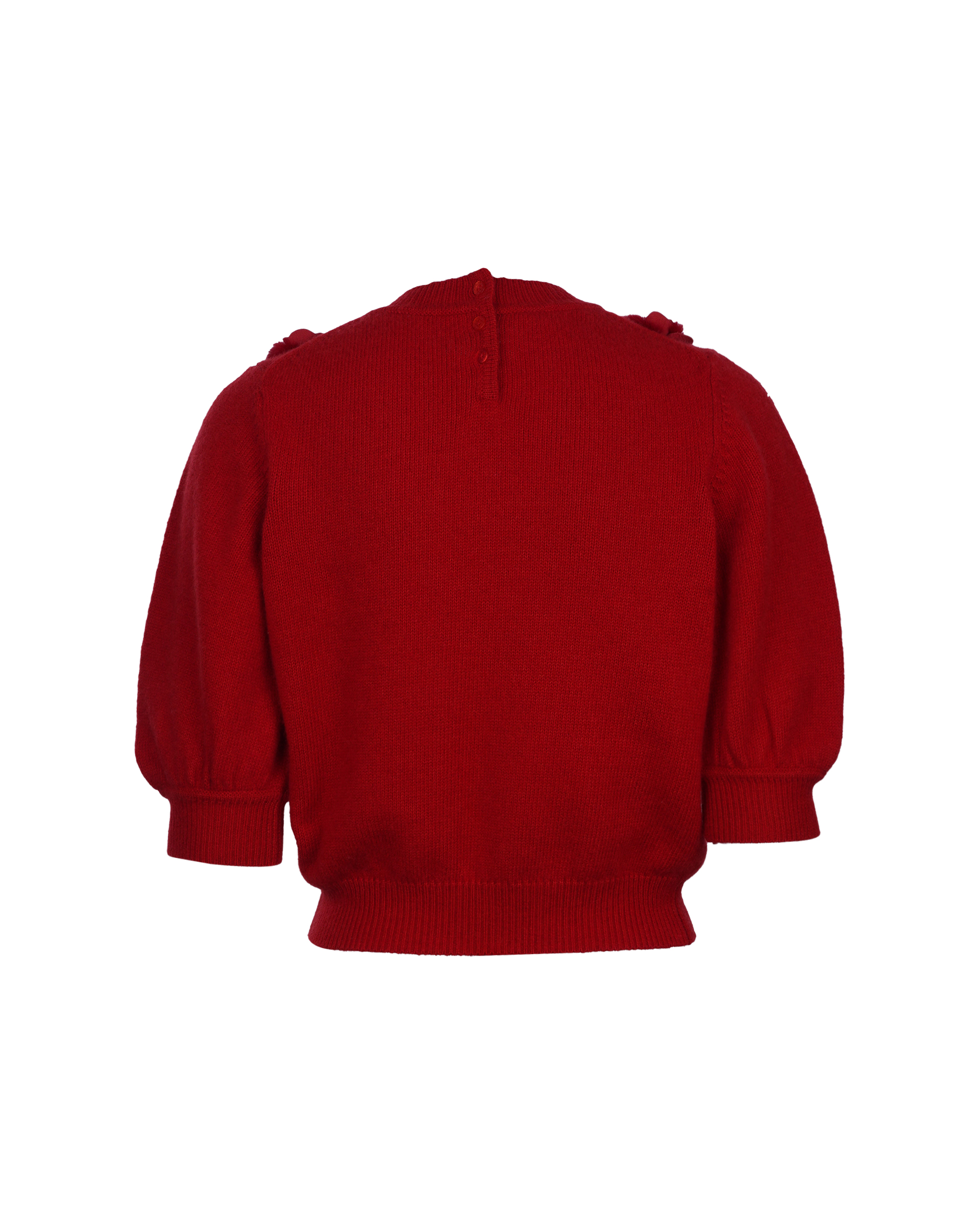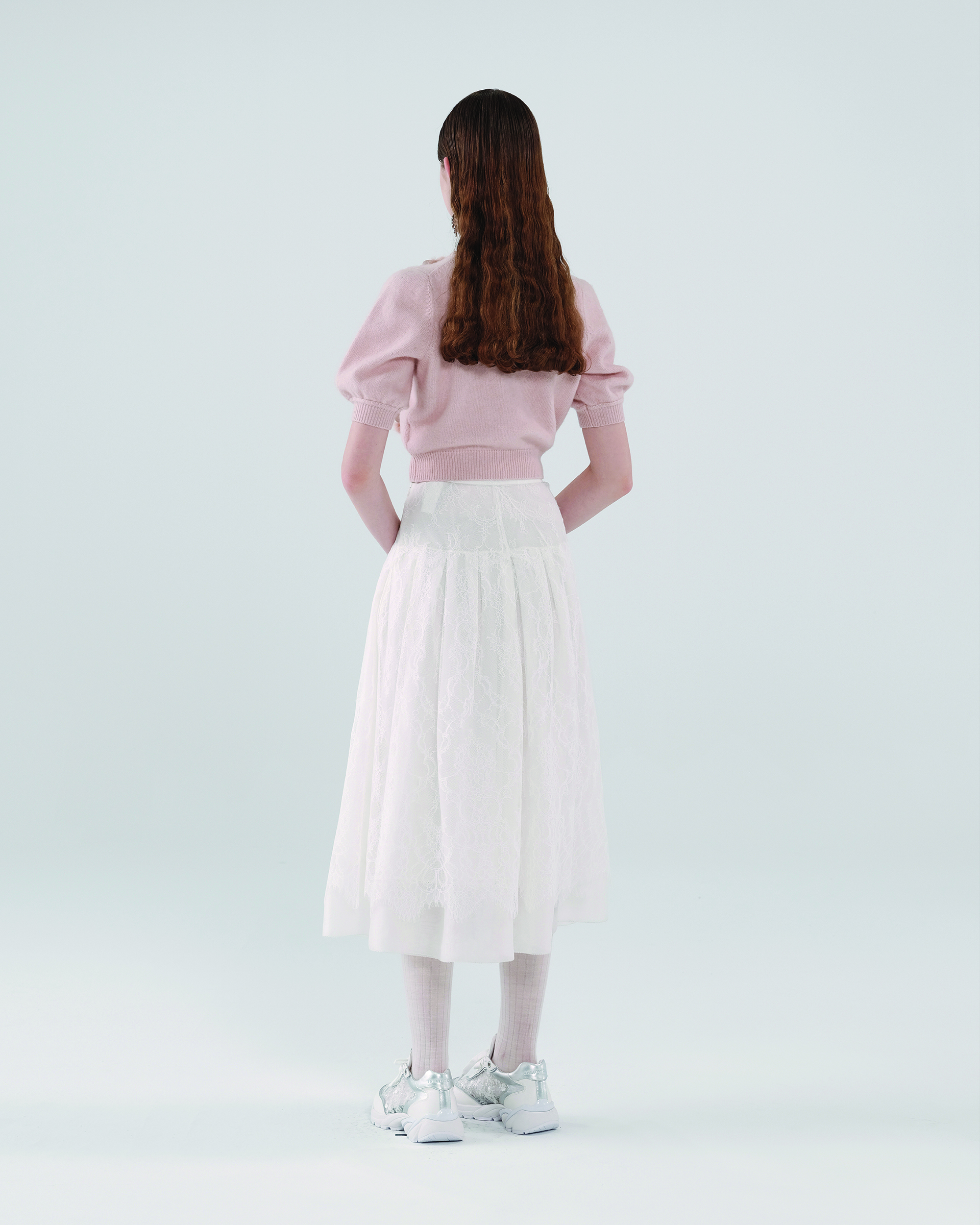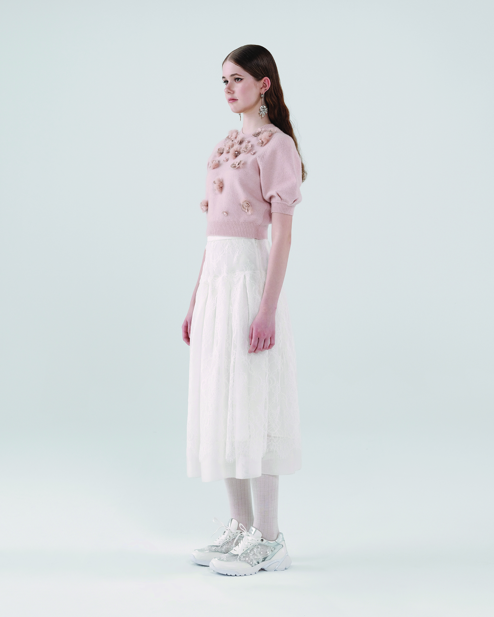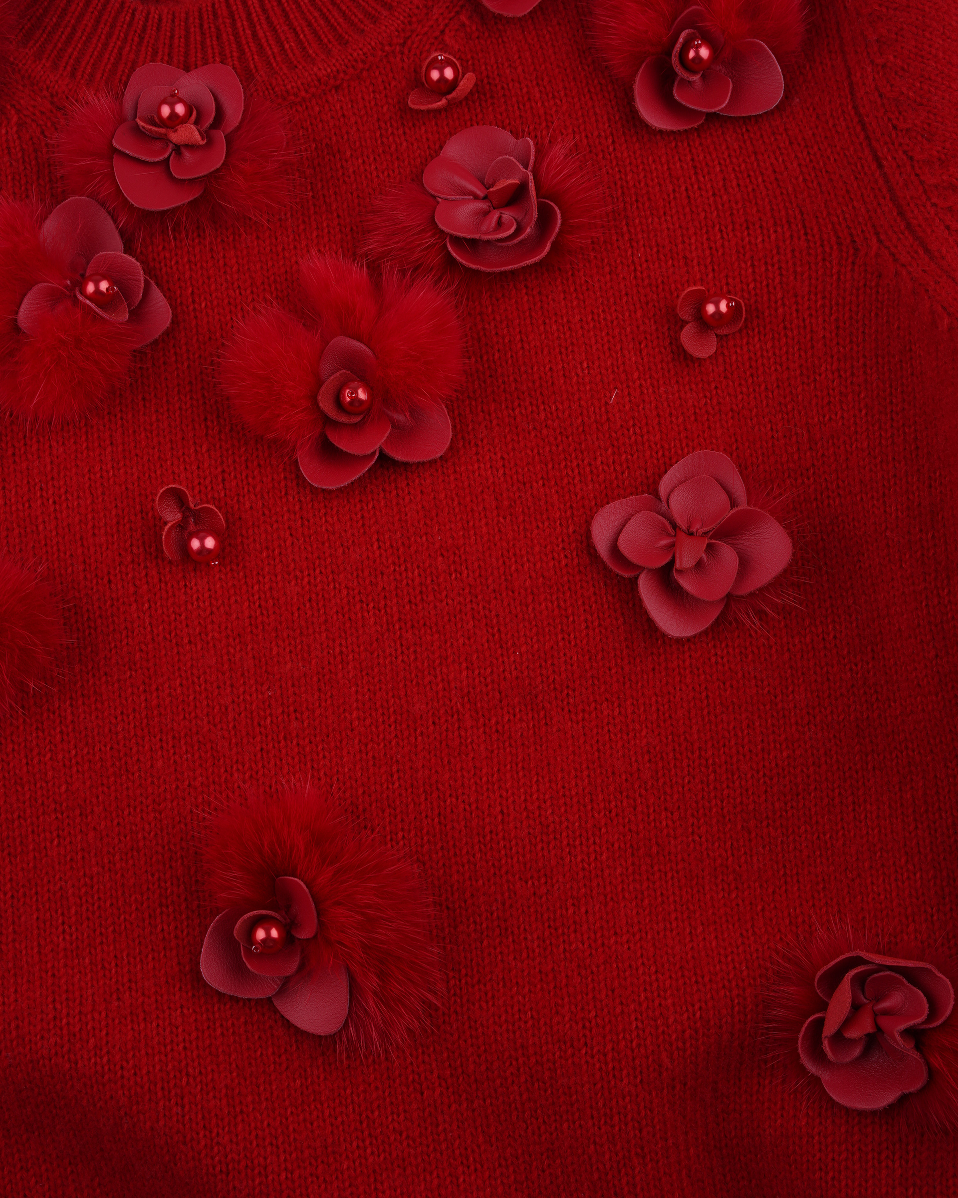 This piece features three-dimensional leather flowers adorned with pearls to capture the graceful form of blooms, while the short sleeves add an air of refined elegance.