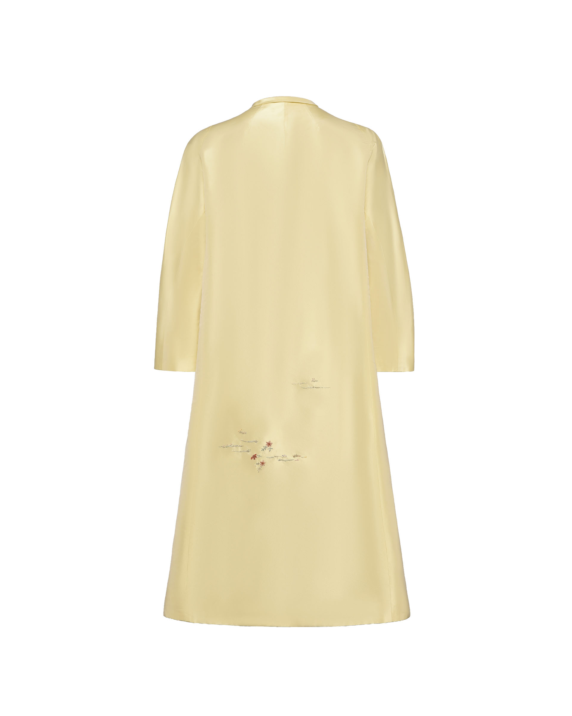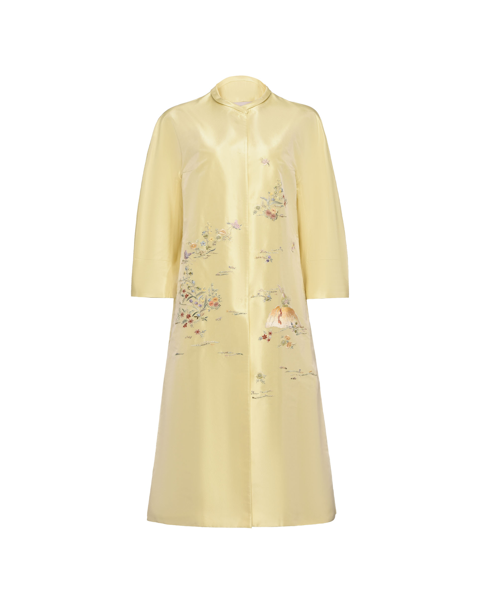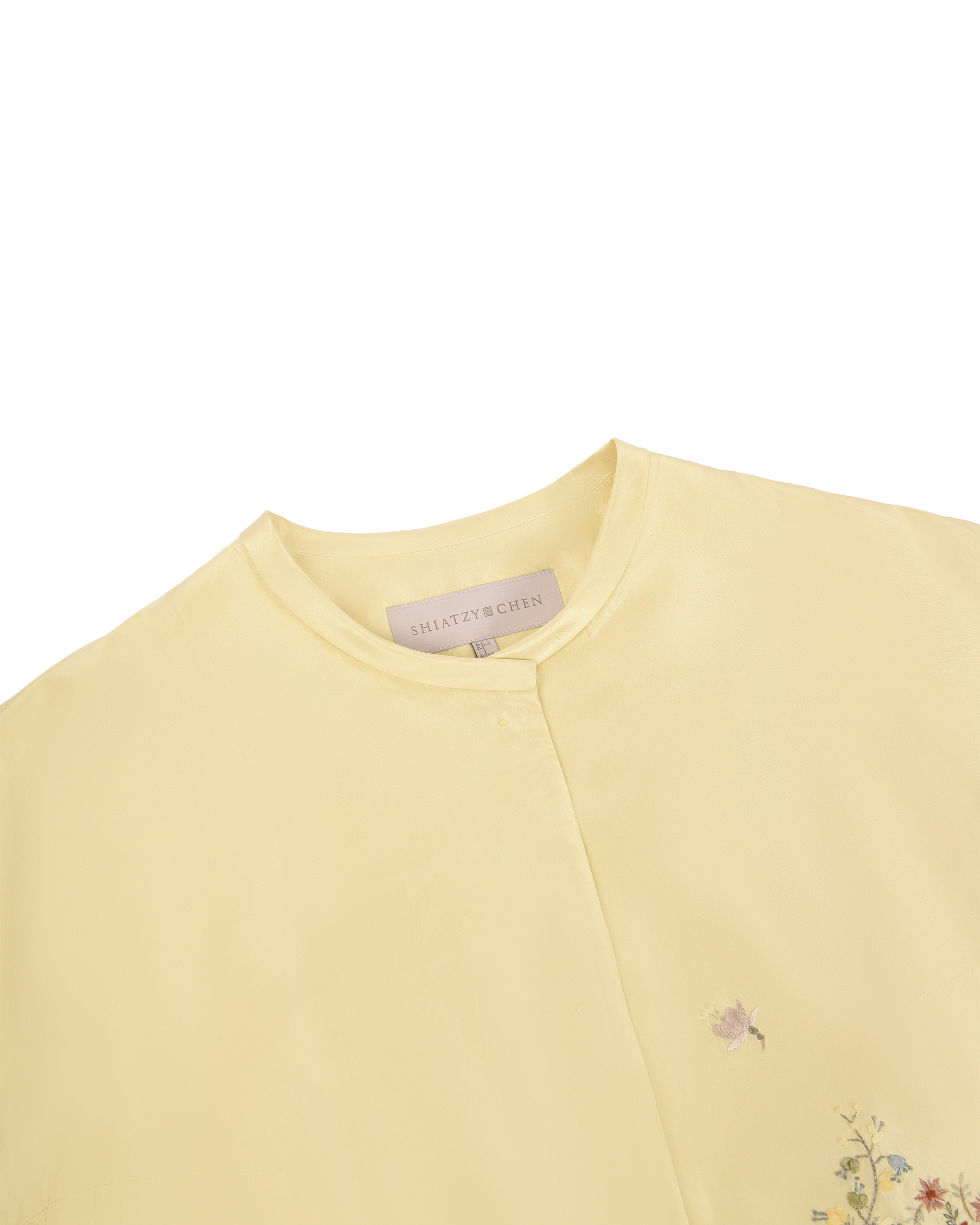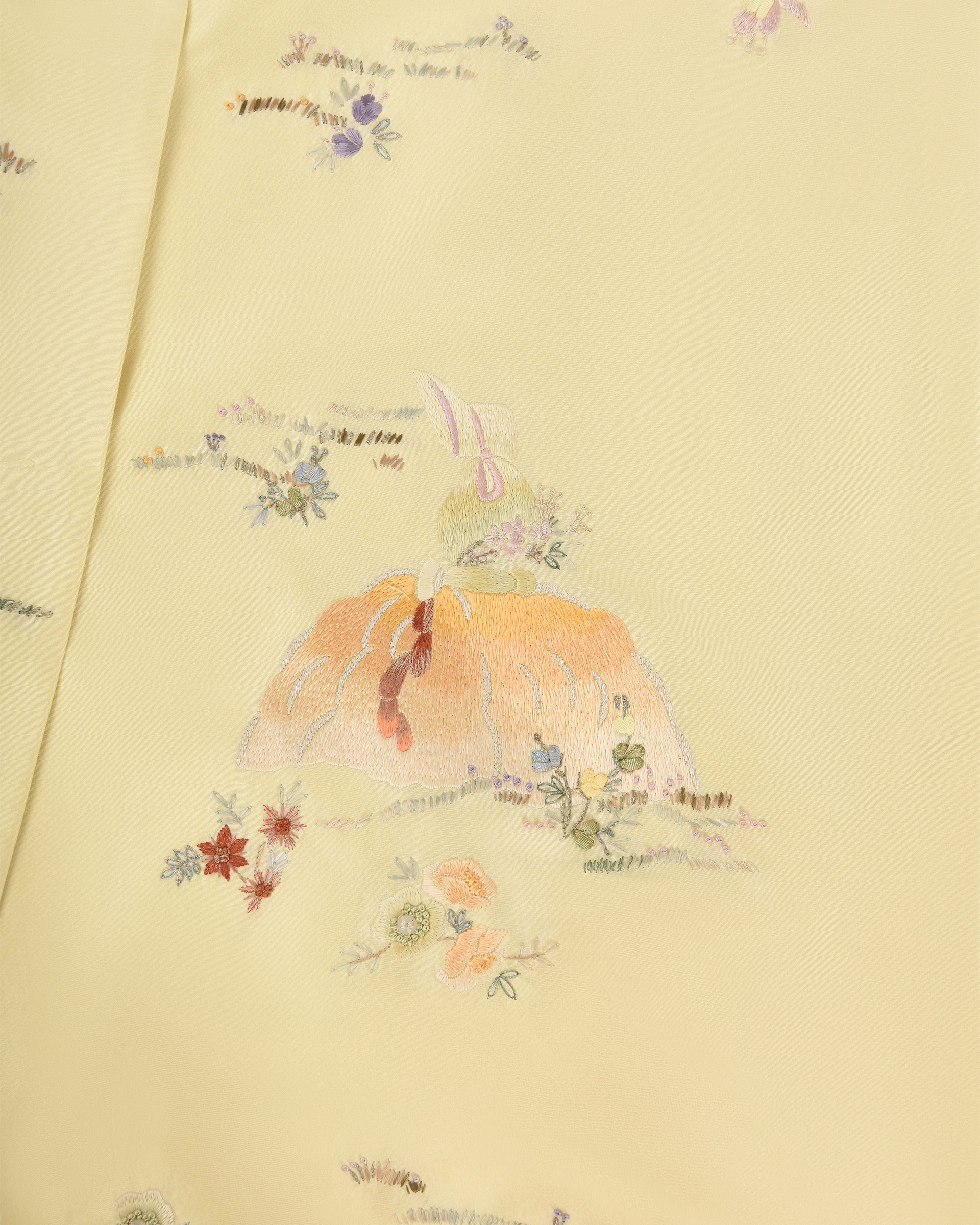 Crafted from 100% mulberry silk fabric, the ribbon embroidery technique outlines opulent decorative artistry, while varied stitches evoke the warm ambiance of spring.