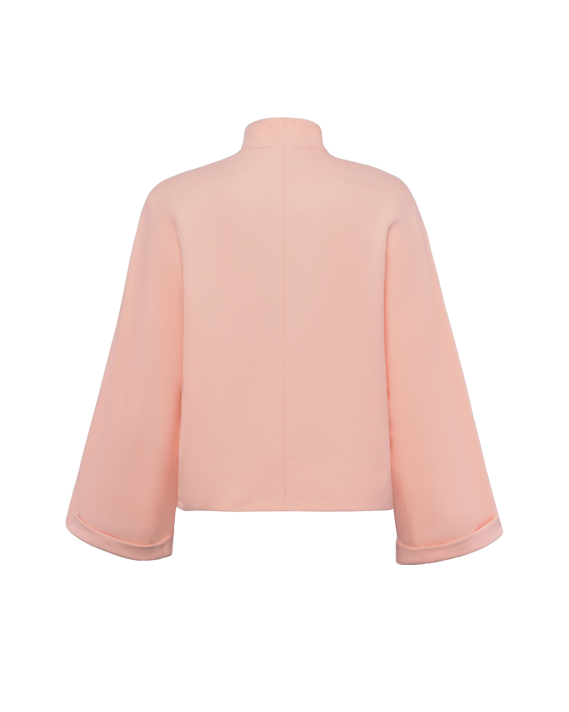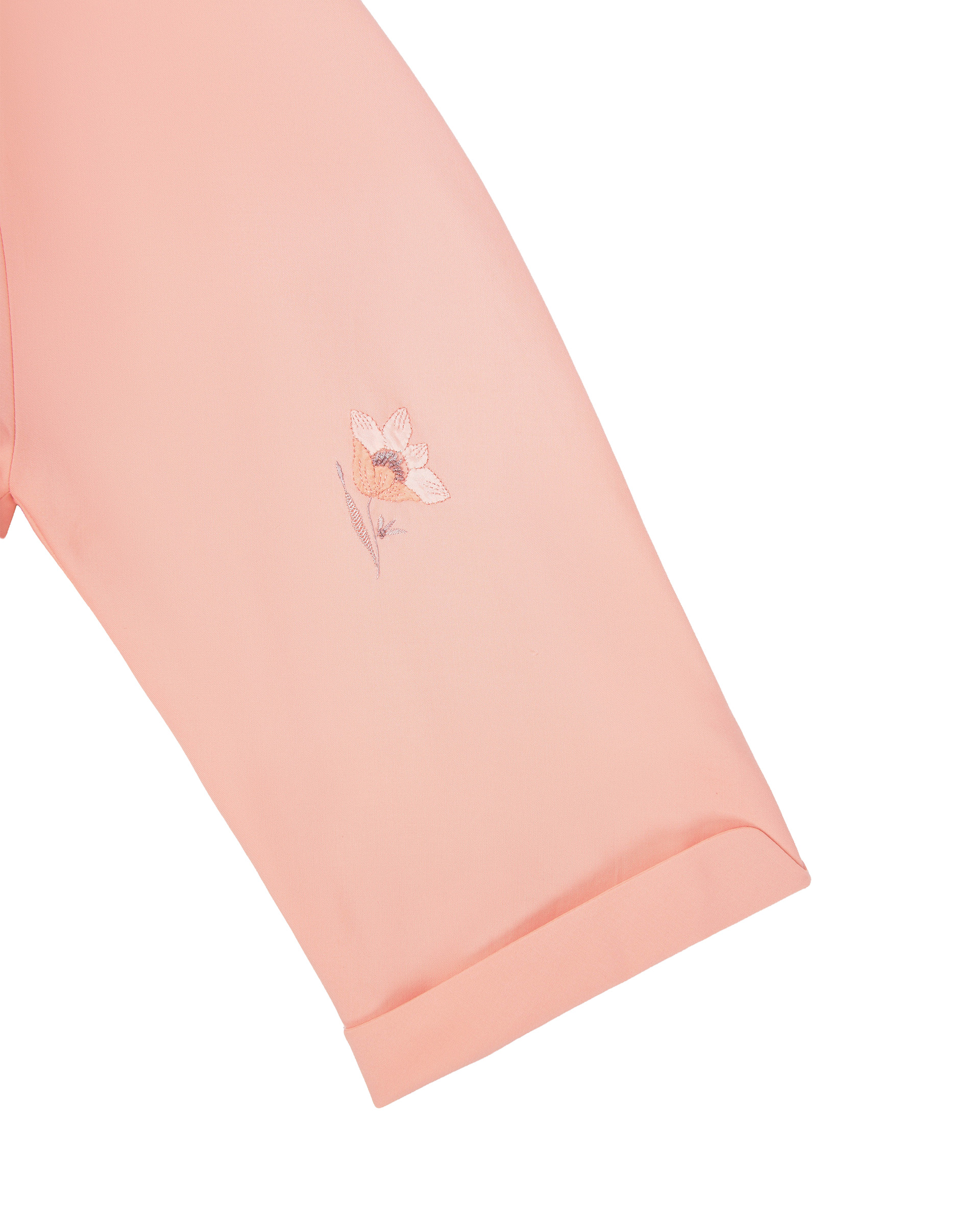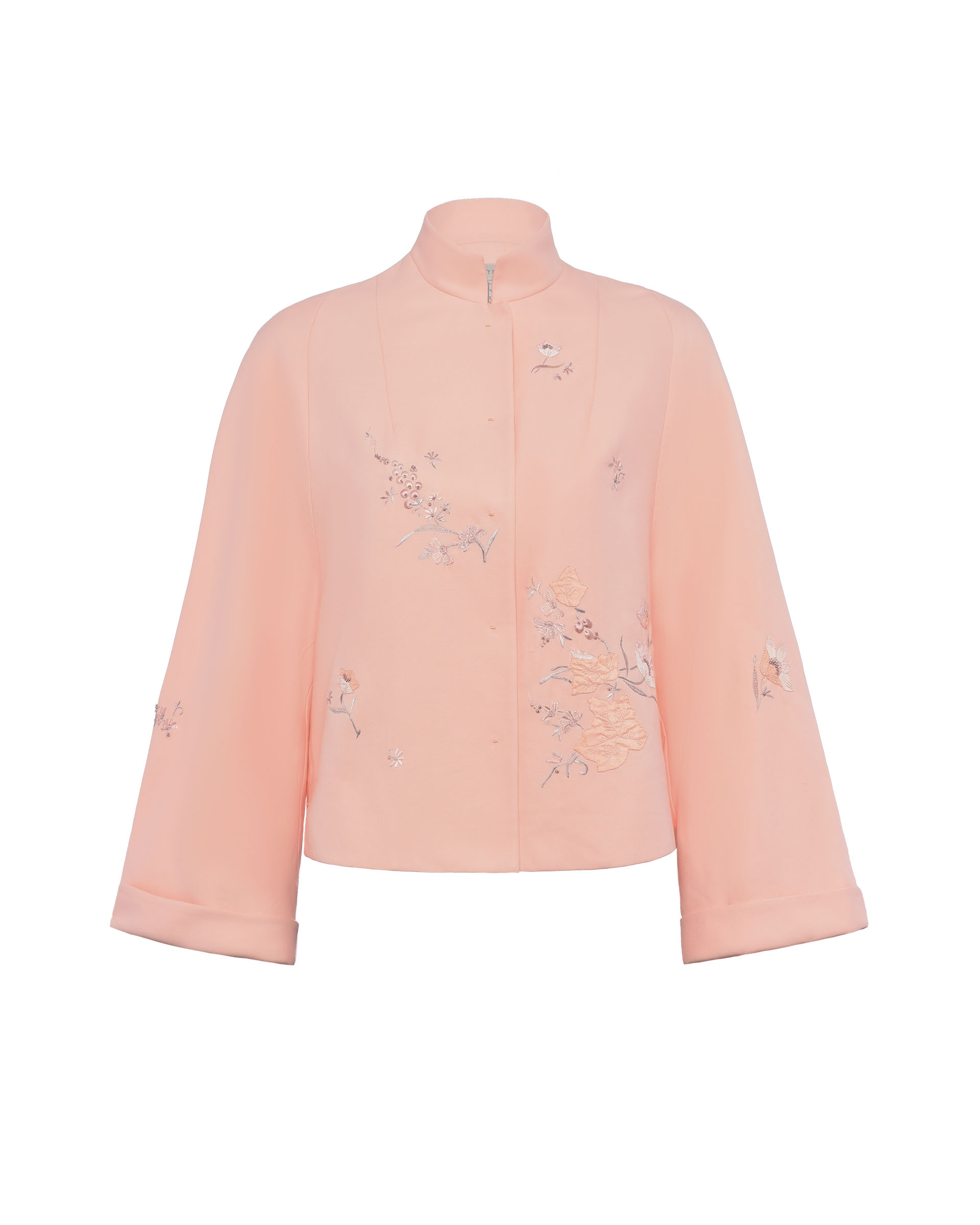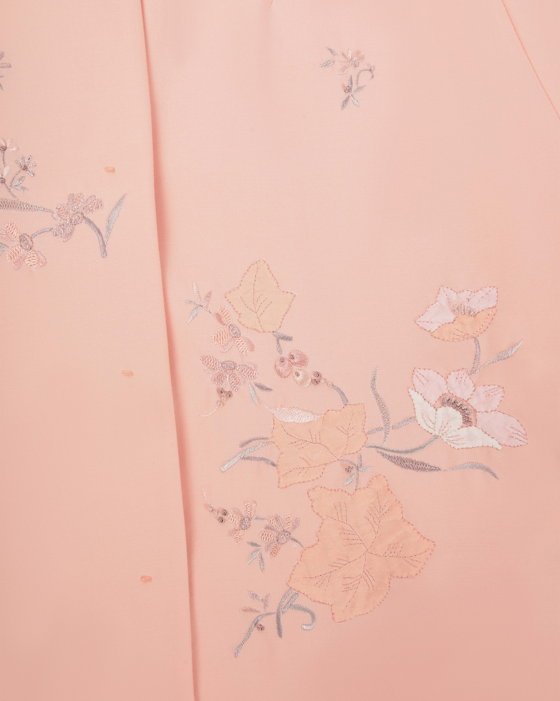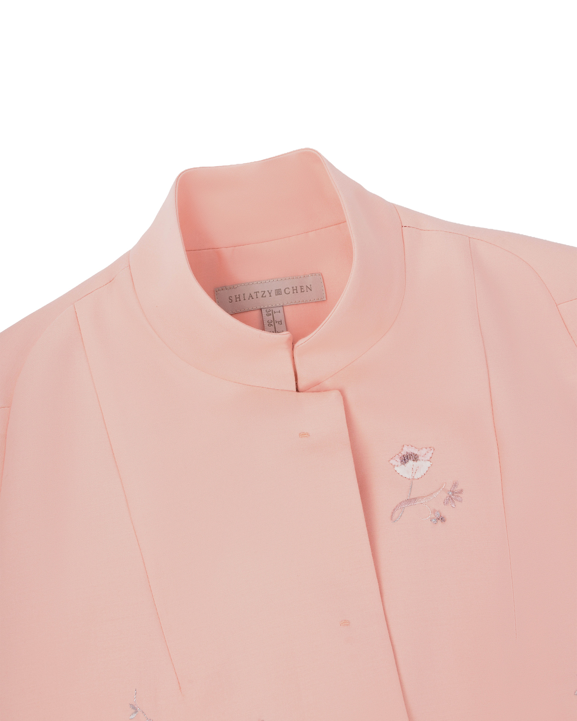Crafted from a silk-cotton blend mist satin fabric, it employs three-dimensional tailoring to create a sleek silhouette. Appliqué embroidery depicts the vibrant energy of spring.
