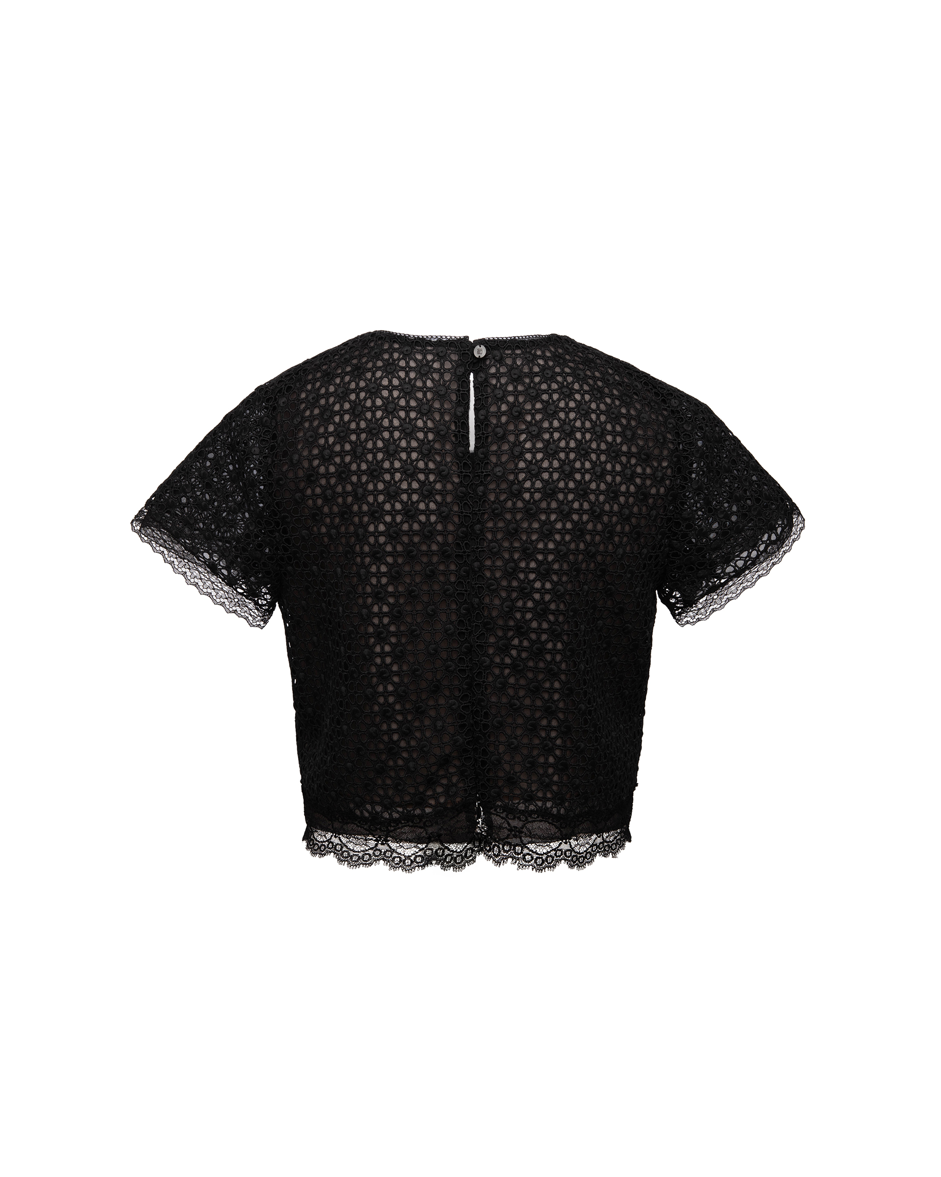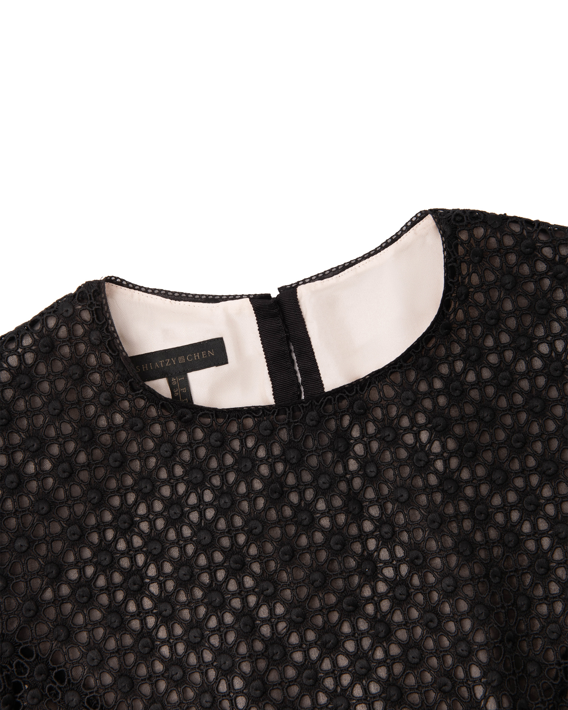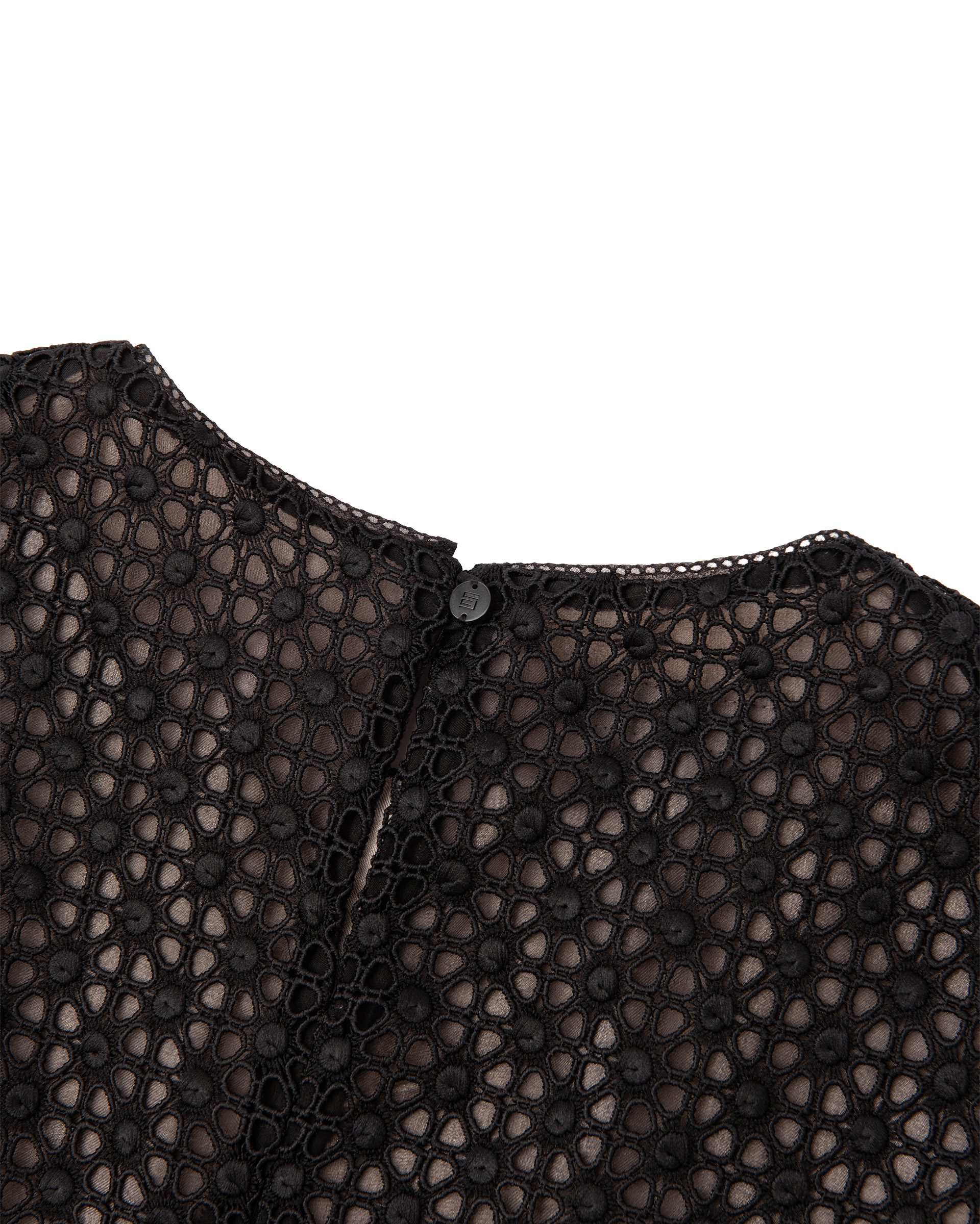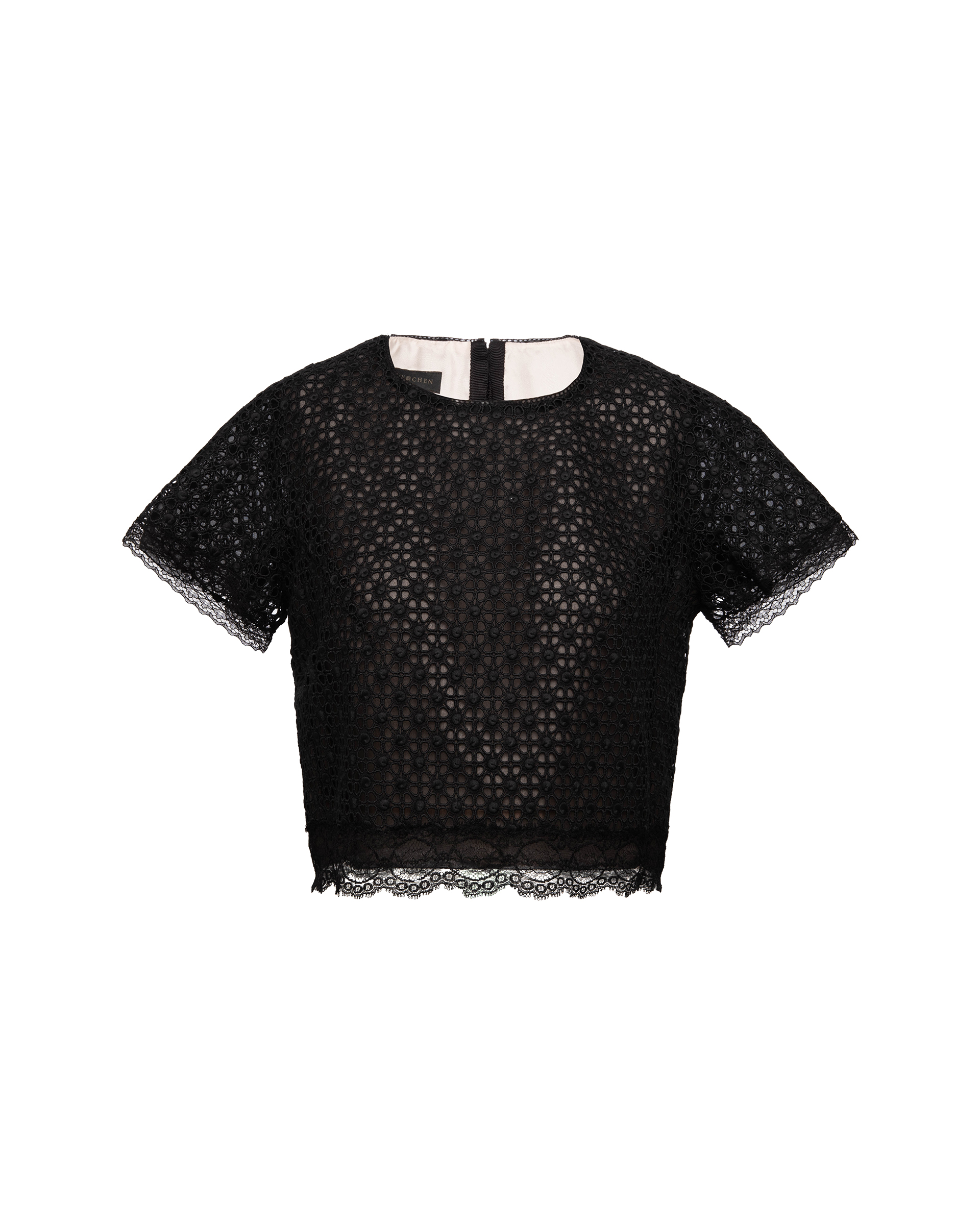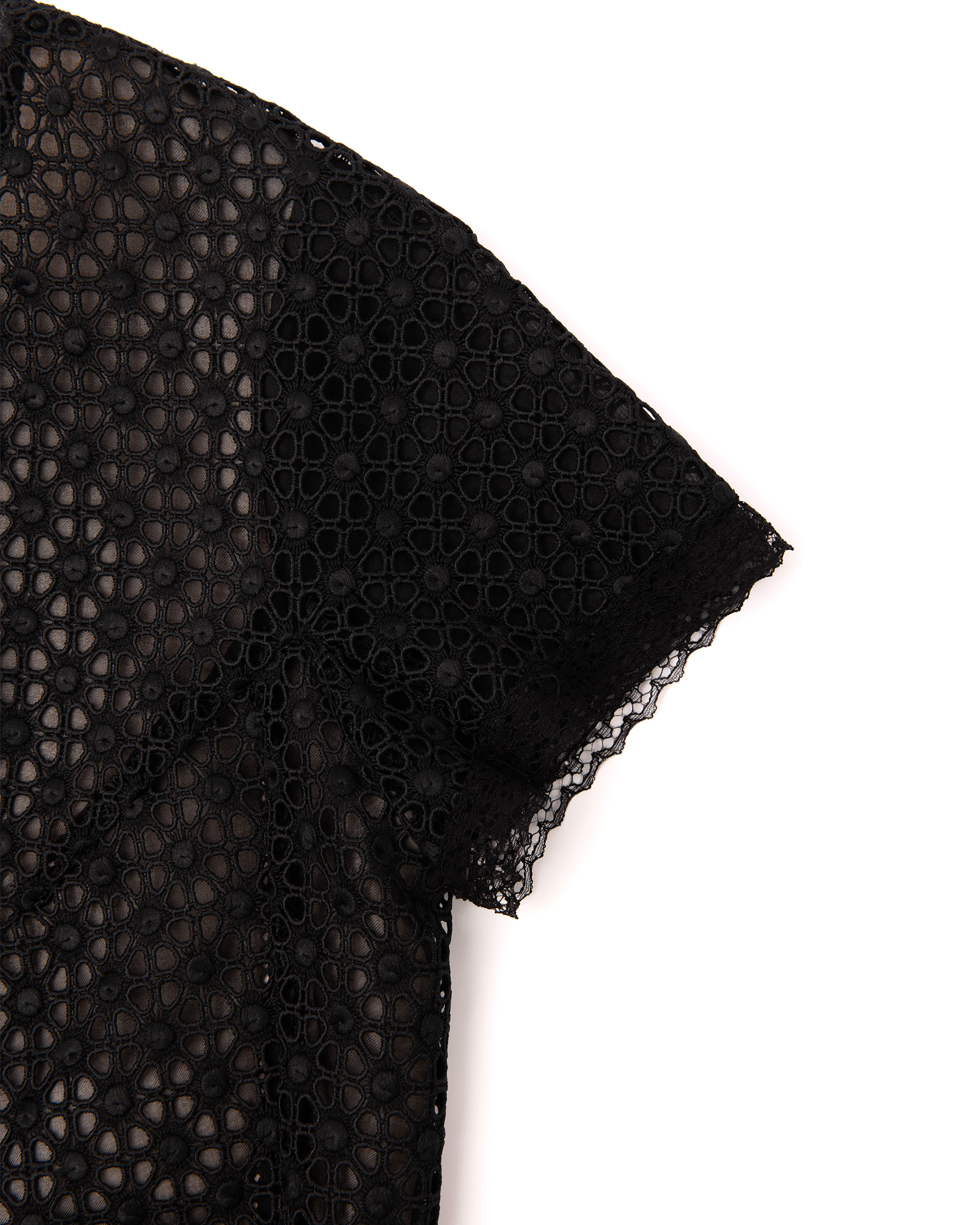This piece is crafted from an openwork lace fabric and features a mulberry silk lining for a comfortable fit. It can be paired with bottoms from the same collection to create a complete outfit.