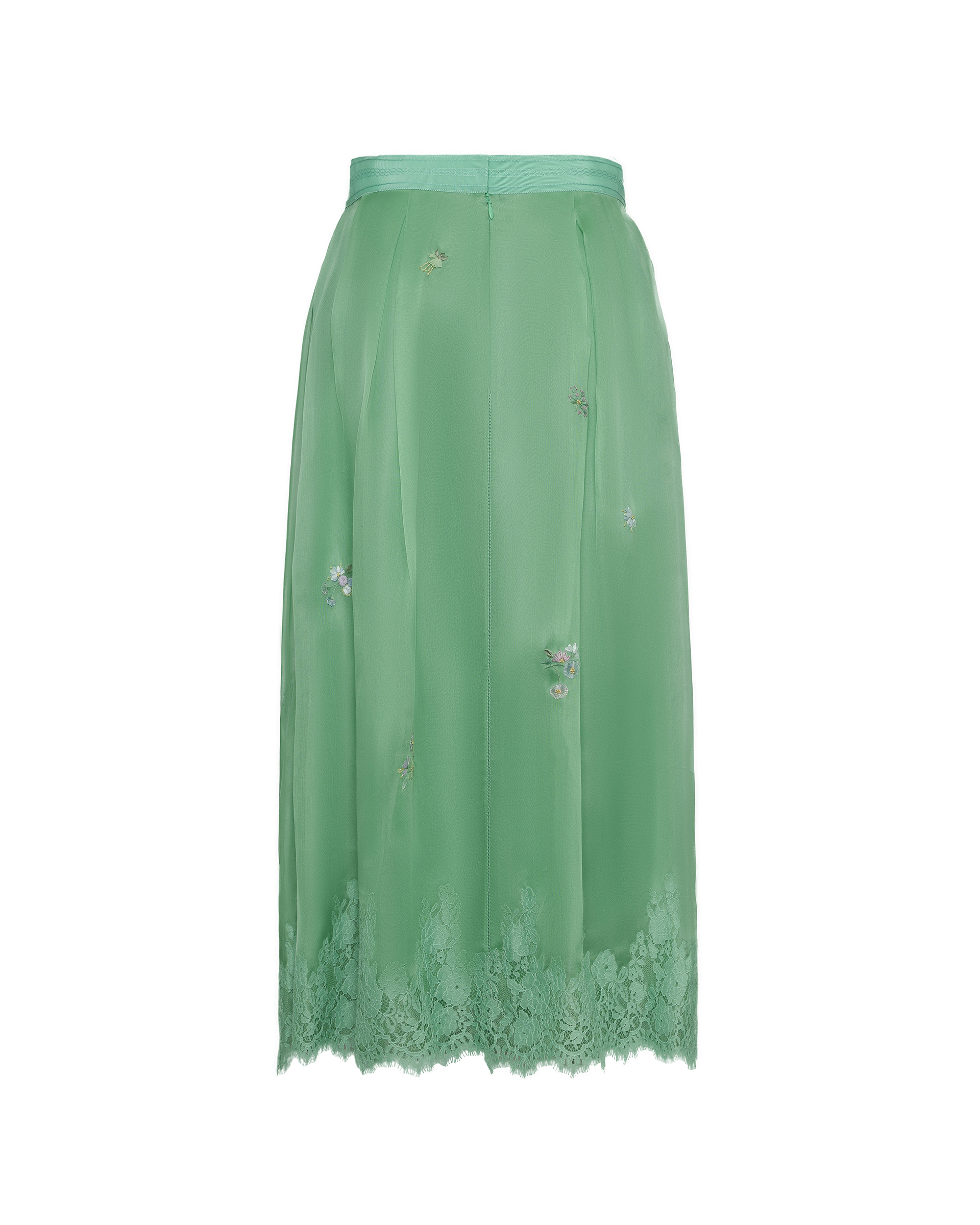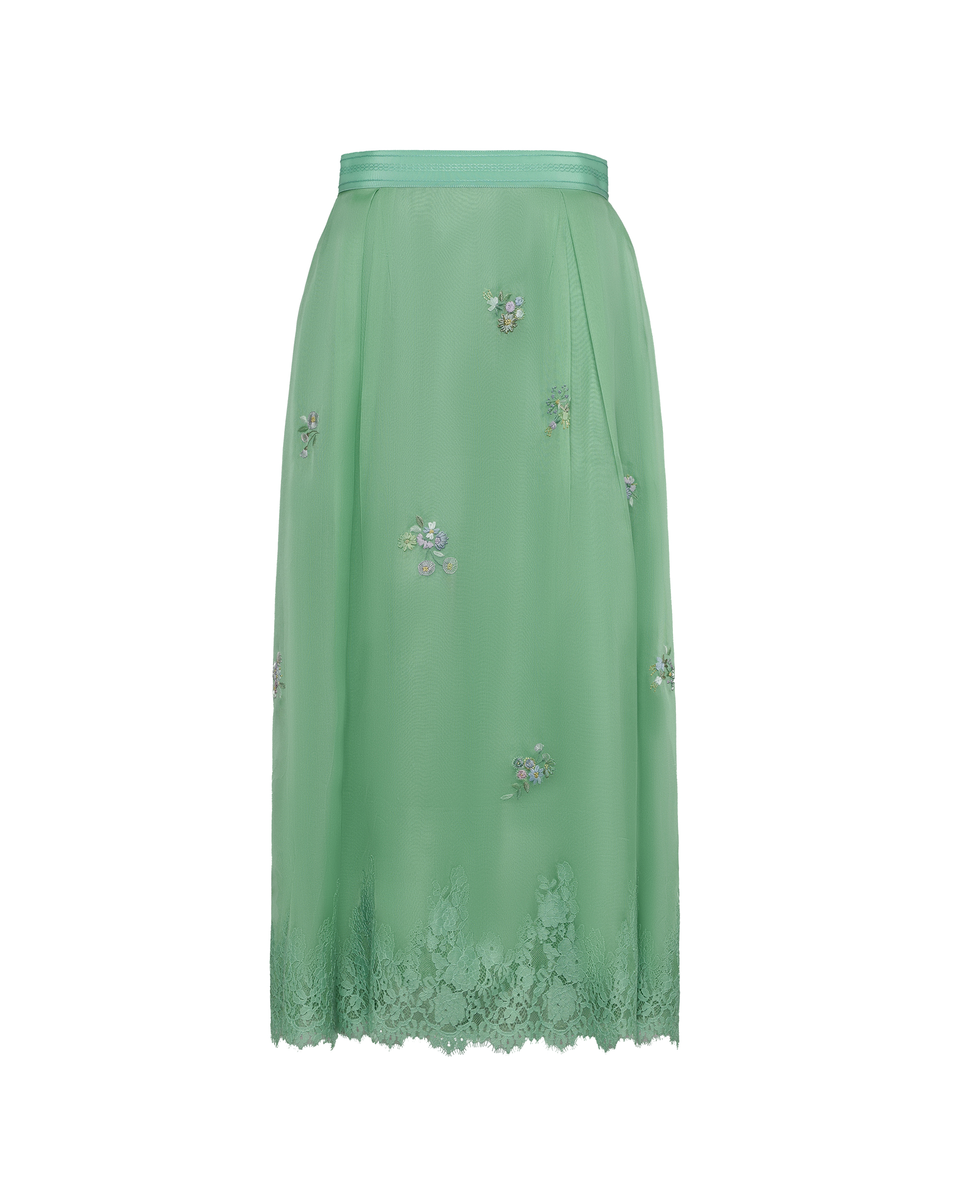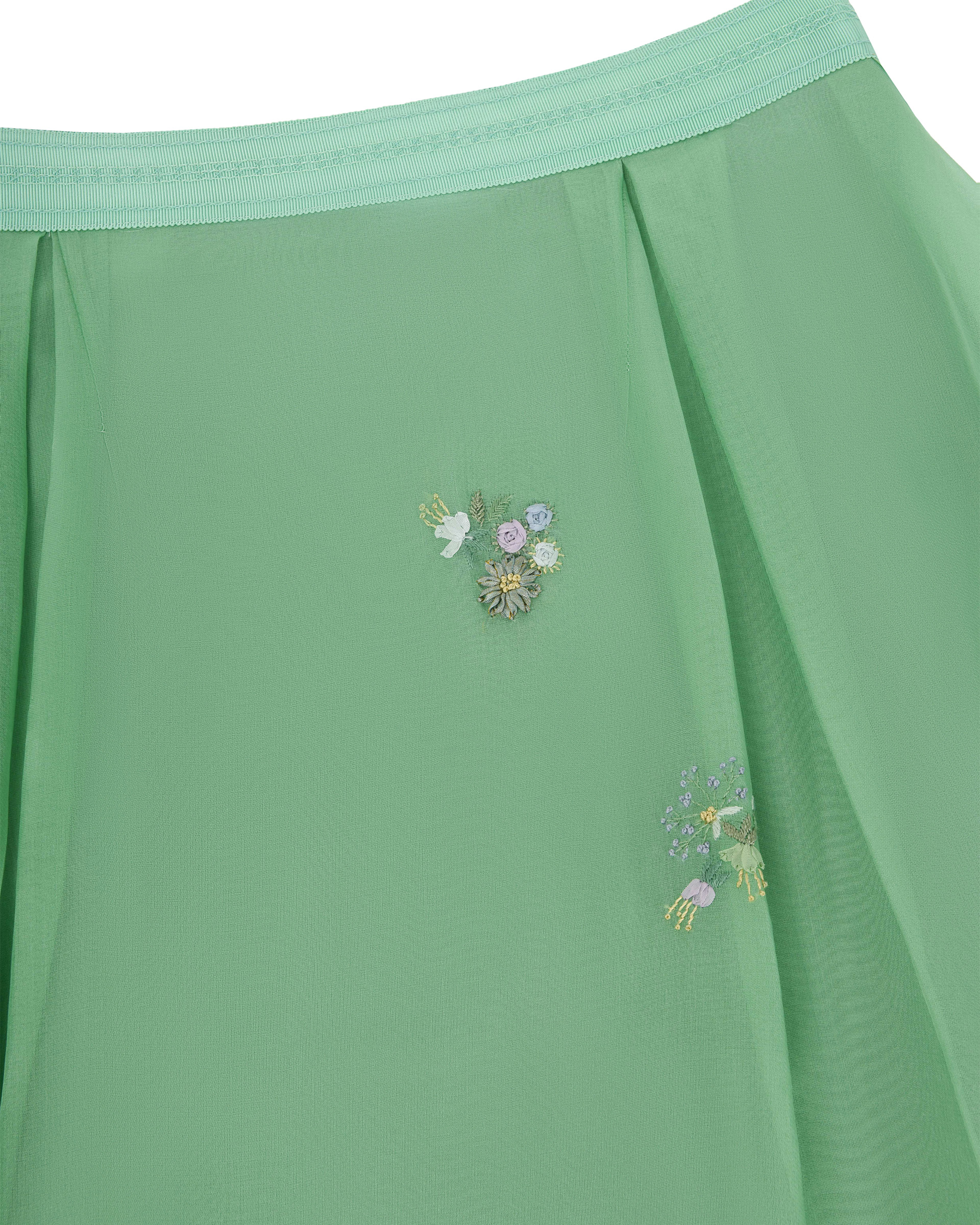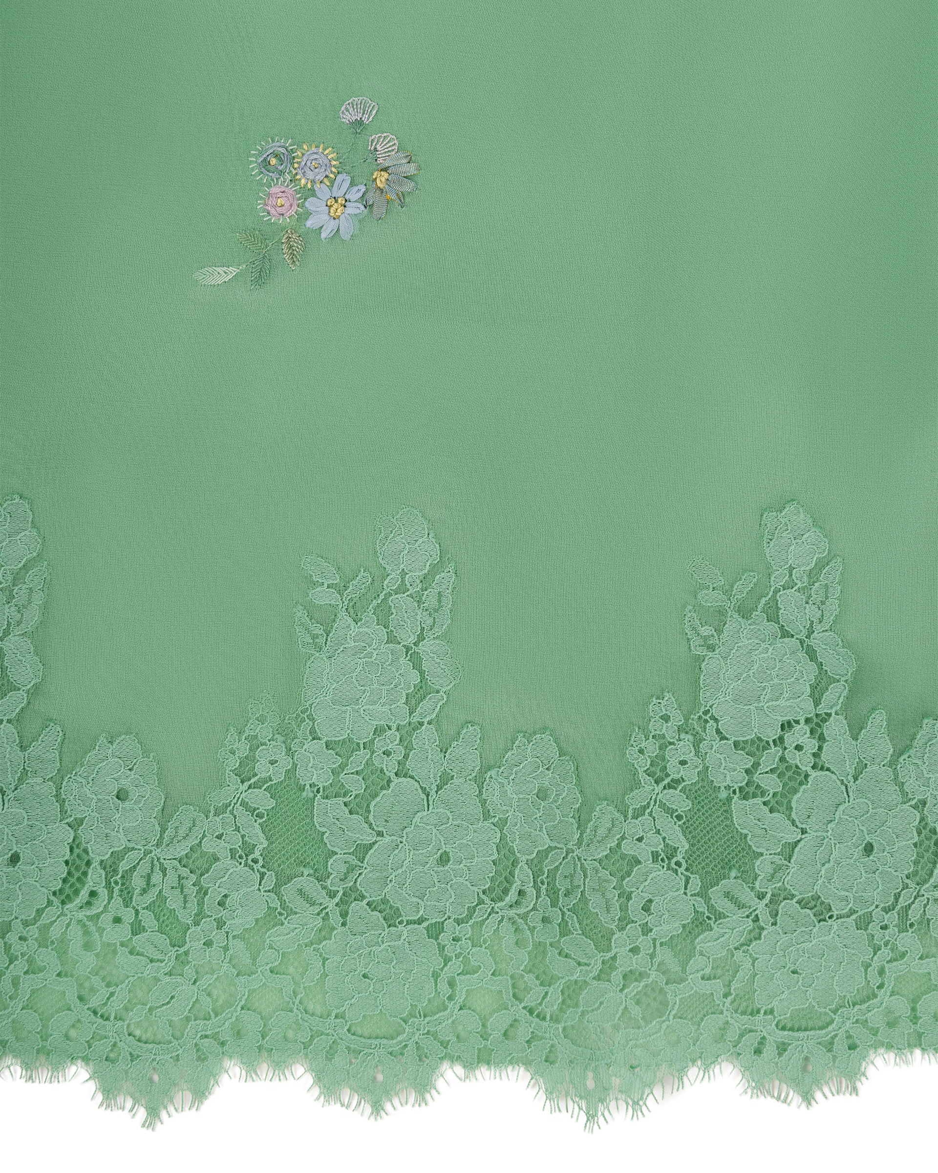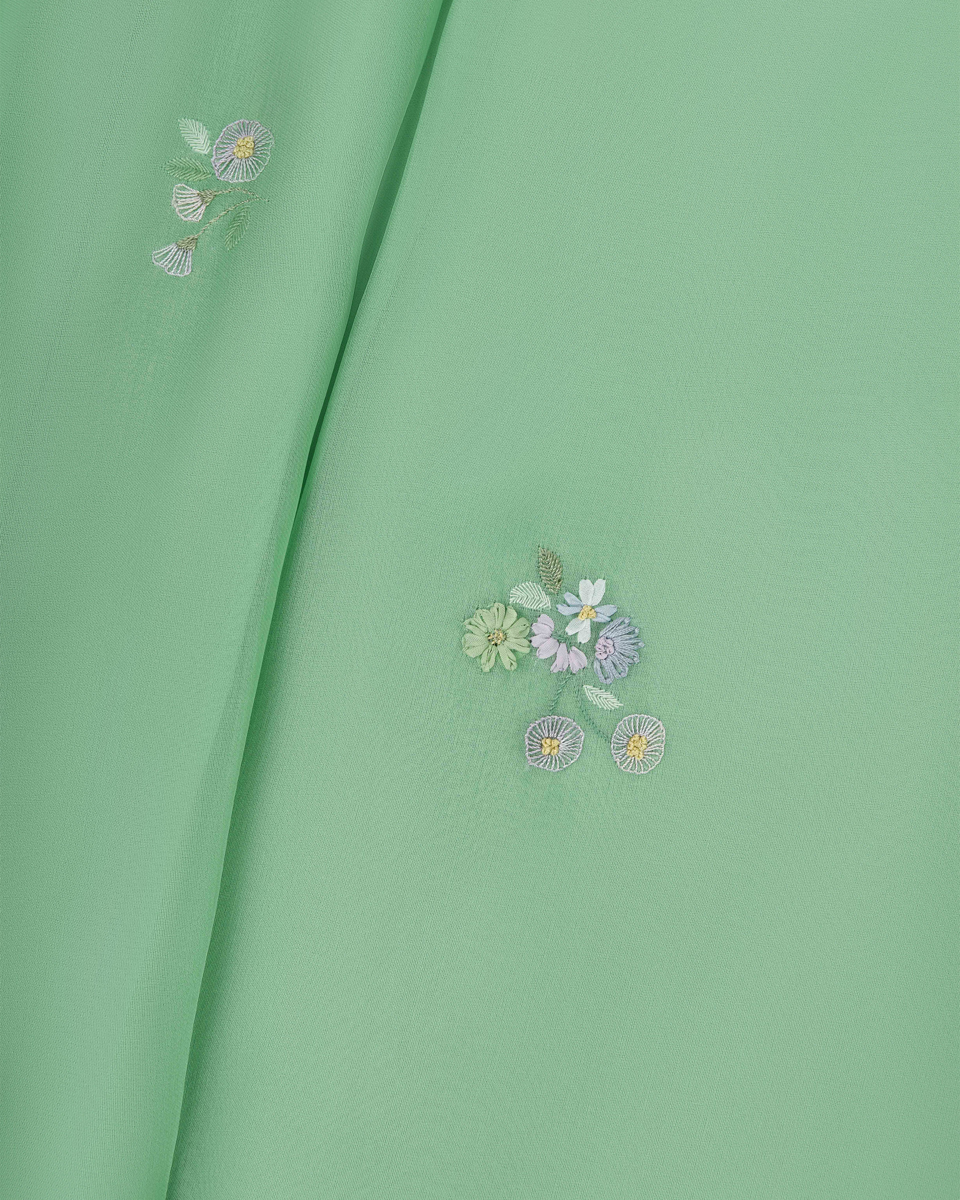 This piece is crafted from lightweight mulberry silk fabric combined with lace, and features embroidery in matching shades that evokes the warm, airy atmosphere of spring.