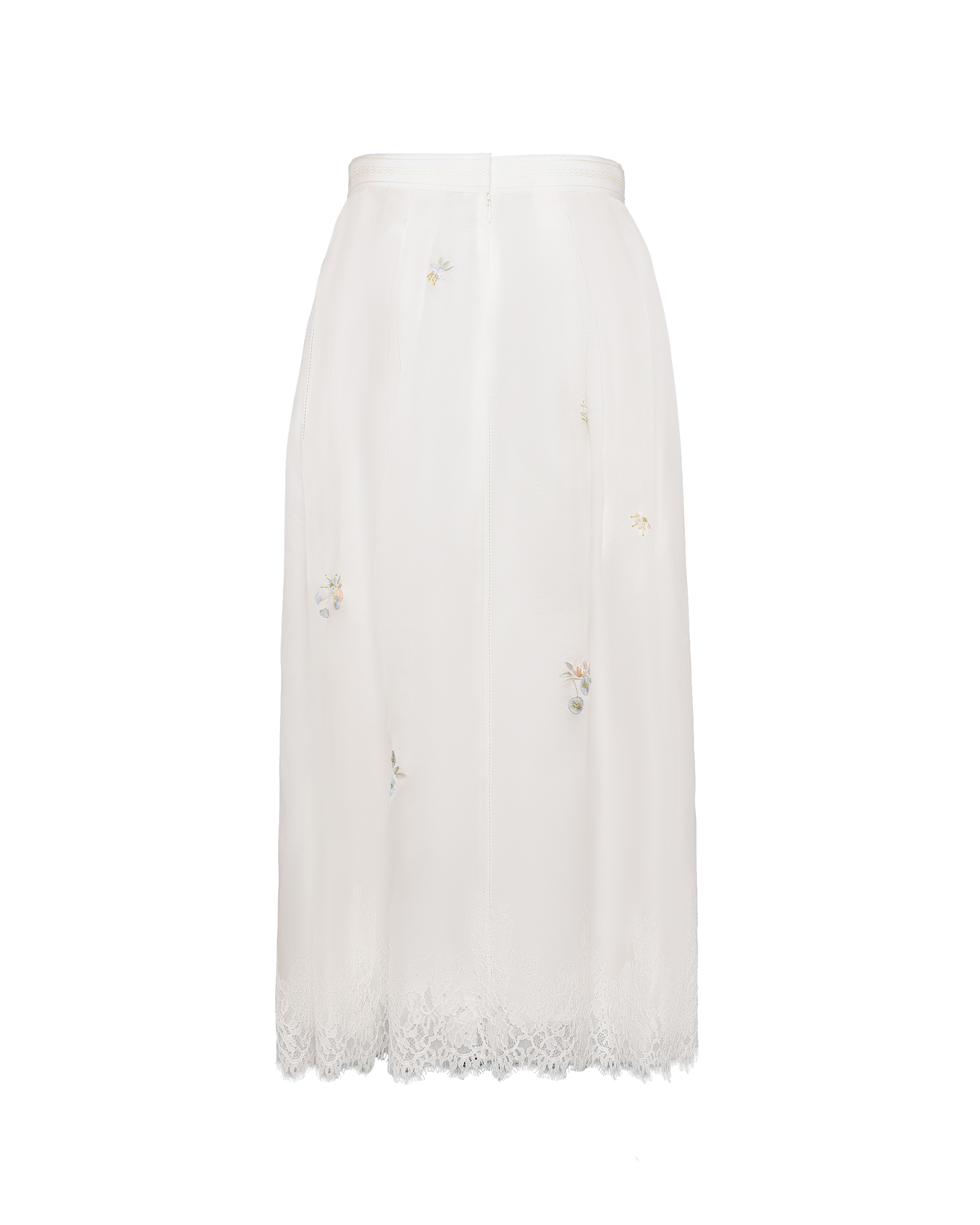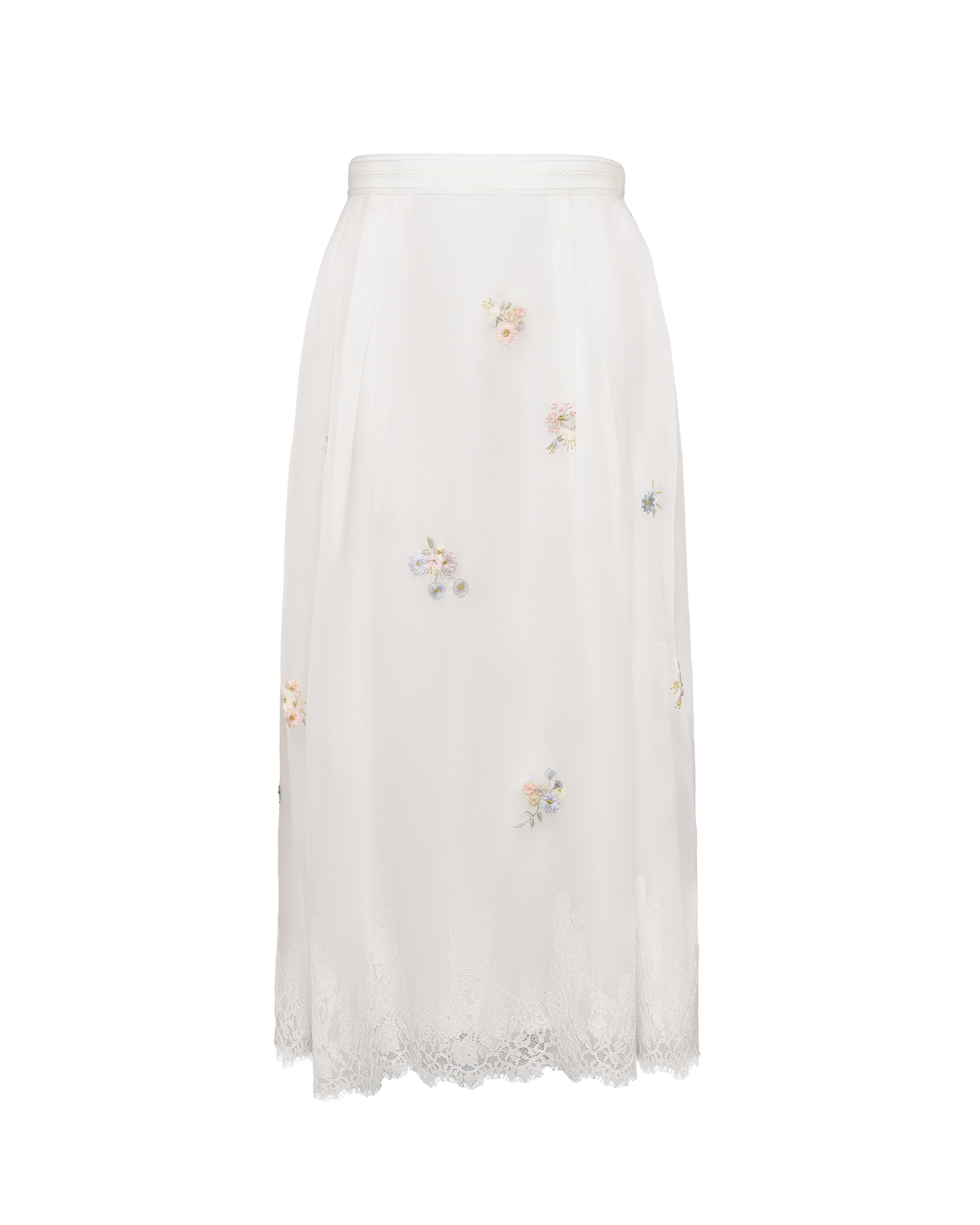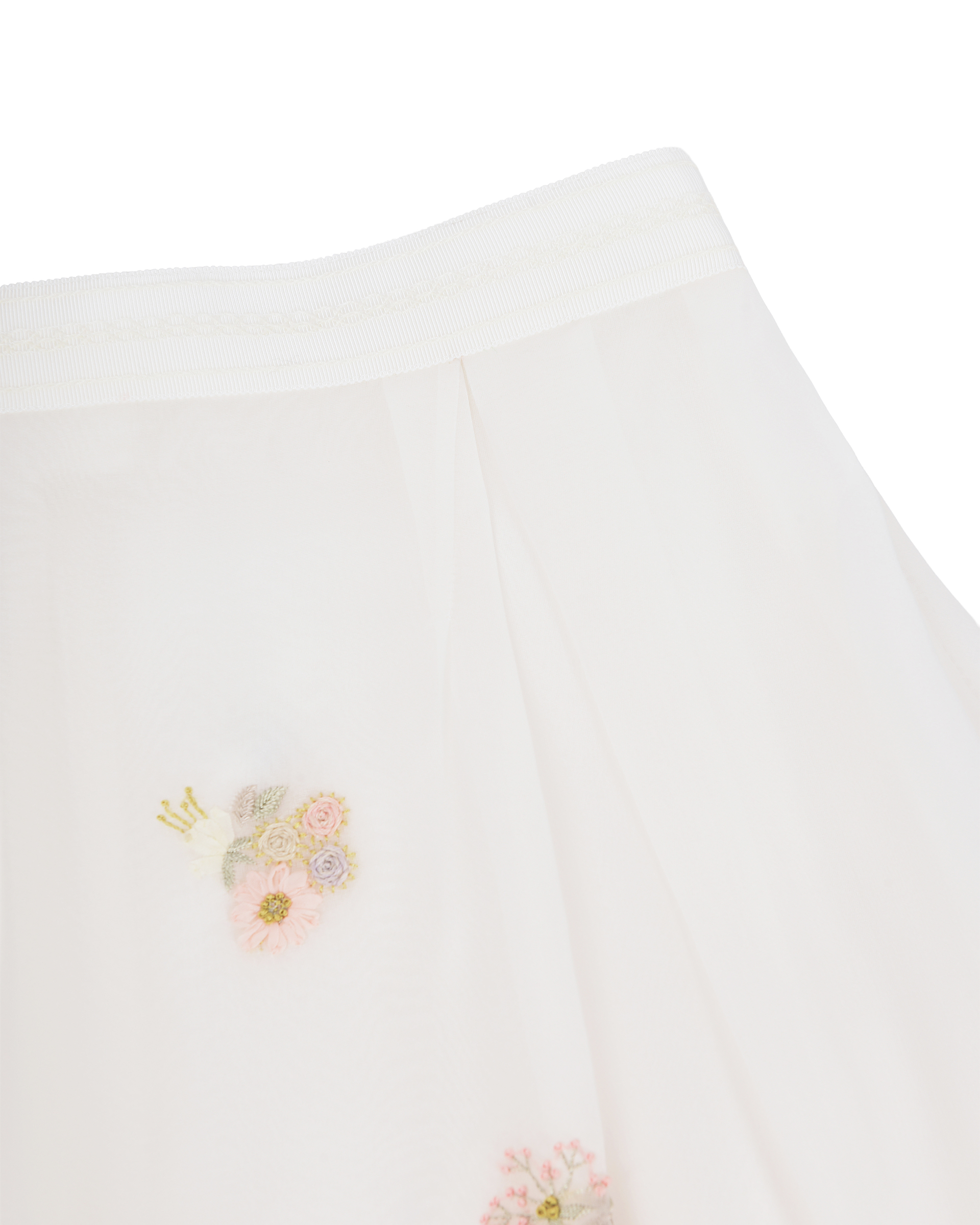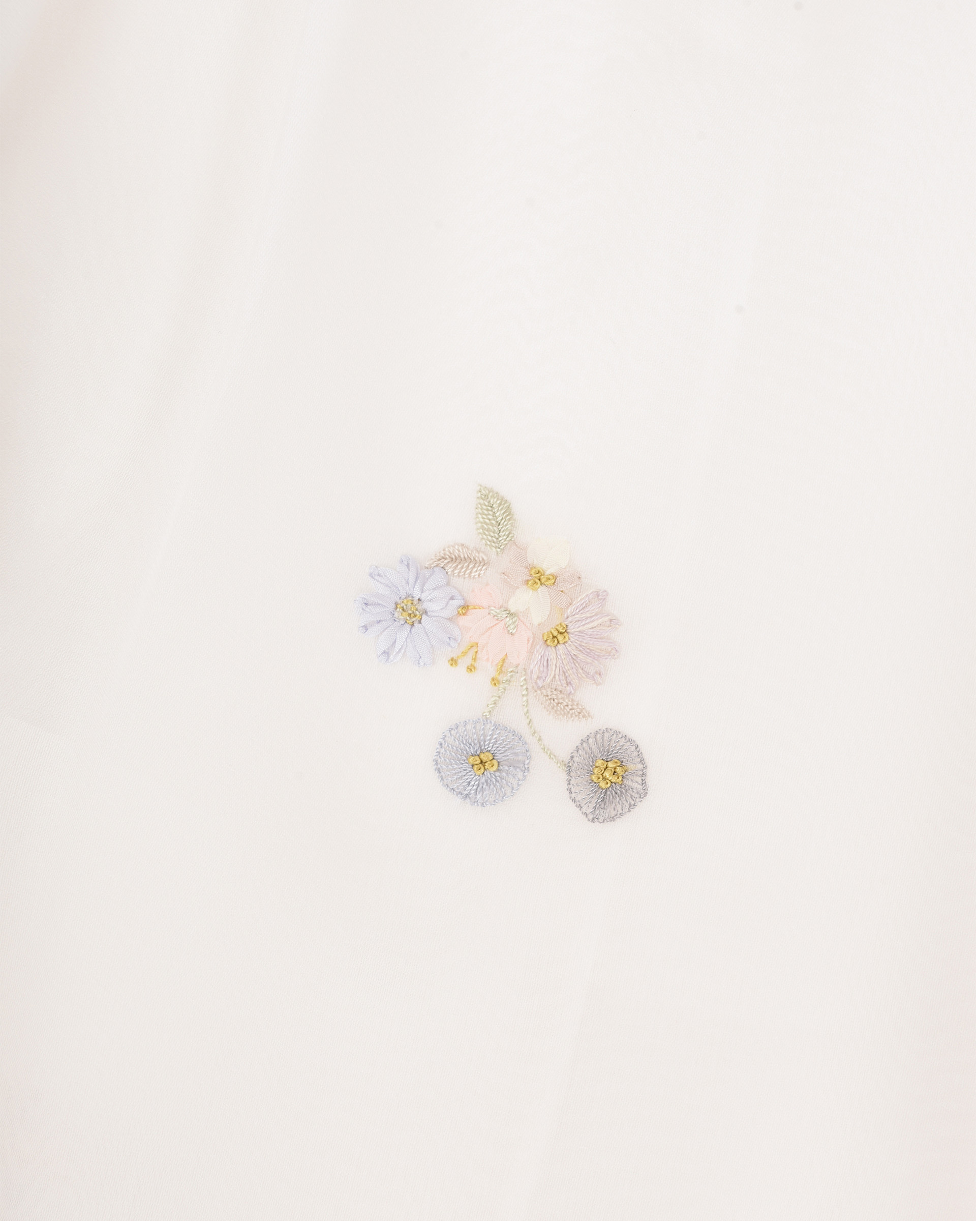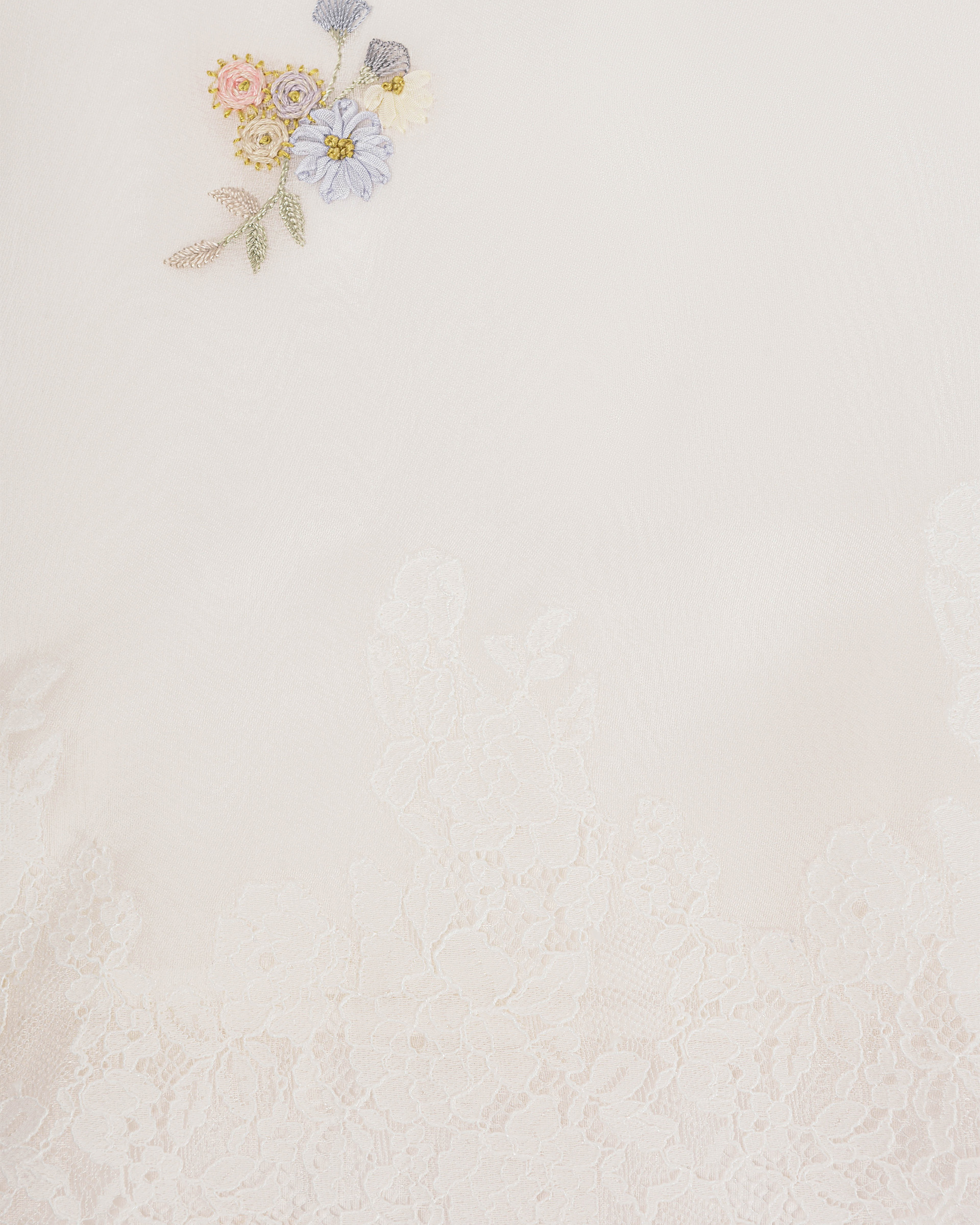 This piece is crafted from lightweight mulberry silk fabric combined with lace, and features embroidery in matching shades that evokes the warm, airy atmosphere of spring.