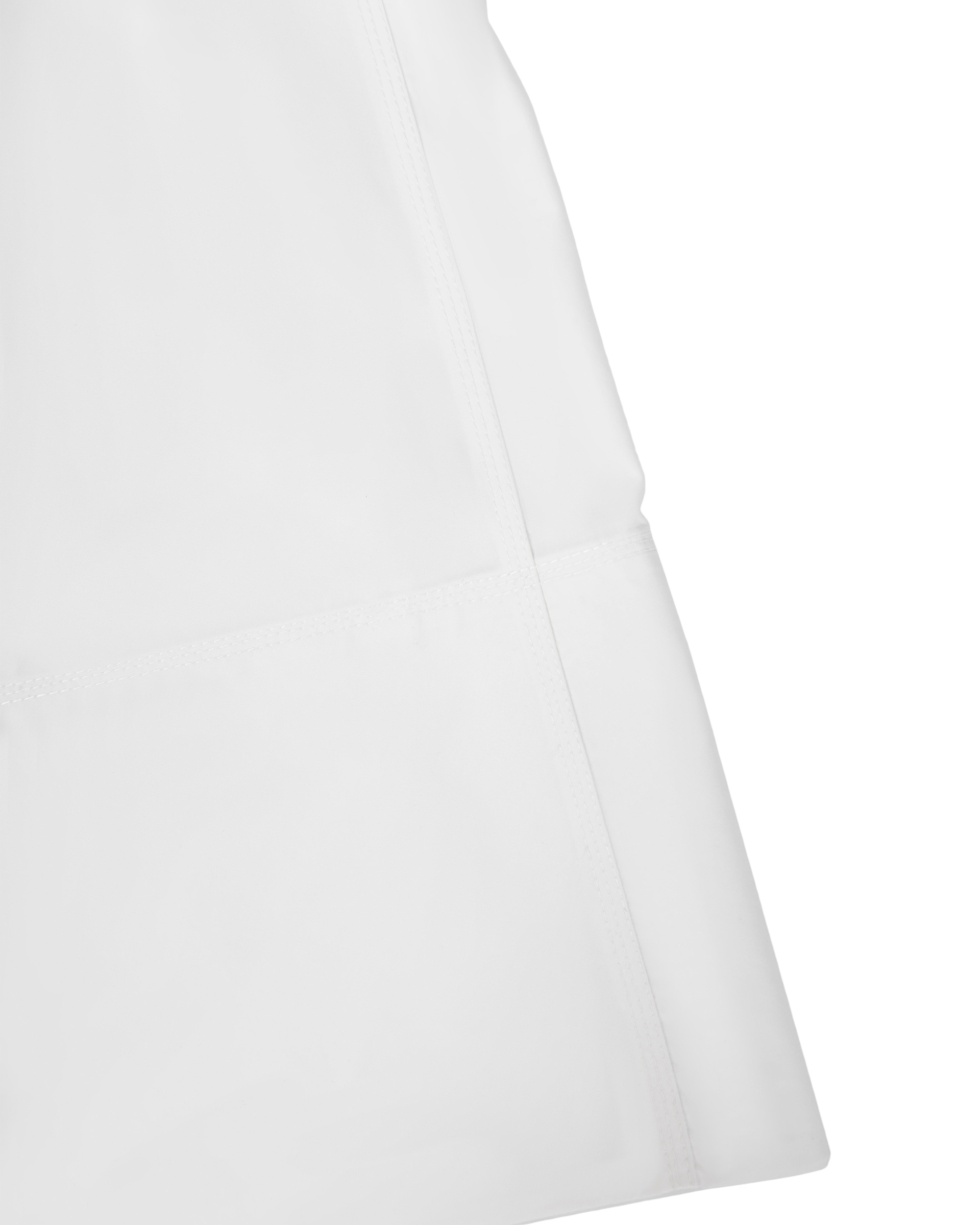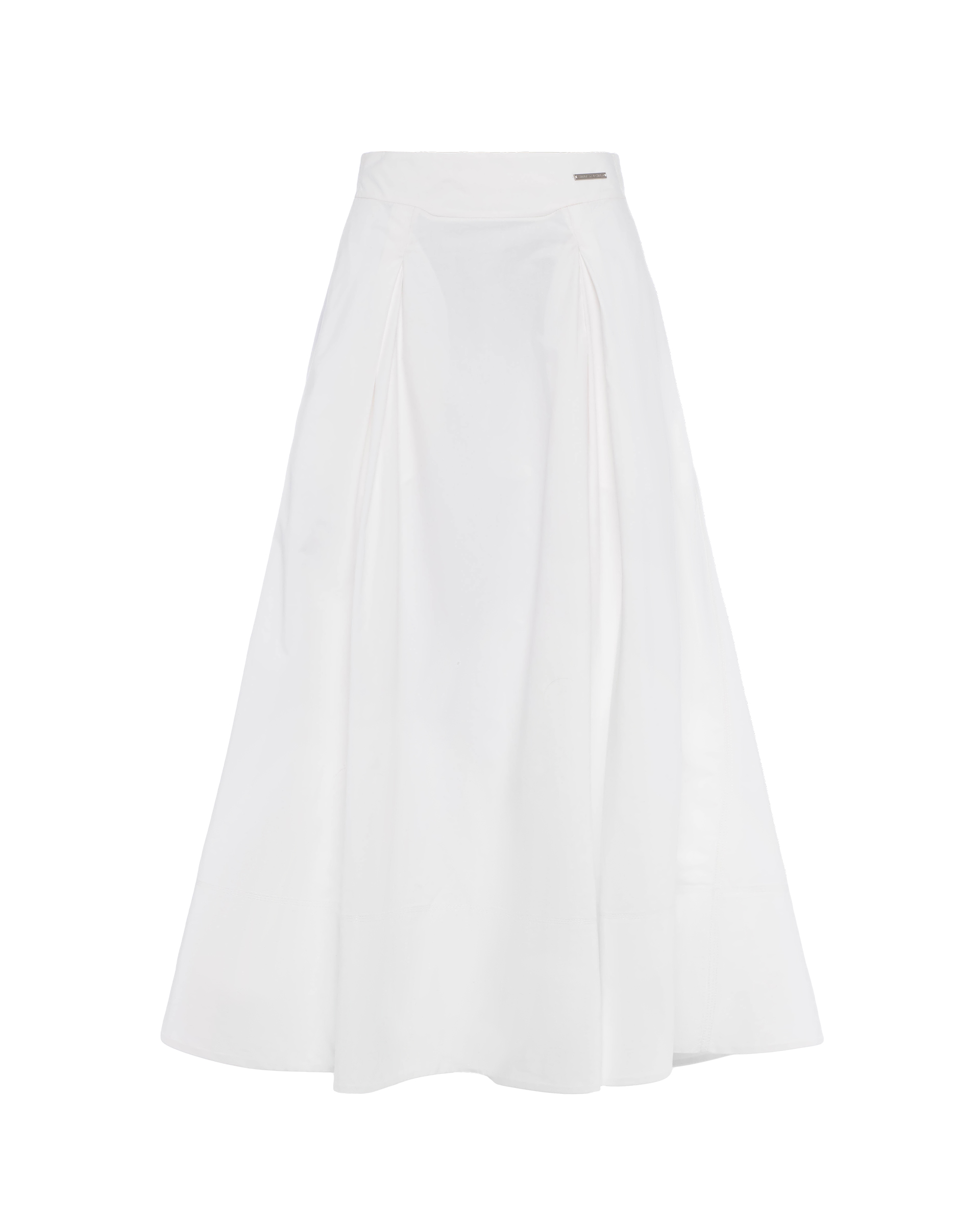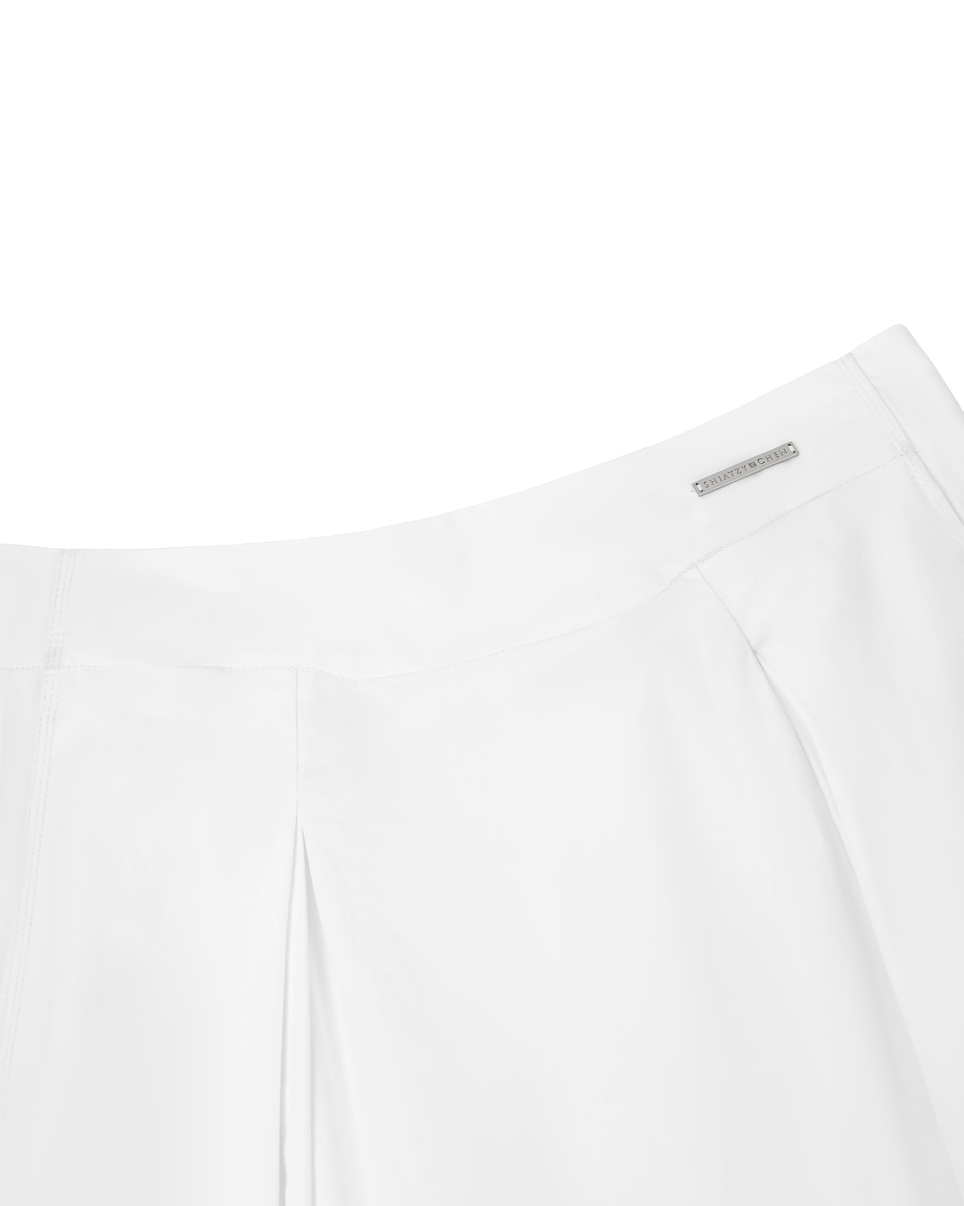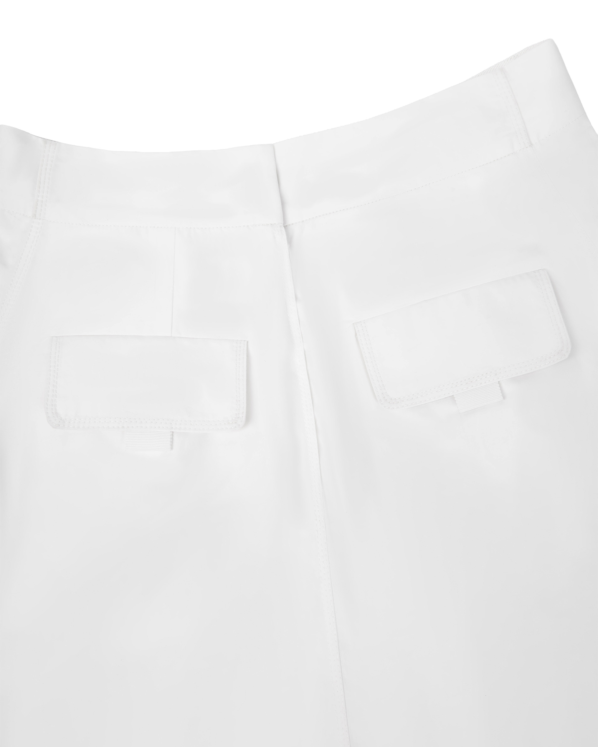 Made from cotton-blend fabric with a crisp, structured feel. The A-line silhouette and three-dimensional pockets subtly enhance the hip line, beautifully accentuating the figure.
