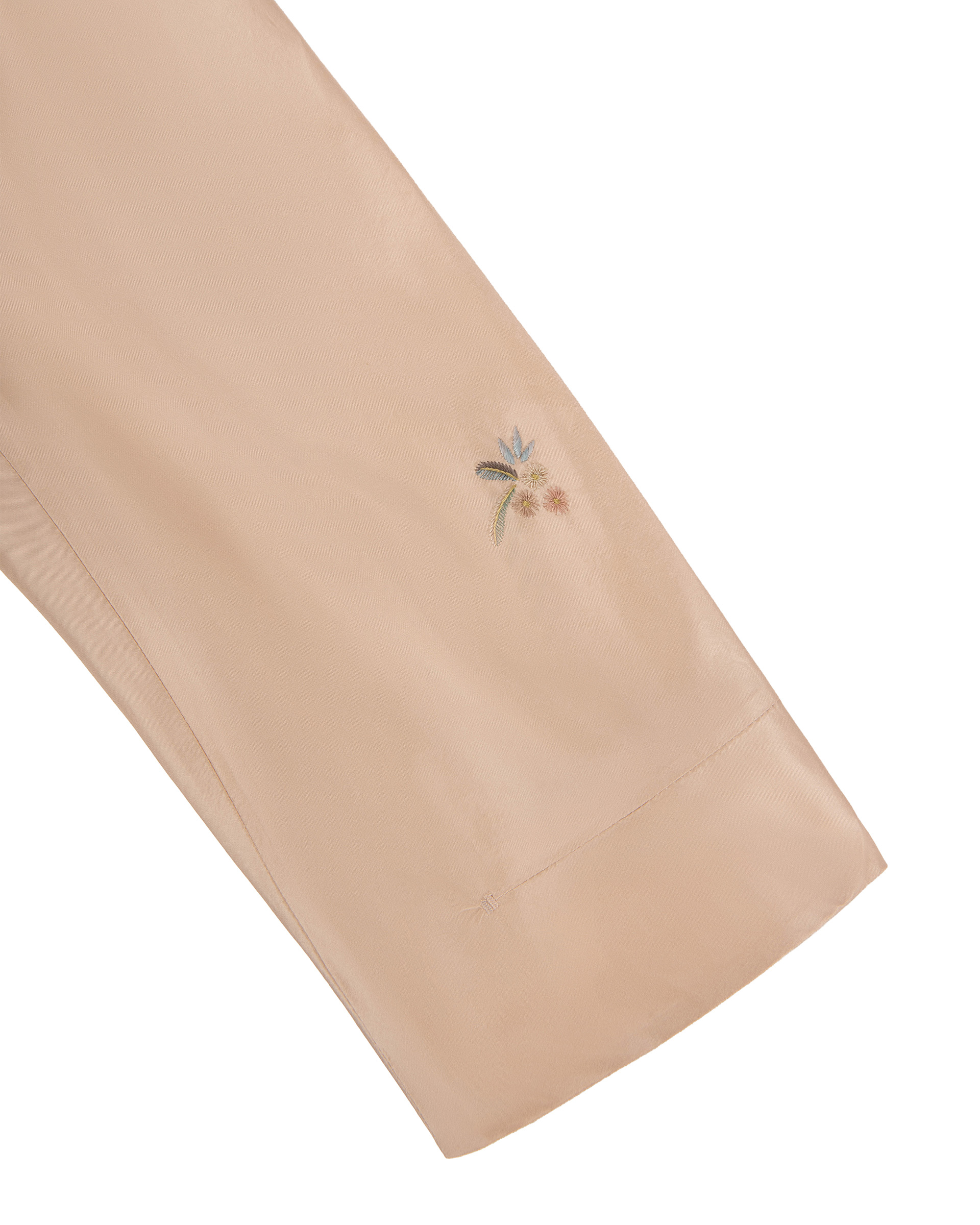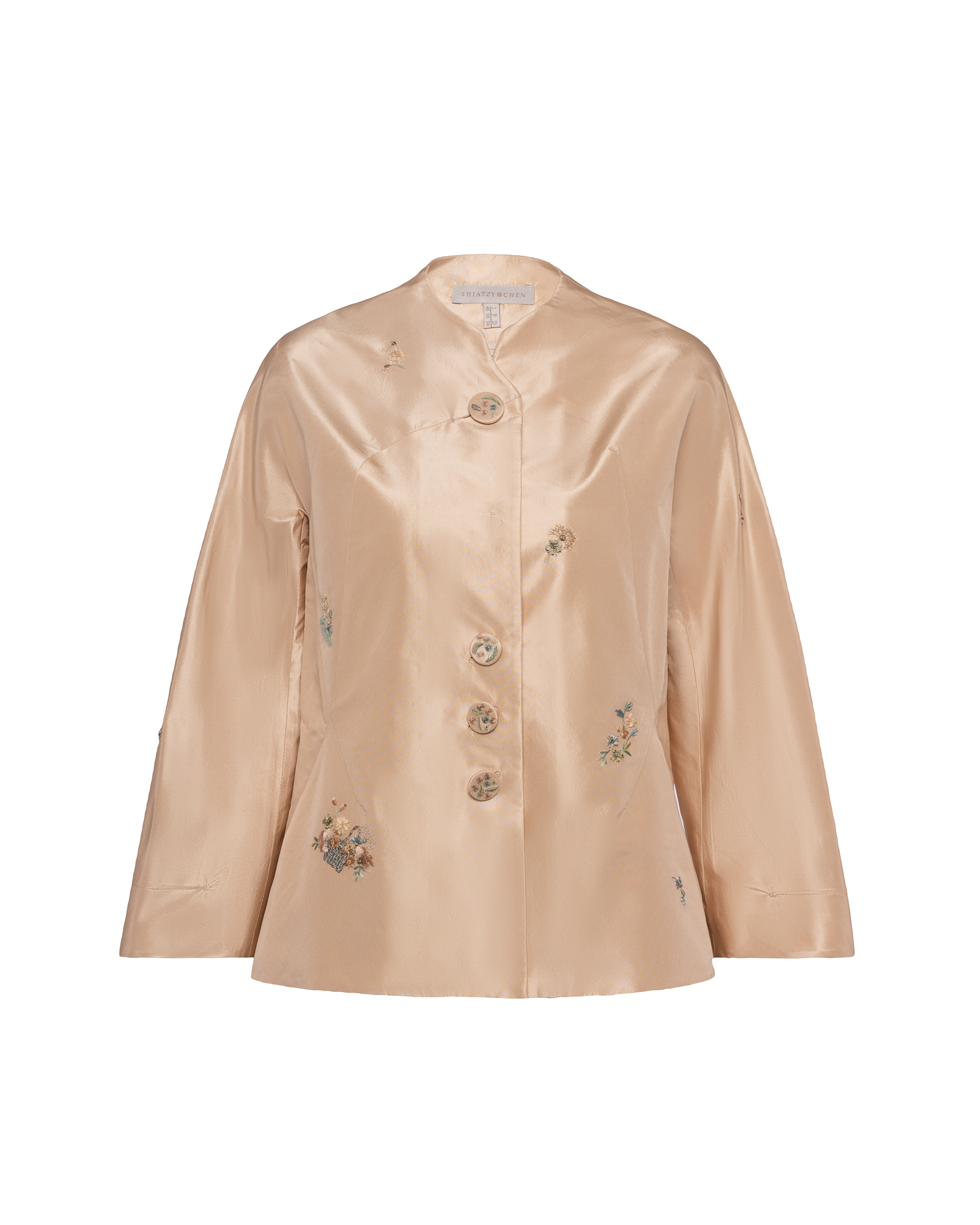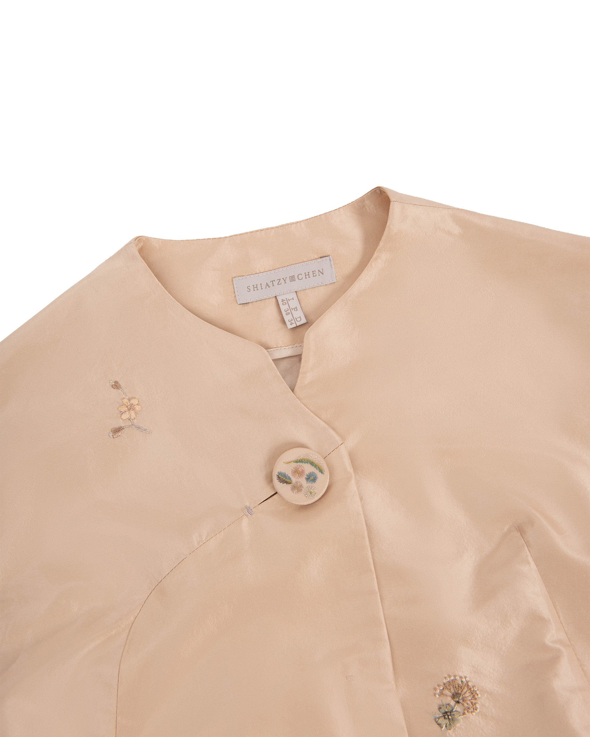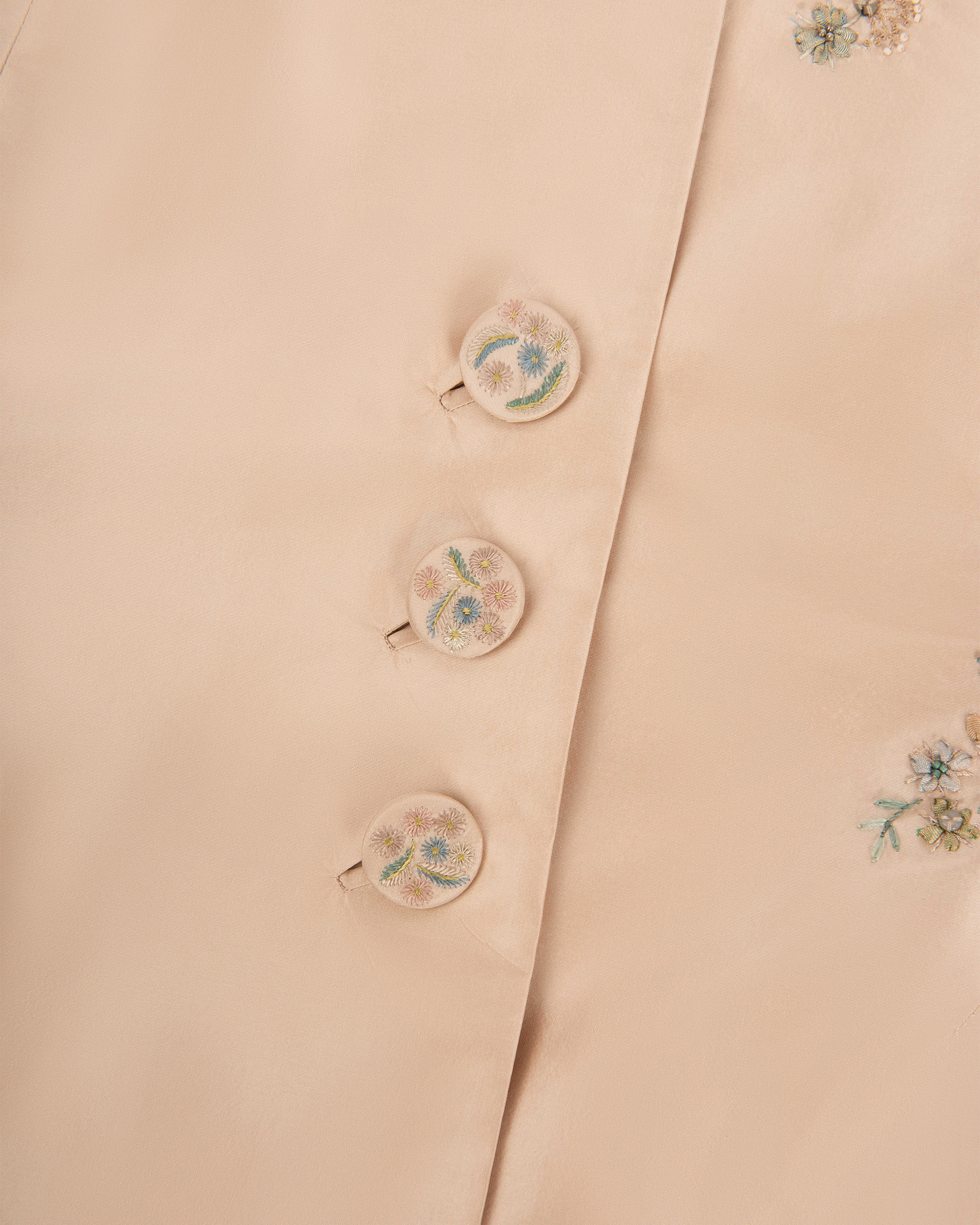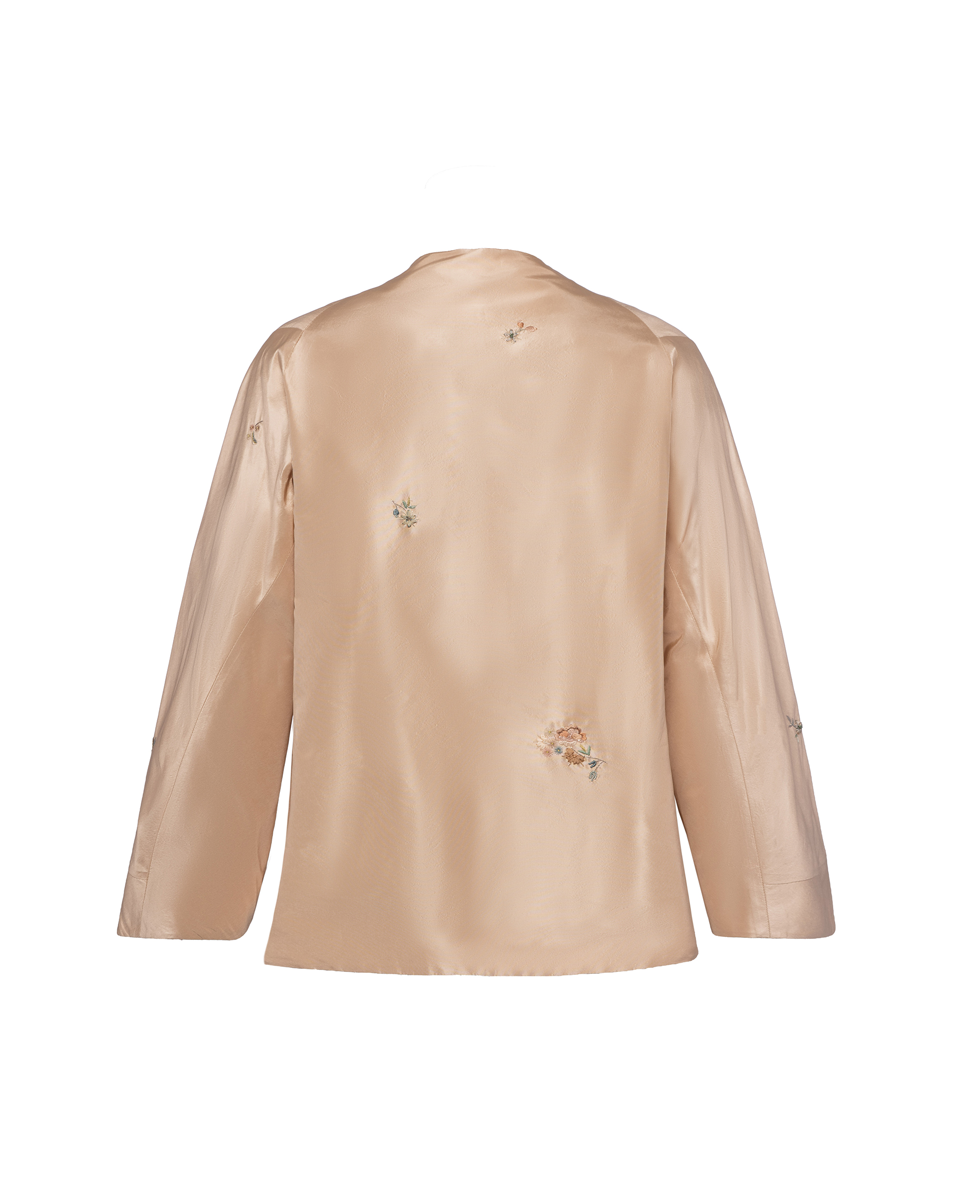 This piece is crafted from lustrous silk satin fabric, its rich sheen accentuating the luxurious texture. Combining ribbon embroidery, flat embroidery, and seed stitching techniques, it showcases the vibrant hues of spring.