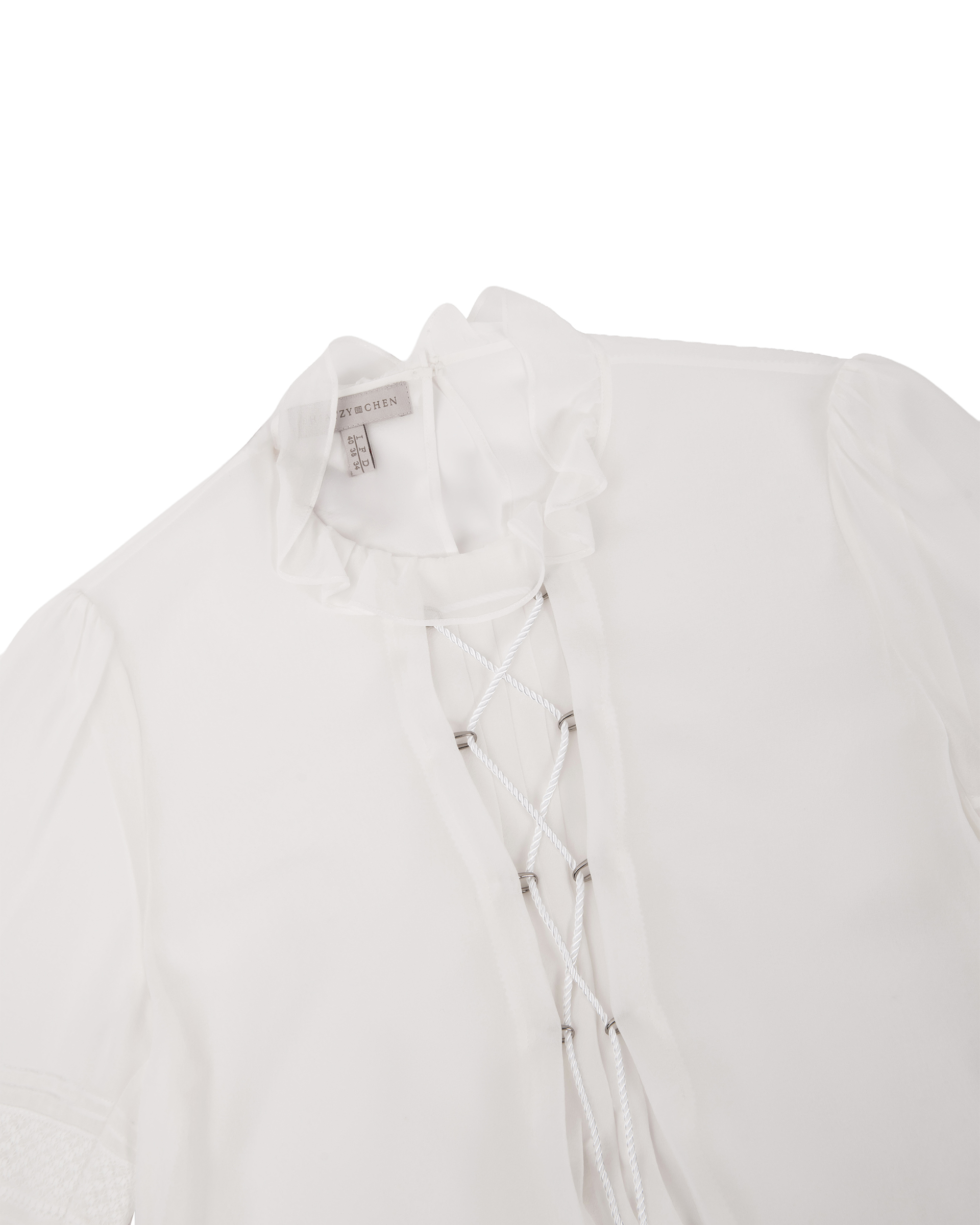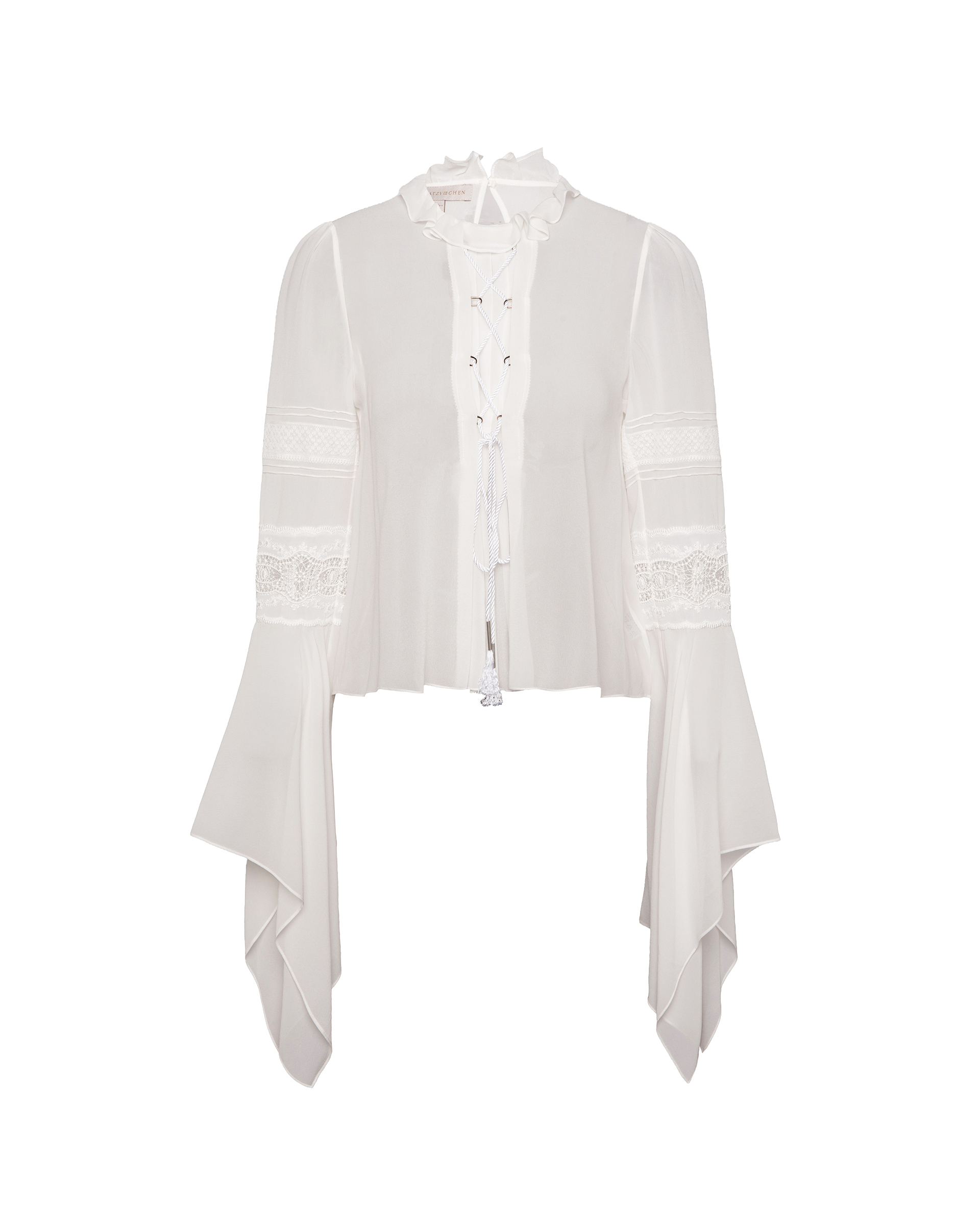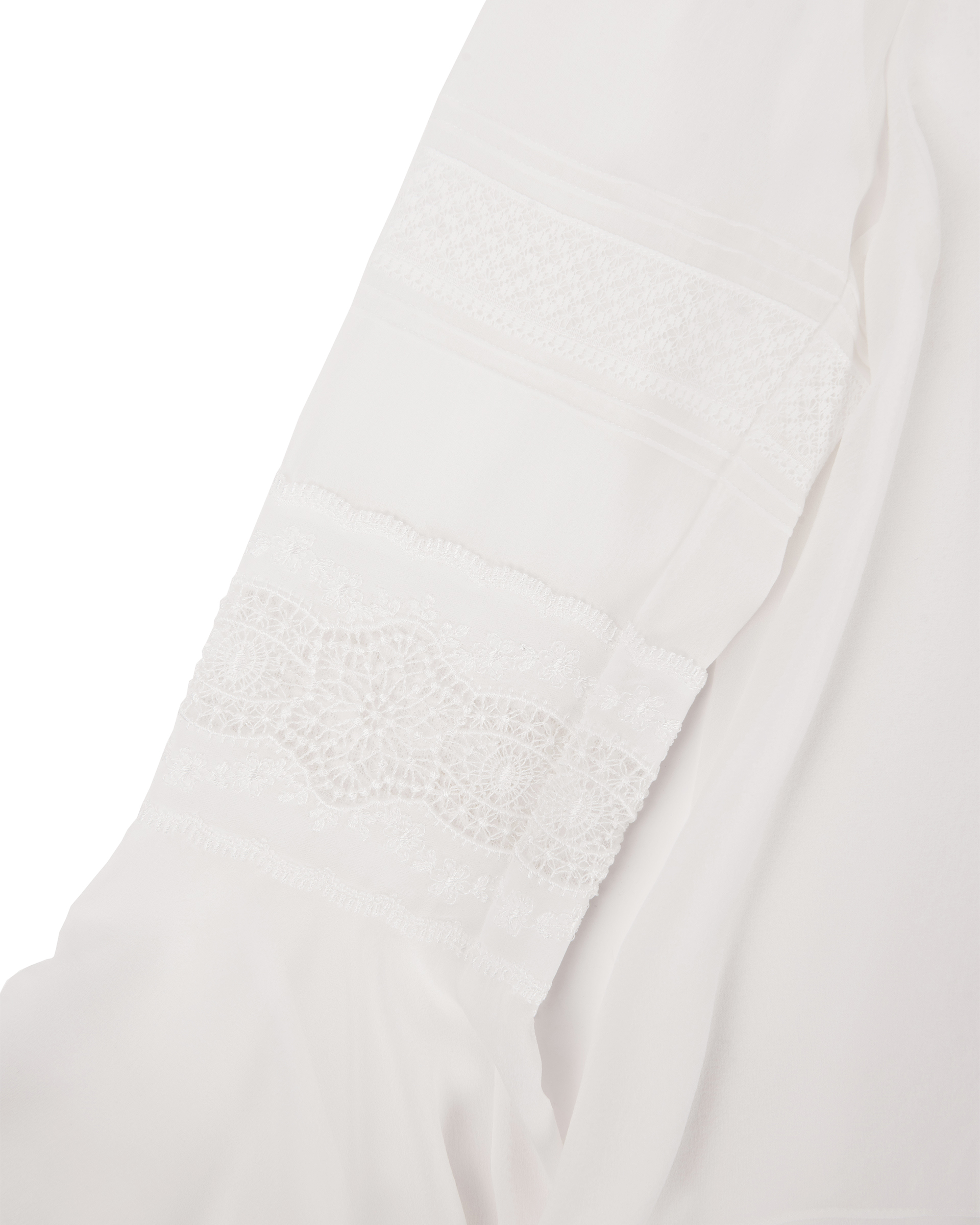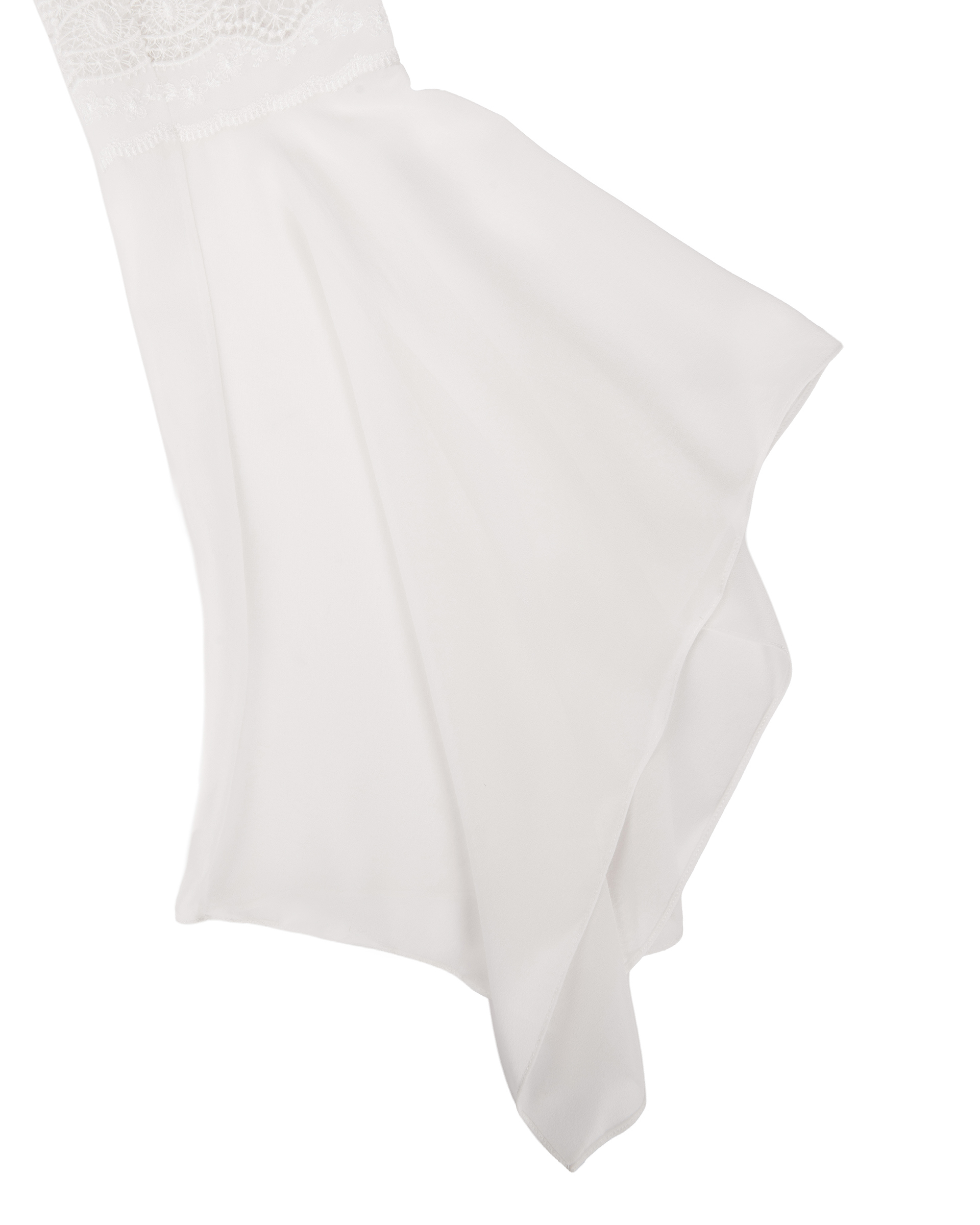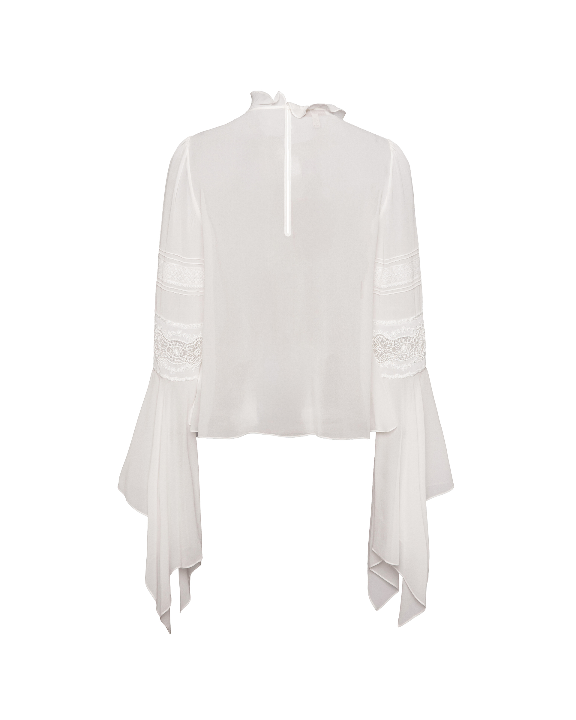 This piece features a clever blend of silk and lace, making it a truly stylish design; paired with asymmetrical flared sleeves, it exudes an elegant grace with every movement.