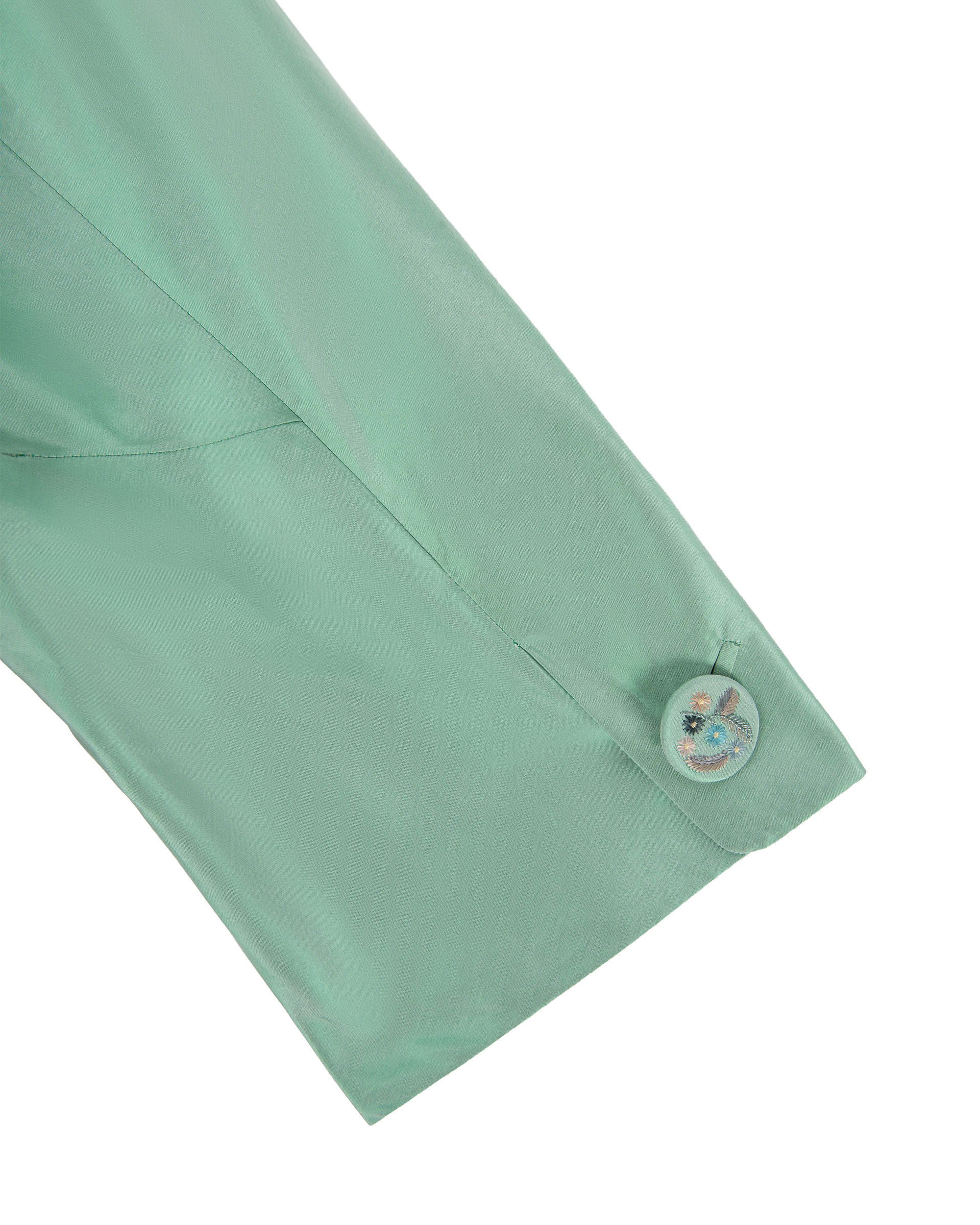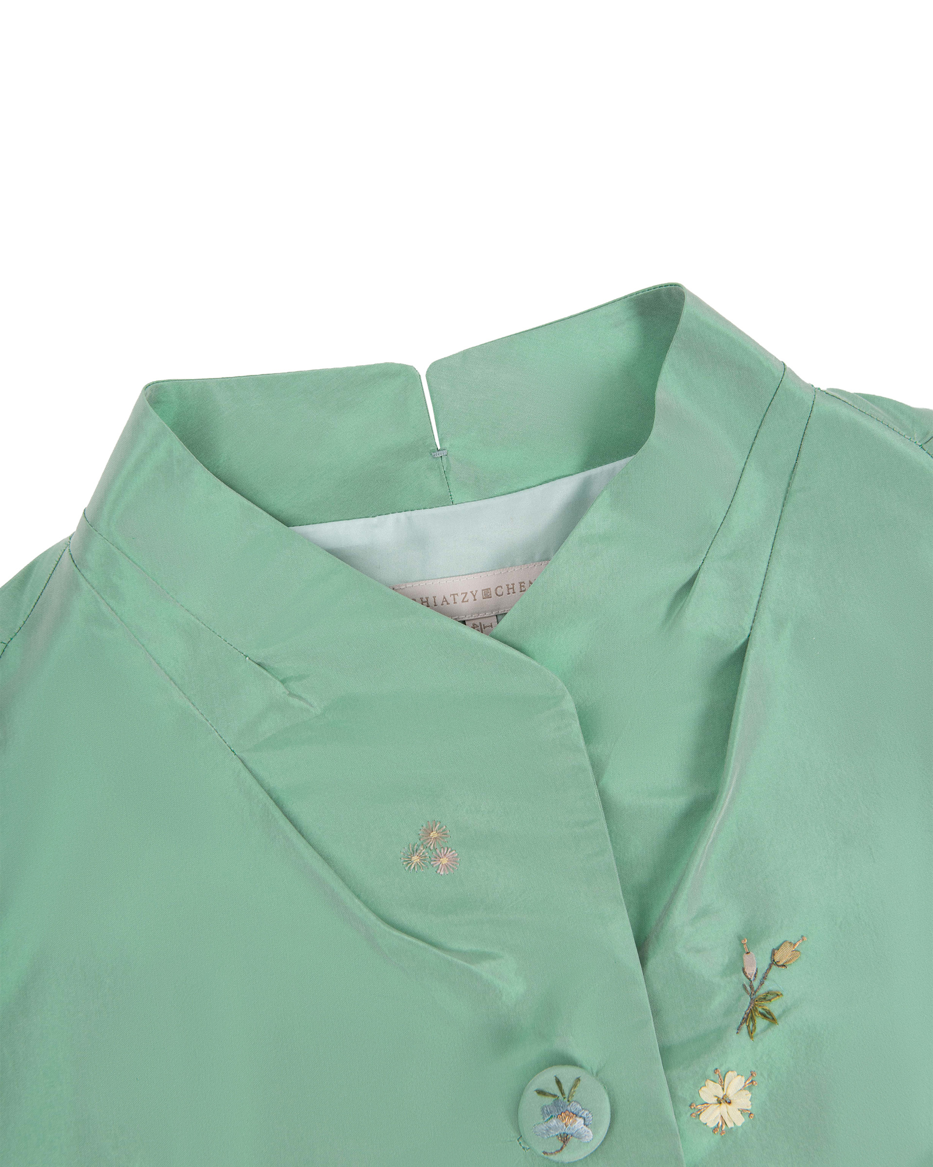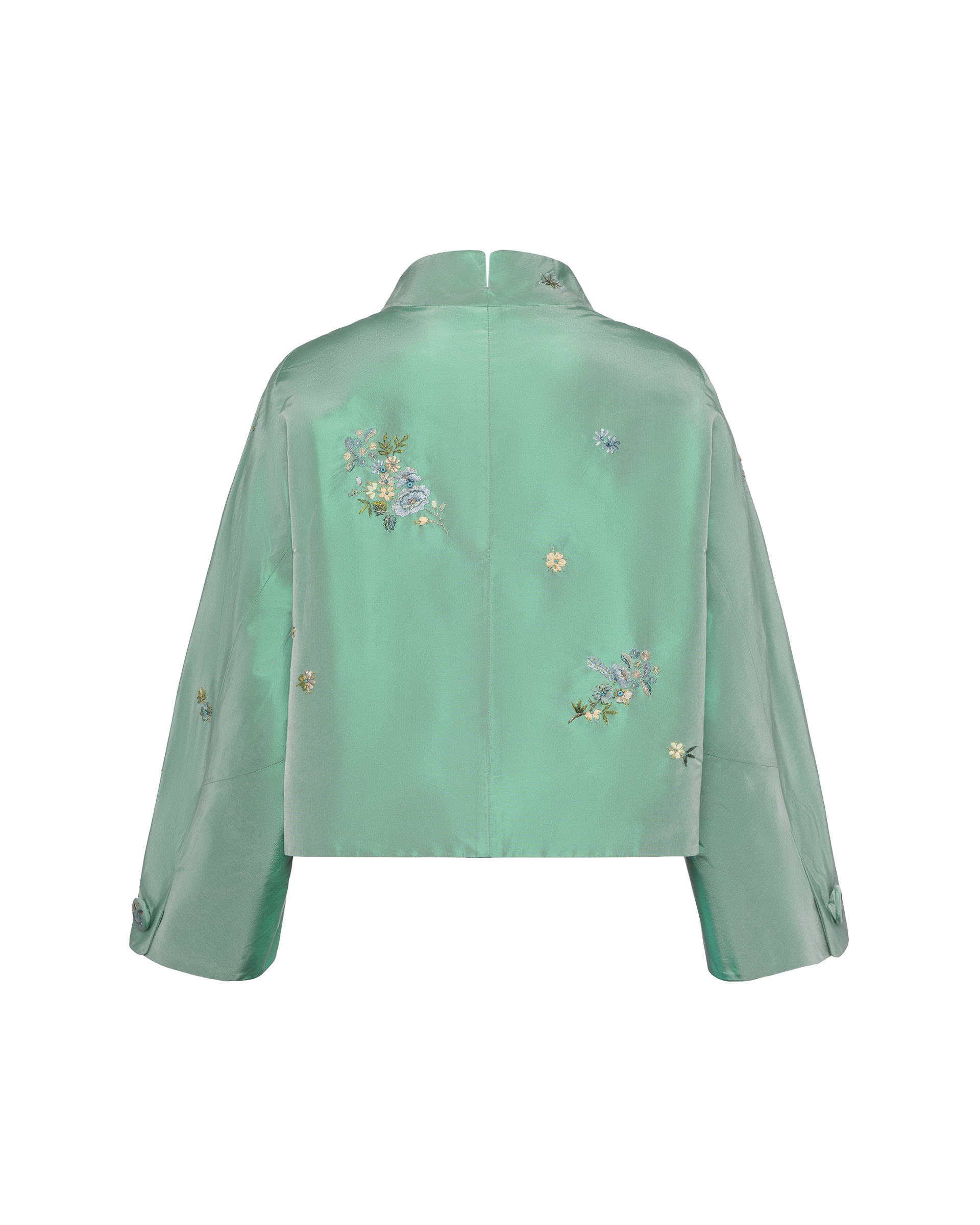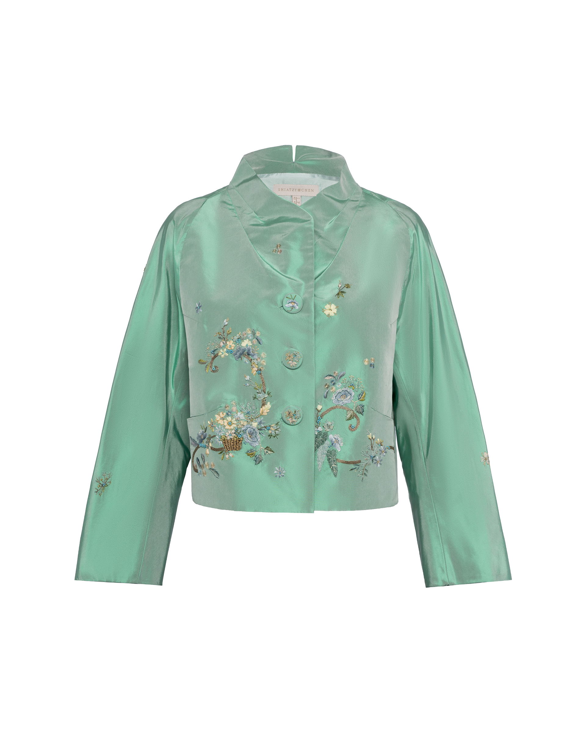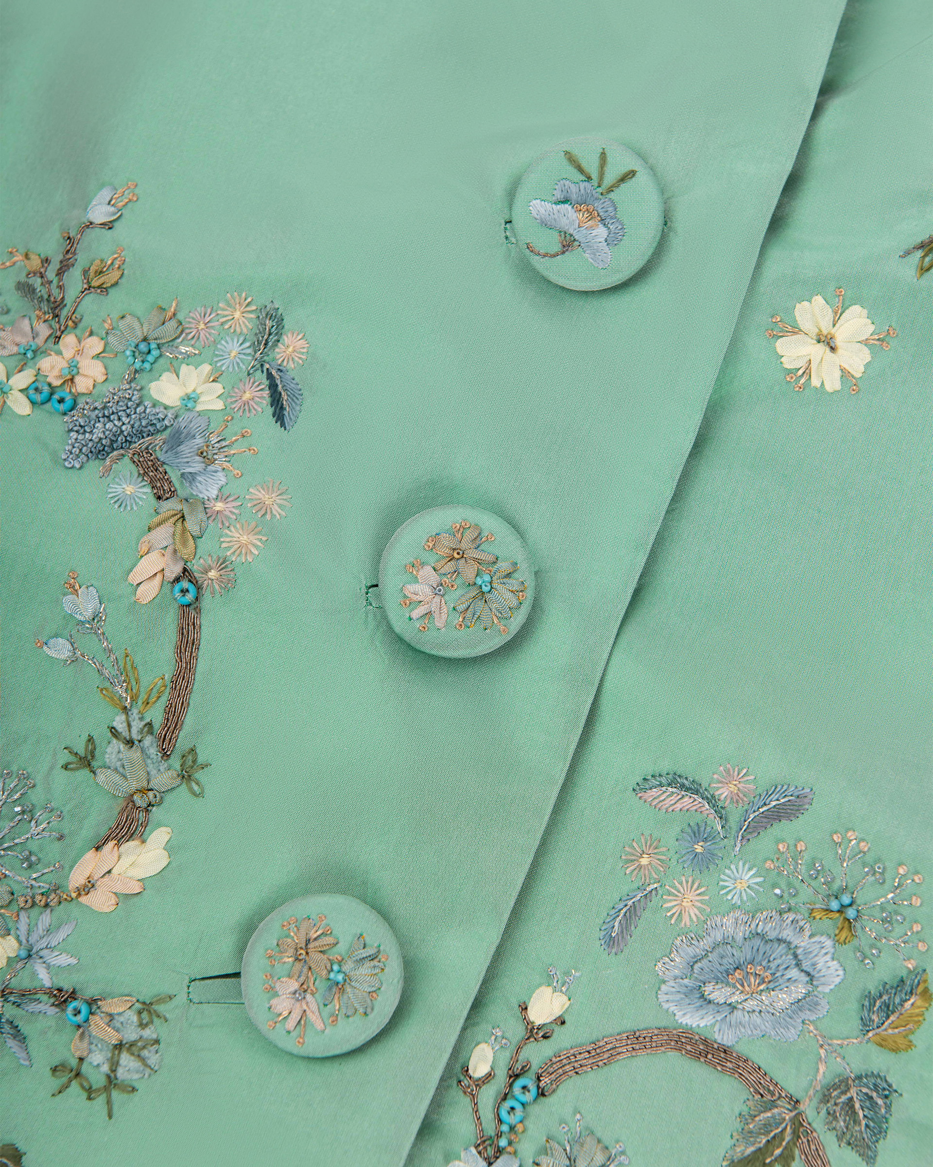 This piece is crafted from lustrous silk satin fabric, its rich sheen accentuating the luxurious texture. Combining ribbon embroidery, flat embroidery, and seed stitching techniques, it showcases the vibrant hues of spring.