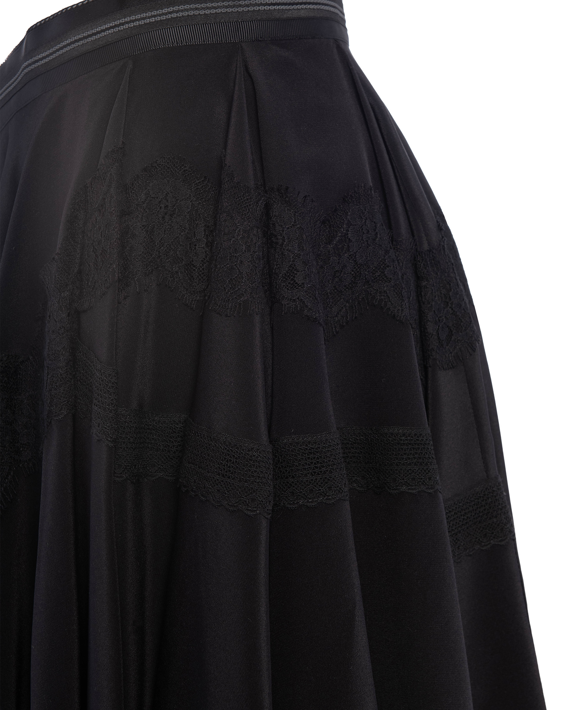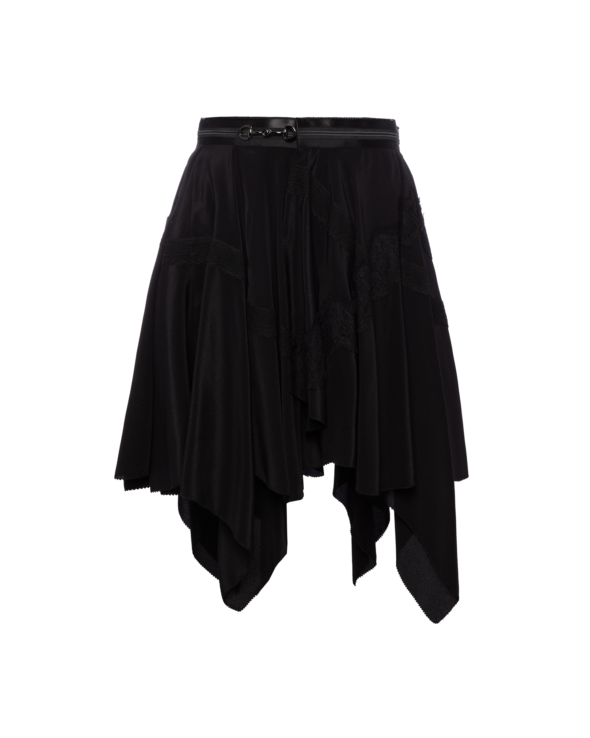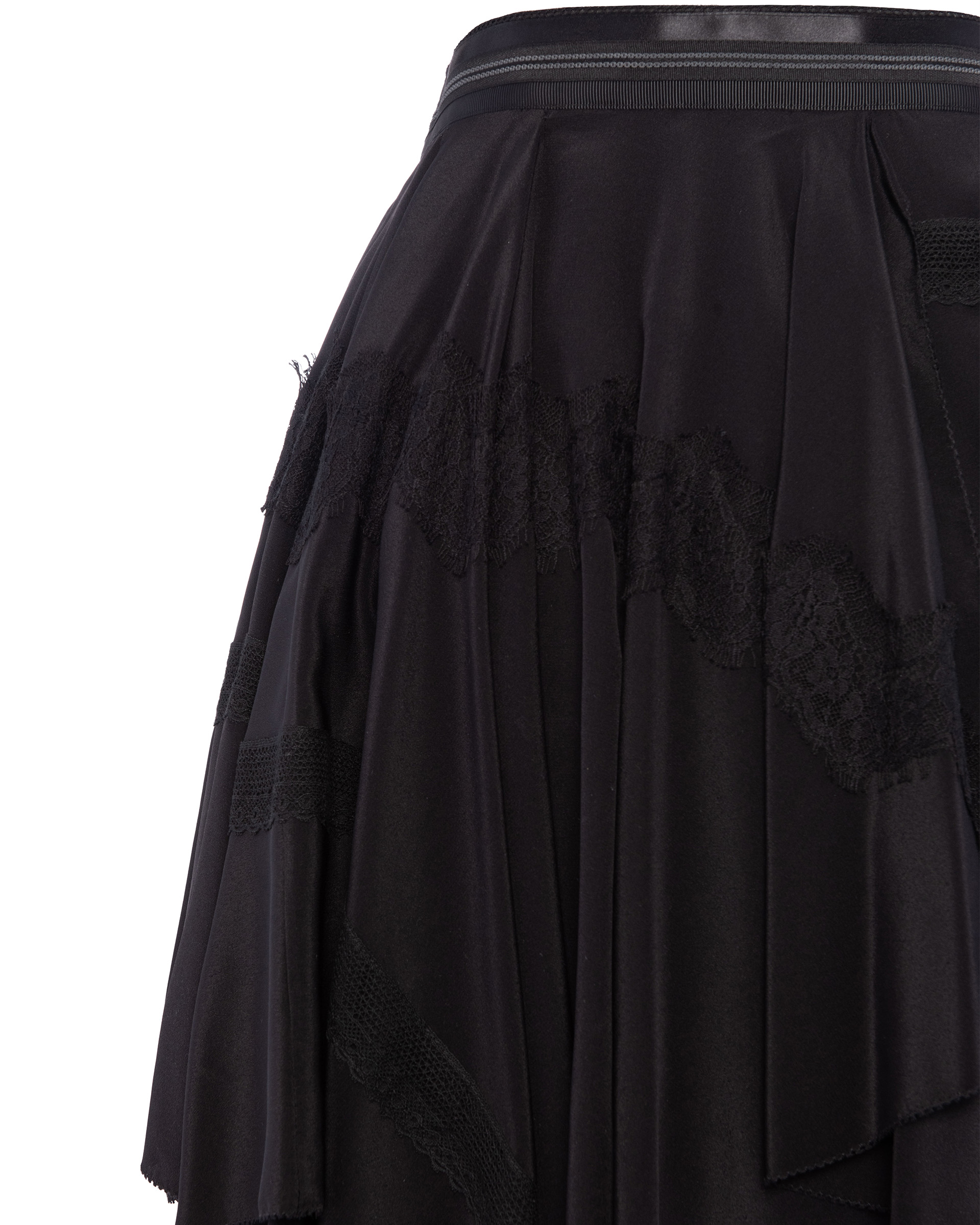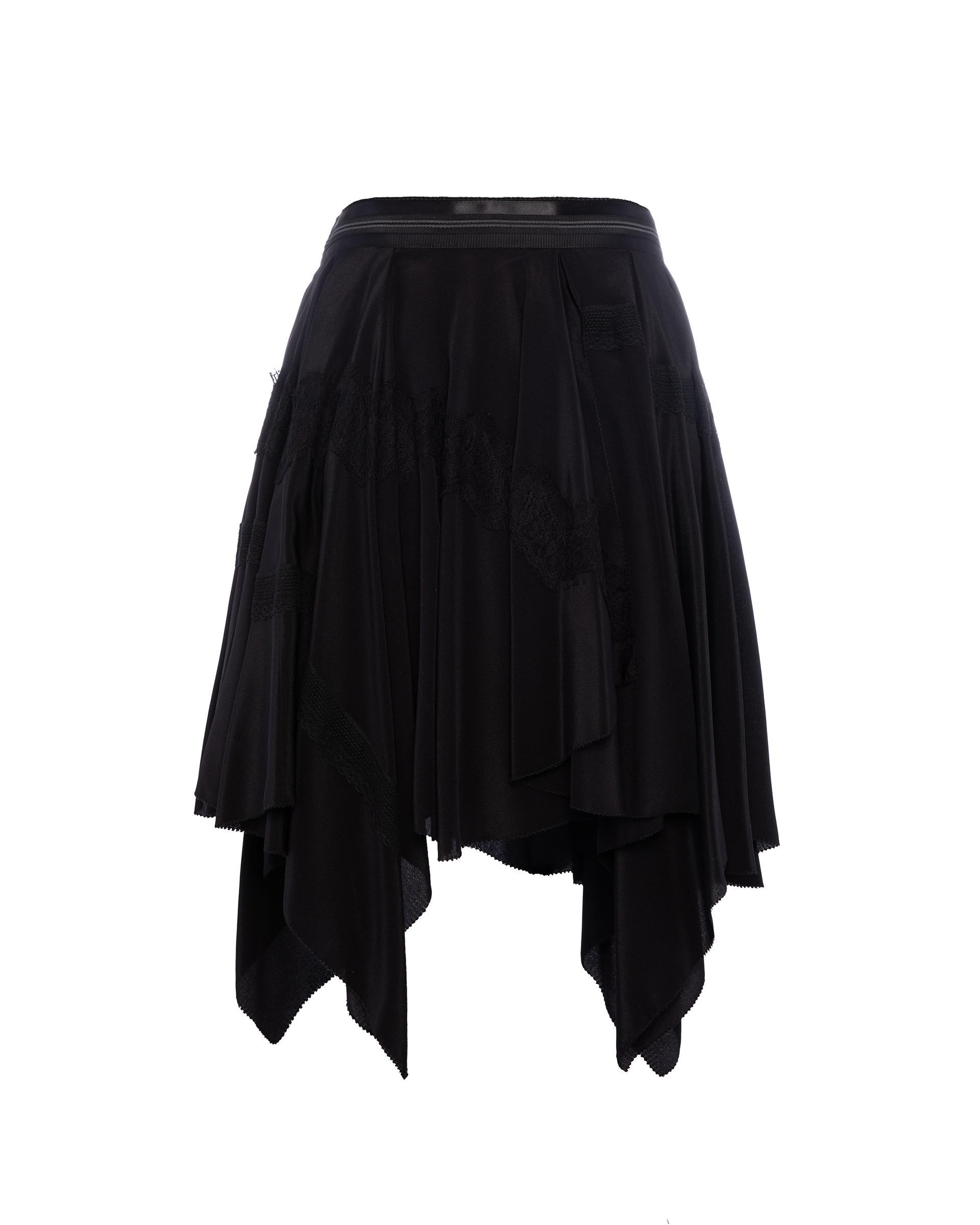 Lace ribbon outlines a bandana silhouette, with a wavy hem for a lively touch. Silk-like thick organza trim at the hem with eyelet edging for a refined, layered look.