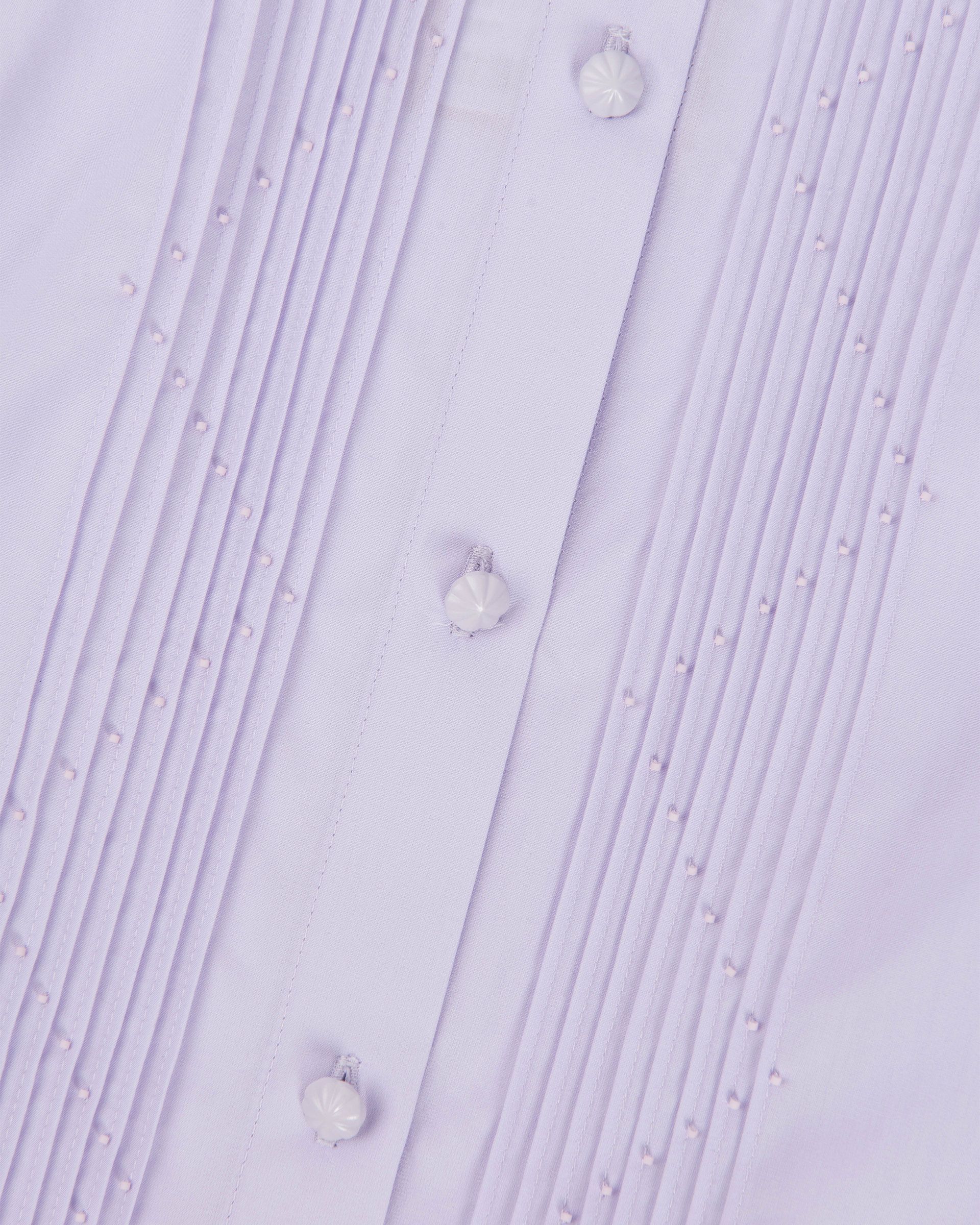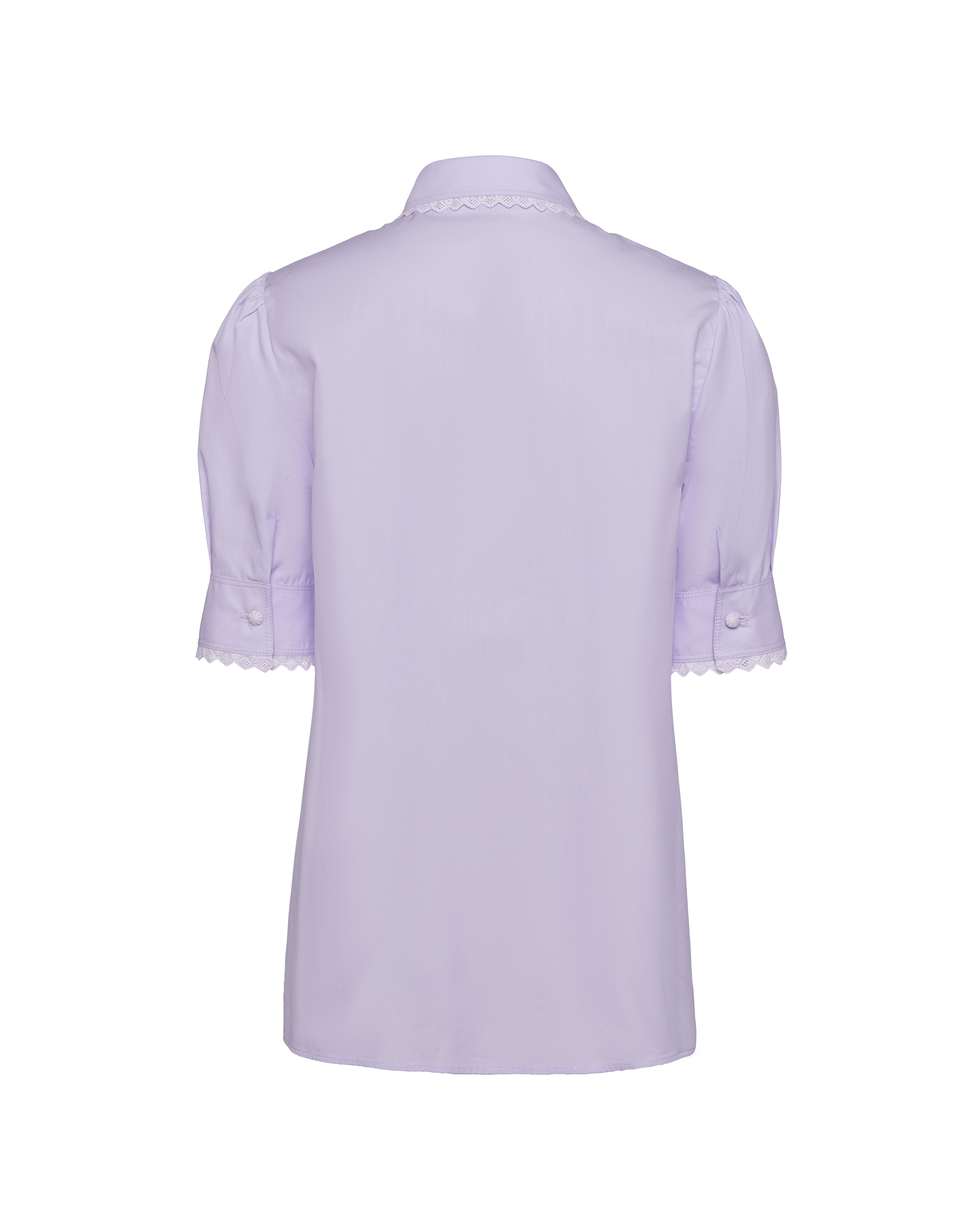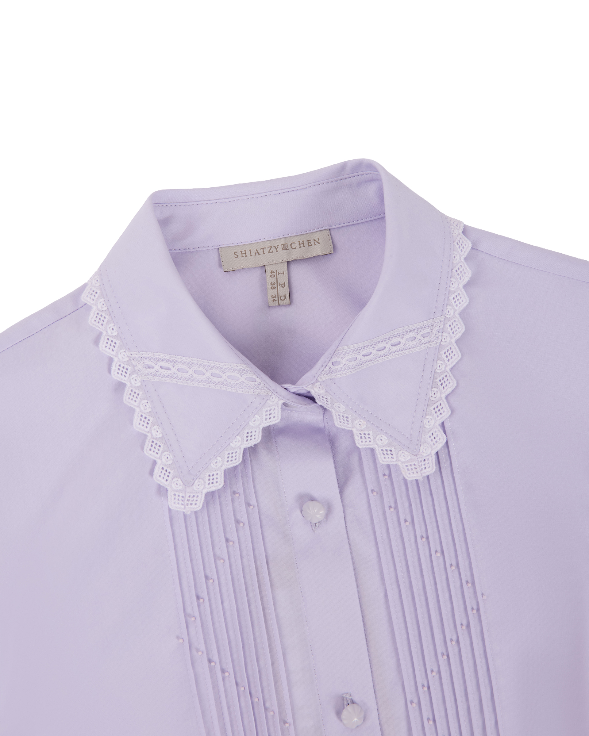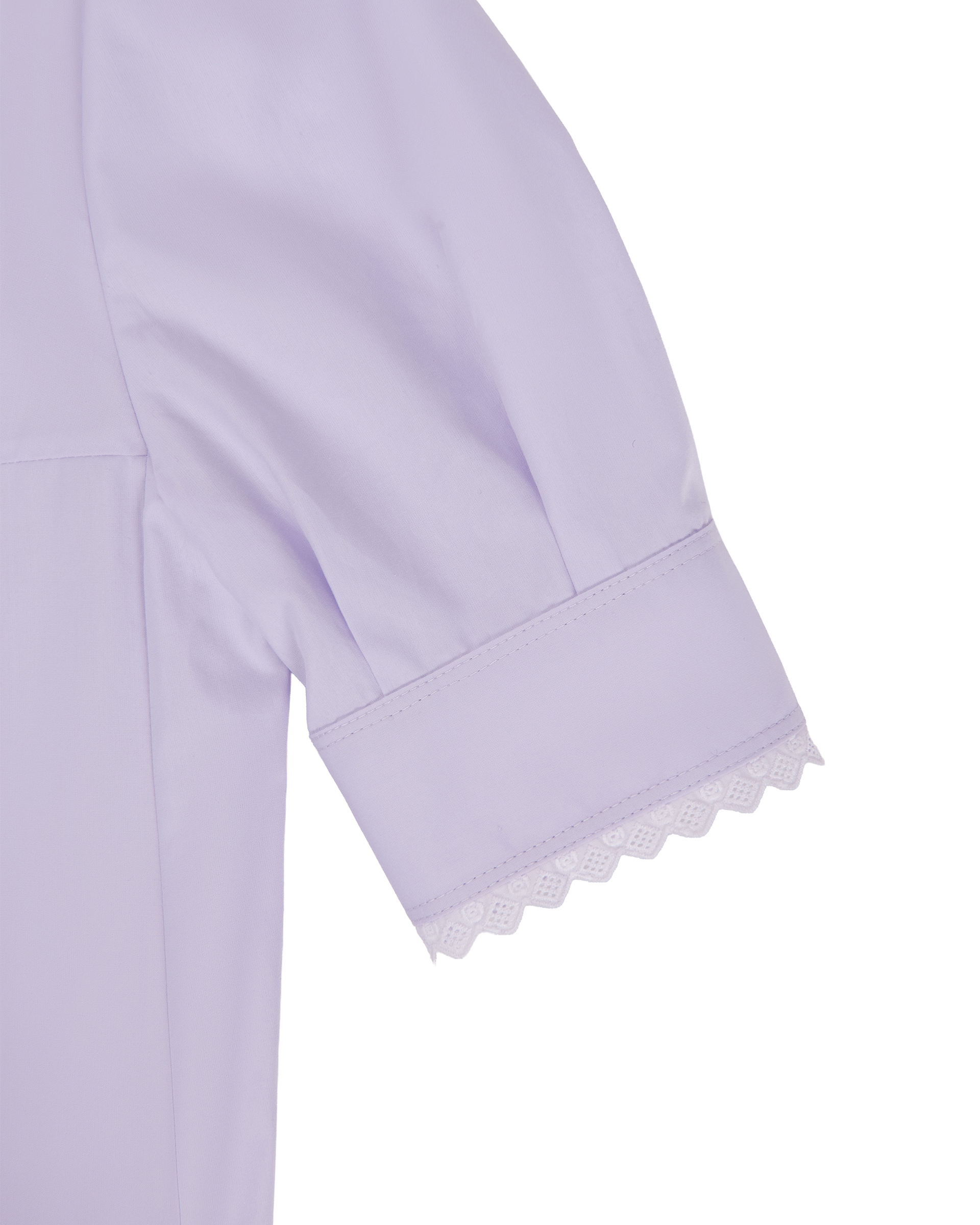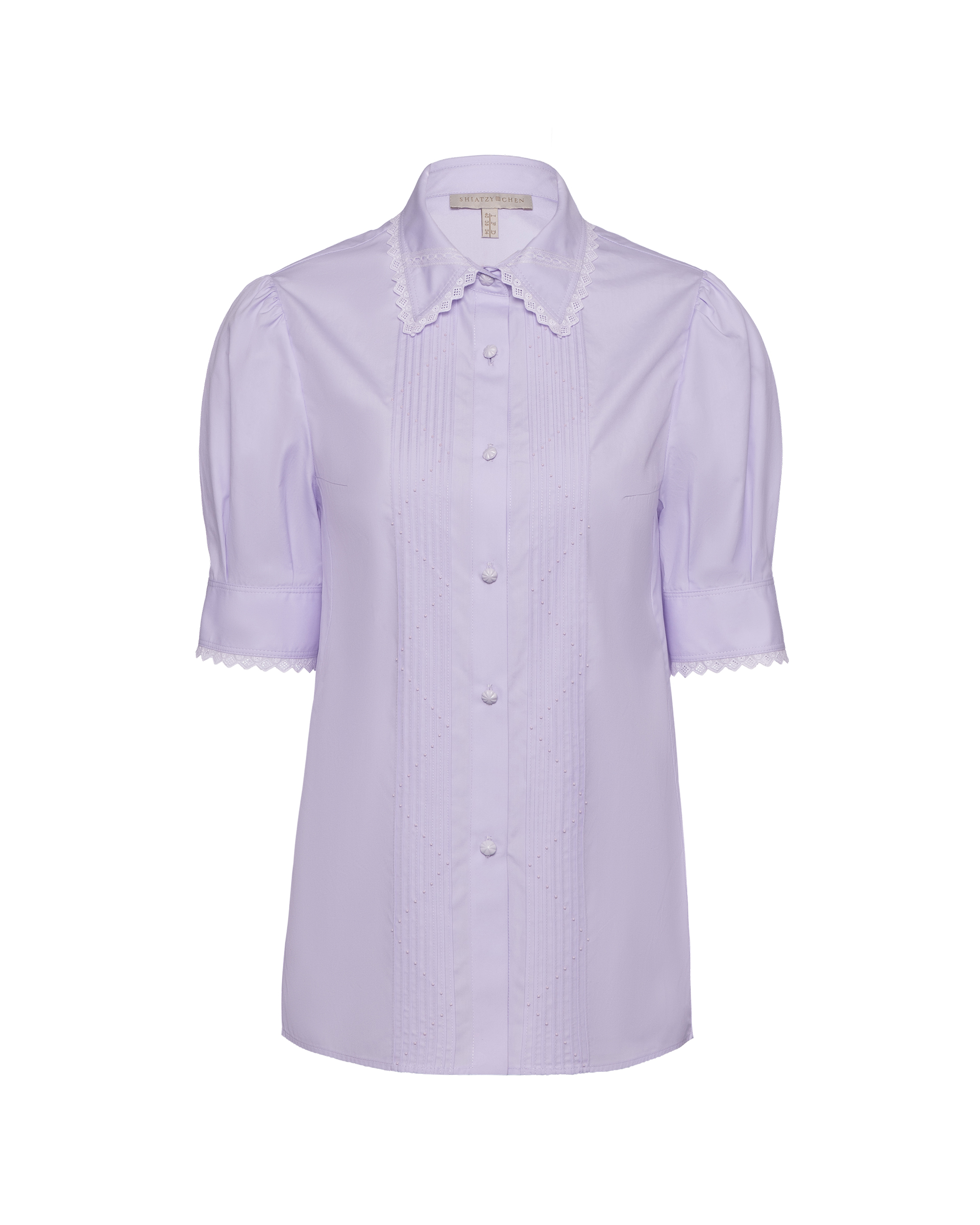 High-density cotton fabric, crisp and wrinkle-resistant. Hand-beaded geometric front with cotton lace trim. Straight fitted cut and slight puff sleeves for a slimming effect.