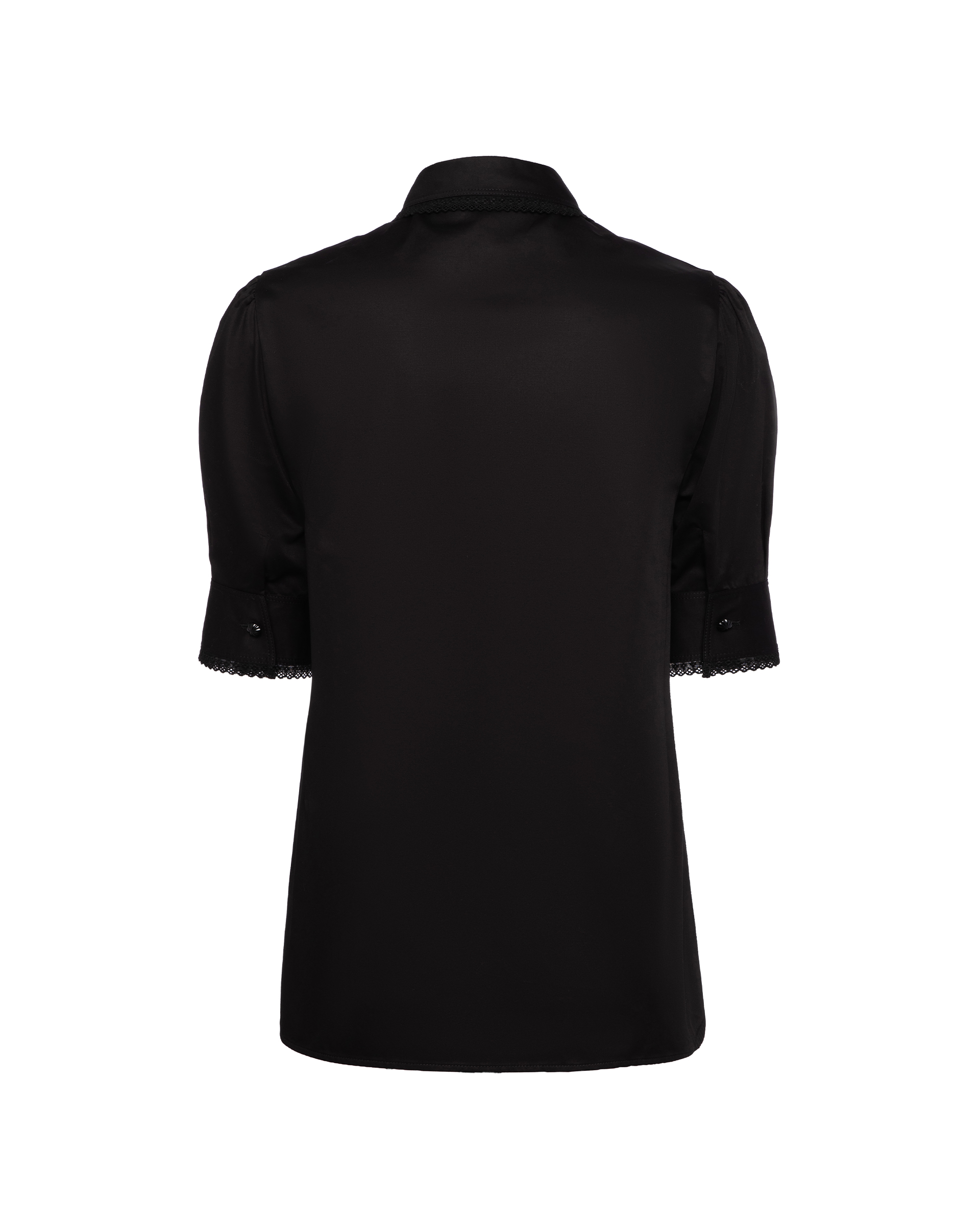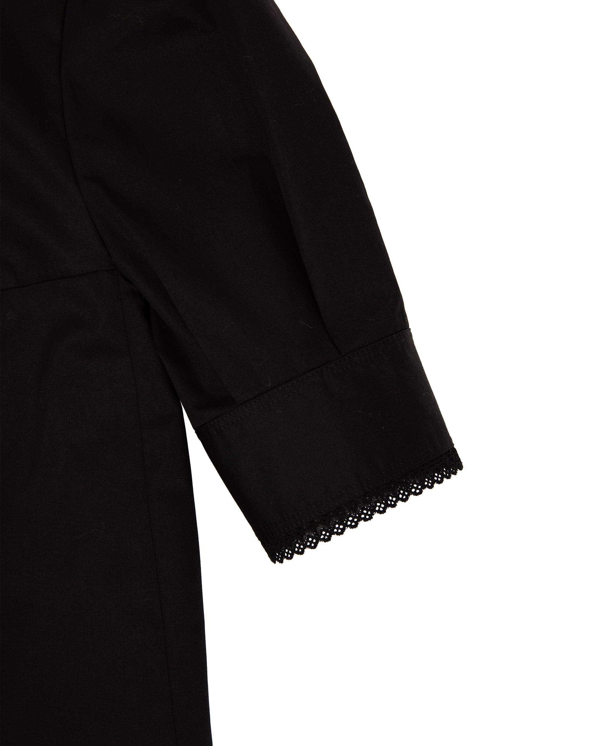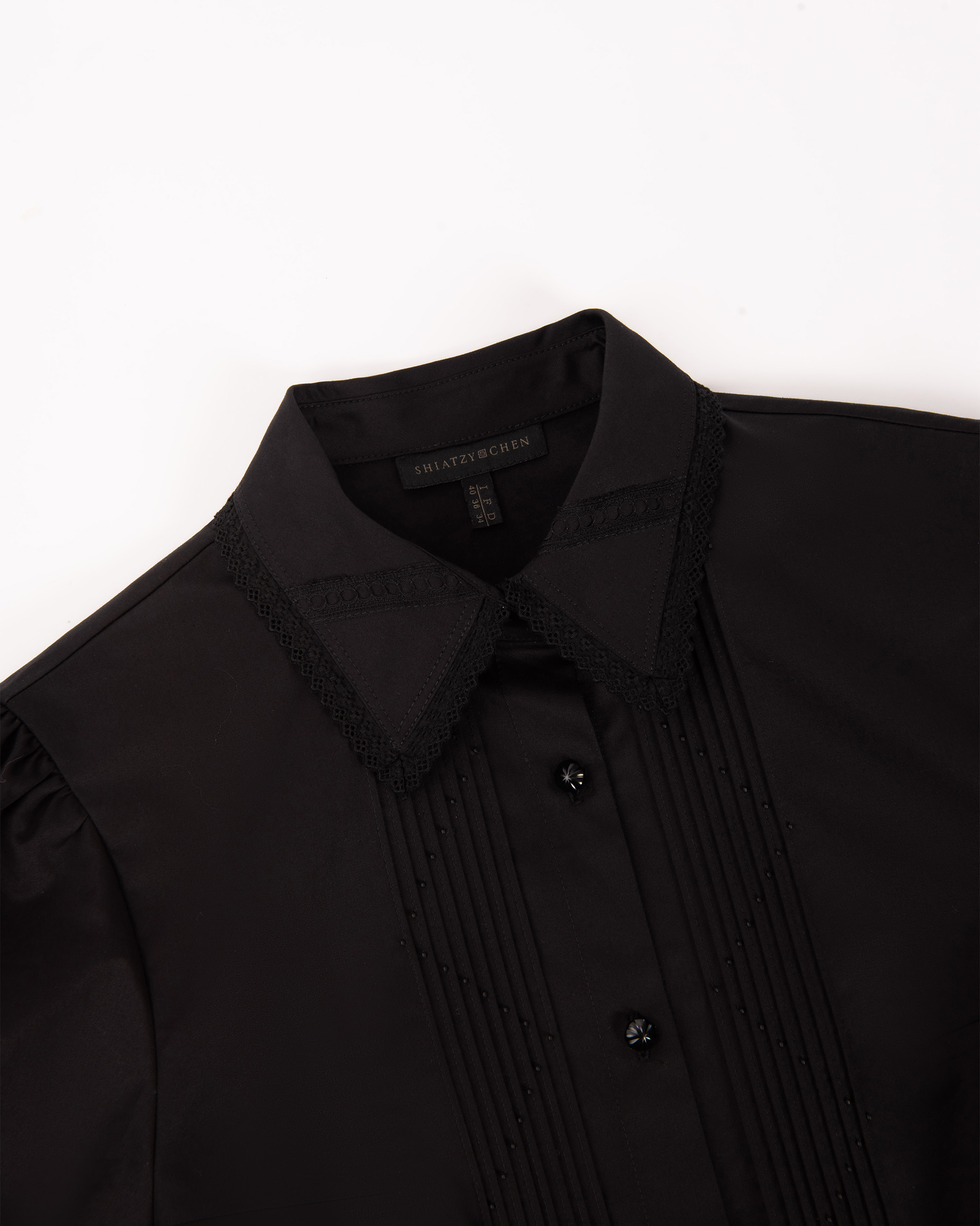 High-density cotton fabric, crisp and wrinkle-resistant. Hand-beaded geometric front with cotton lace trim. Straight fitted cut and slight puff sleeves for a slimming effect.