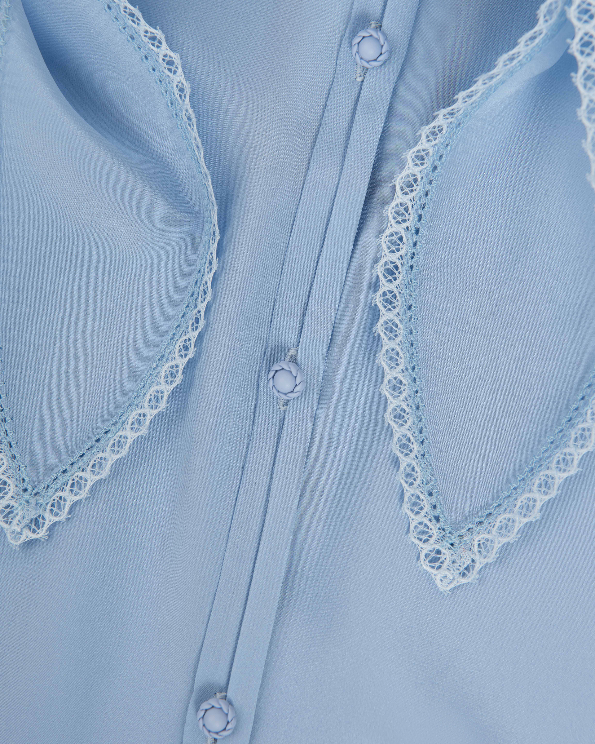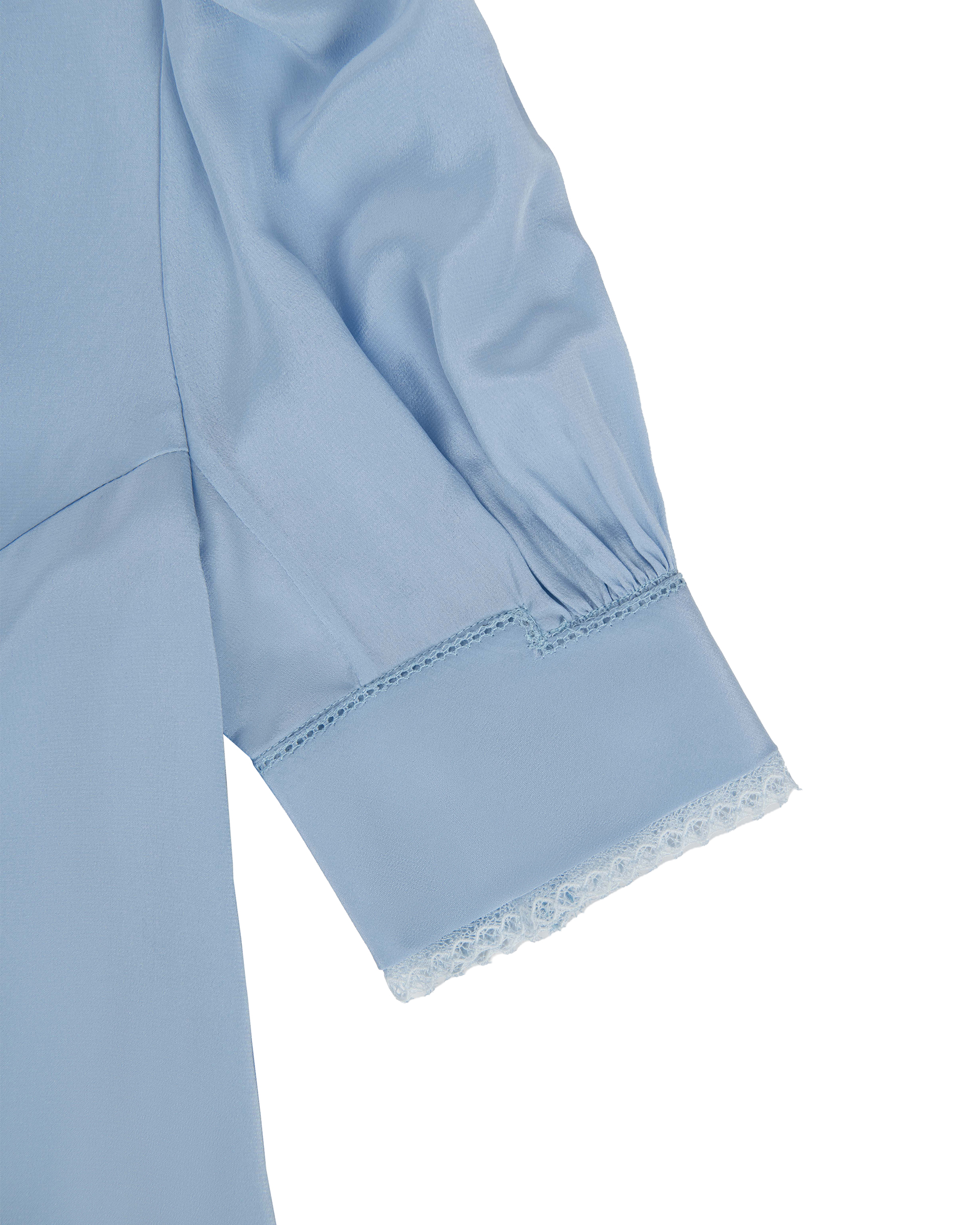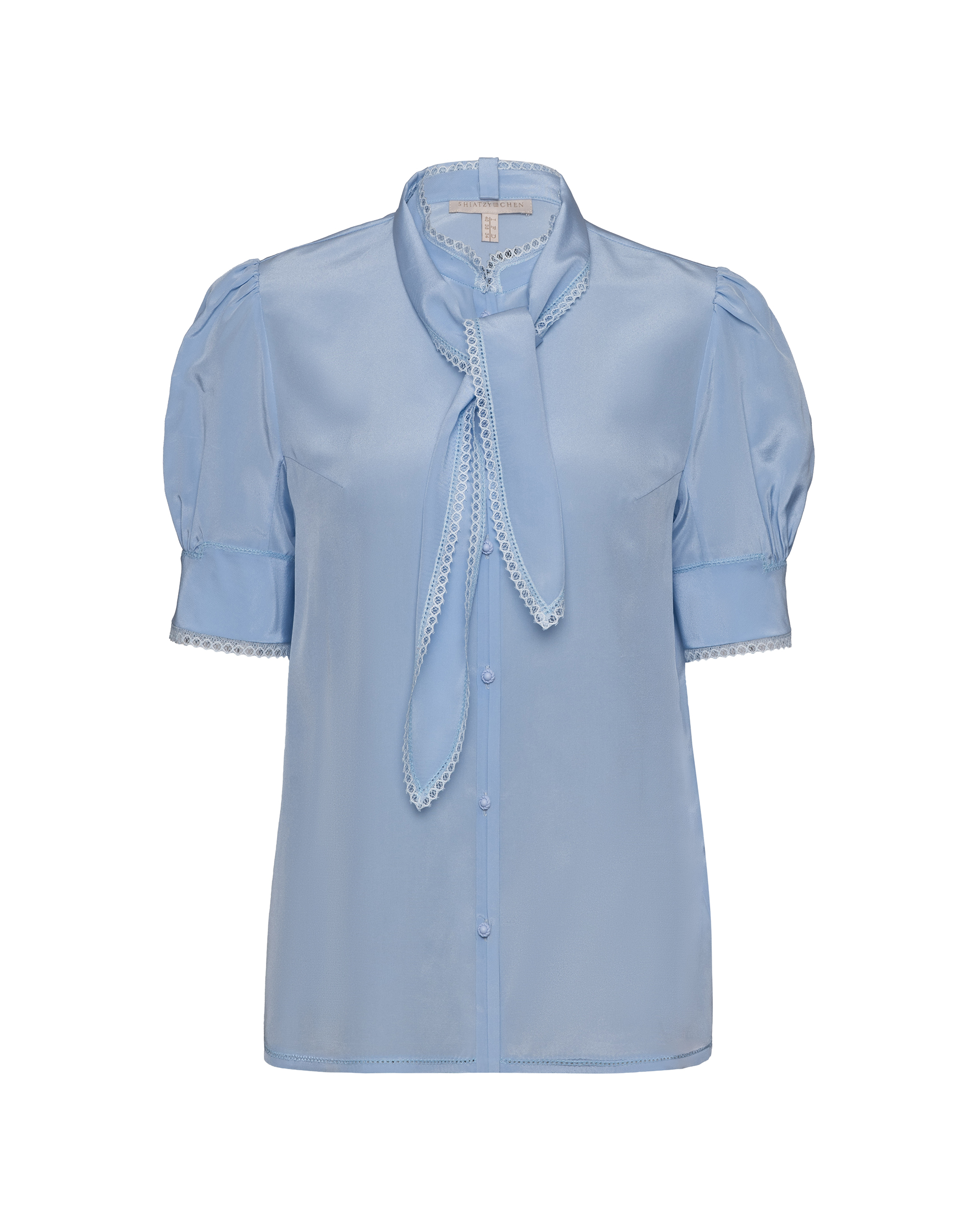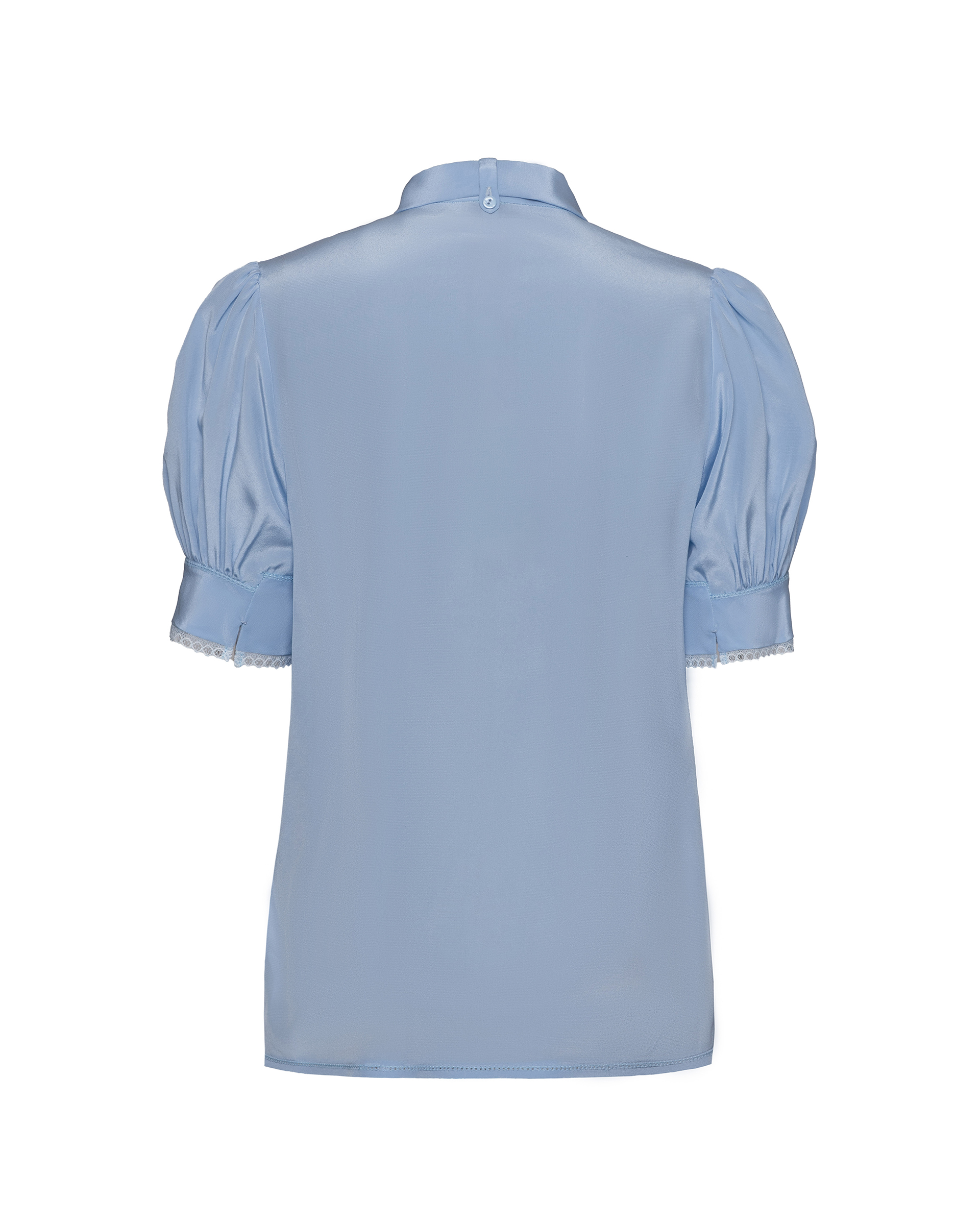 Crafted from 100% mulberry silk. Subtle puff sleeves softly define the shoulders, while cascading ties drape like a silk scarf—effortlessly blending elegance with a crisp, polished edge.