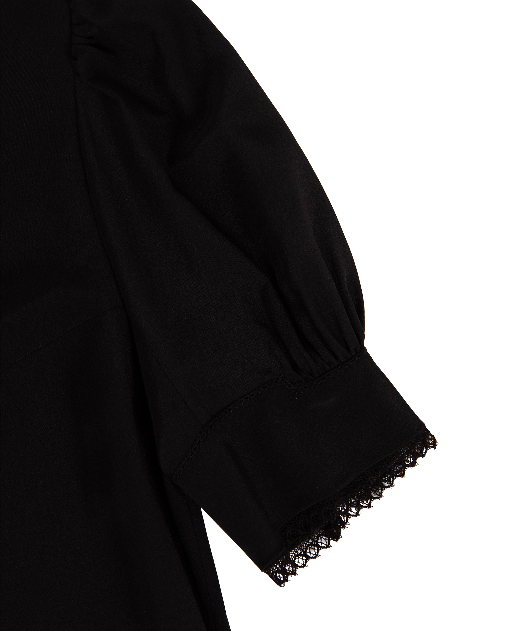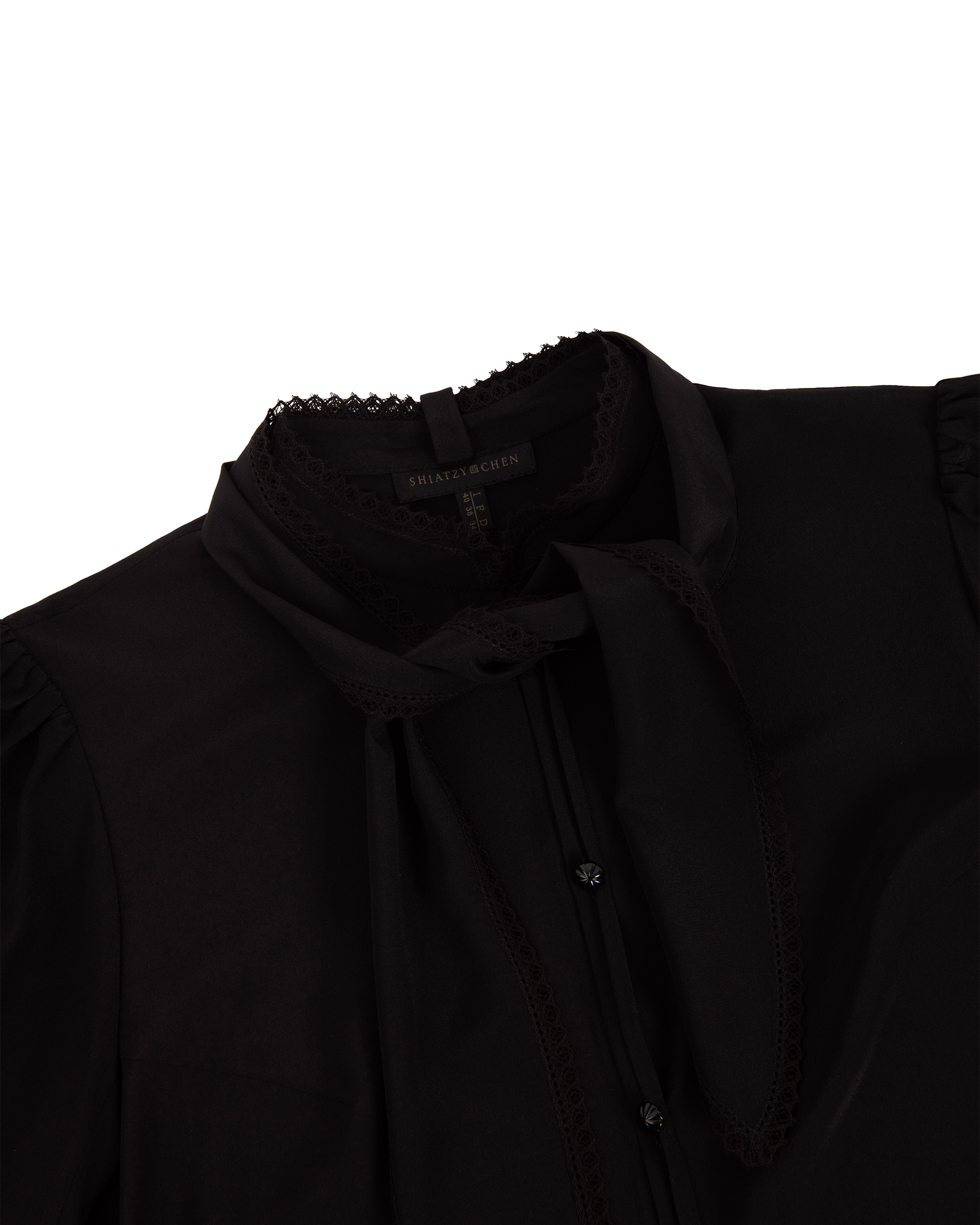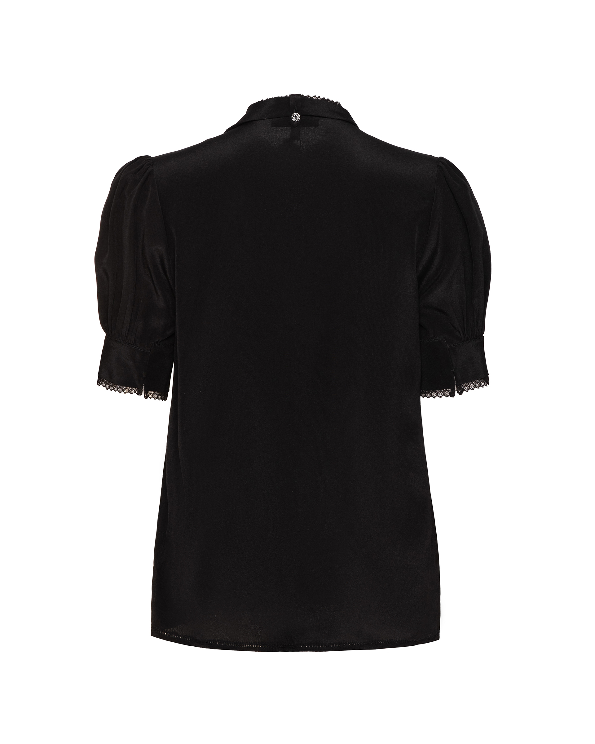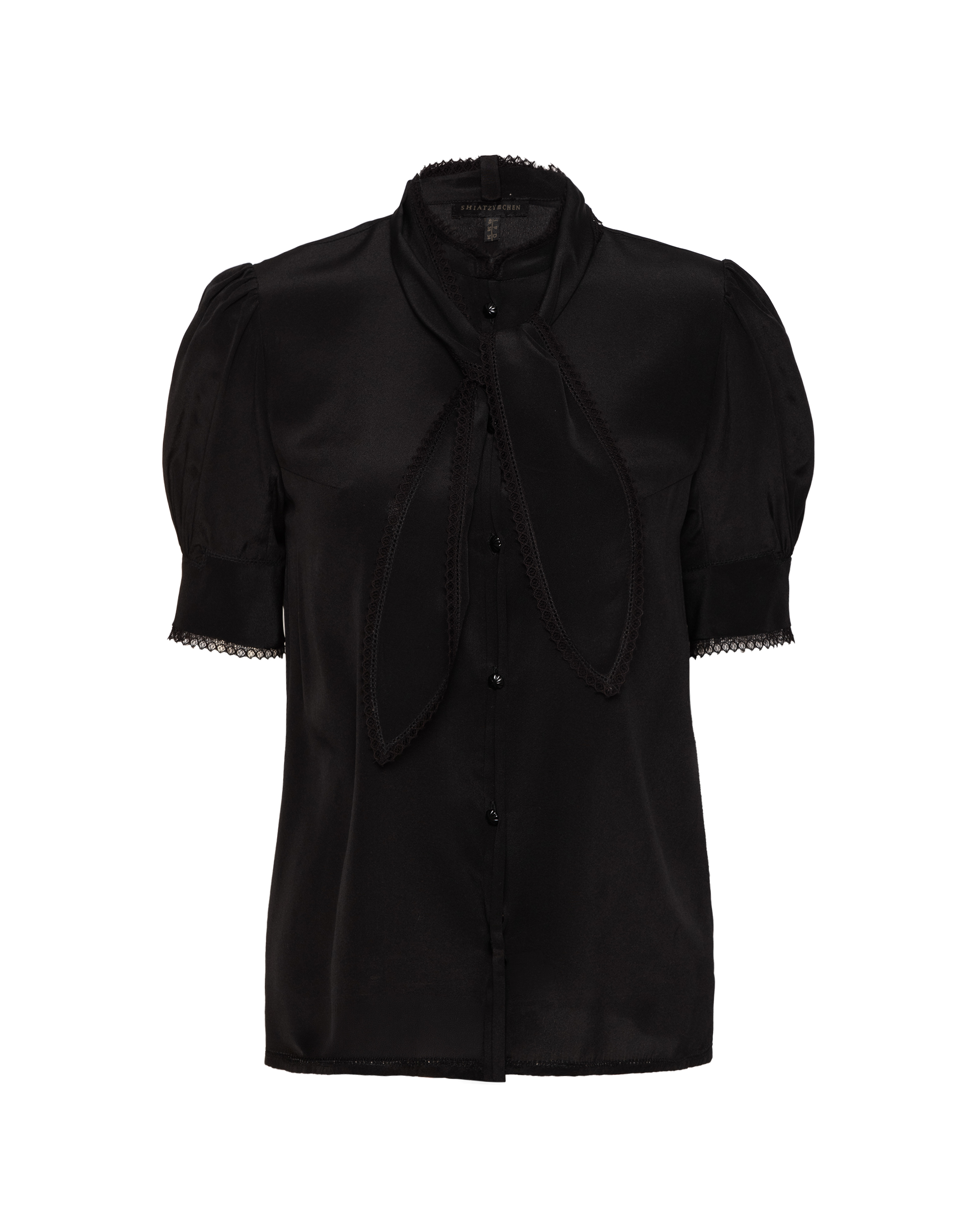 Crafted from 100% mulberry silk. Subtle puff sleeves softly define the shoulders, while cascading ties drape like a silk scarf—effortlessly blending elegance with a crisp, polished edge.