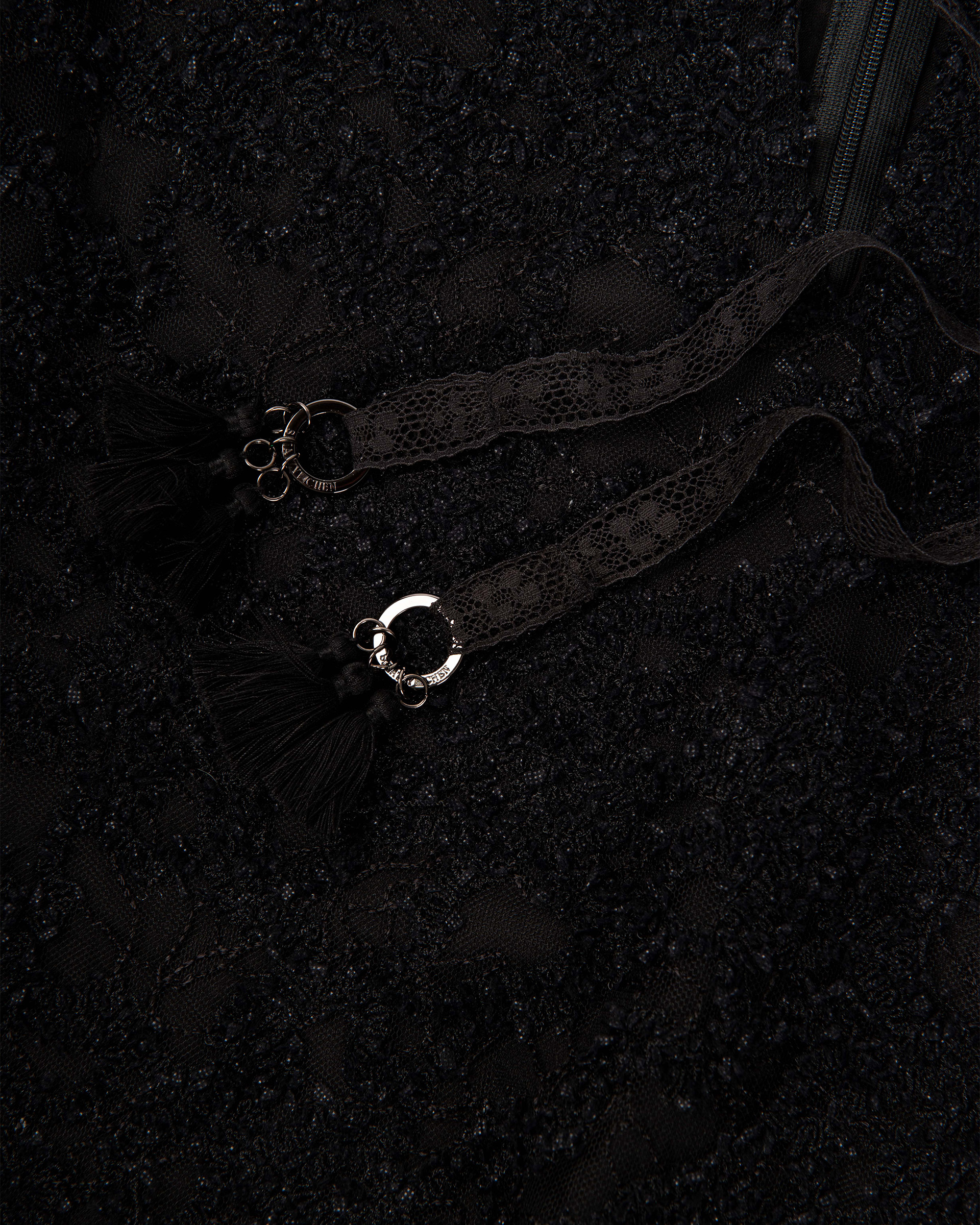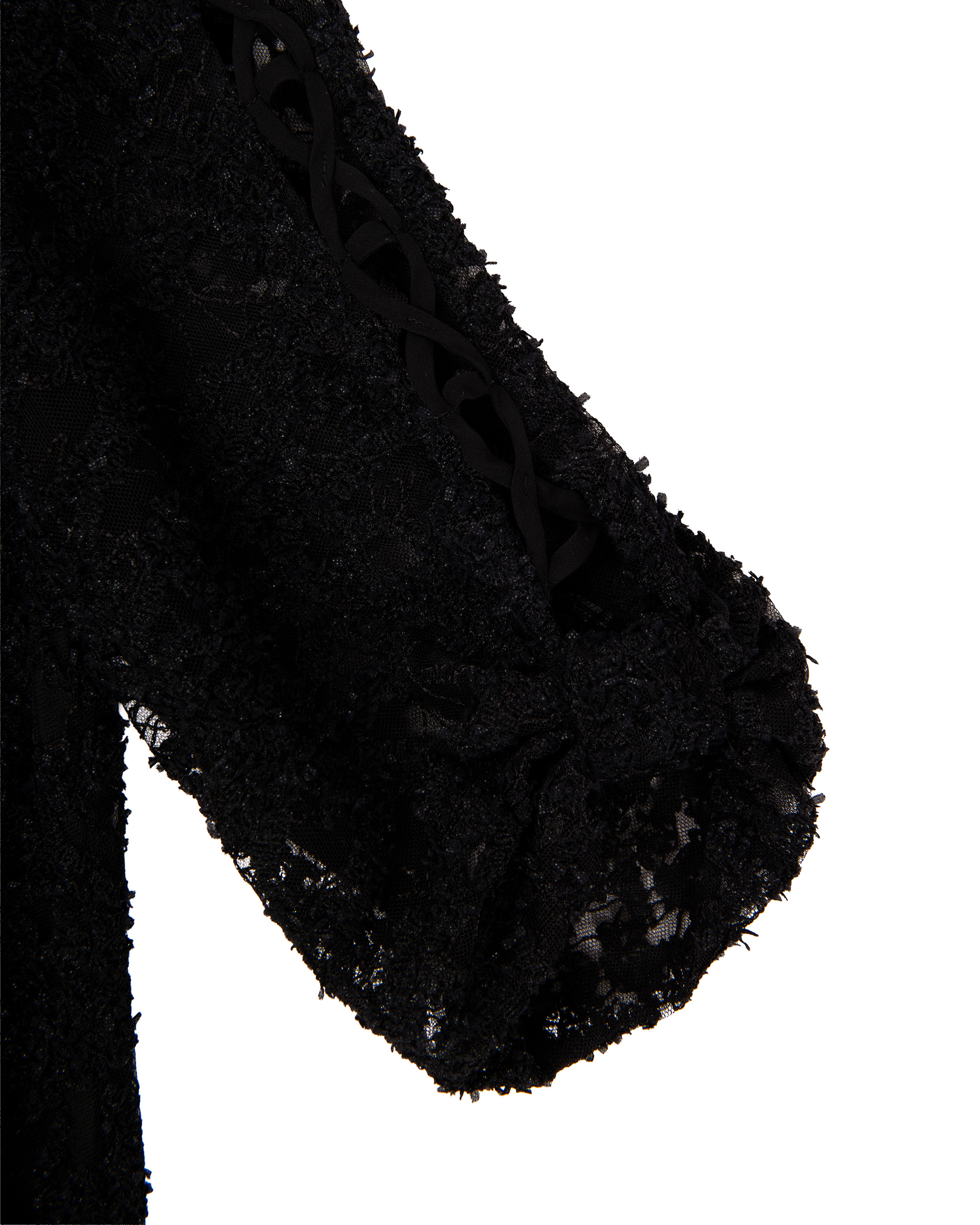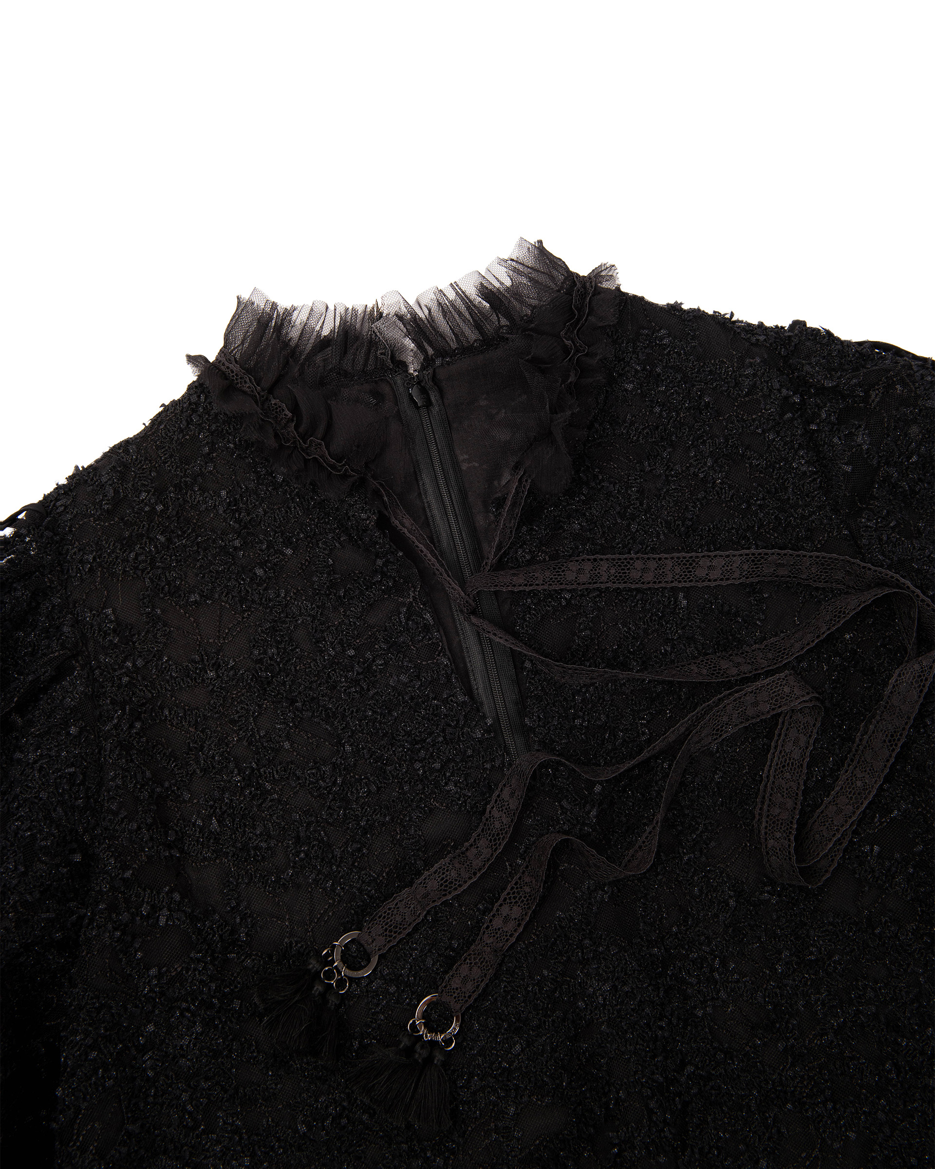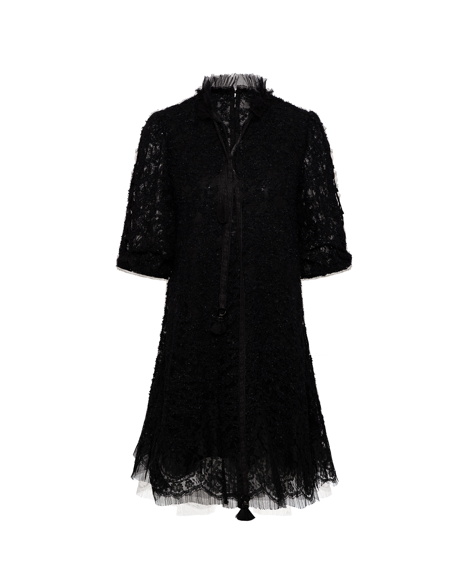 Crafted from textured lace jacquard, this piece features crisscross cutout weaving at the side sleeves for a sheer, dreamy look. Long tassel ties and lace-edged detailing sway gently with every step.