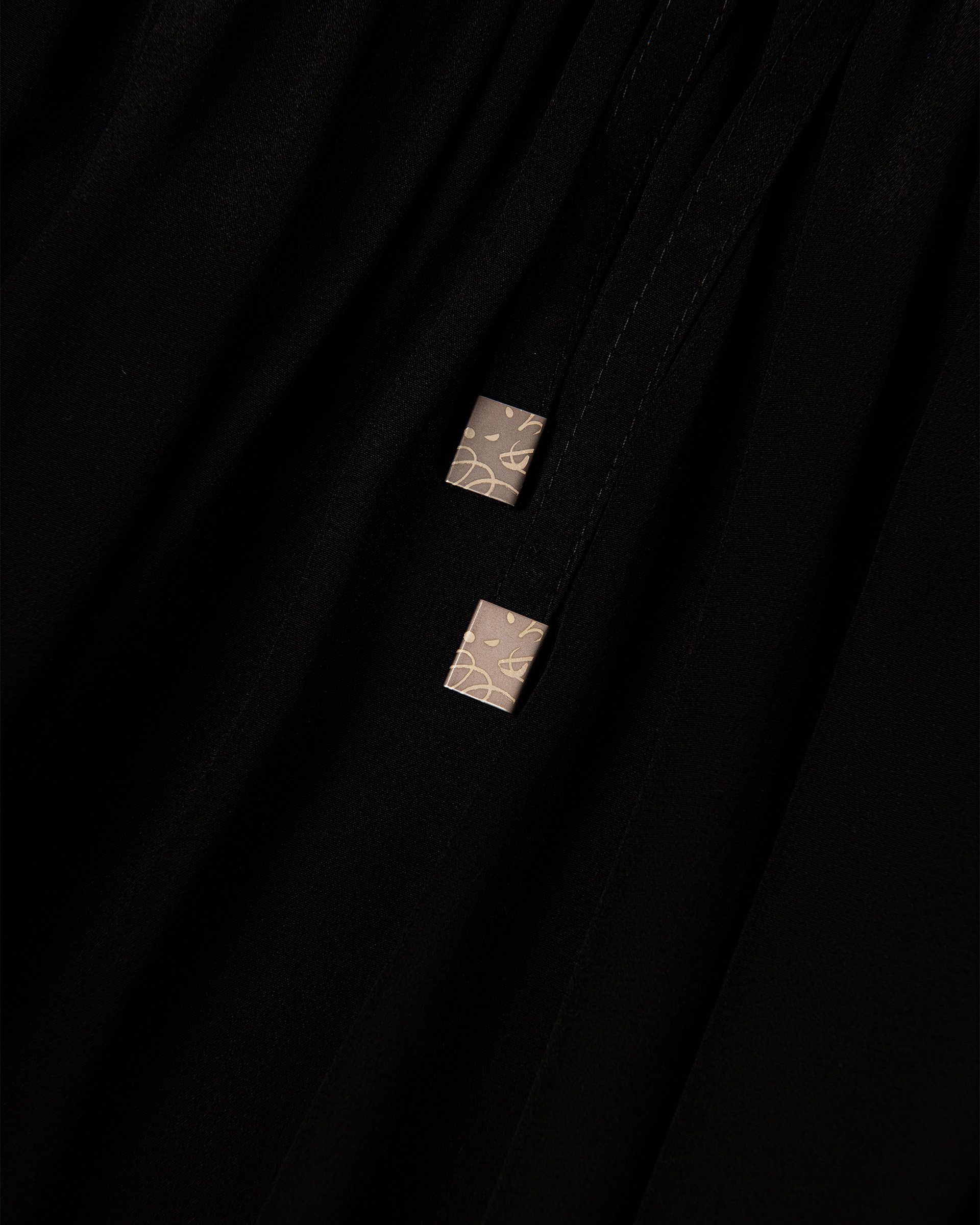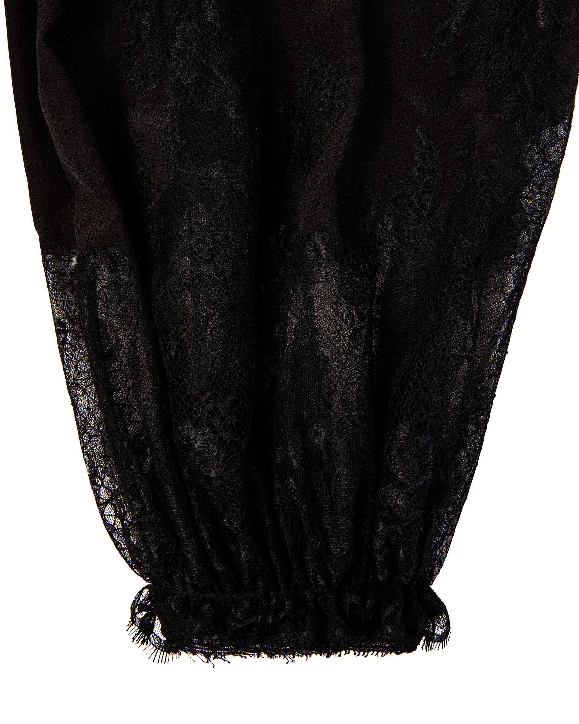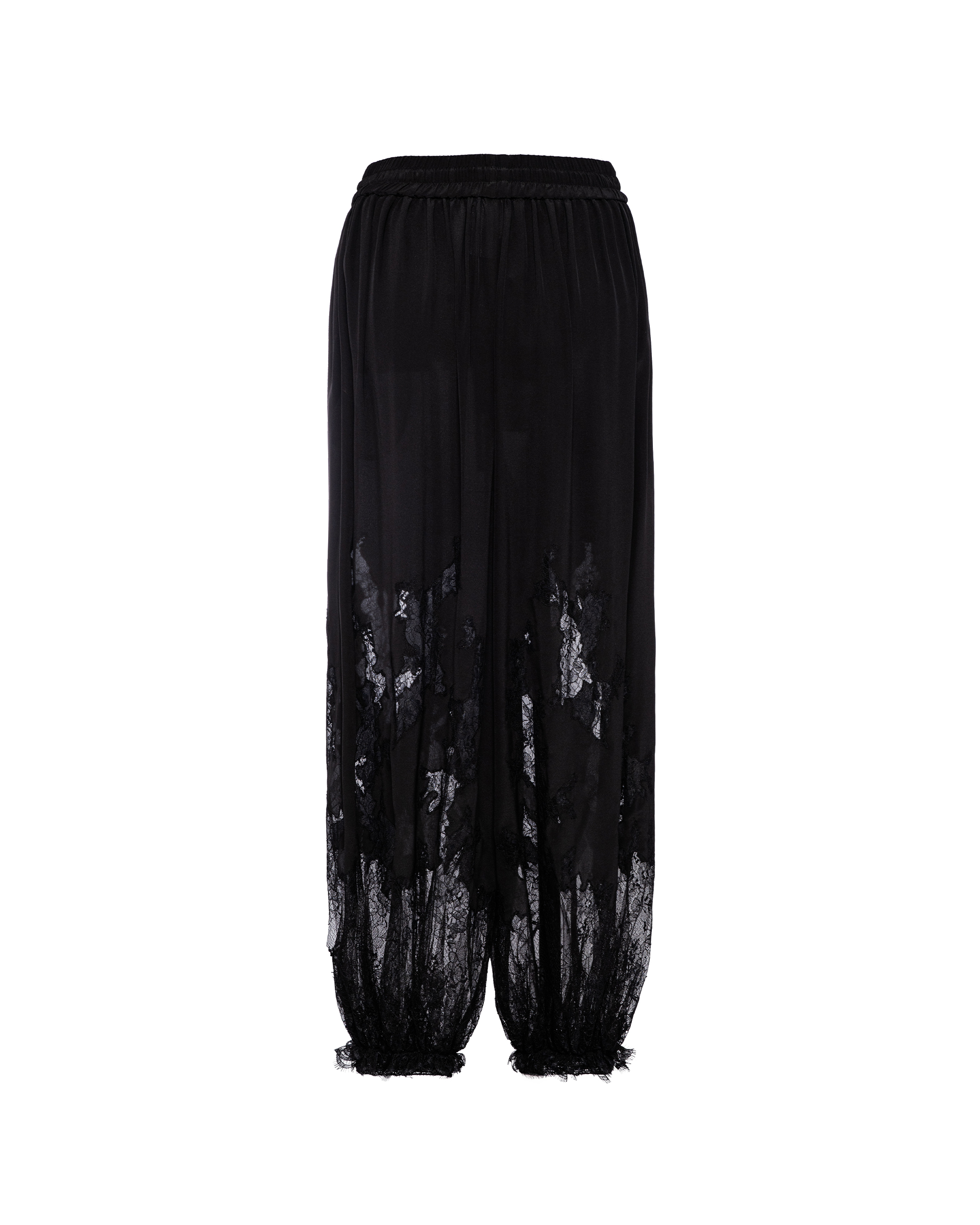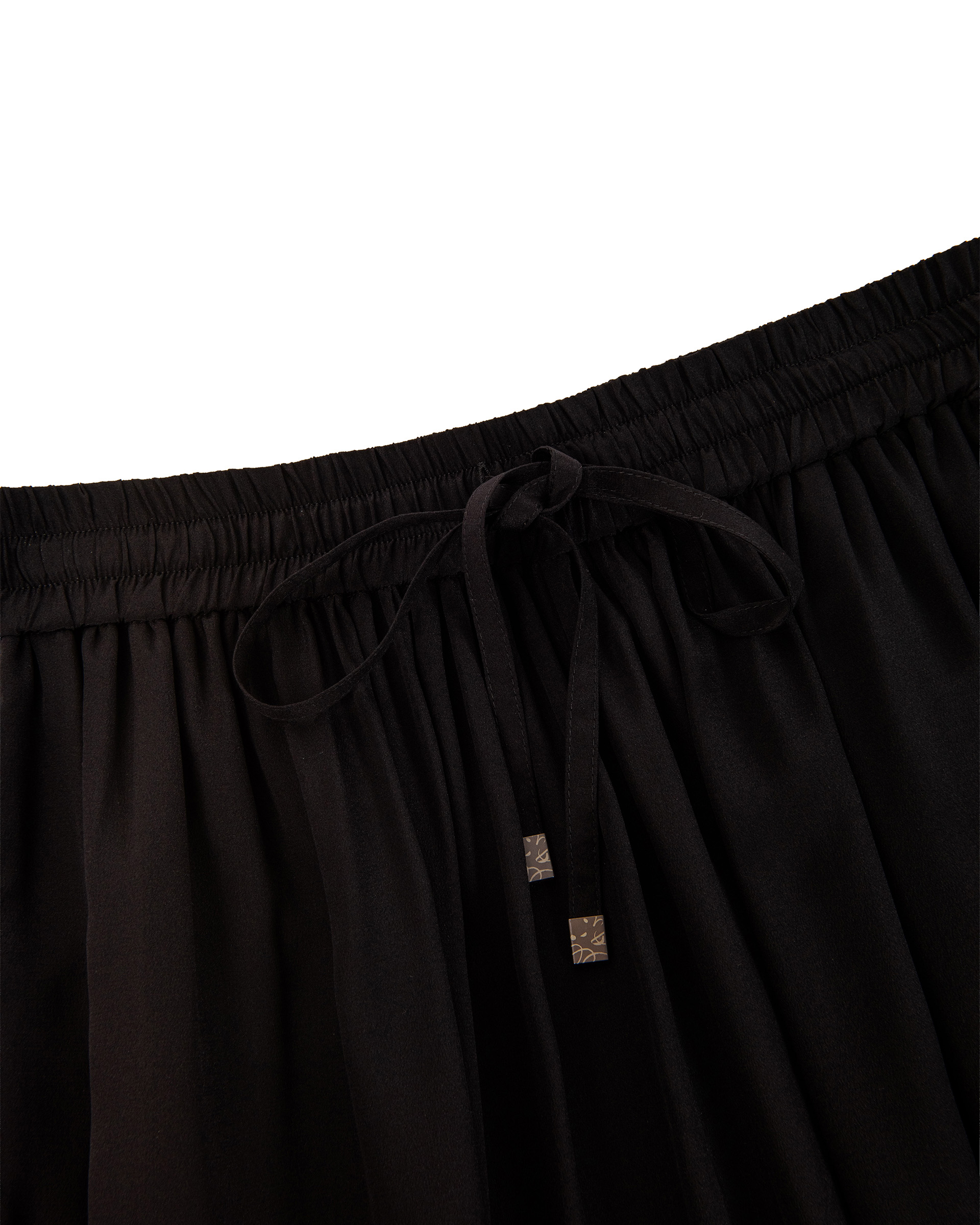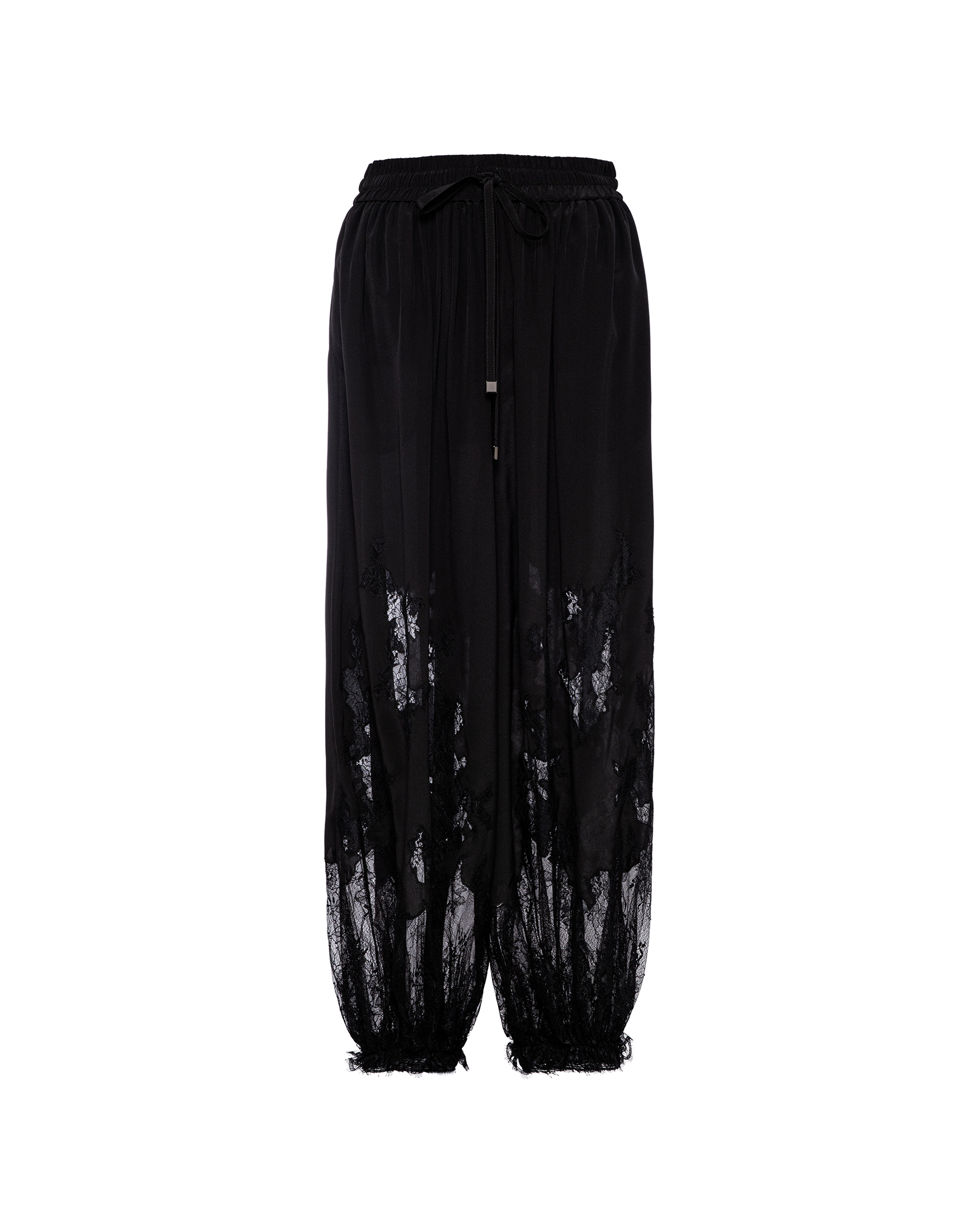 This piece features an elastic drawstring waist, with silk chiffon panels paired with irregular lace for a layered look.