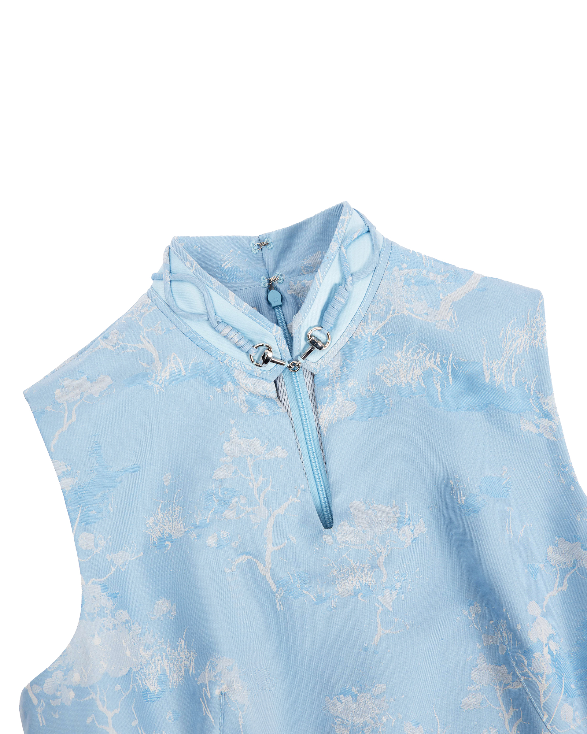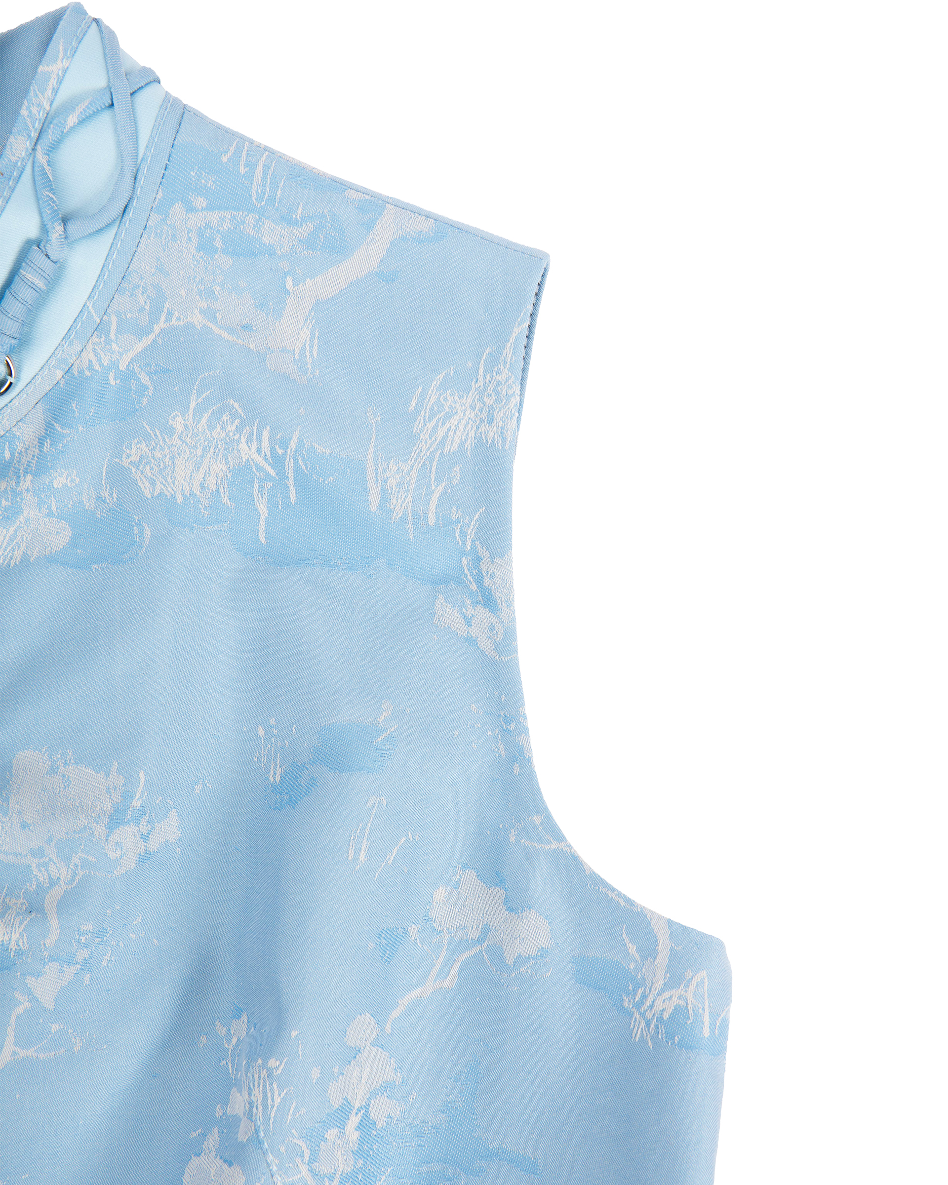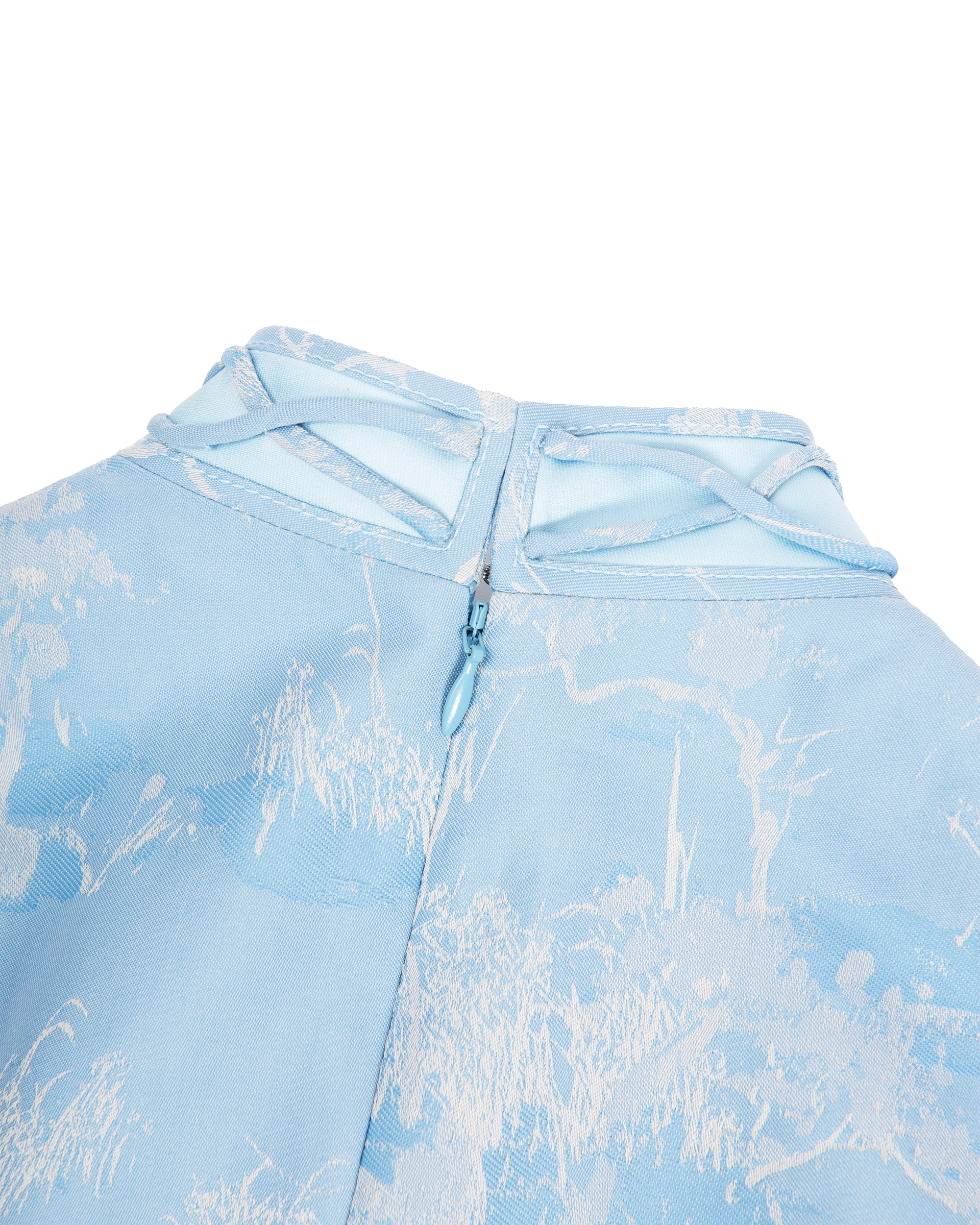 This piece is crafted from seasonal bespoke jacquard fabric, featuring hand-painted ink-wash floral motifs. Tailored with a fitted waist to contour the figure, with side slits for effortless comfort.