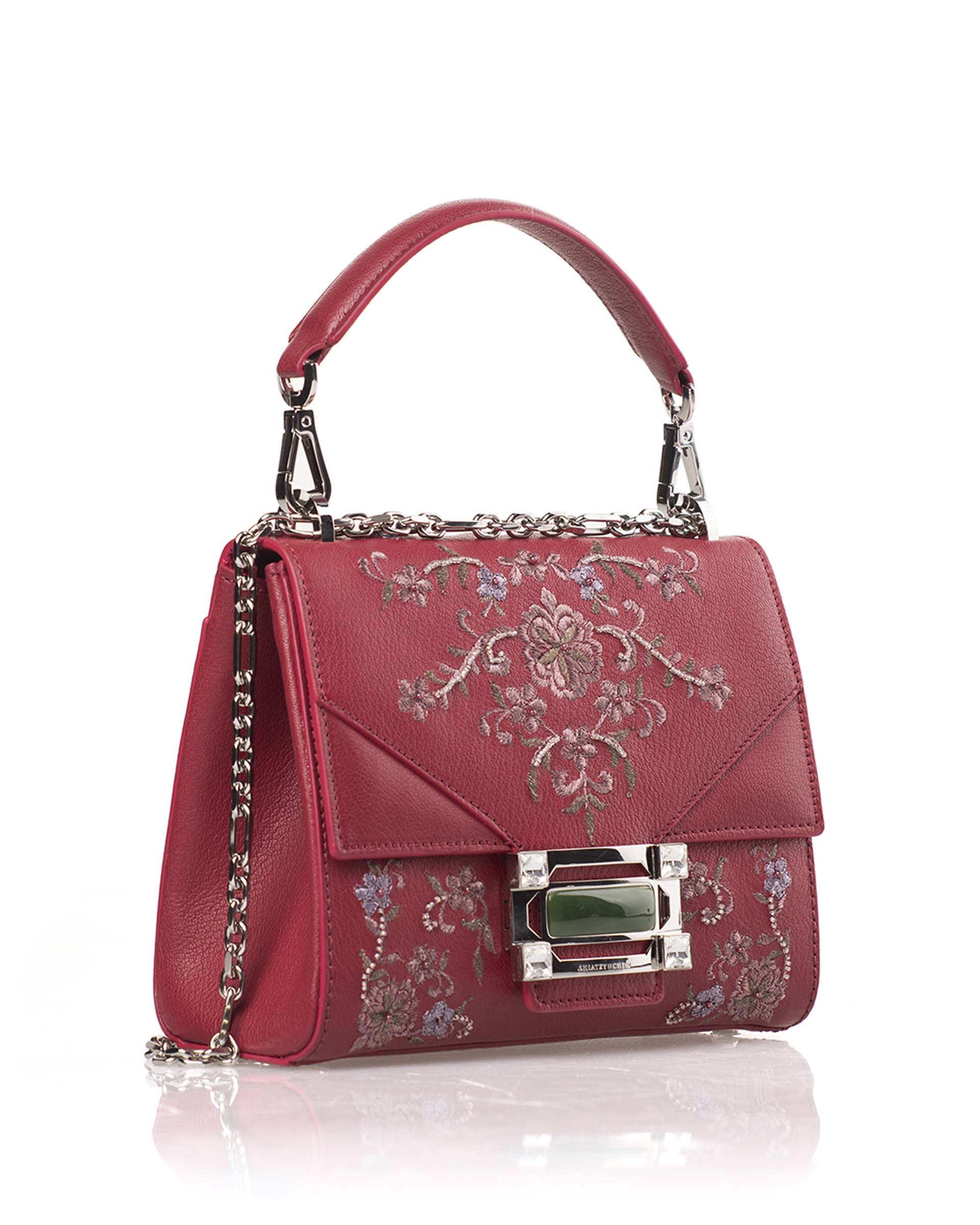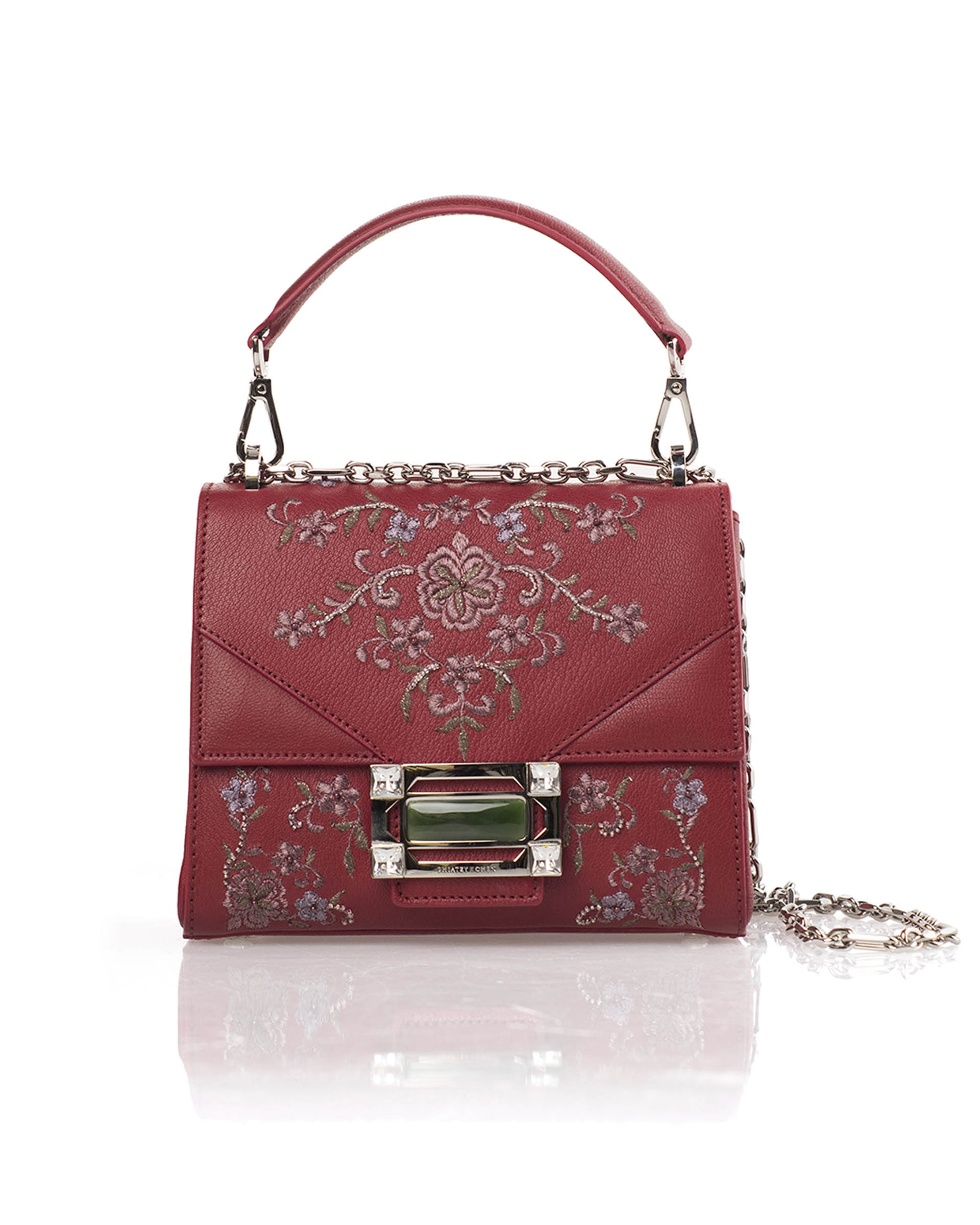 This piece comes from the Oriental Beauty Collection. Clasp ornament inlaid with quartz crystal and classic jade, fine embroidery on leather surface with chain strap and detachable handle. Goatskin enhancesthe sense of luxury and elegance.