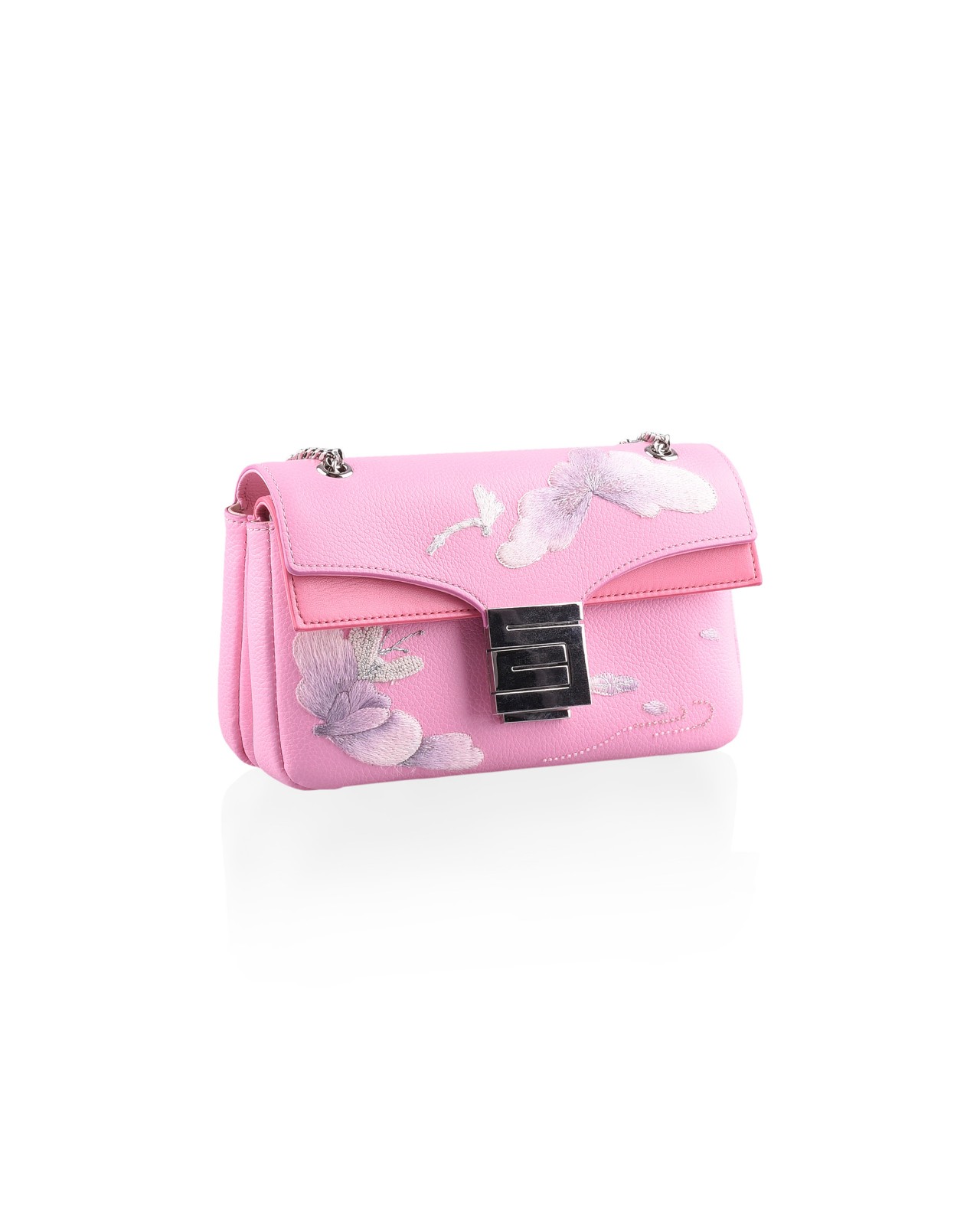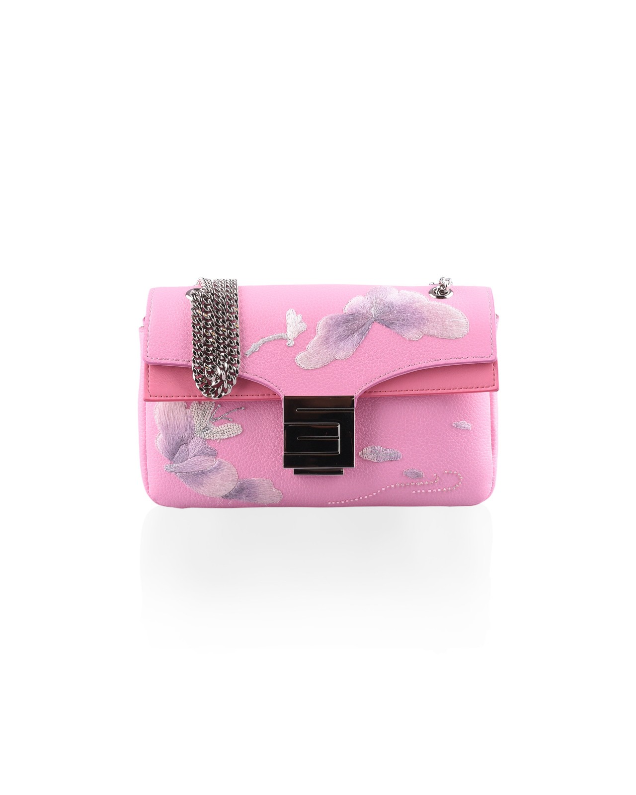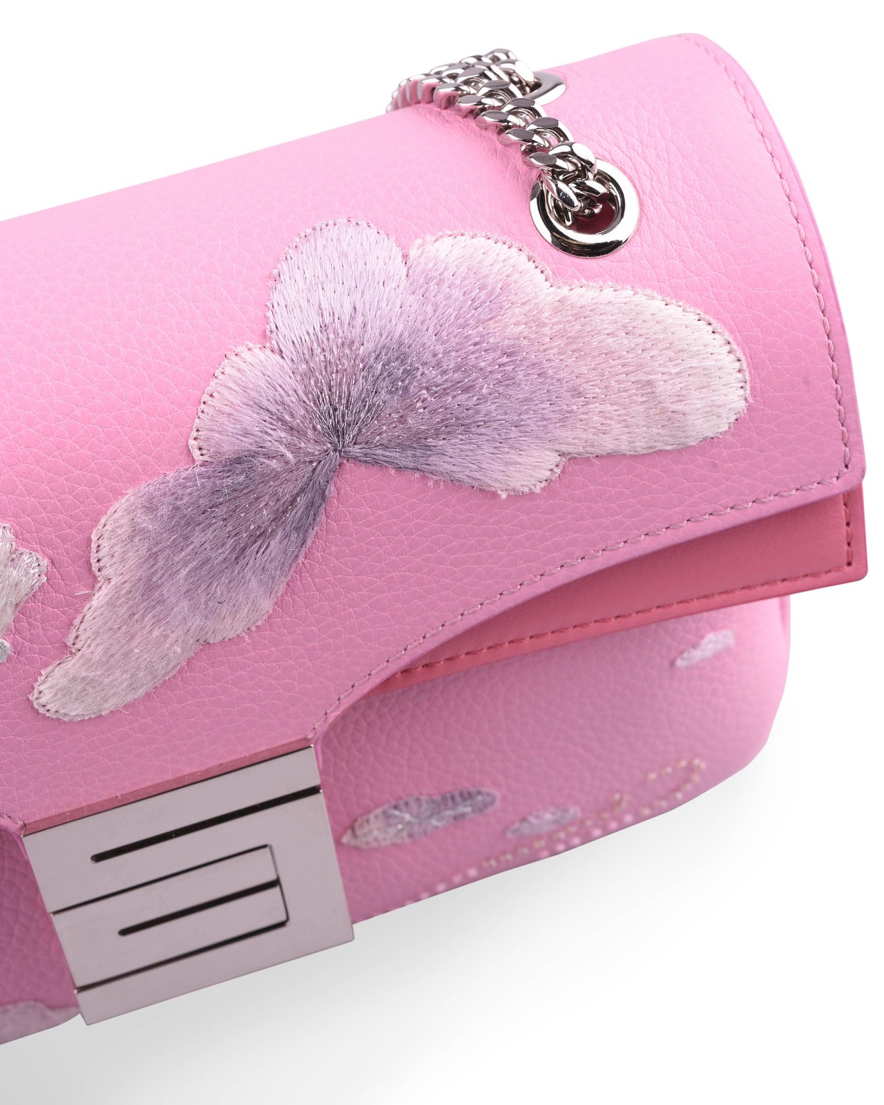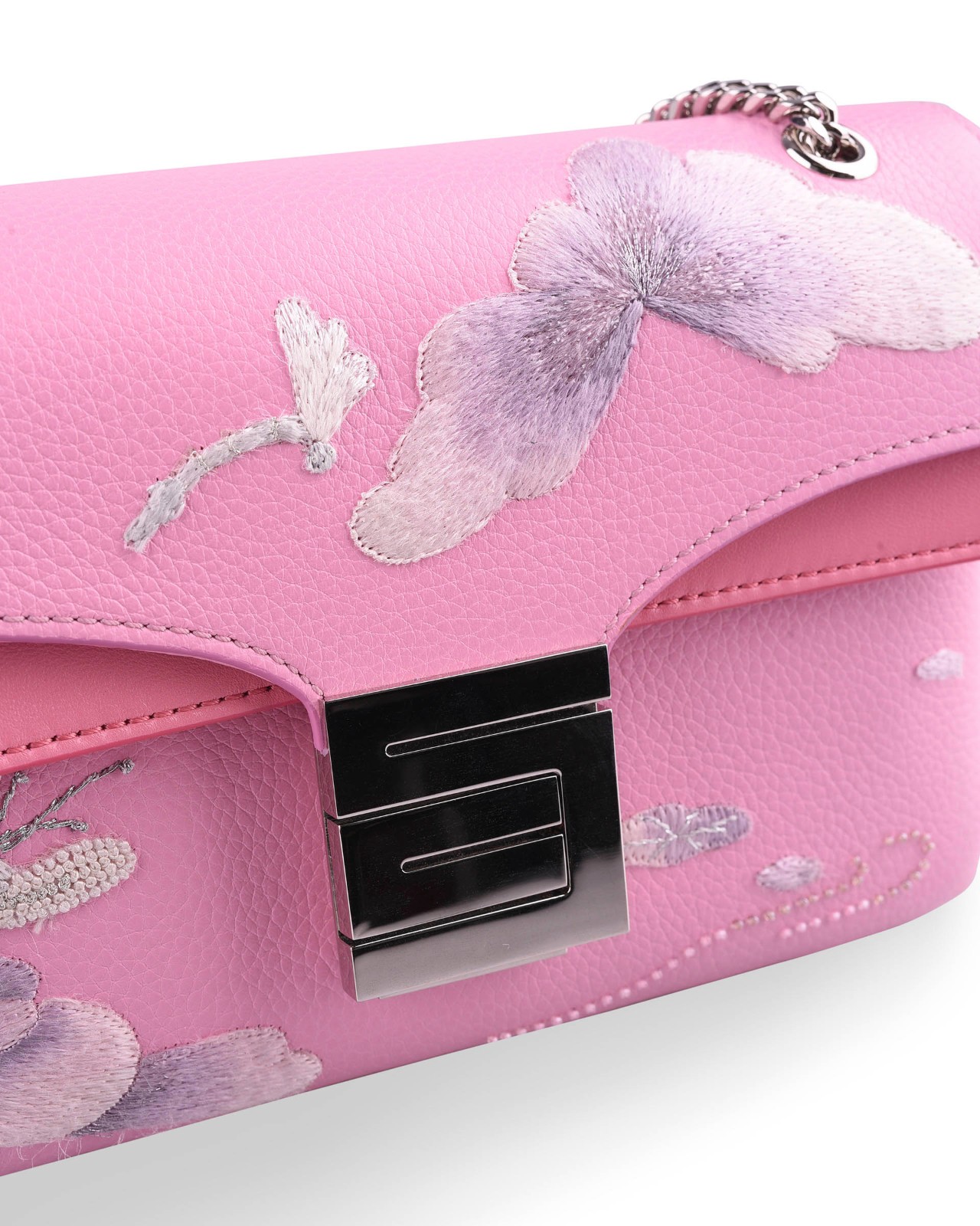 This shoulder bag is updated for new season with embroidery inspiration from lotus pond, making the design more classic. The bag is offset with an iconic 'SC' buckle in silver, plus matching chain straps that double-up for a shorter drop.