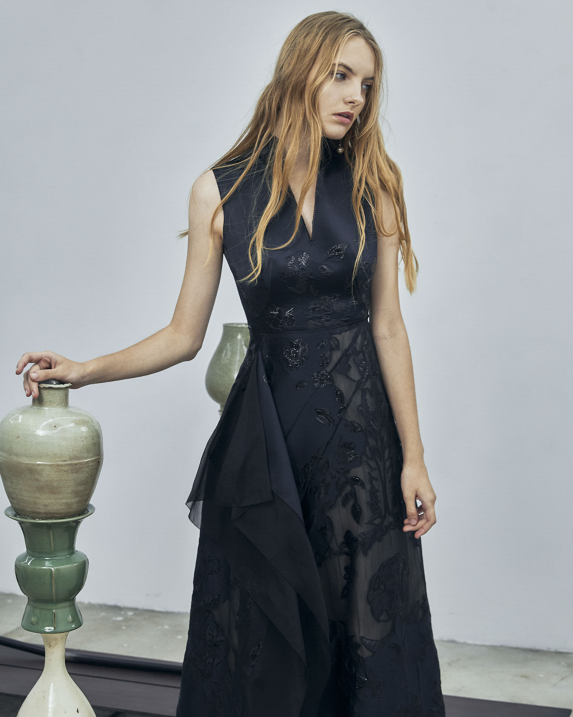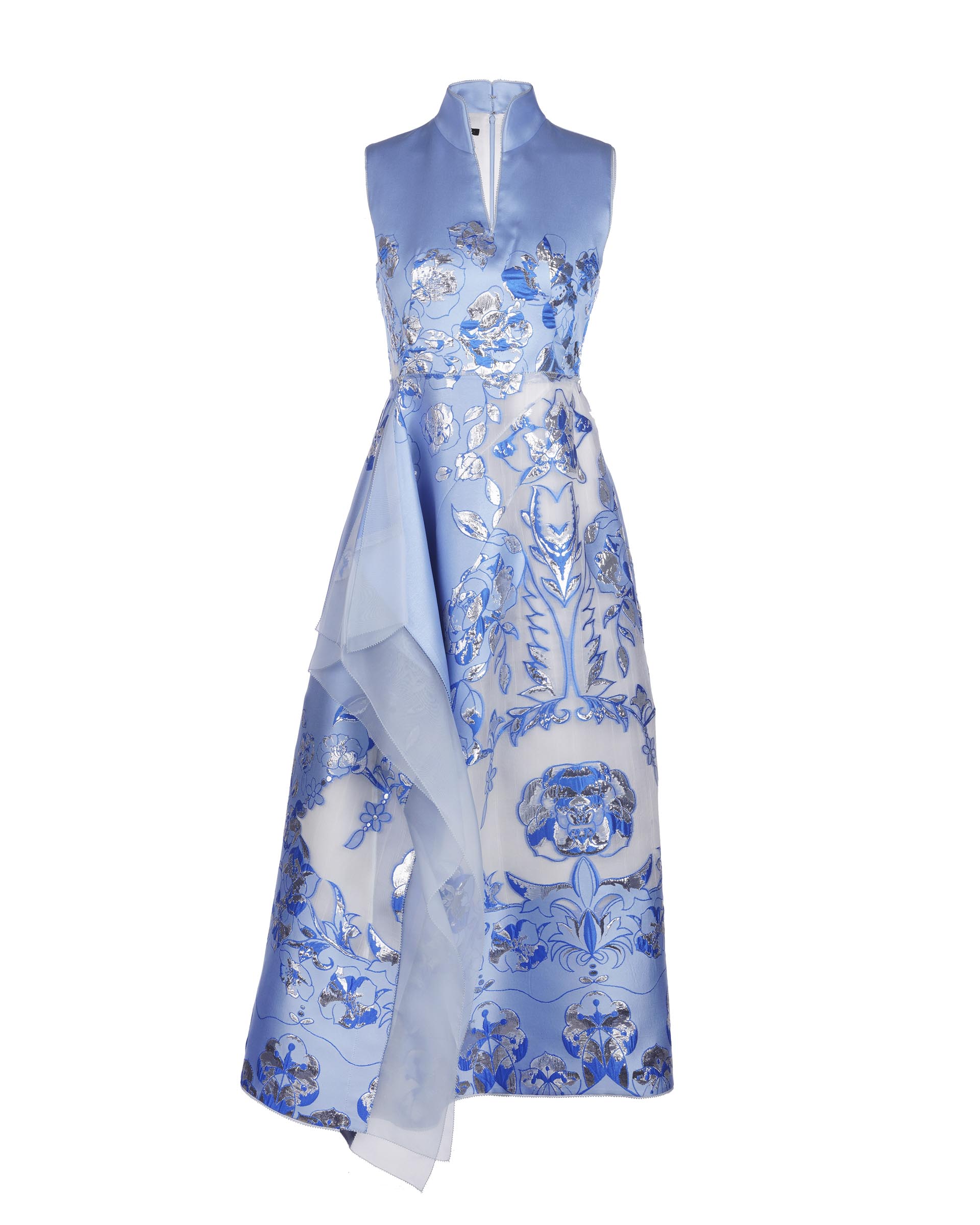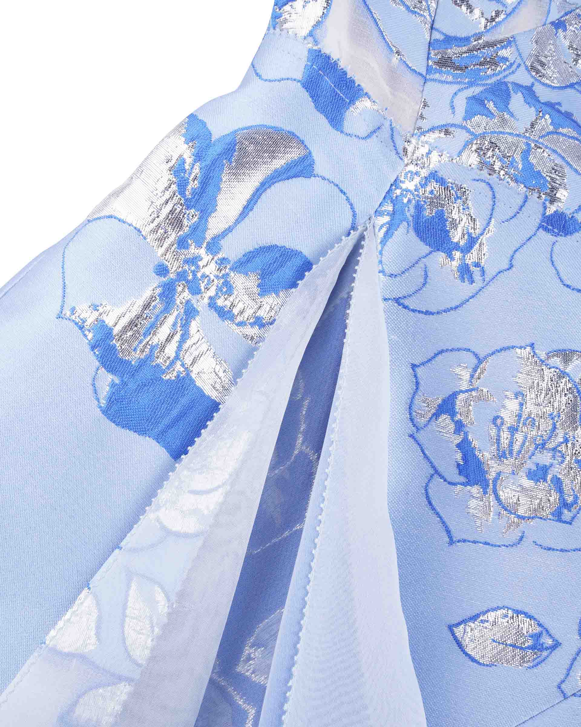 This dress is crafted from the exclusive jacquard which is inspired by the antique porcelain. Slim fit silhouette on the top together with the asymmetric structure on the skirt, this piece will bring you an excellent shape. Pair it with a pair of heels to have a perfect evening look.