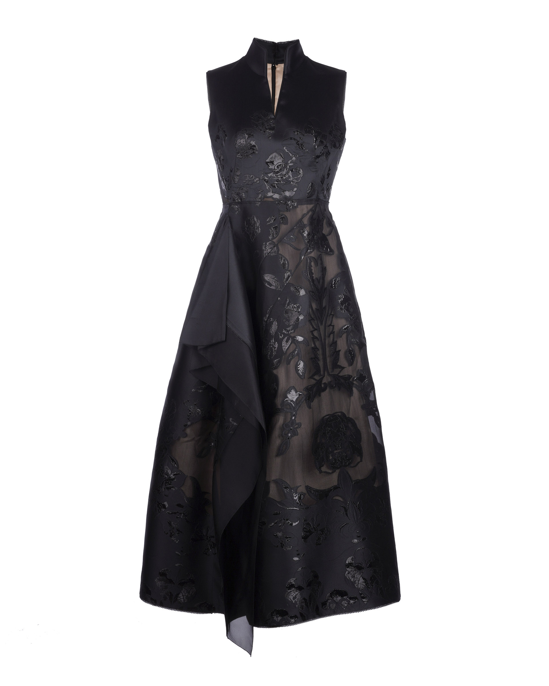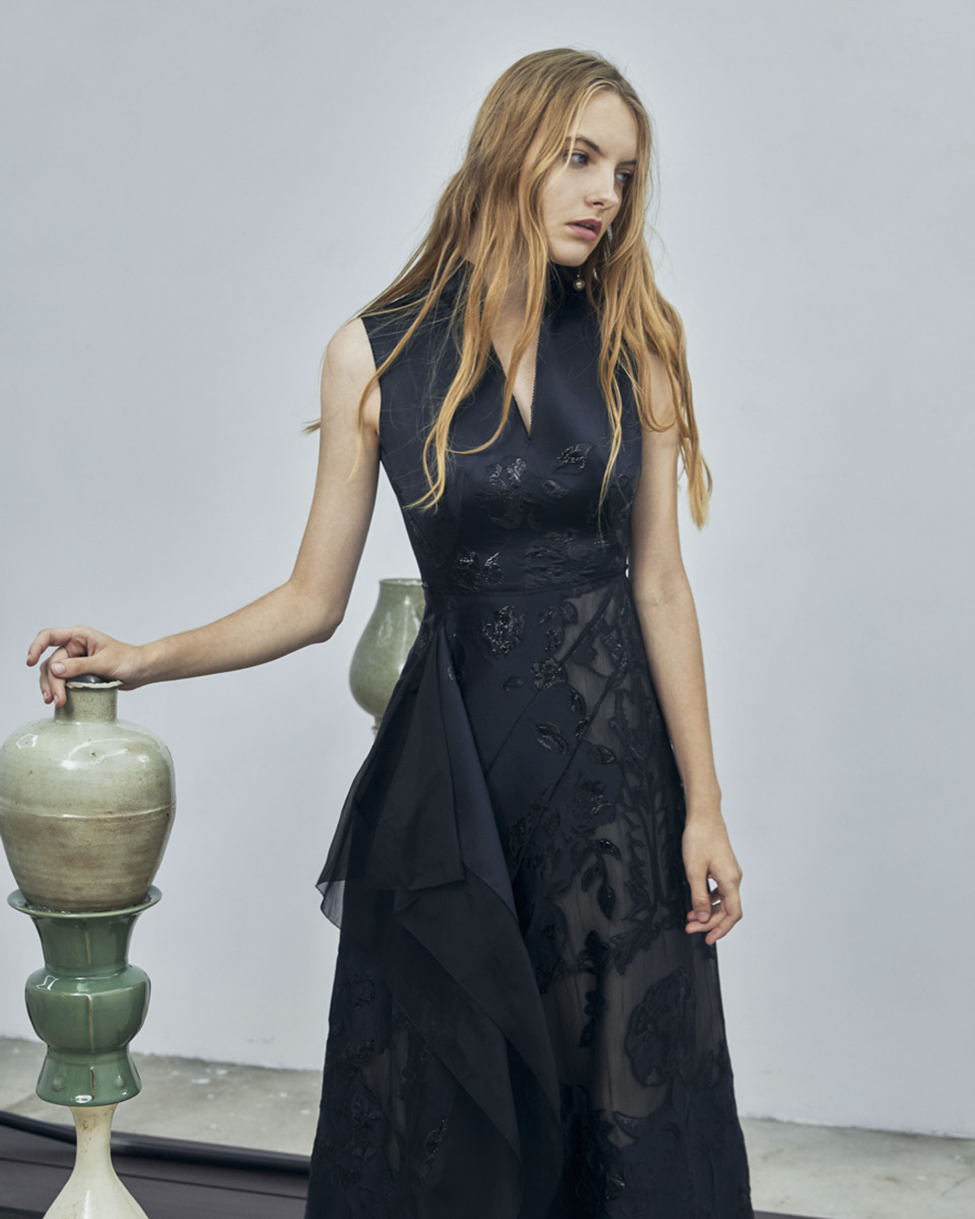 This dress is crafted from the exclusive jacquard which is inspired by the antique porcelain. Slim fit silhouette on the top together with the asymmetric structure on the skirt, this piece will bring you an excellent shape. Pair it with a pair of heels to have a perfect evening look.