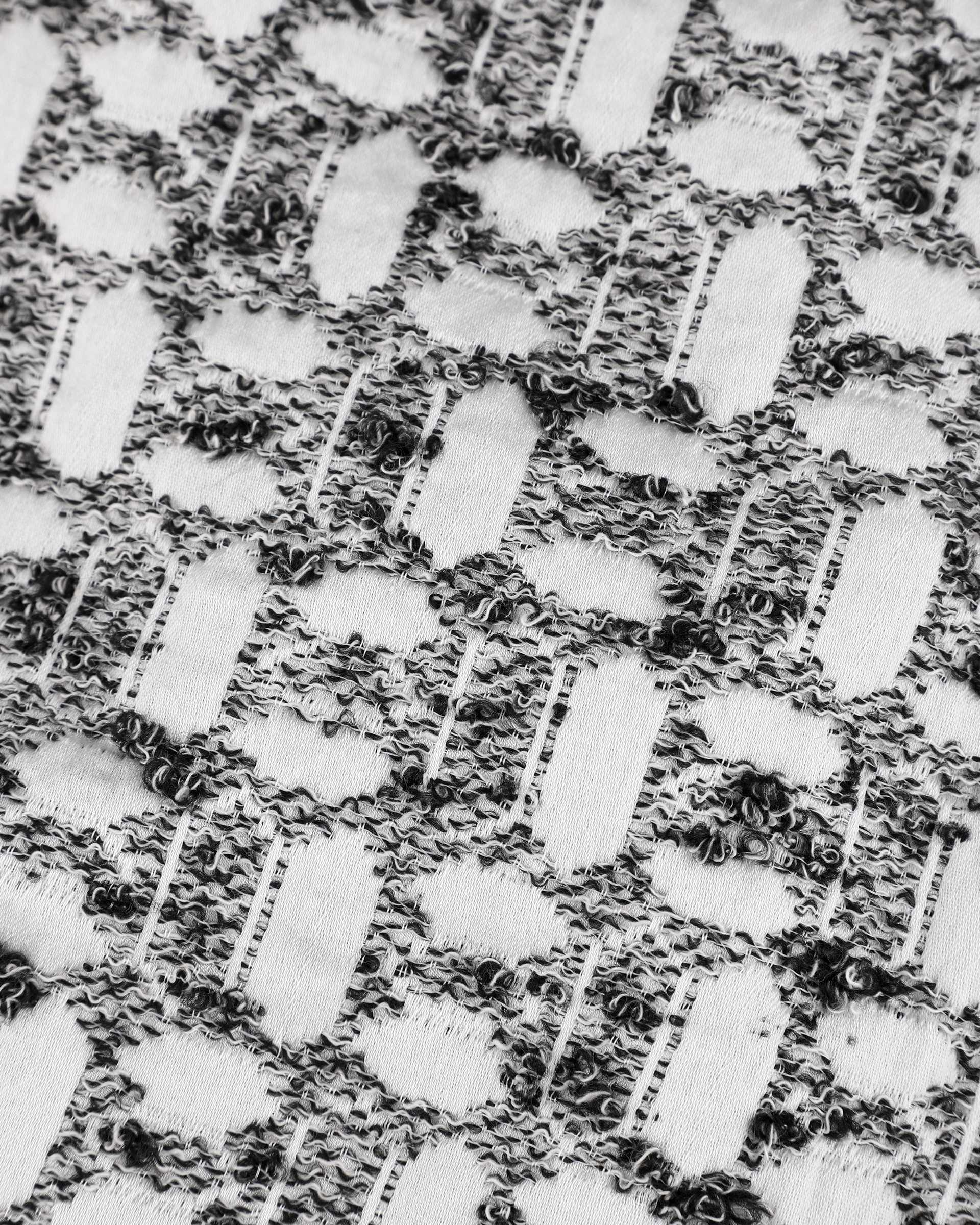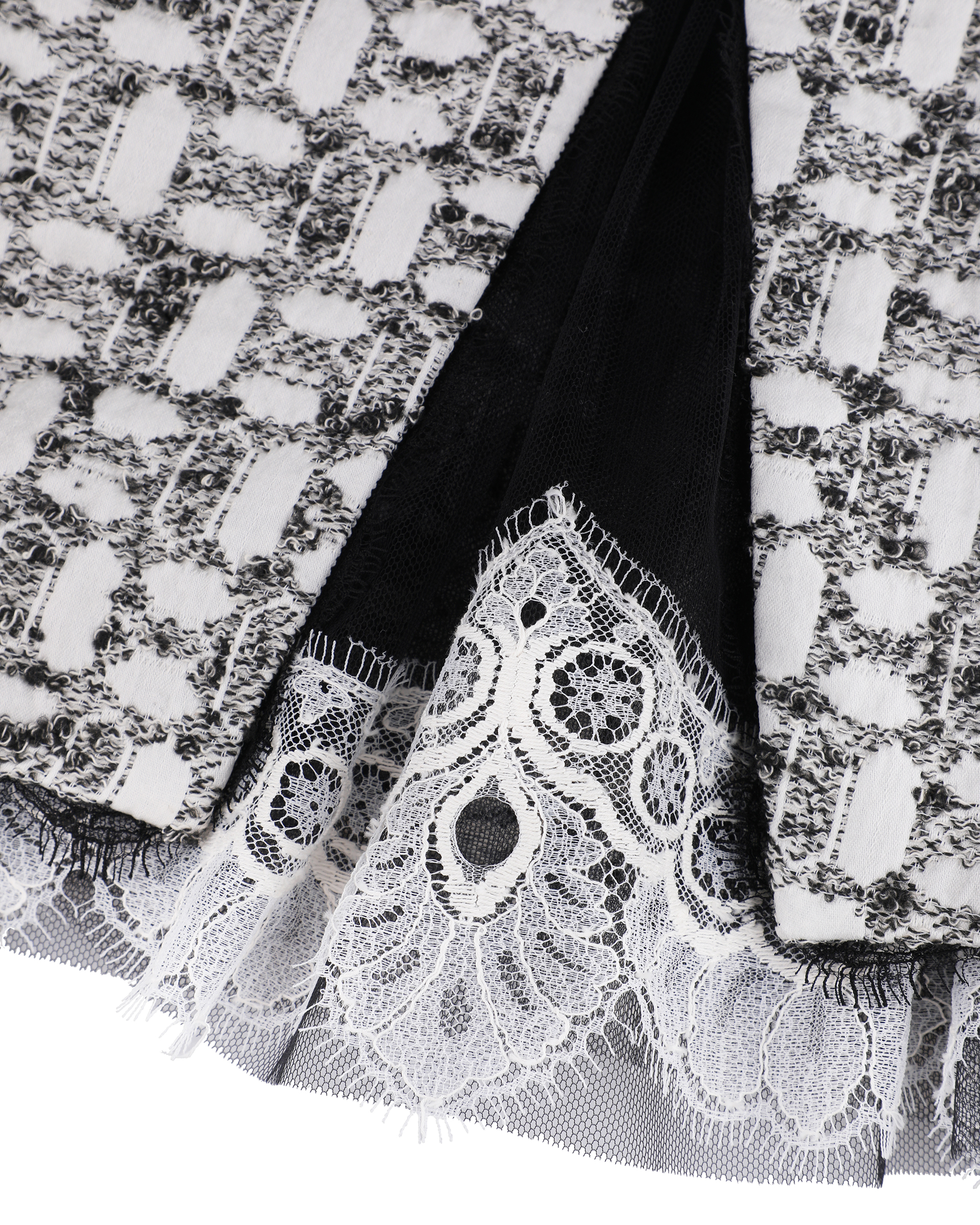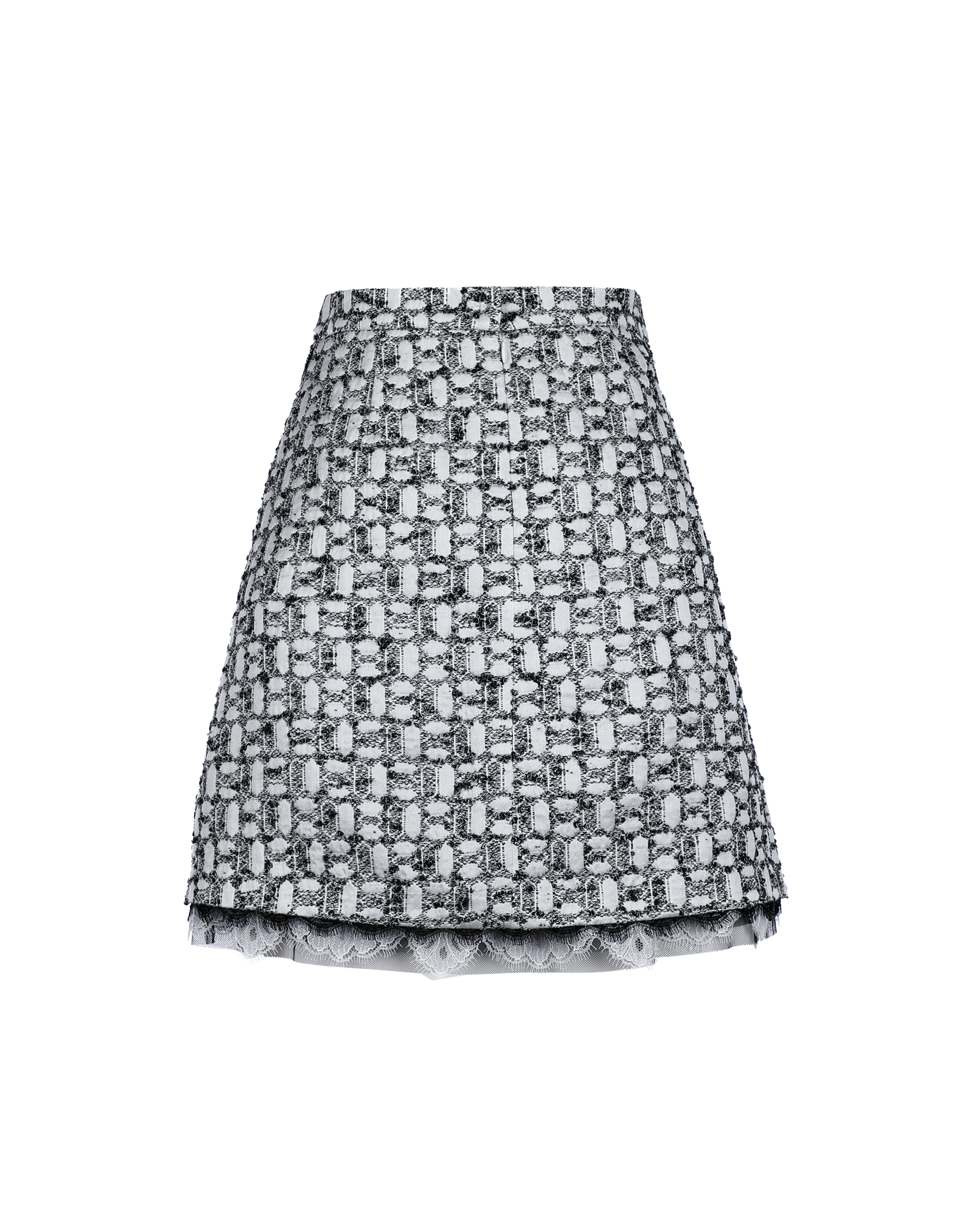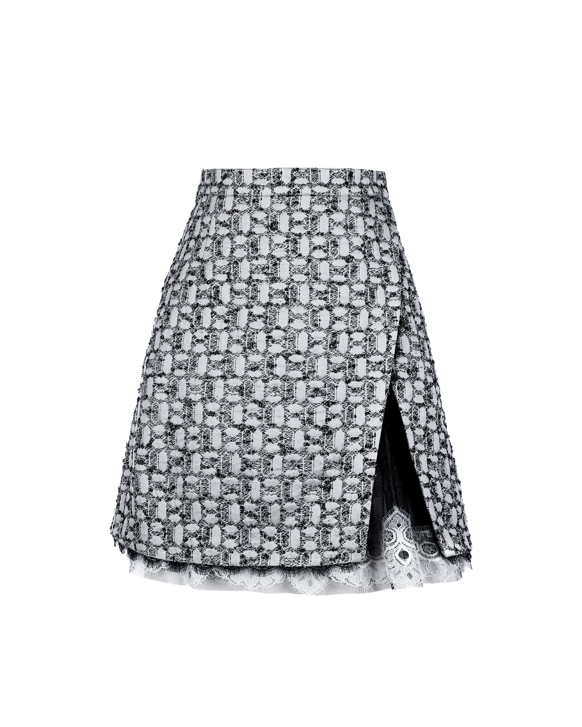 This mininskirt is tailored form timeless tweed. The inclined slit made this piece asymmetric. The lace detail on the innerlay delivered a sexy sense to this edit. You could pair it with the jacket from same collection to have a perfect business look.