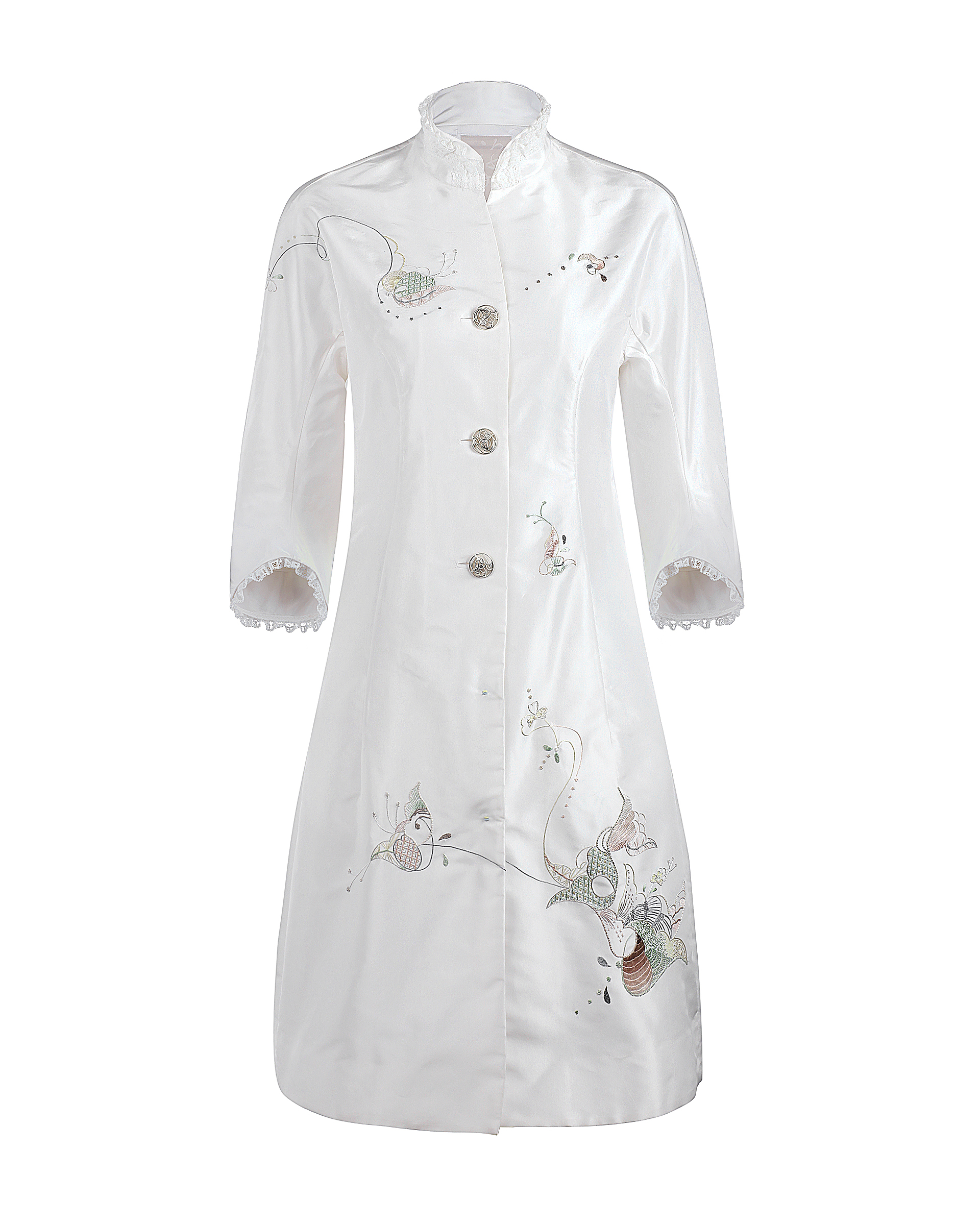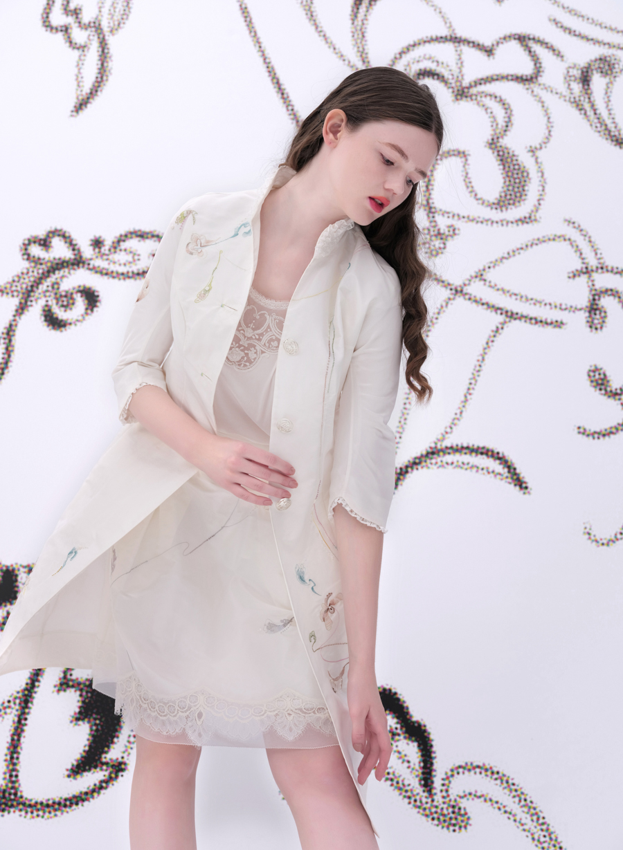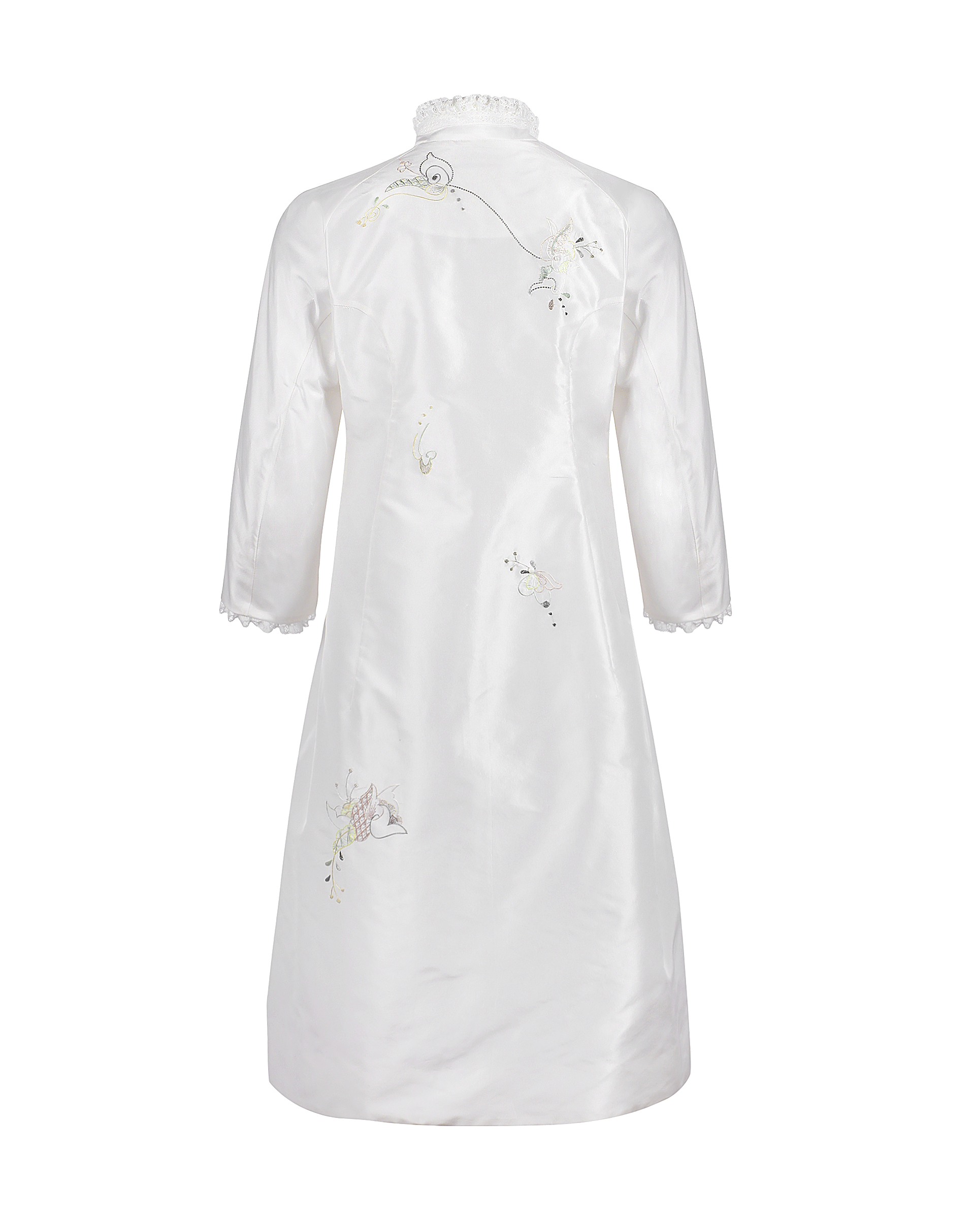 This classic Mandarin collar coat is cutted in minimal silhouette with the lace detail on the collar. The hand made embroidery is inspired from Chinese luck object- Ruyi, together with the small embroidered floral patterns, this piece represents the graceful beauty of Chinese style garment.