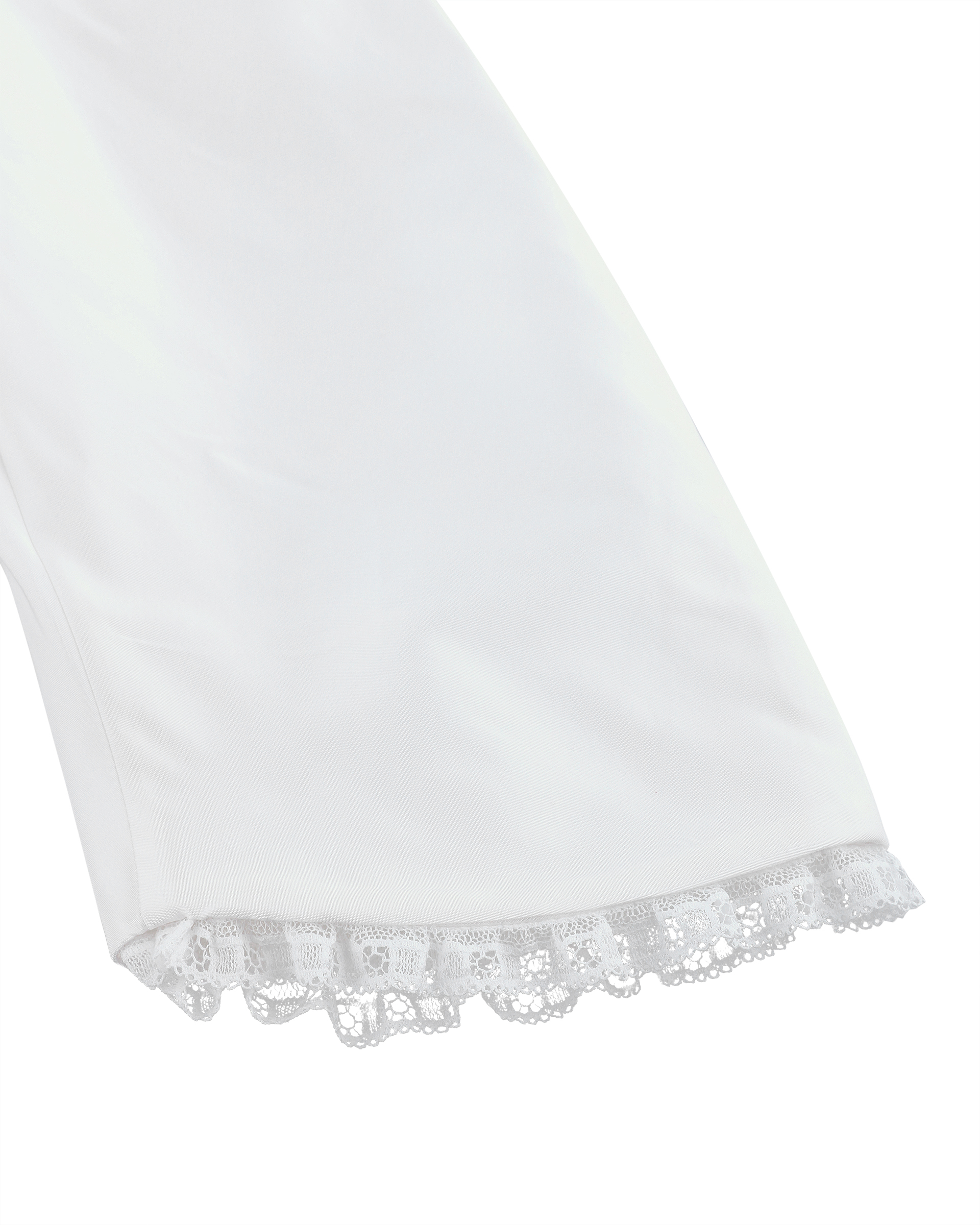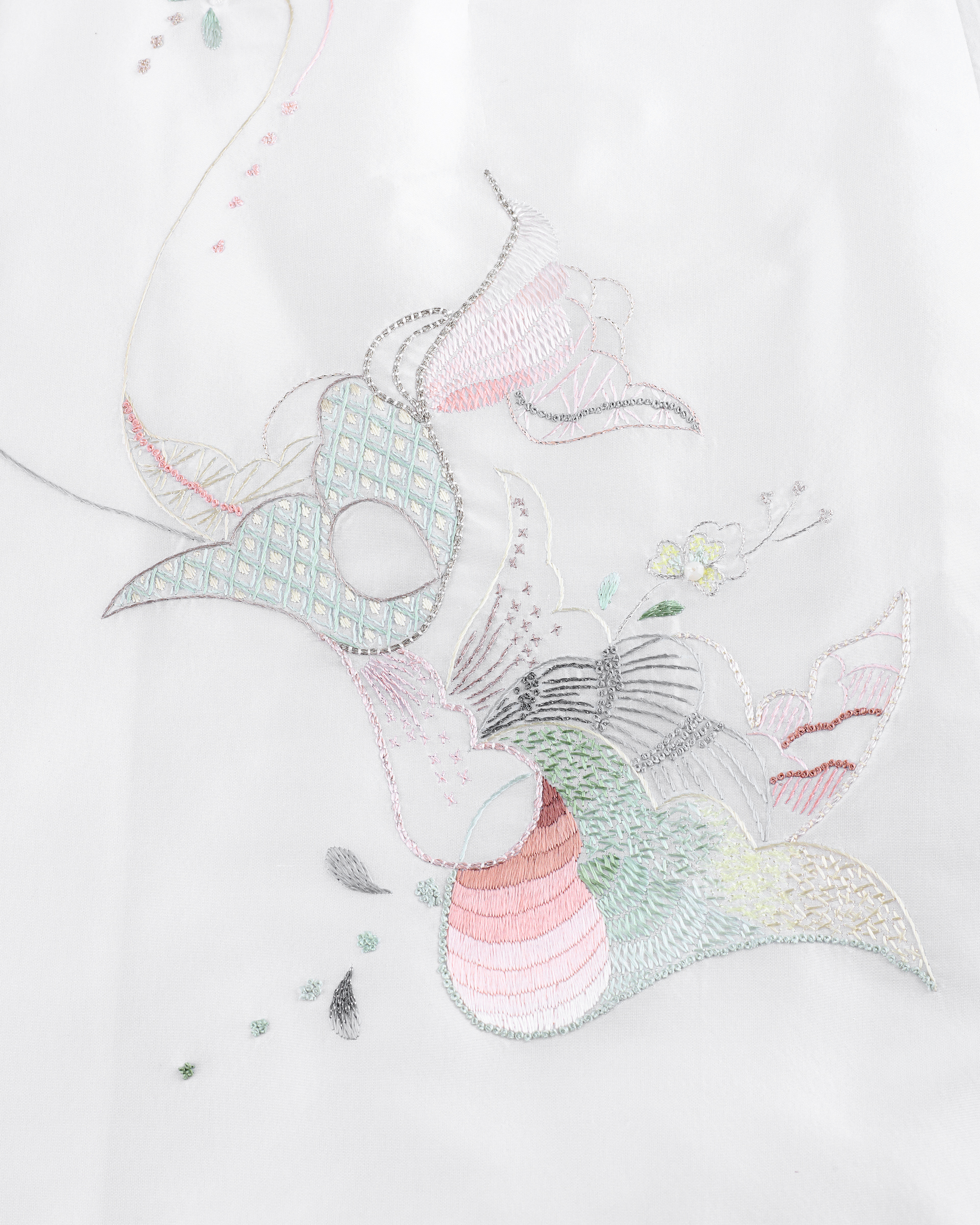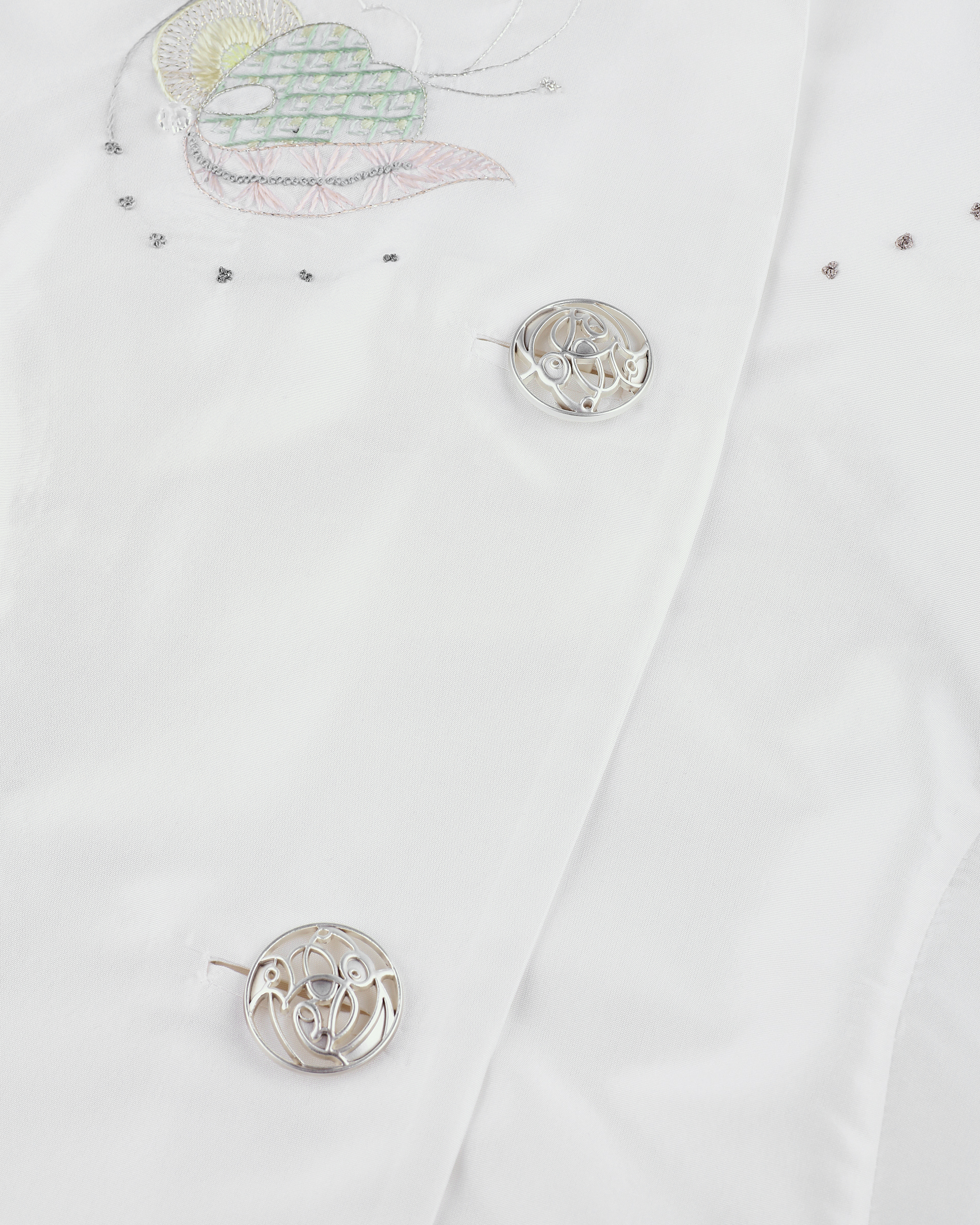 This classic Mandarin collar coat is cutted in minimal silhouette with the lace detail on the collar. The hand made embroidery is inspired from Chinese luck object- Ruyi, together with the small embroidered floral patterns, this piece represents the graceful beauty of Chinese style garment.