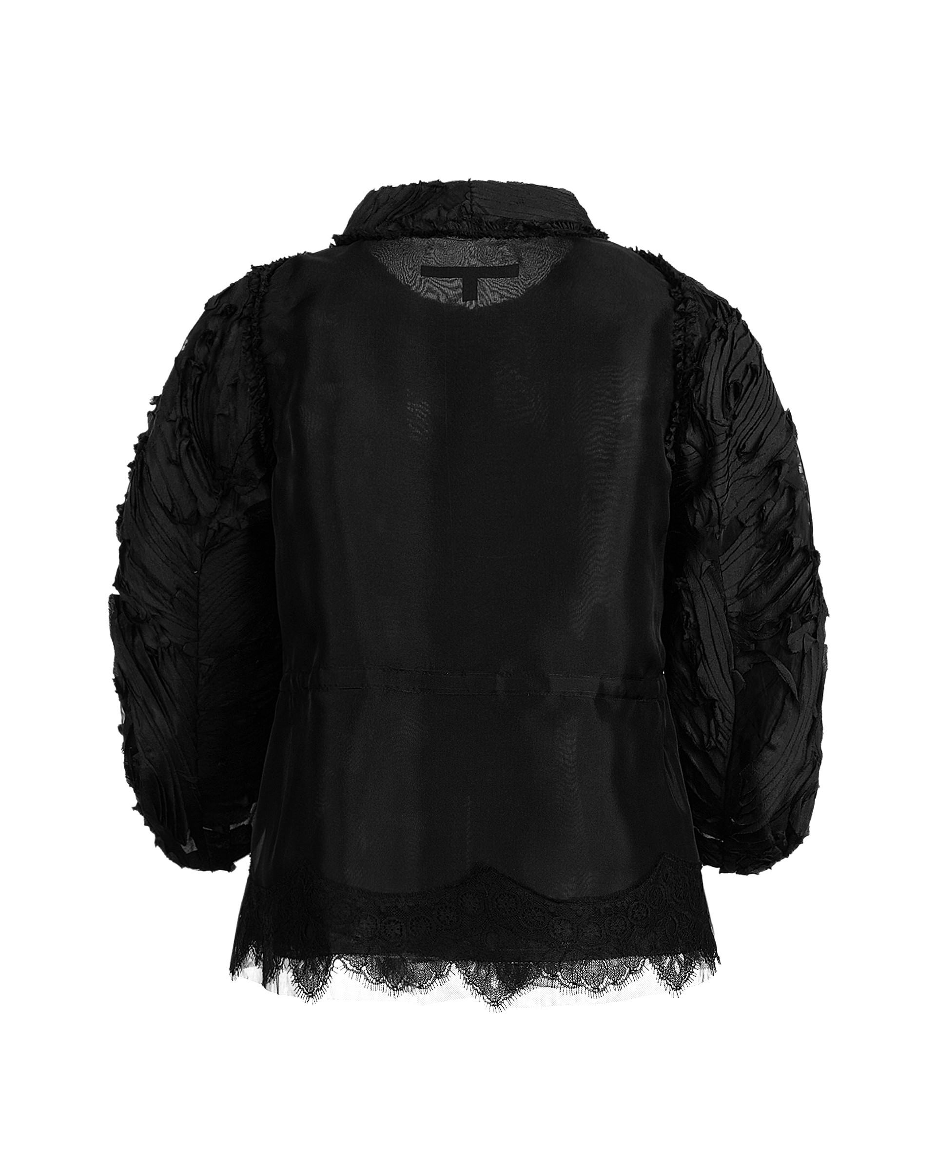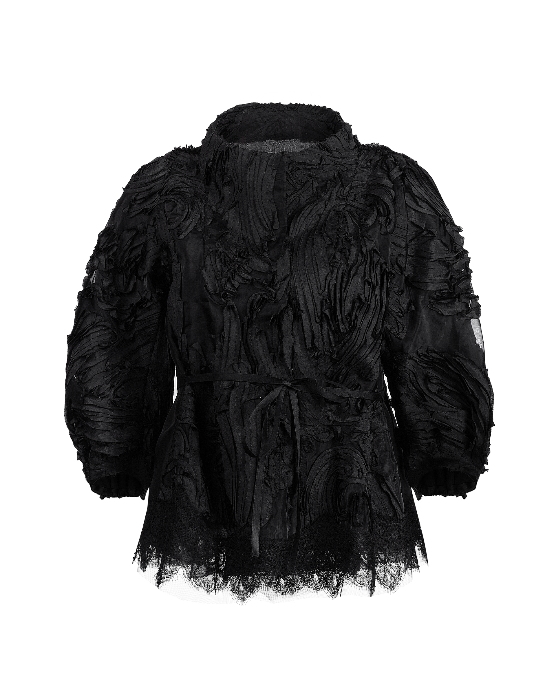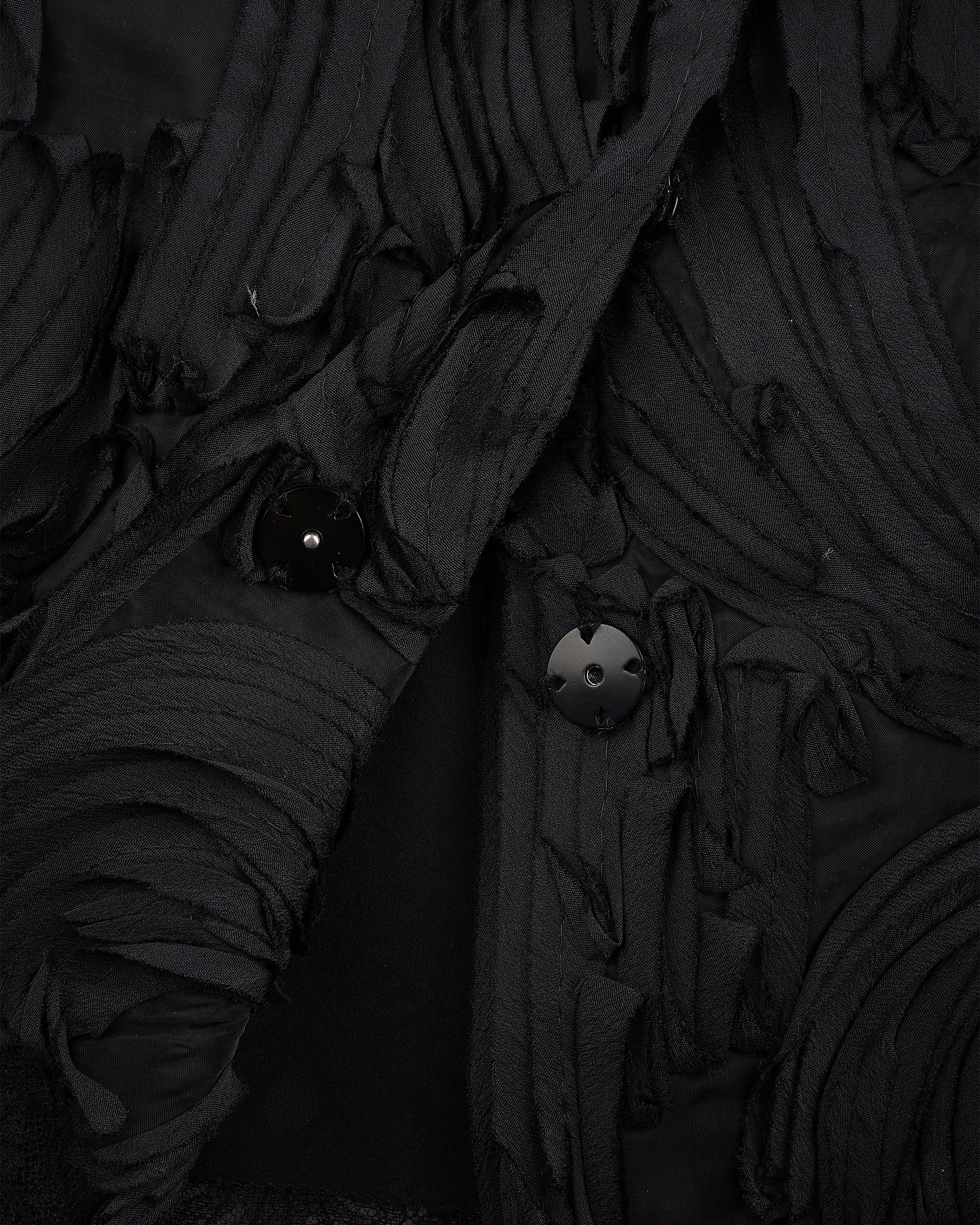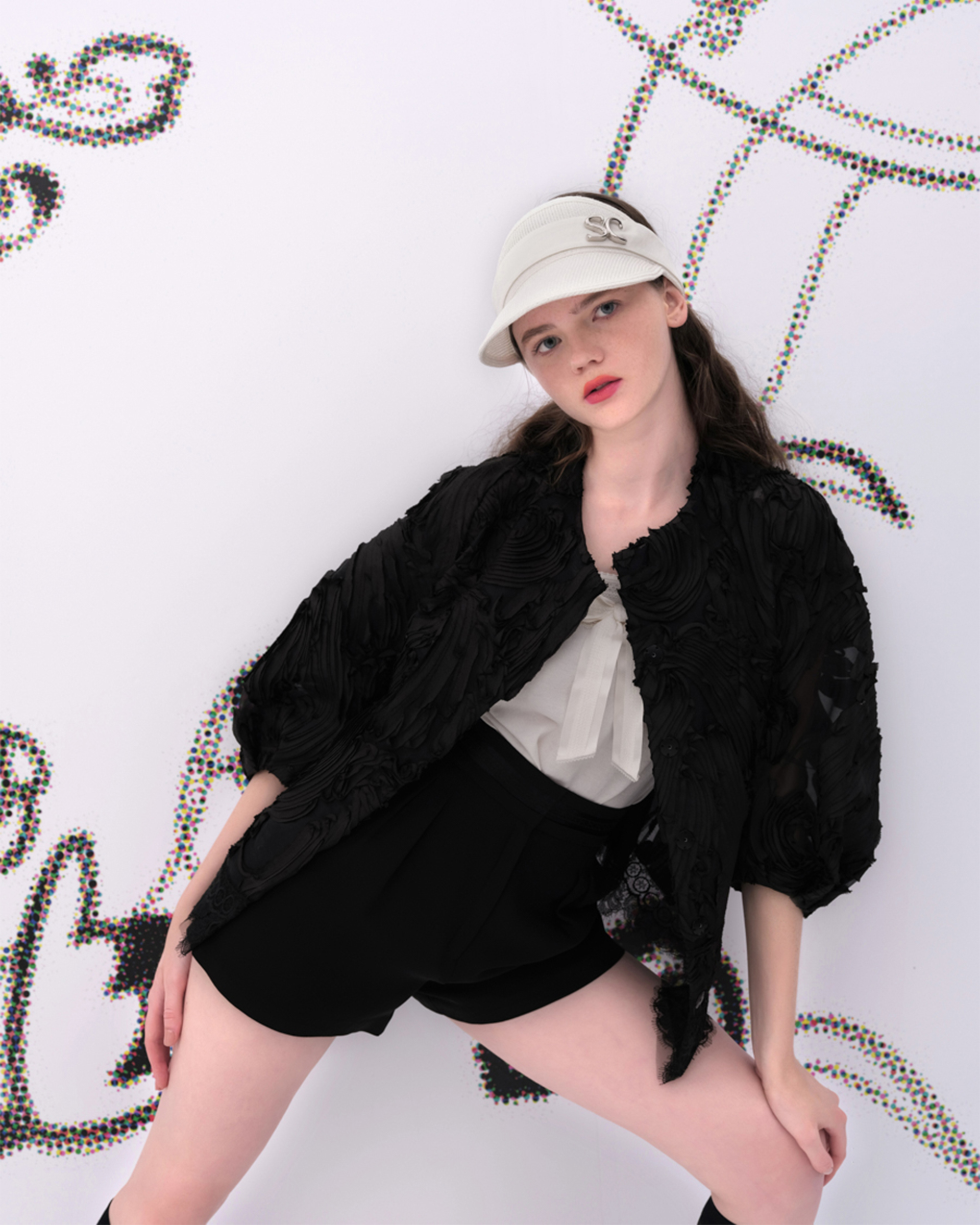 This jacket is tailored from stereoscopic jacquard.The veined pattern formed a abstract floating scenery. Equiped with a 60s style round neck and voluminous sleeves,this piece is extremely intellectual and functional. It’s a spring essential to your seasonal wardrobe.