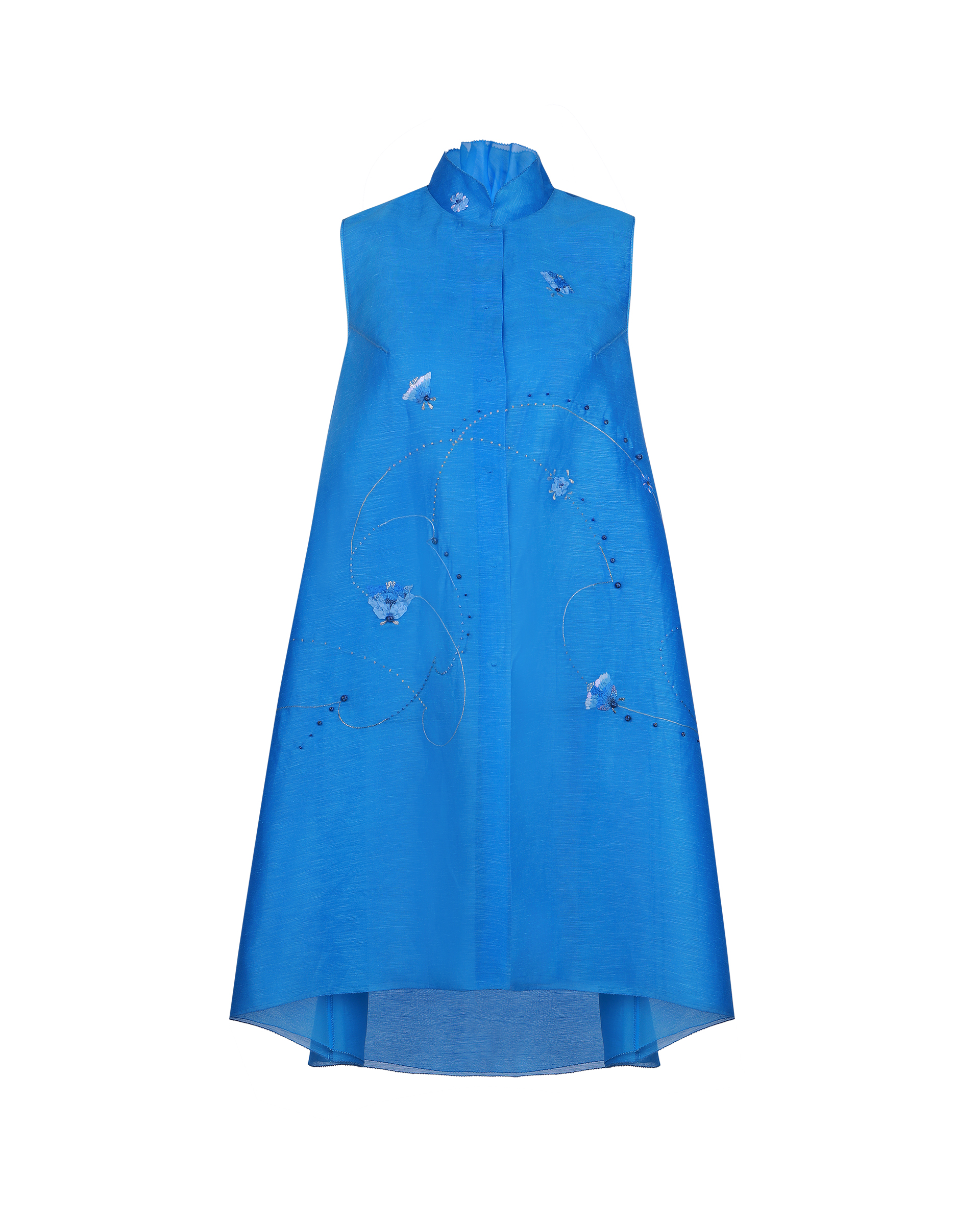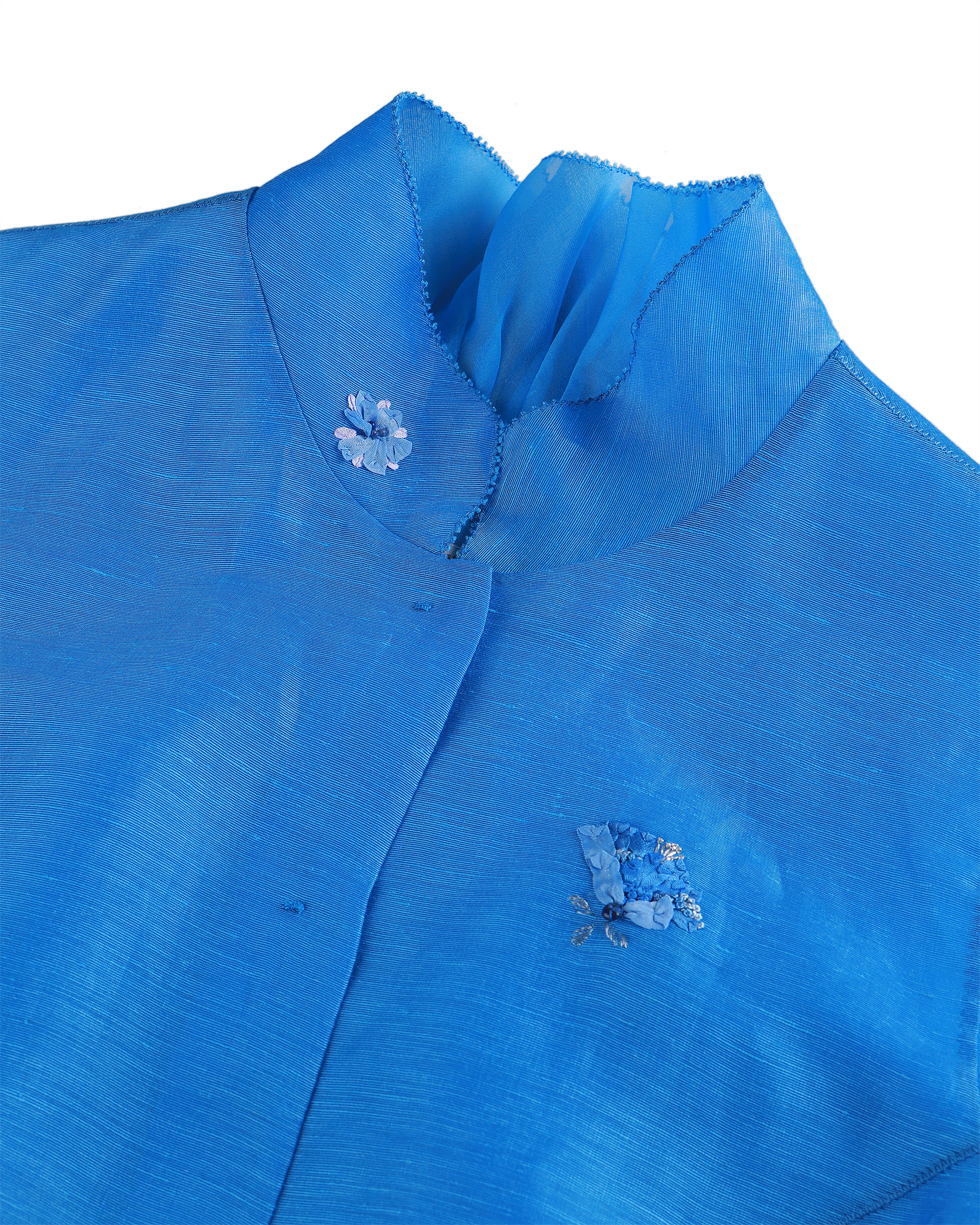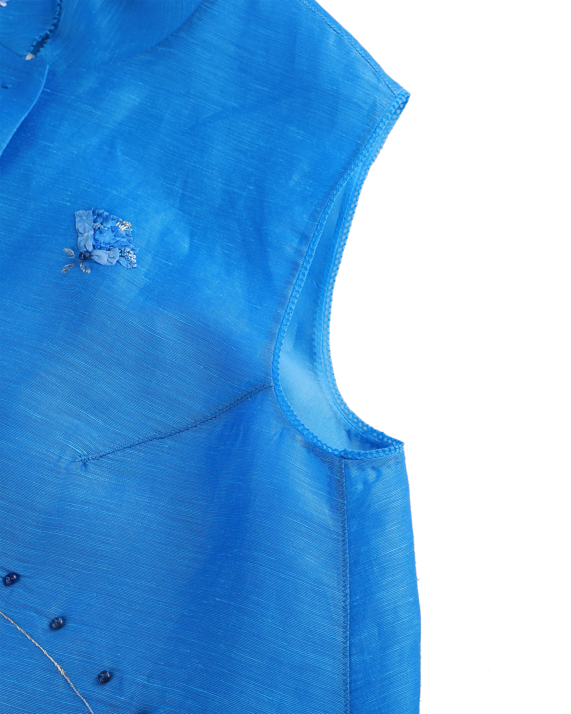 This vest is shaped in unique silhouette which contains the length disparity on front and back that could strengthen the floating effects.The embroidery is inspired by the traditional Chinese aritfact-Ruyi. The flying lines and abstract totems modernize the classic Chinese aesthetic.